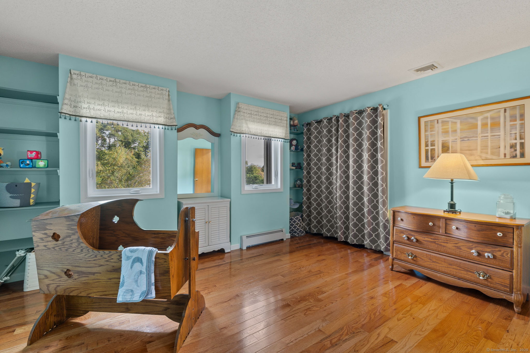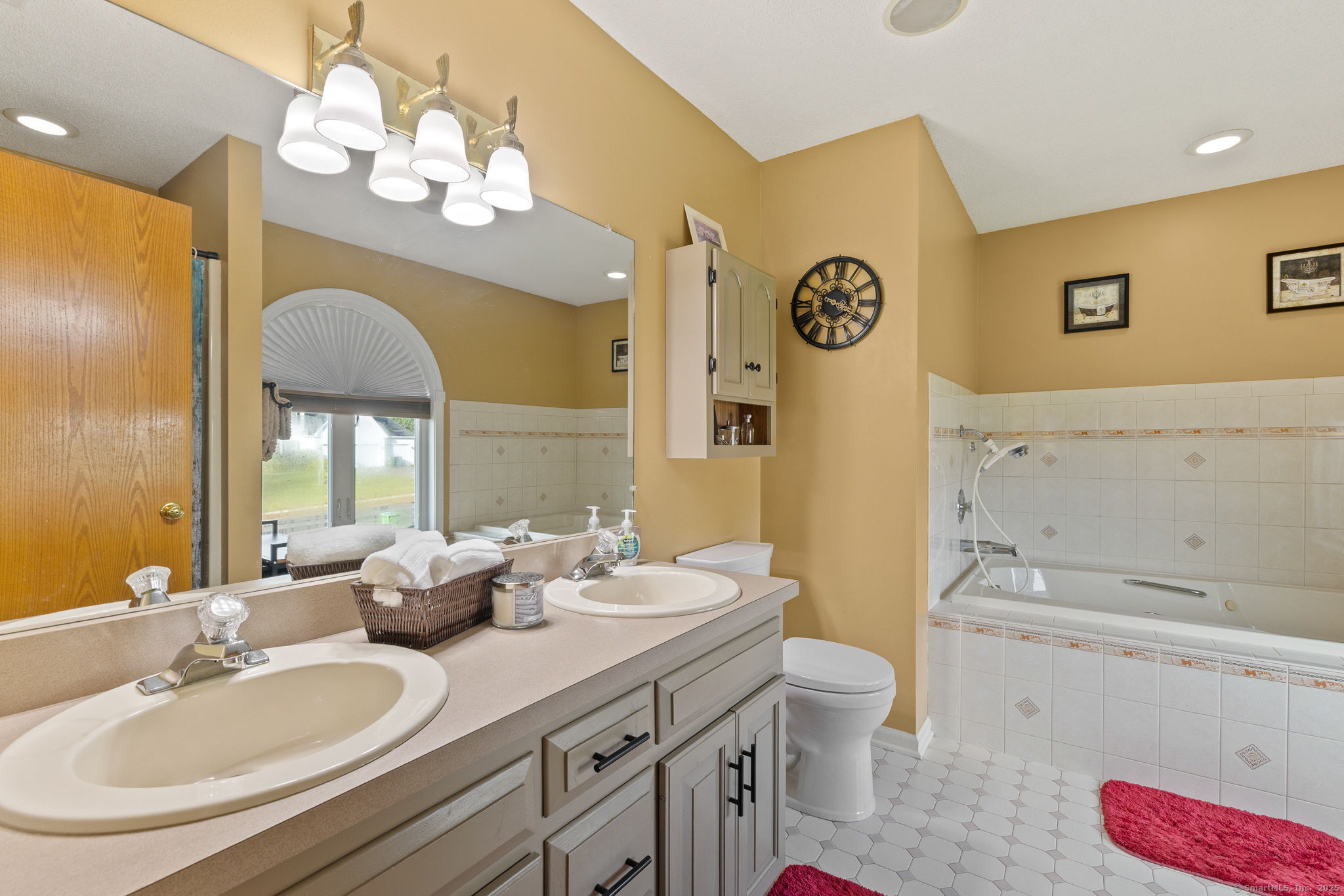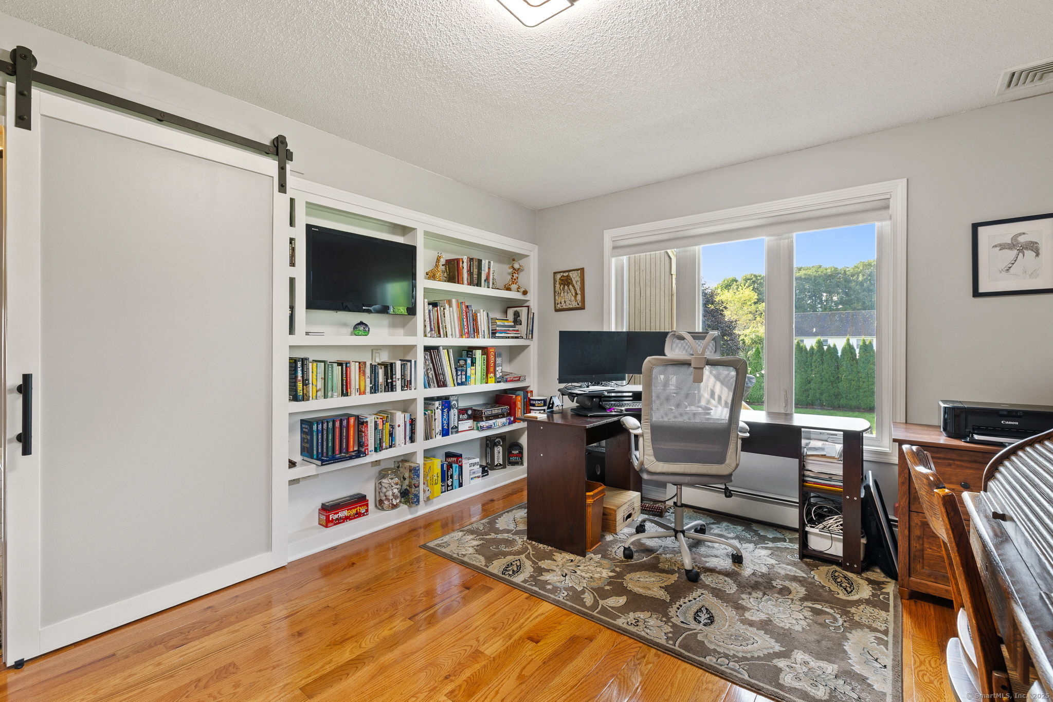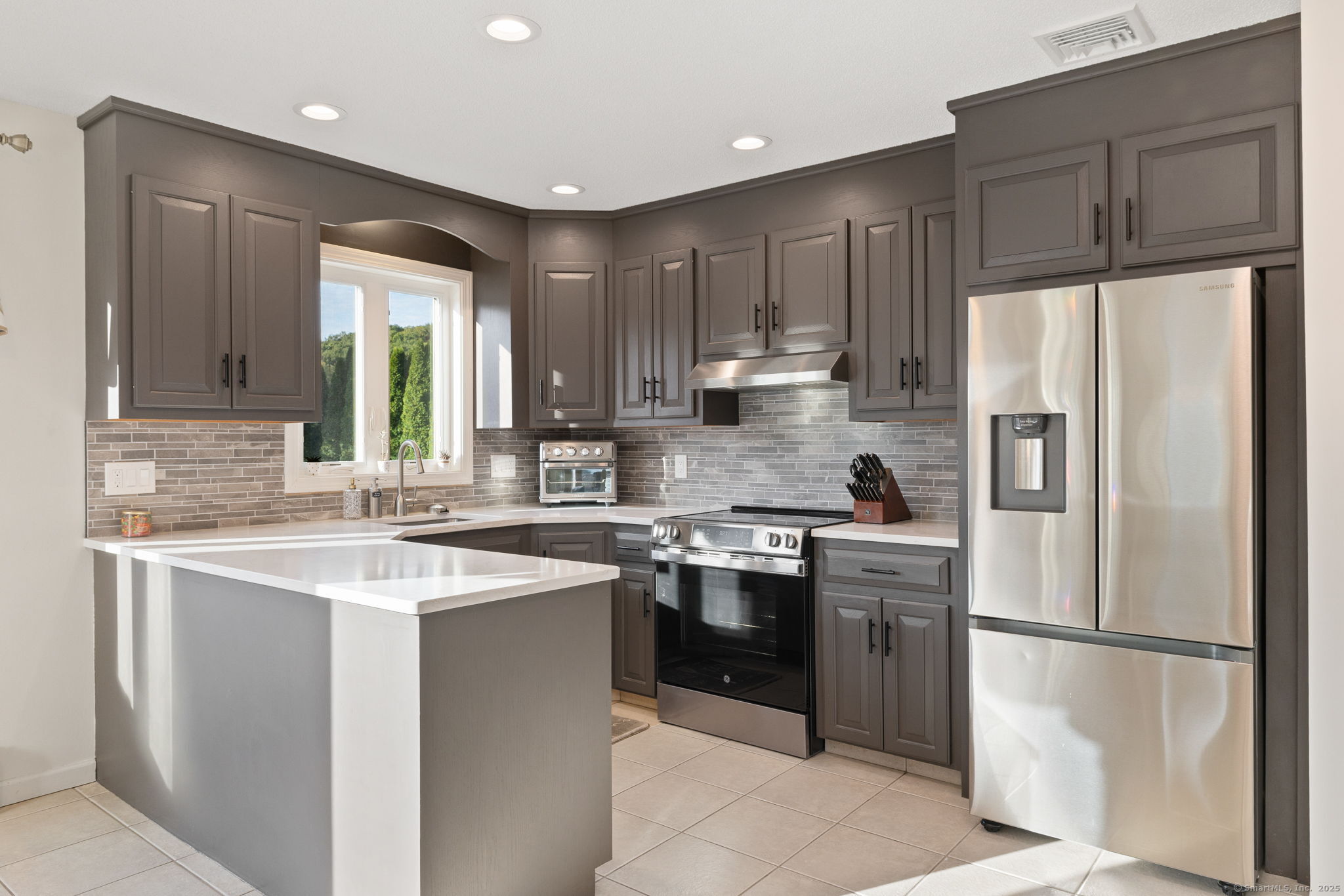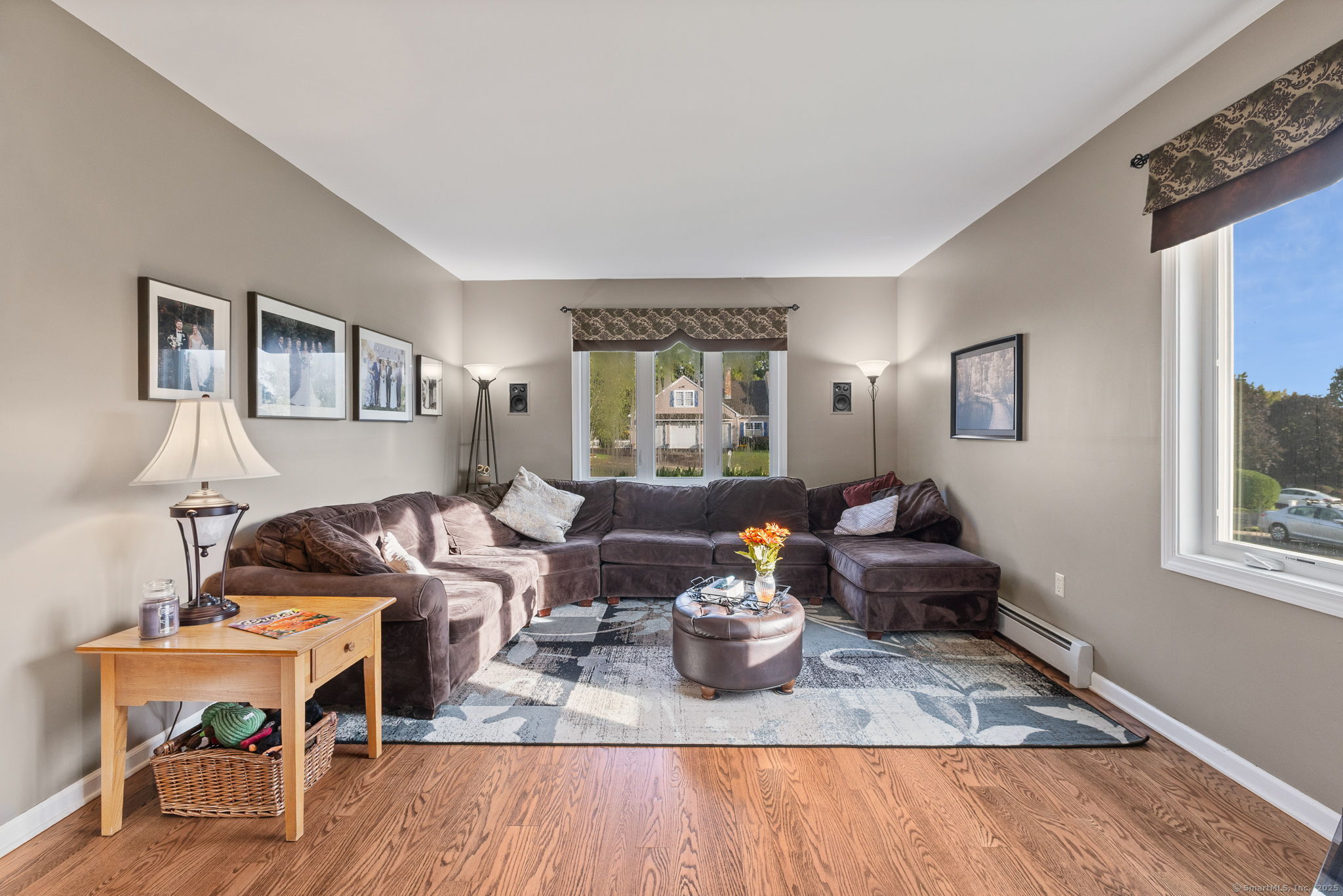 HIGHEST AND BEST DUE BY MONDAY 8:00 PM Welcome to 49 Pondview Lane, nestled in one of Bristol's most sought-after neighborhoods where homes are rarely available & pride of ownership shines. This stunning contemporary offers 3 bedrooms, 2.5 baths, over 2,400 square feet of thoughtfully designed living space. The main level boasts a remodeled kitchen with quartz countertops, tile backsplash & abundant cabinet space, flowing into a dining room with hardwood floors, a cozy fireplace & sliders that open to an expansive composite deck. Just off the dining room, the sunken living room features rich wood floors, perfect for both everyday relaxation & entertaining. An office or study & a convenient half bath complete the first floor. Upstairs, three generous bedrooms with hardwood floors & double closets provide ample space, including a primary suite with two double closets, a luxurious en-suite bath with jacuzzi tub & a separate shower. A second updated full bath & laundry add ease & functionality. The lower level is a true retreat with a partially finished space featuring theater seating, a bar & a wine cellar, ideal for movie nights or hosting friends, plus abundant storage. Recent updates include full replacement windows, new skylights, a newer roof & meticulous upgrades throughout. Outside, a manicured lawn, composite deck, paver patio with built-in firepit, & oversized spotless garage add to the appeal.