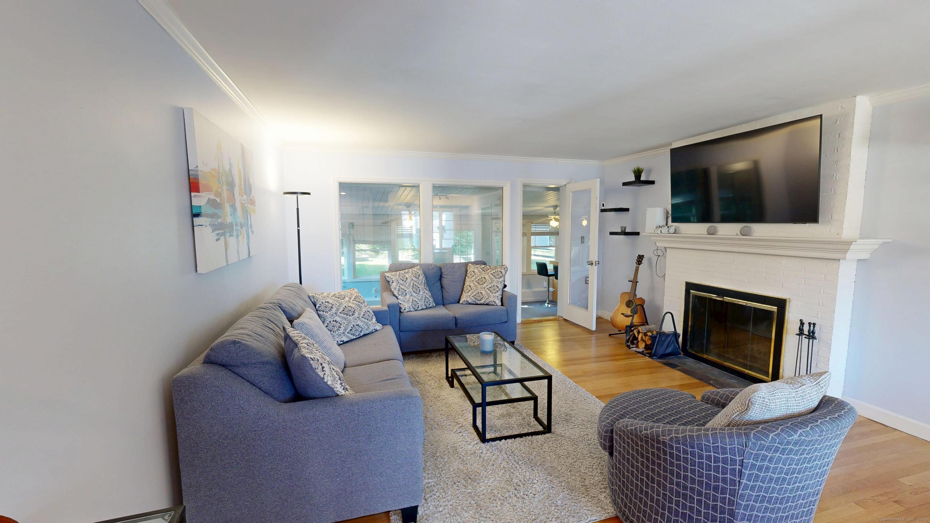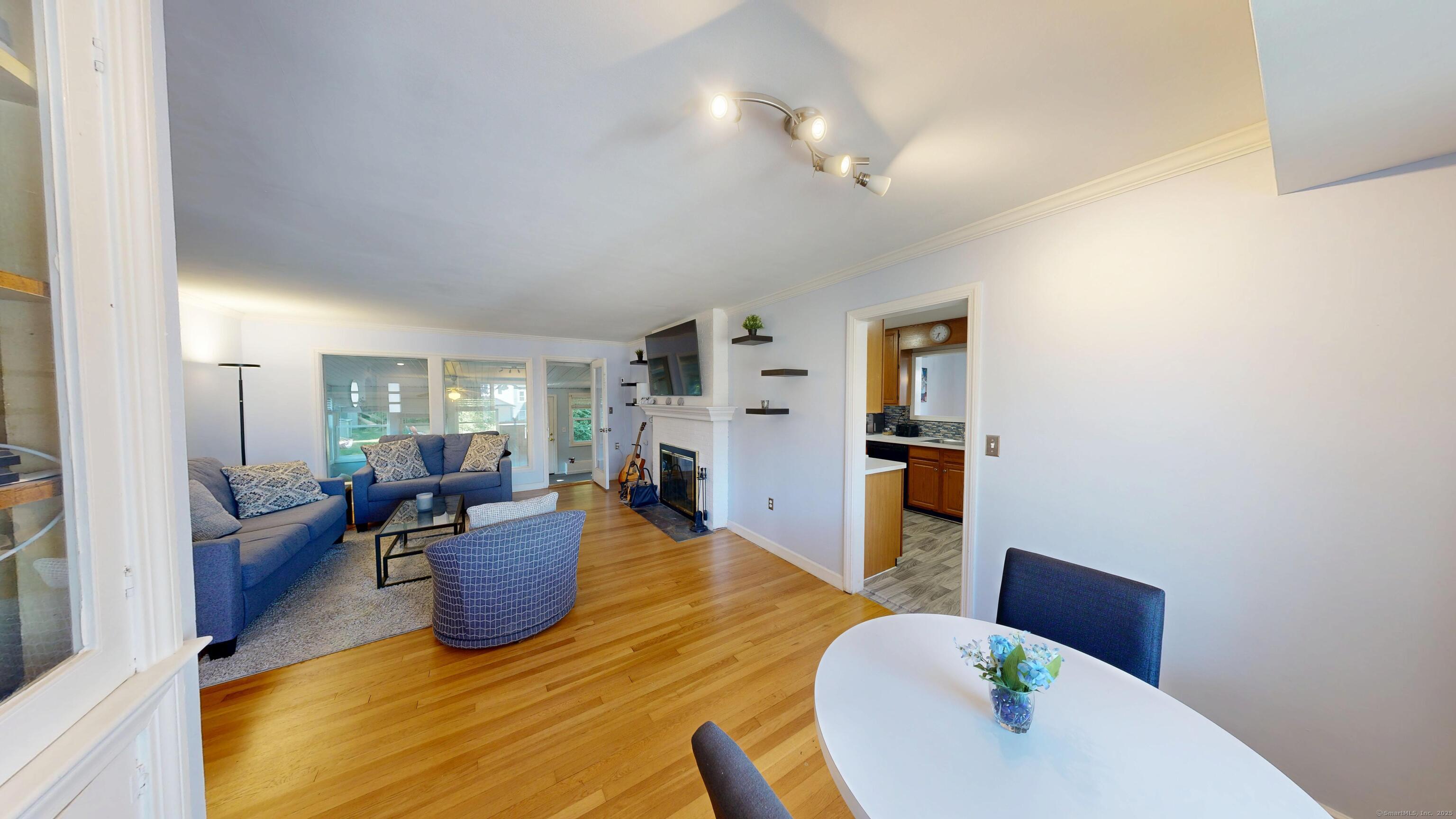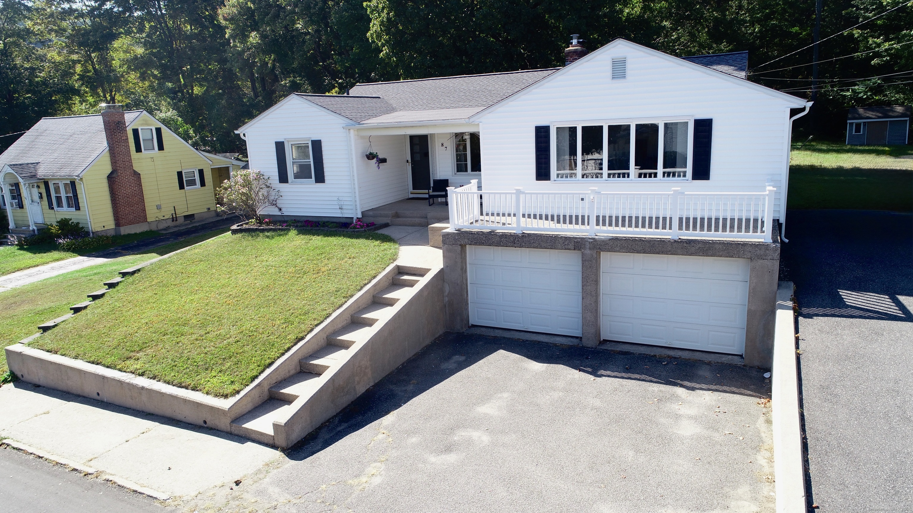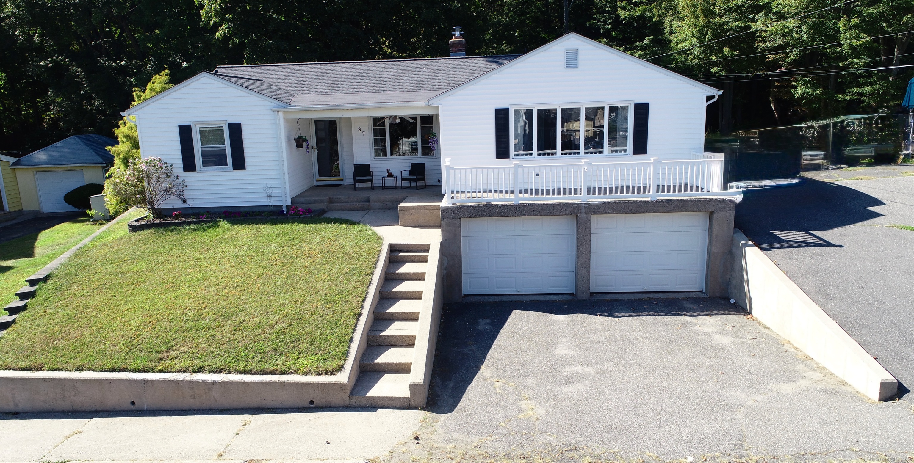 Wonderful, well-maintained ranch offering 3 bedrooms and plenty of charm! Enjoy relaxing on the front porch with sitting area before stepping into the spacious living room with hardwood floors, fireplace, and crown molding. A large sunroom with two ceiling fans adds approximately 300 sq. ft. of additional living space, perfect for year-round enjoyment. The primary bedroom has its own private entrance and can easily function as an in-home office. Two more bedrooms, each with hardwood floors and crown molding, share an updated full bath. The eat-in kitchen opens to a dining room, and the home also features a separate laundry room and mudroom. There is great potential to add a second full bath. The semi-finished lower level offers another 300 sq. ft. and just needs finishing touches to create even more living space. An oversized two-car garage provides abundant storage plus extra parking alongside. Recent updates include a newer roof, oil tank, and washer/dryer (only 6 months old). The private backyard is a true retreat with a newer pool and fire pit-ideal for entertaining or relaxing.