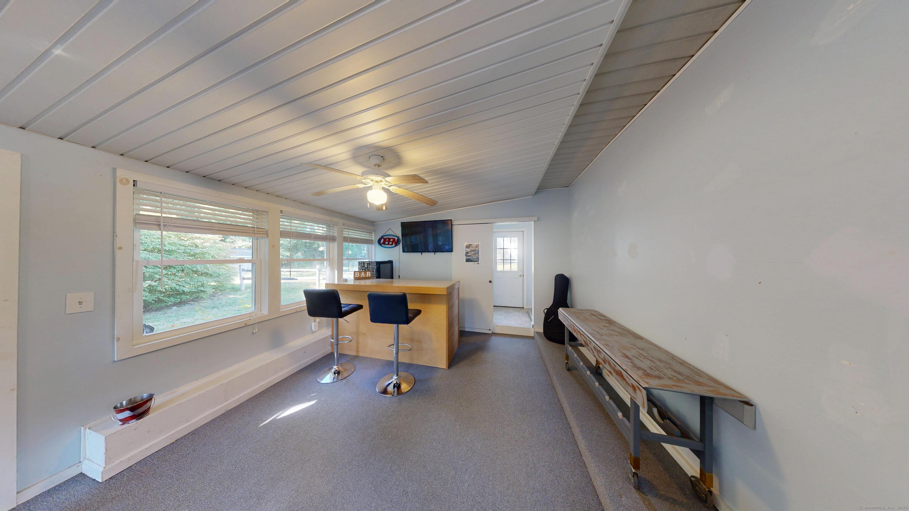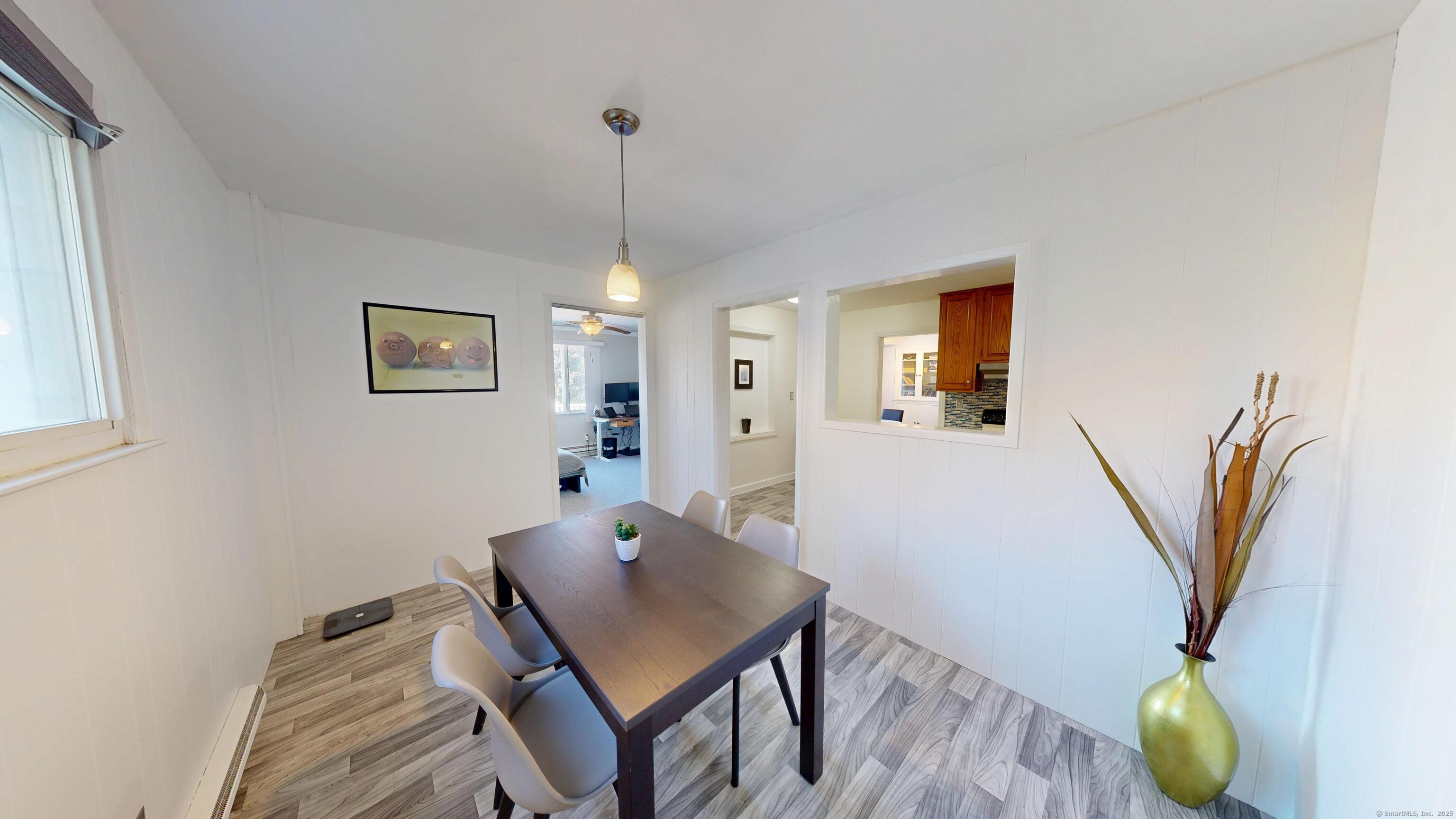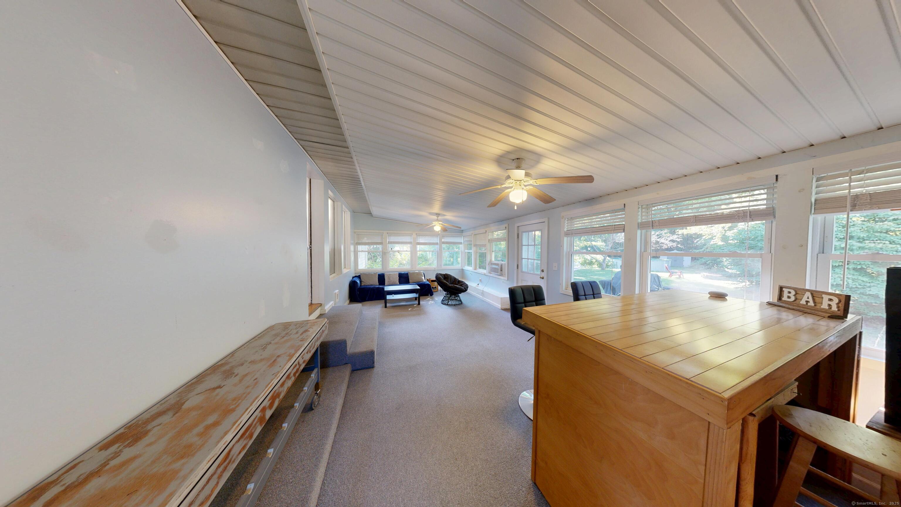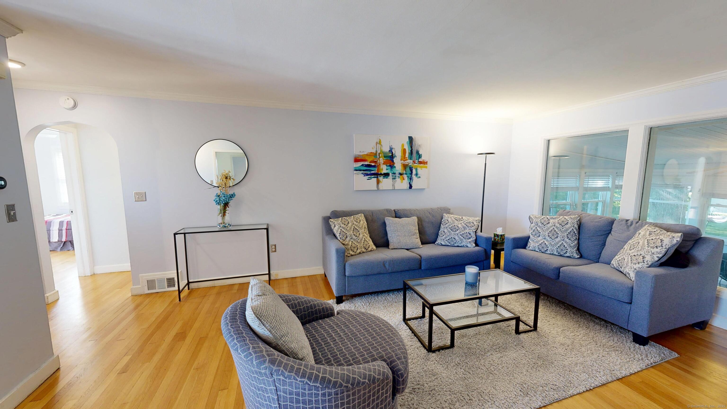 Wonderful, well-maintained ranch offering 3 bedrooms and plenty of charm! Enjoy relaxing on the front porch with sitting area before stepping into the spacious living room with hardwood floors, fireplace, and crown molding. A large sunroom with two ceiling fans adds approximately 300 sq. ft. of additional living space, perfect for year-round enjoyment. The primary bedroom has its own private entrance and can easily function as an in-home office. Two more bedrooms, each with hardwood floors and crown molding, share an updated full bath. The eat-in kitchen opens to a dining room, and the home also features a separate laundry room and mudroom. There is great potential to add a second full bath. The semi-finished lower level offers another 300 sq. ft. and just needs finishing touches to create even more living space. An oversized two-car garage provides abundant storage plus extra parking alongside. Recent updates include a newer roof, oil tank, and washer/dryer (only 6 months old). The private backyard is a true retreat with a newer pool and fire pit-ideal for entertaining or relaxing.