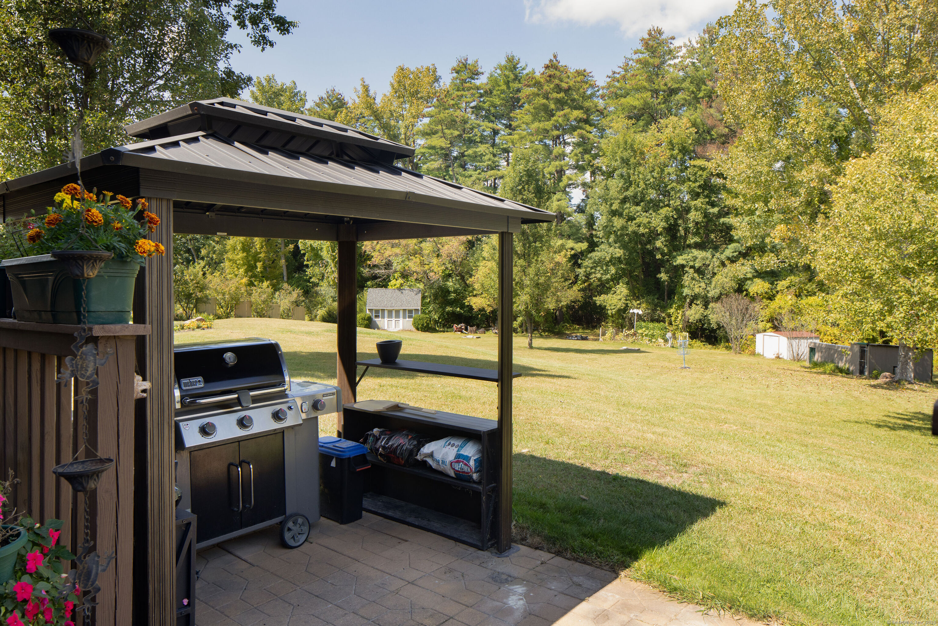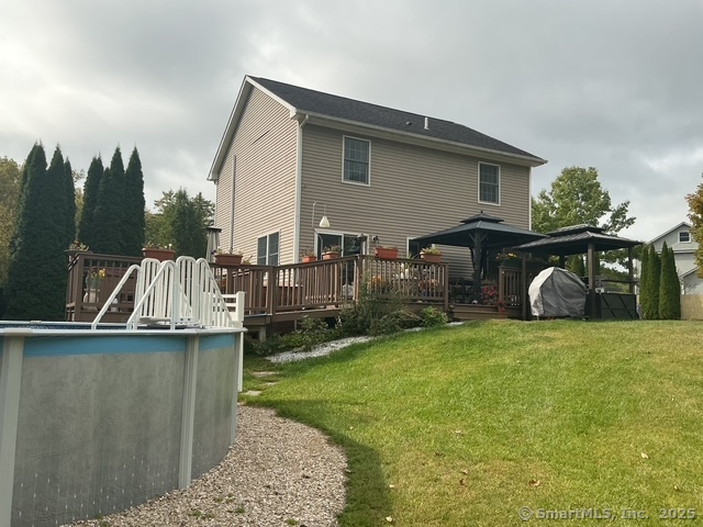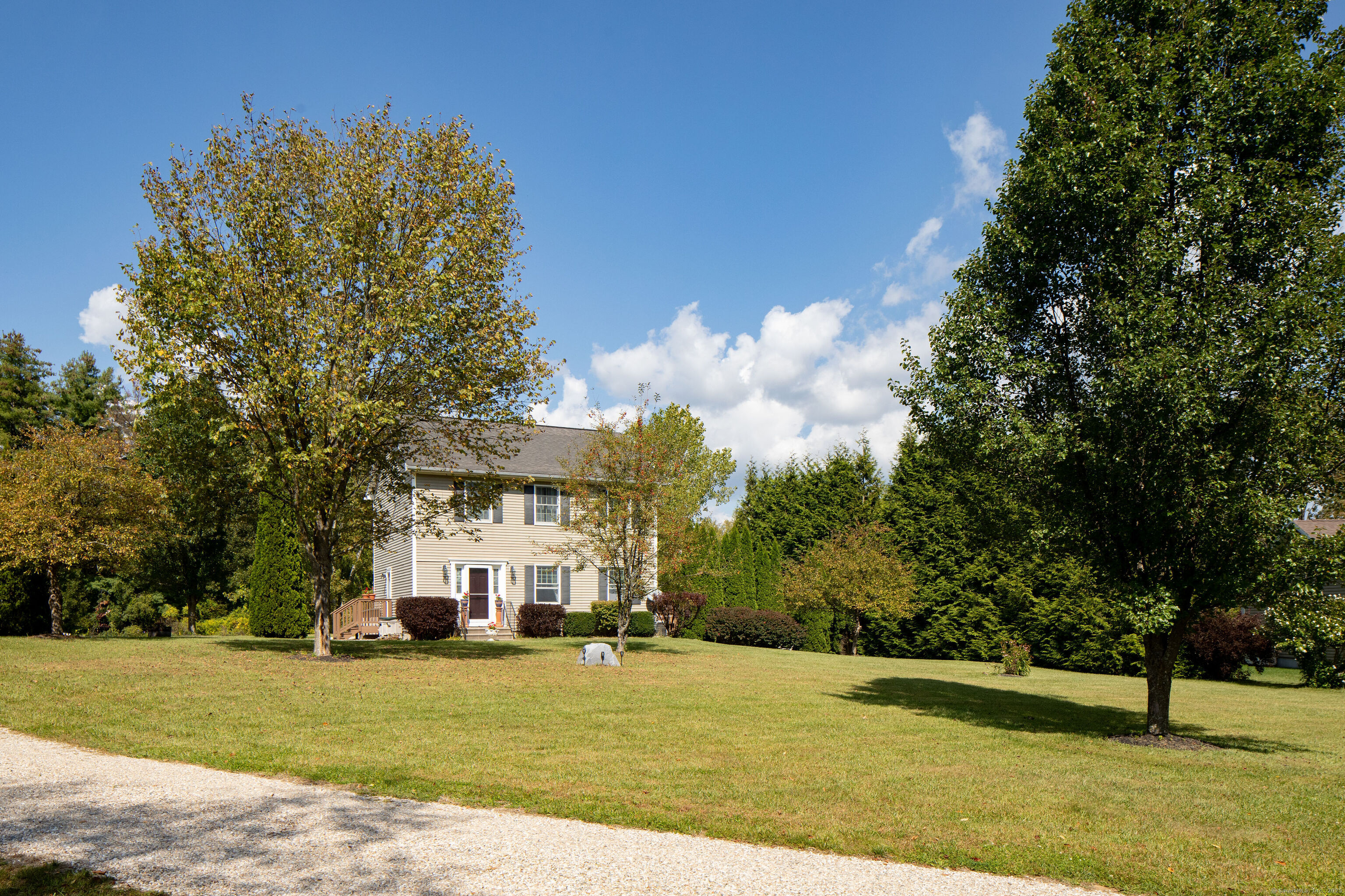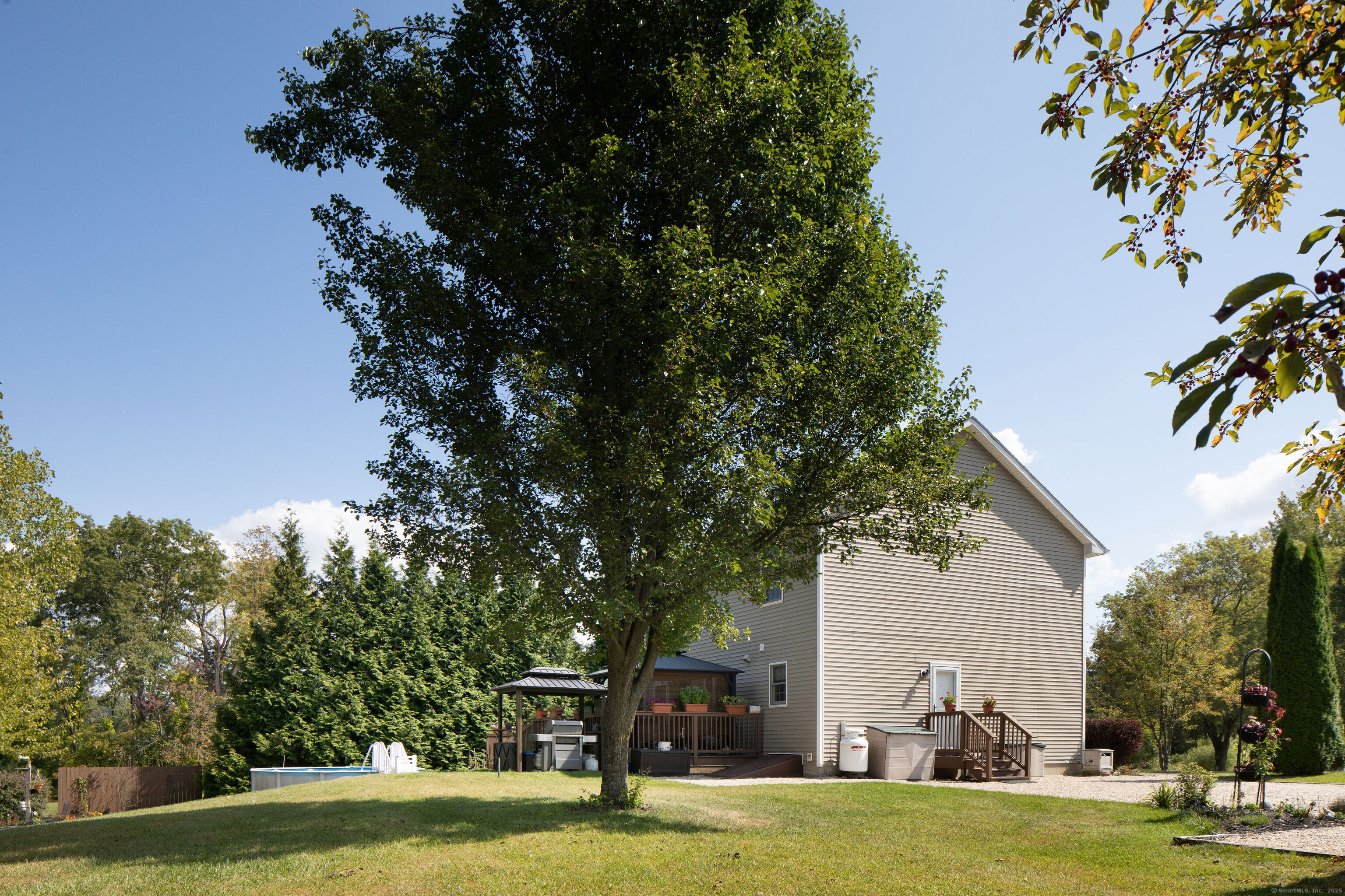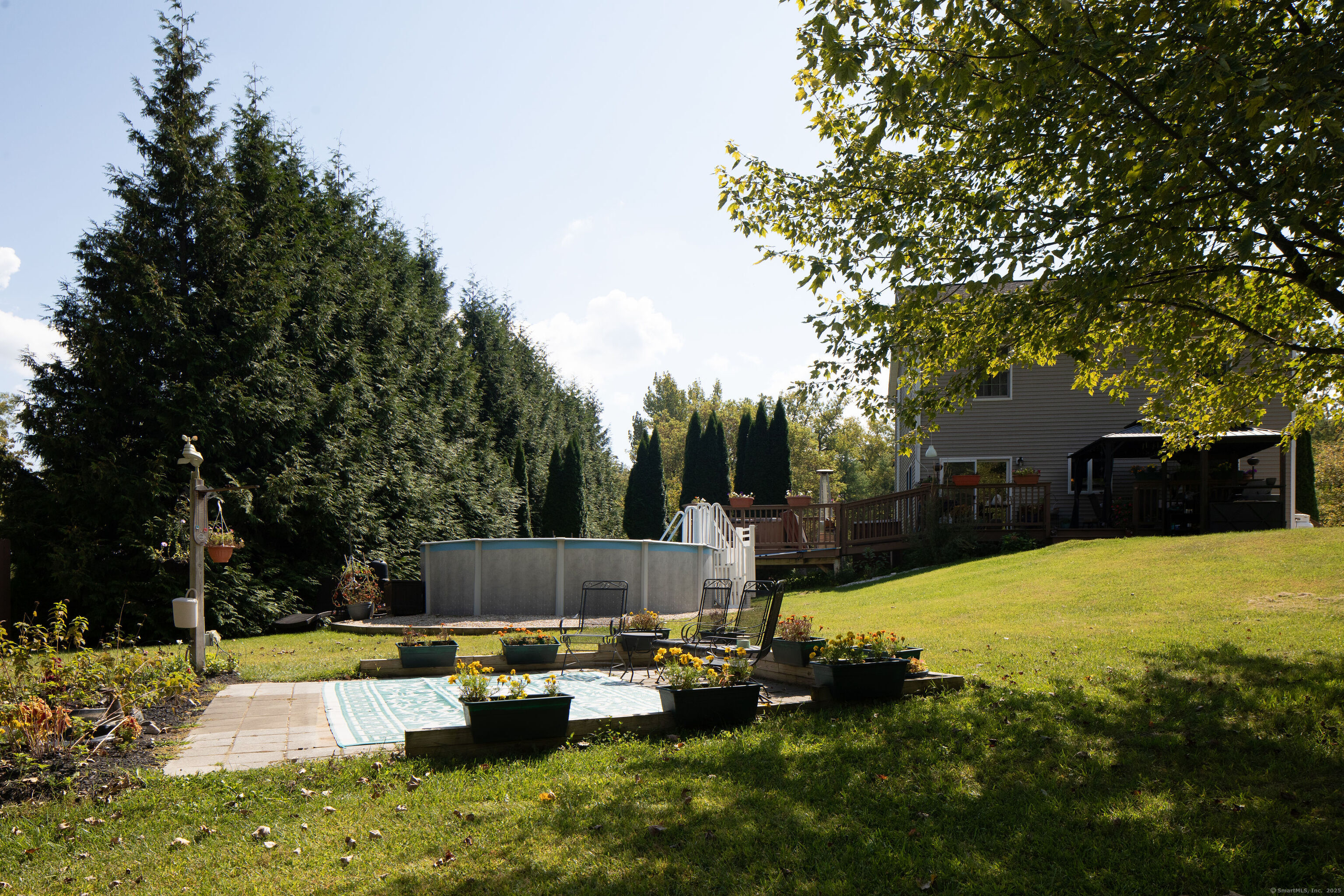 Beautifully Maintained Colonial with Outdoor Oasis! This well-kept Colonial offers three bedrooms, two full baths, and a wonderful balance of indoor comfort and outdoor enjoyment. The first floor features a bright kitchen with a 6-burner Viking stove, a formal dining room with sliders leading to the deck and gazebo, a spacious living room, and a full bath with laundry. A large, dry basement provides excellent storage or potential additional space. Upstairs you'll find three bedrooms, a den, and a full bath with double sinks. Central air ensures year-round comfort, and a generator hookup offers peace of mind. The backyard is designed for relaxation and entertaining, with multiple deck and patio areas, two gazebos, a hot tub, above-ground pool, and a stunning garden pond with waterfall. The property also includes a dog kennel, a metal shed, and a wooden shed with electric and water. With a large yard, mature plantings, and space to add a garage, this property has it all. Total property acreage is 1.86 with a half acre in Massachusetts. All room sizes are approximate.