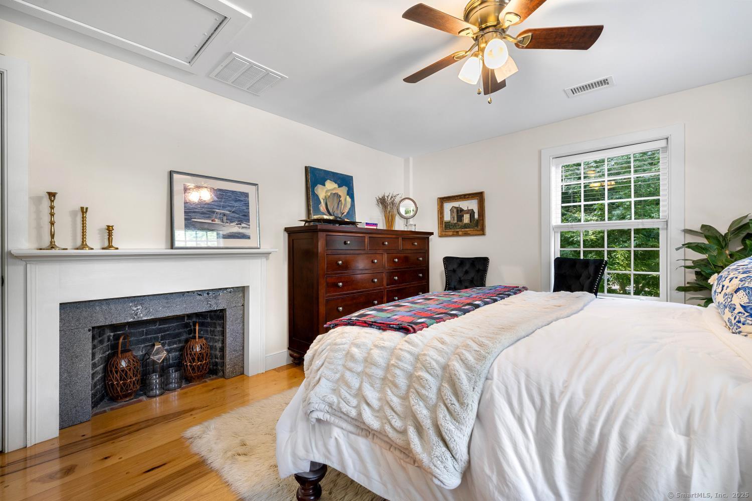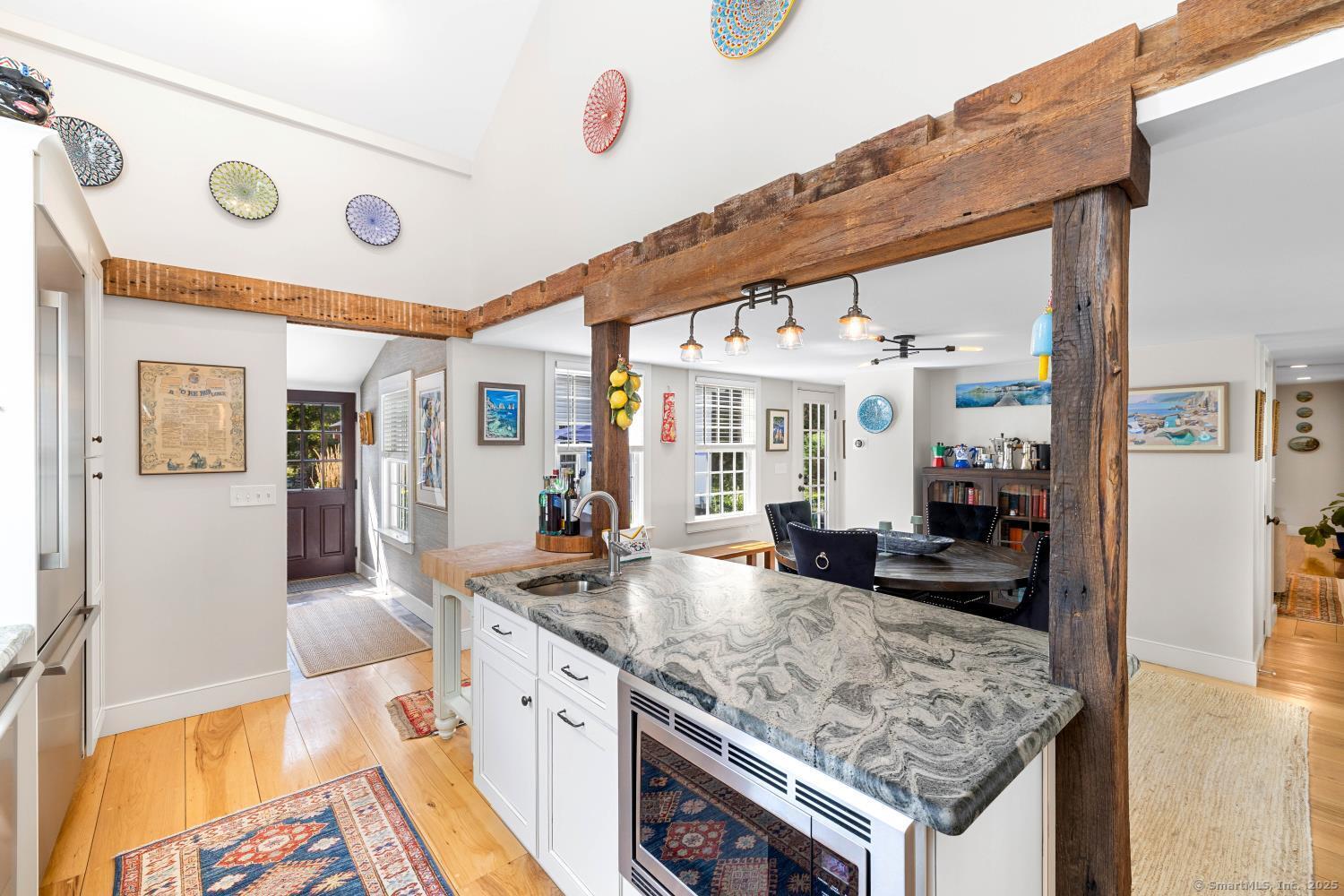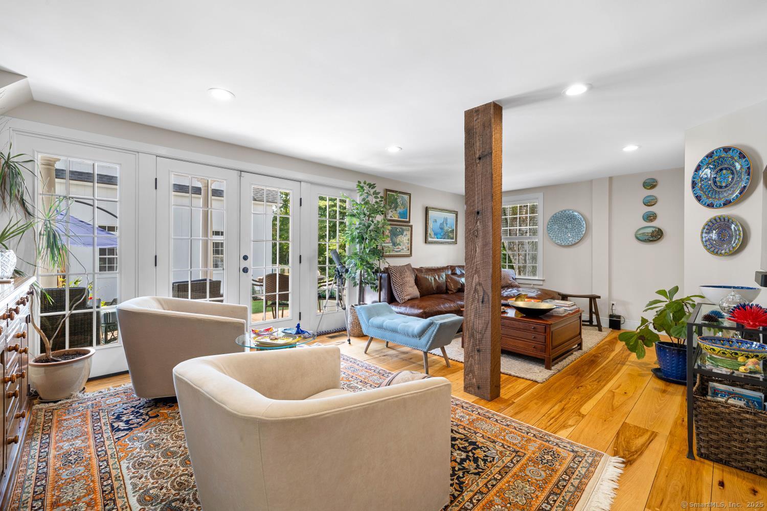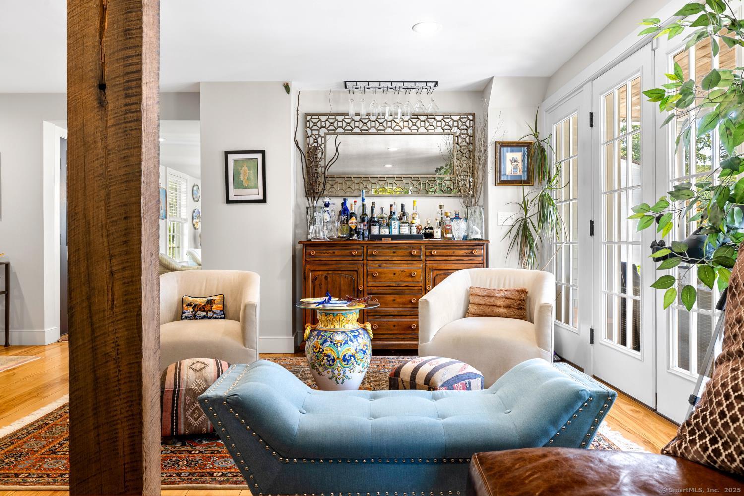 In the heart of Saybrook Village, this completely restored and remodeled vintage home blends modern convenience with timeless character, ideal for the discerning over-55 buyer who values both history and comfort or multi-generational buyers. The gourmet eat-in kitchen is a showpiece, with exposed beams, custom cabinetry, granite counters, a large island and vaulted ceilings, flowing seamlessly into the inviting living and den areas. French doors open from the living room to a private rear sitting porch, while a wood-burning fireplace enhances its warmth. Two gracious primary bedroom suites-one on the first floor-each feature fireplaces, elegant full baths and abundant closet space, providing flexibility and privacy. The upper level offers two additional bedrooms, one with its own fireplace, a full bath, and a balcony overlooking the main stairway. Throughout the home, wide-plank hickory hardwood floors, five fireplaces, and custom millwork highlight its craftsmanship. Modern upgrades include new Andersen windows, Therma-Tru doors, spray foam insulation, a high-efficiency 5-zone hydro-air system, on-demand hot water, natural gas service, and a new 1500-gallon septic system. A spacious mudroom with exterior access, dual laundry areas, and thoughtful design make daily living easy. Completing this exceptional property is a newly built oversized barn garage with workshop and finished living space, offering endless possibilities. Not in flood zone. Professional Photos to come!