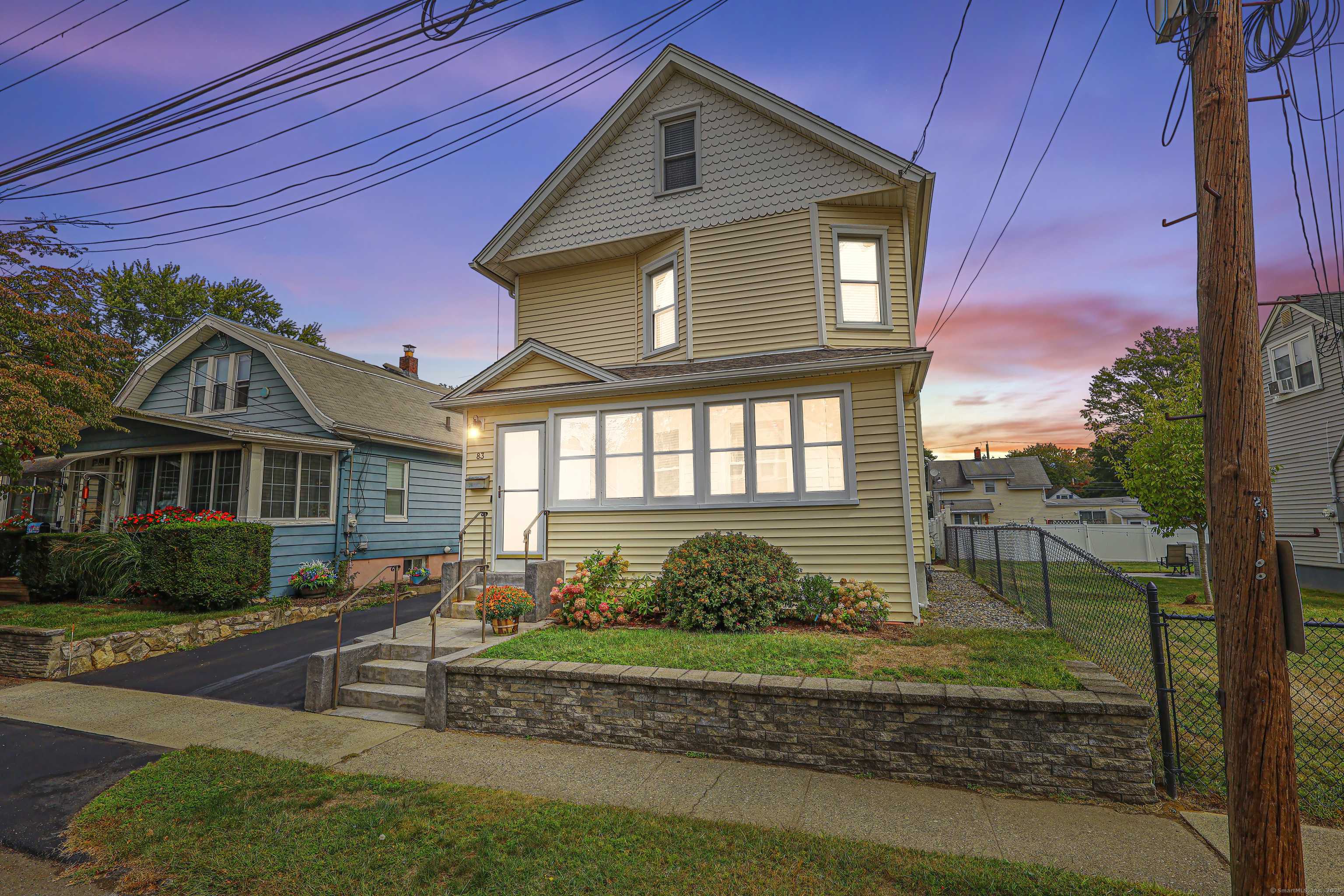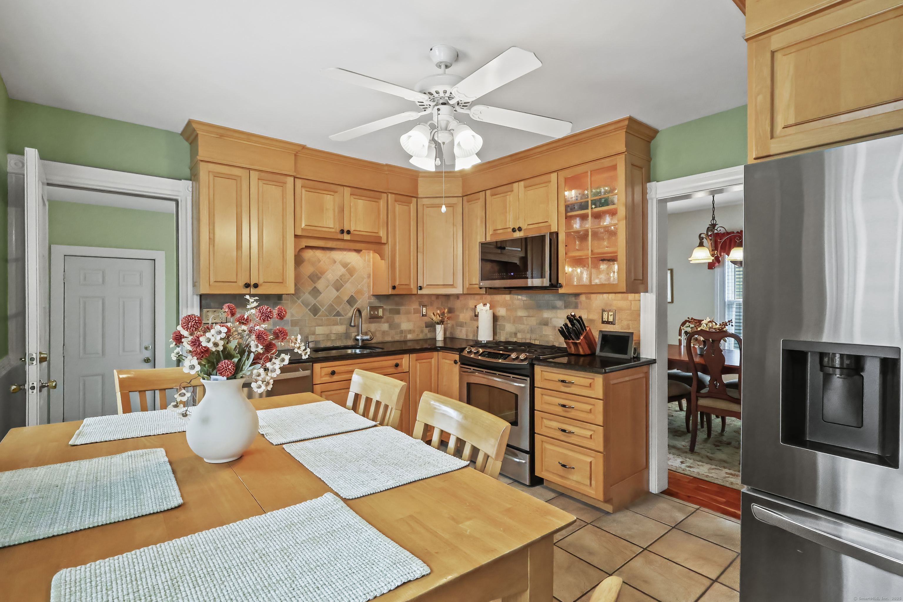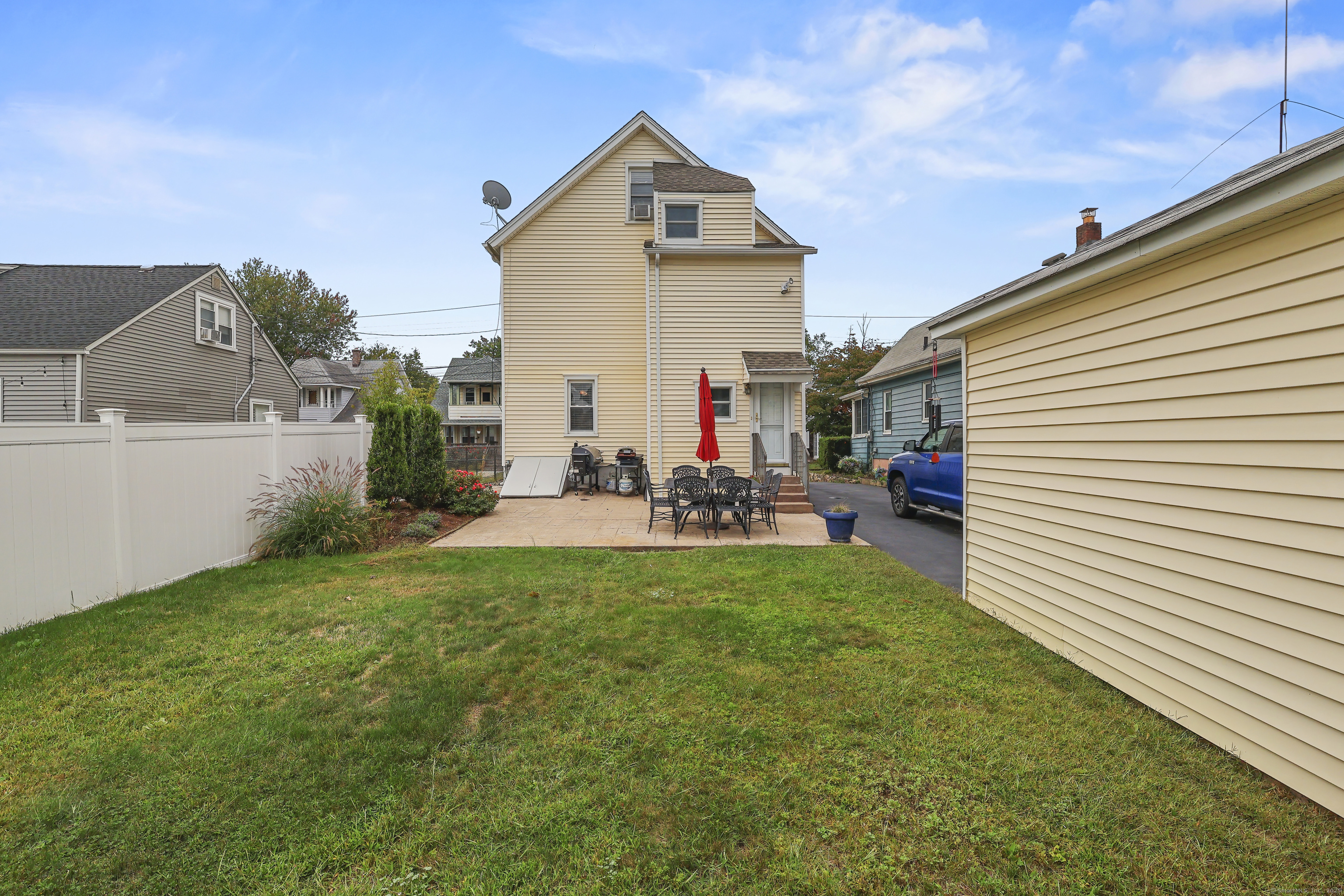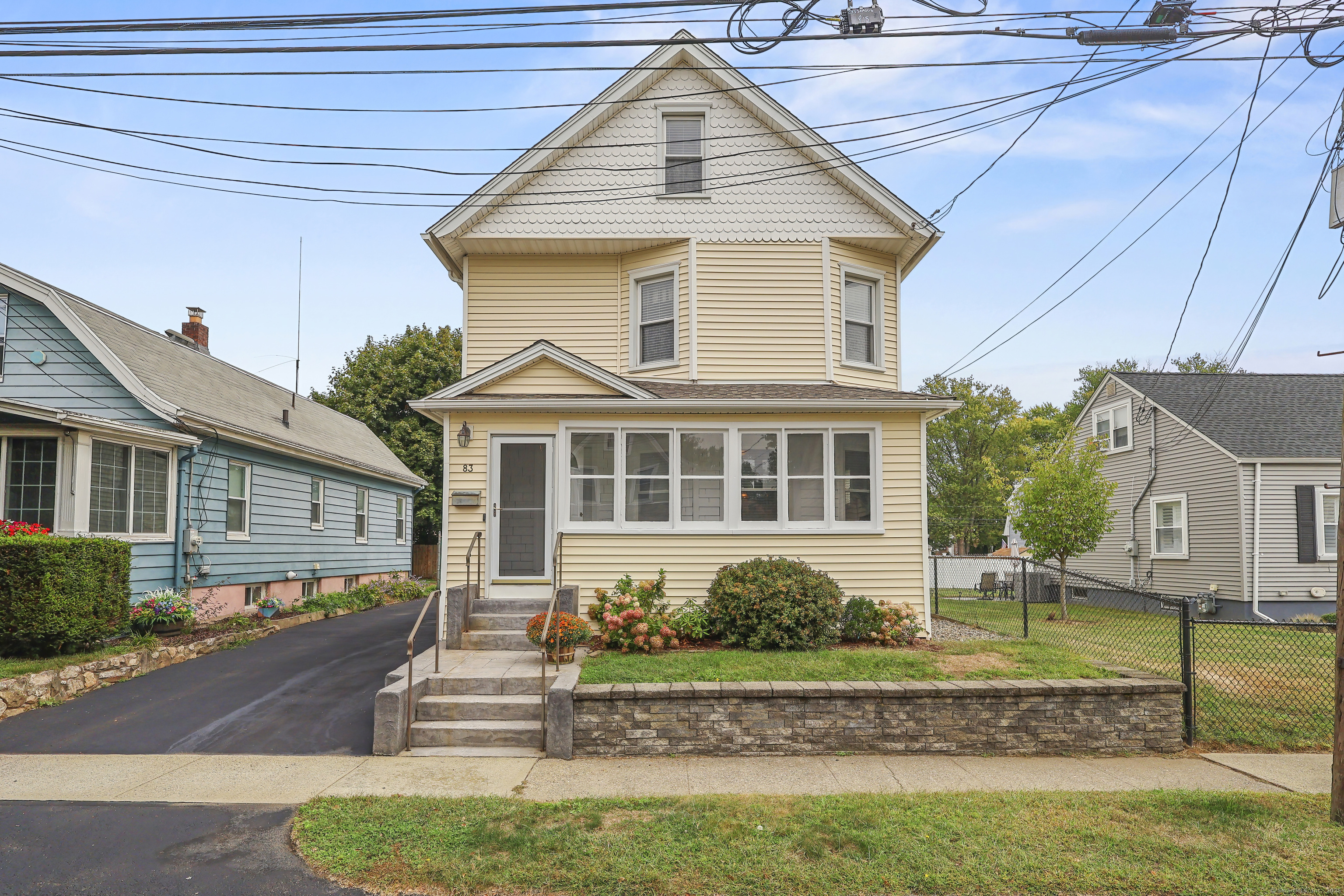 Conveniently located near all major highways, shopping centers, medical facilities, entertainment, and a wide array of restaurants, this beautifully maintained Milford Colonial offers the perfect blend of character, comfort, and convenience. Upon entering the front door, you're greeted by a large enclosed porch that fills with natural sunlight, perfect for morning coffee, reading, or showcasing your favorite plants. Inside, the updated kitchen features warm maple cabinetry, newer appliances, a ceiling fan, and a heated tile floor. It opens seamlessly into a spacious dining area and living room with ceiling fan, both highlighted by beautifully finished hardwood flooring. The second level offers a primary bedroom with hardwood floors and ceiling fan, two additional bedrooms with cozy wall-to-wall carpeting, and a fully updated bathroom with a newer shower and a heated towel warmer. The finished, carpeted, third level provides a versatile space ideal for a playroom, home office, or gym. The basement includes laundry and ample storage, with Bilco doors leading to a level backyard and a spacious patio perfect for entertaining. A detached one-car garage offers even more storage space. This well-maintained home blends classic charm with modern updates in a prime location. Don't miss your chance to make it yours. This immaculate home will go quickly!