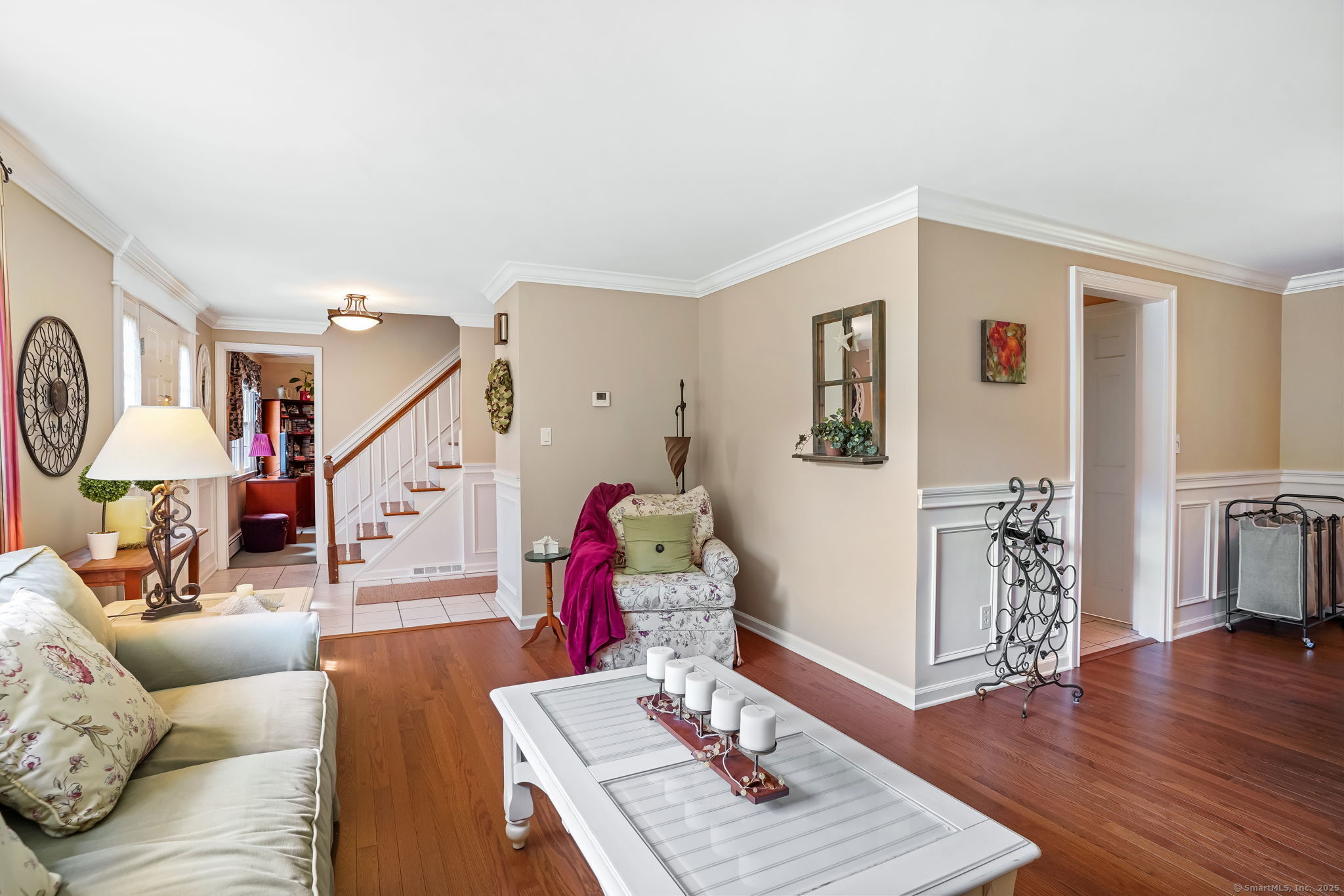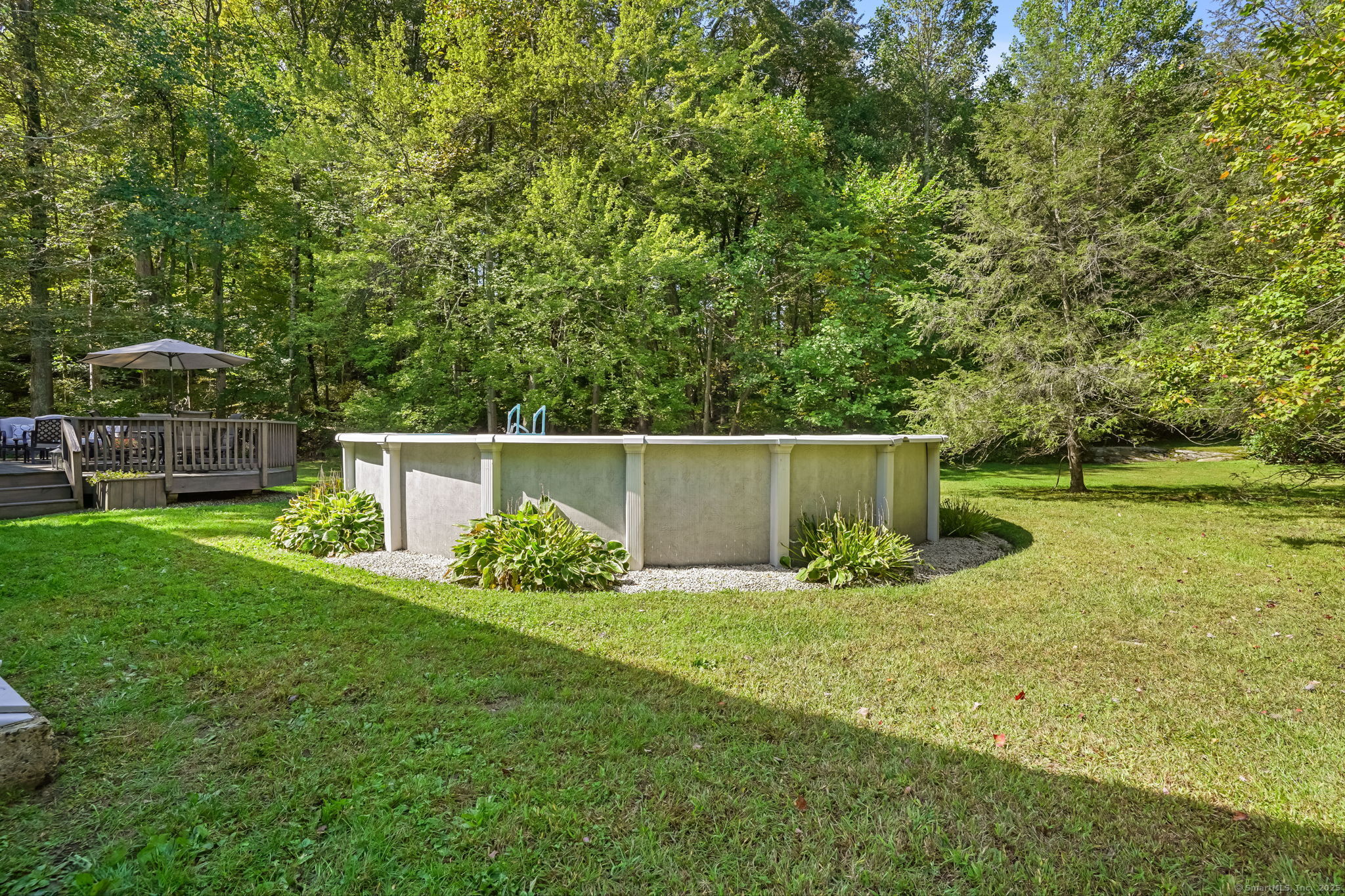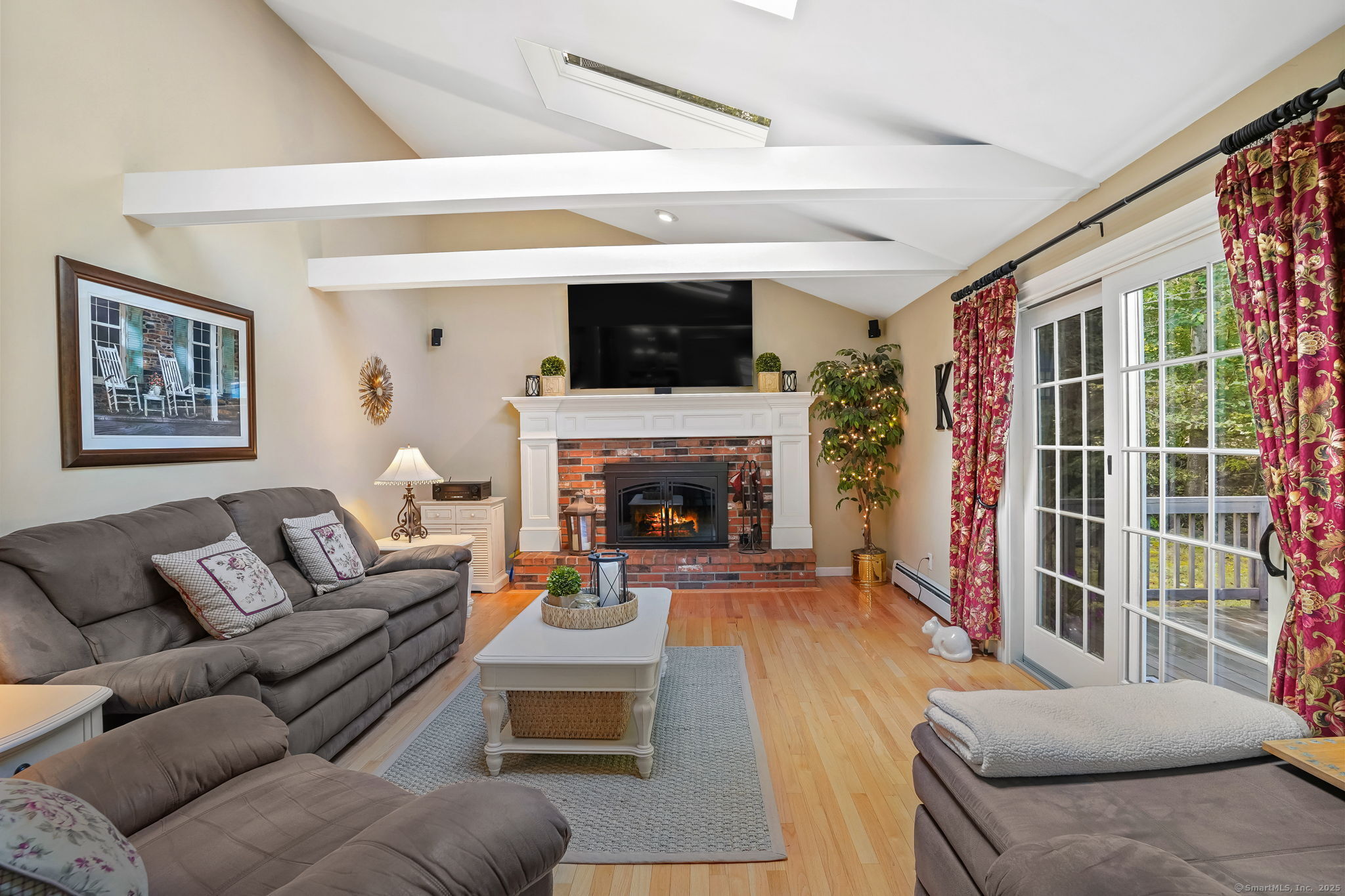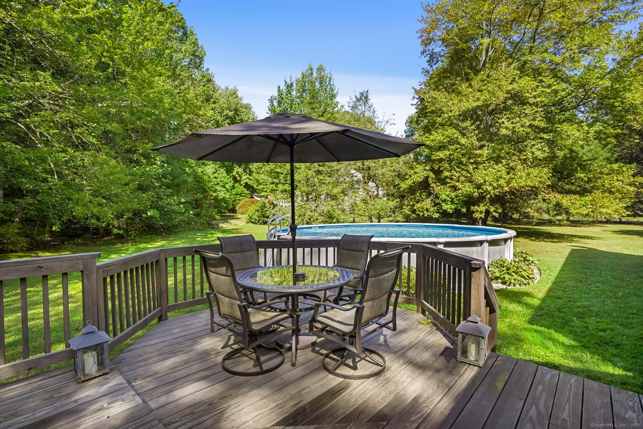 This classic colonial is set on a quaint street in one of Trumbull's most desirable neighborhoods. Offering over 2,300 square feet above grade with 4 bedrooms and 2.5 baths, this home blends comfort, space, and convenience. The exterior features timeless vinyl clapboard siding accented with a brick facade, while the flat one-acre backyard provides a private retreat with a refinished deck and above-ground pool. Inside, the first floor is filled with natural light and hardwood floors that run through most rooms. The living and dining rooms connect seamlessly, creating an ideal flow for gatherings. The eat-in kitchen is finished with granite countertops, ample cabinet storage, and additional built-in pantry space, perfectly situated next to the step-down family room with vaulted ceilings, skylights, a fireplace, and sliders to the deck. A powder room, laundry area, and a versatile room currently serving as a home office complete the main level. Upstairs, the spacious primary suite features abundant closet space and a private full bathroom. Three additional well-sized bedrooms share a separate full hall bathroom, offering comfort and convenience. The finished lower level adds approximately 500 square feet of living space, featuring high ceilings and durable vinyl flooring, ideal for a recreation room, gym, or media space. With its serene setting, thoughtful layout, and central location close to all Trumbull amenities, this home is ready to welcome a new owner.