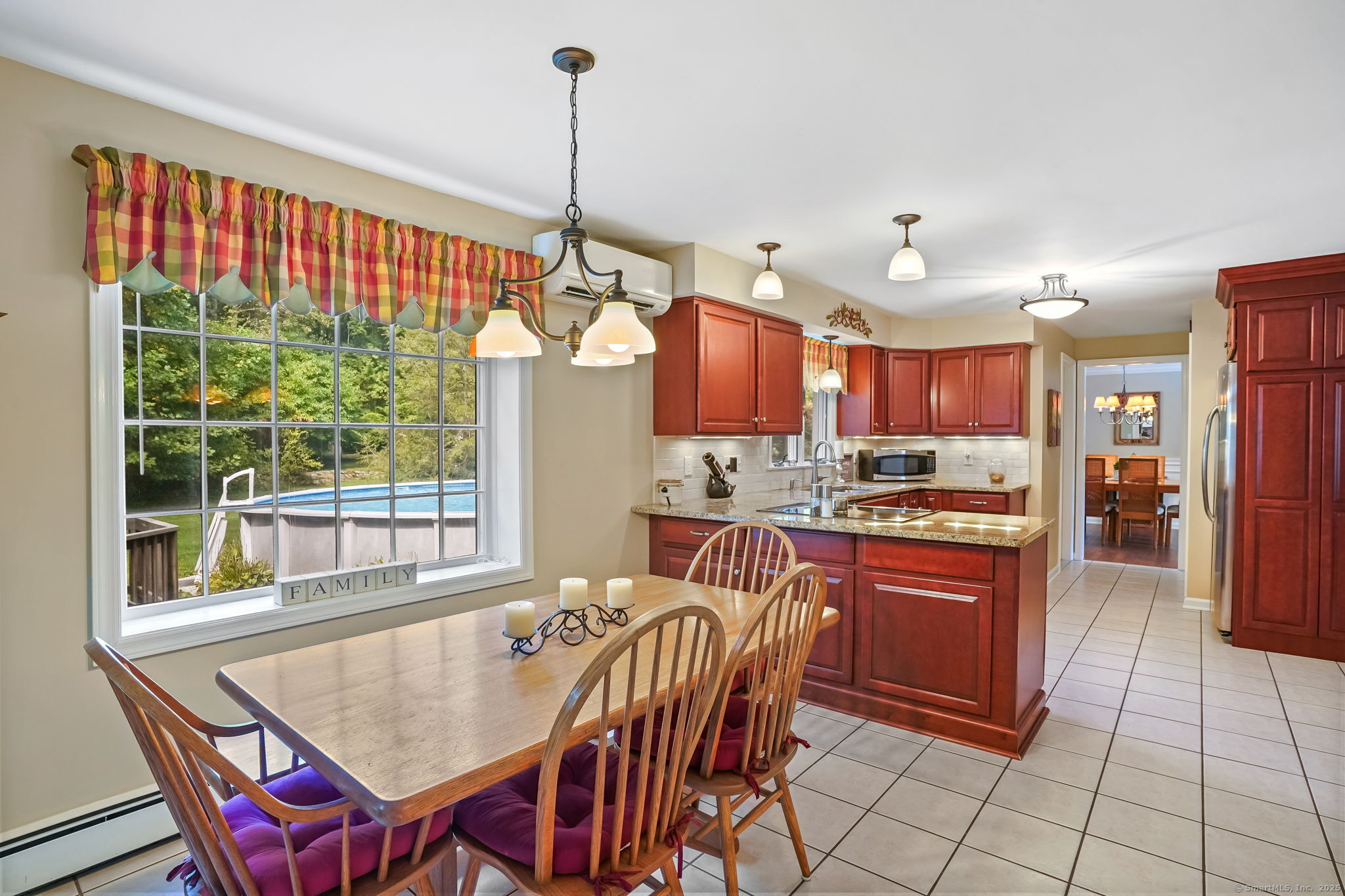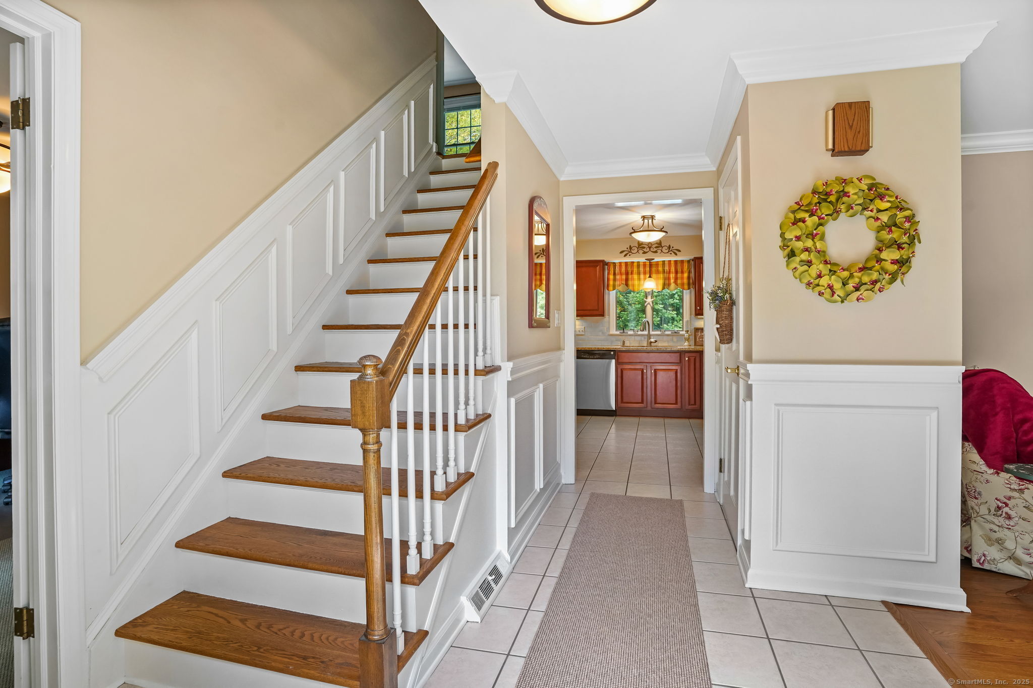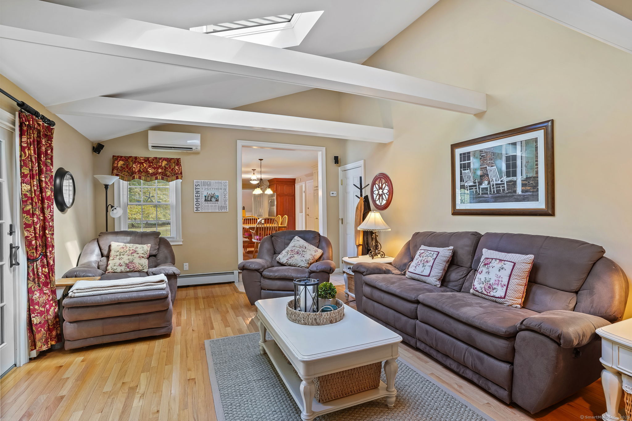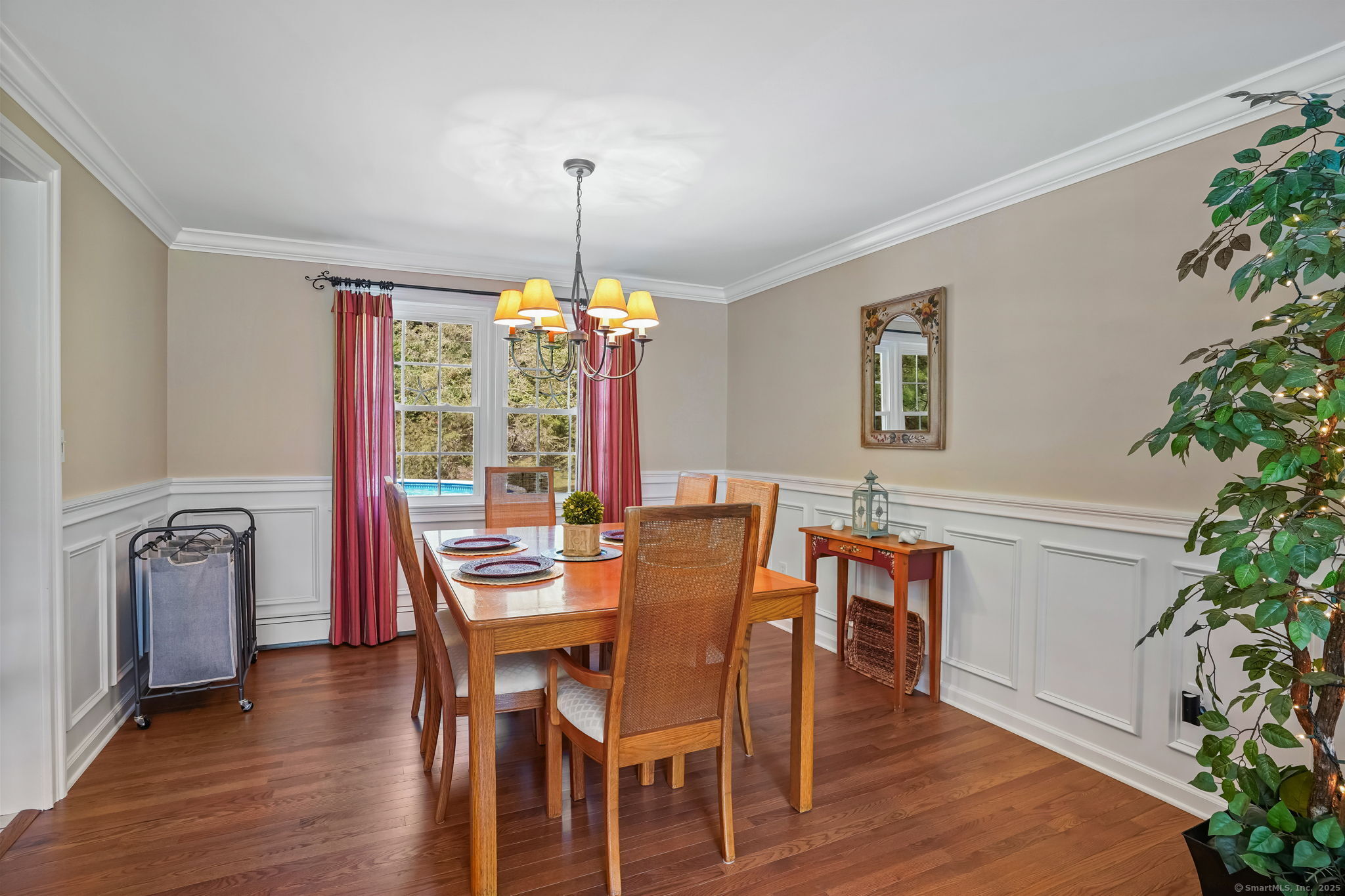 This classic colonial is set on a quaint street in one of Trumbull's most desirable neighborhoods. Offering over 2,300 square feet above grade with 4 bedrooms and 2.5 baths, this home blends comfort, space, and convenience. The exterior features timeless vinyl clapboard siding accented with a brick facade, while the flat one-acre backyard provides a private retreat with a refinished deck and above-ground pool. Inside, the first floor is filled with natural light and hardwood floors that run through most rooms. The living and dining rooms connect seamlessly, creating an ideal flow for gatherings. The eat-in kitchen is finished with granite countertops, ample cabinet storage, and additional built-in pantry space, perfectly situated next to the step-down family room with vaulted ceilings, skylights, a fireplace, and sliders to the deck. A powder room, laundry area, and a versatile room currently serving as a home office complete the main level. Upstairs, the spacious primary suite features abundant closet space and a private full bathroom. Three additional well-sized bedrooms share a separate full hall bathroom, offering comfort and convenience. The finished lower level adds approximately 500 square feet of living space, featuring high ceilings and durable vinyl flooring, ideal for a recreation room, gym, or media space. With its serene setting, thoughtful layout, and central location close to all Trumbull amenities, this home is ready to welcome a new owner.
