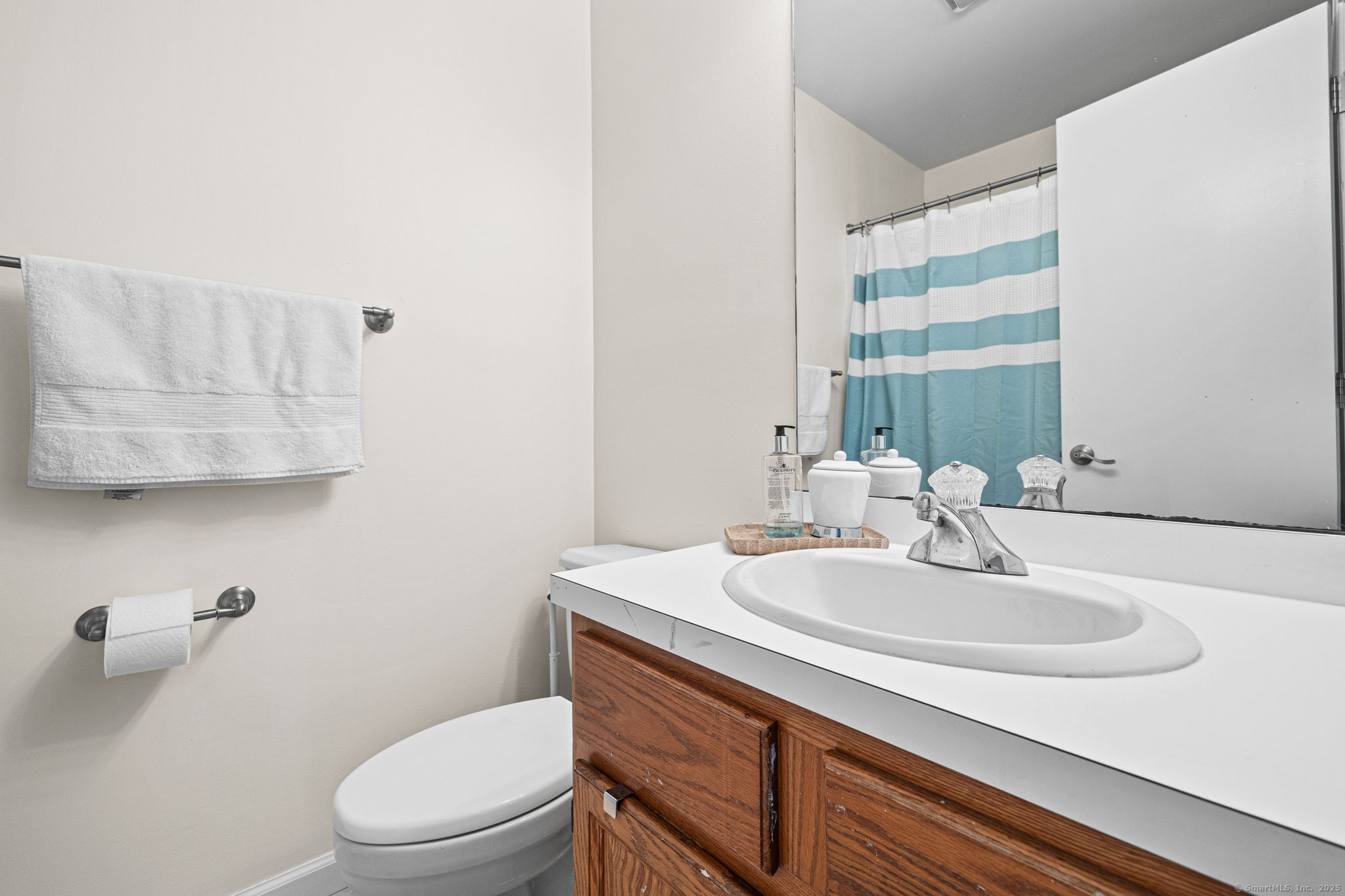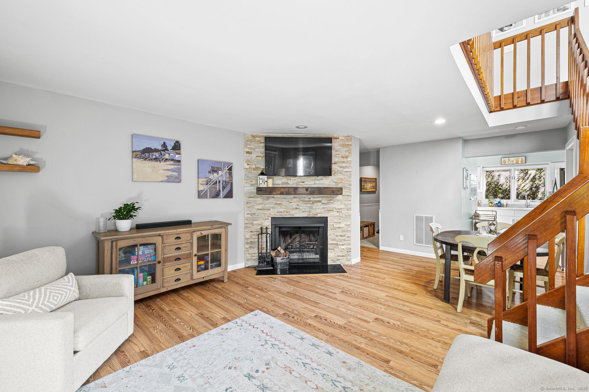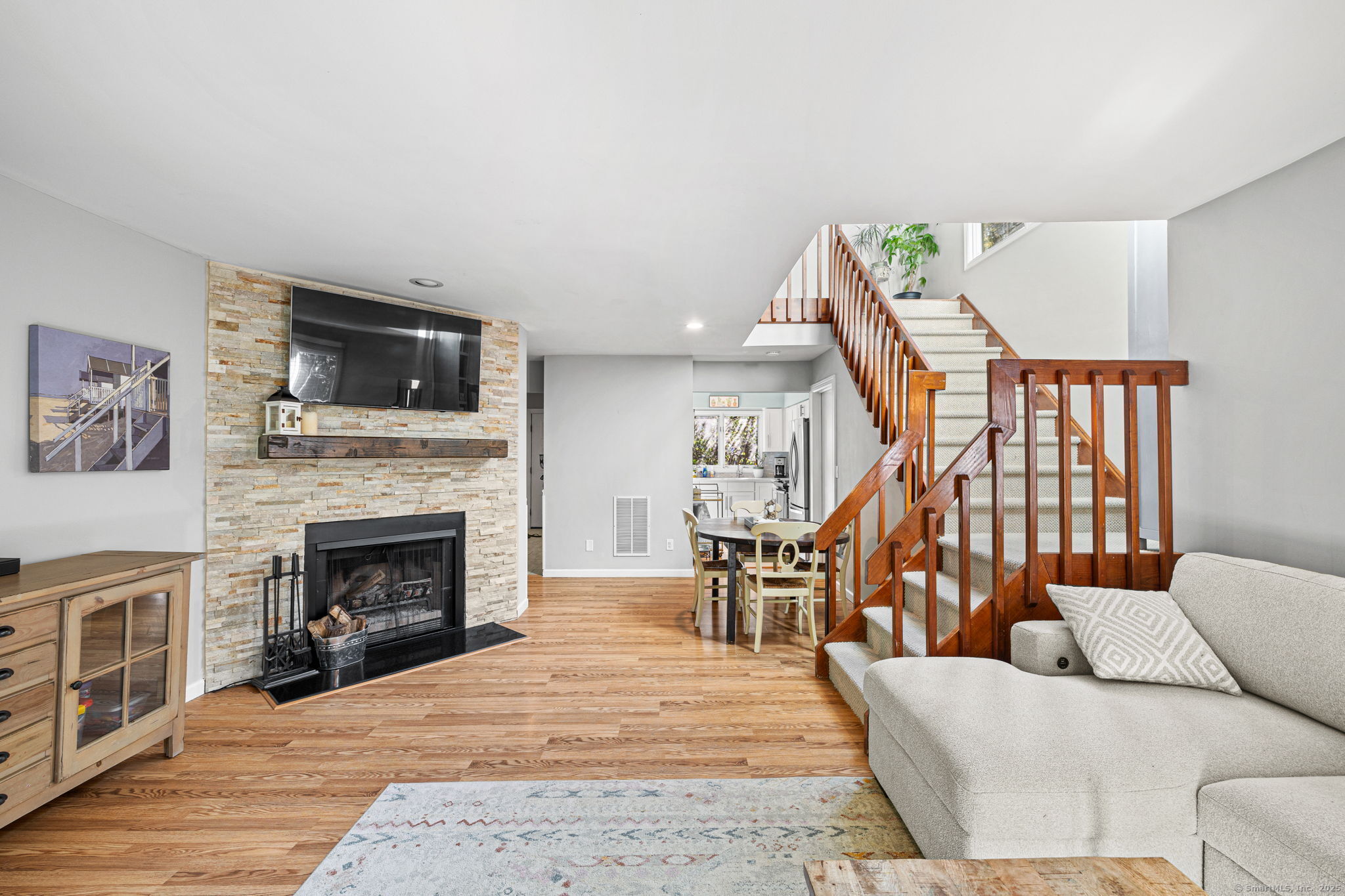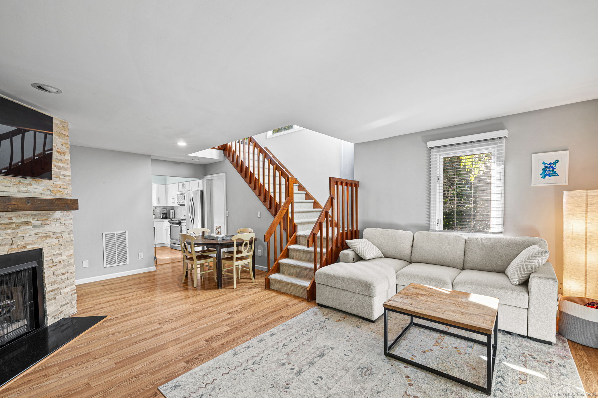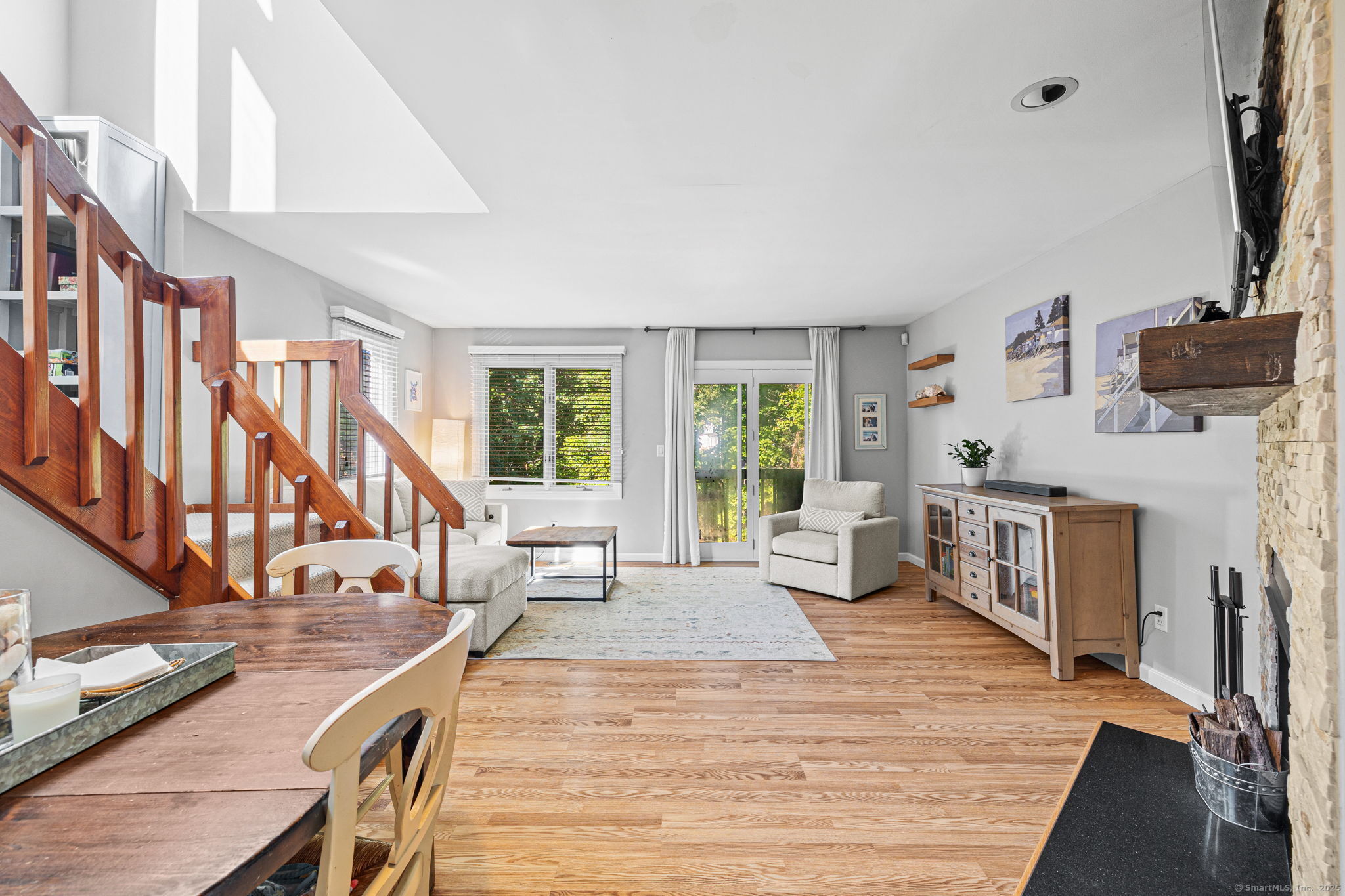 Welcome to desirable Strawberry Woods! This end-unit townhouse sits in a private spot of the community, just 1/2 mile to Route 1 shops and dining and minutes to Westport Center. Warm and inviting the moment you enter, this updated 2 bed / 2.5 bath home offers an ideal blend of charm, comfort, and convenience. The main floor features an updated kitchen. A dining area opens to the spacious living room with wood-burning fireplace and French doors to a private deck overlooking a tree-lined backyard - perfect for dining or relaxing. A powder room completes the main level. Upstairs, both bedrooms feature large windows, and double closets. Two full baths offer privacy for each bedroom. One bedroom boasts an additional outdoor balcony. A bright lower level with windows provides even more flexible space. Great space for a playroom/office/flex space with storage and laundry. Community amenities include a pool, reserved parking plus ample visitor parking, and beautifully maintained grounds (with fresh paving and exterior painting underway). A wonderful and convenient place to call home!