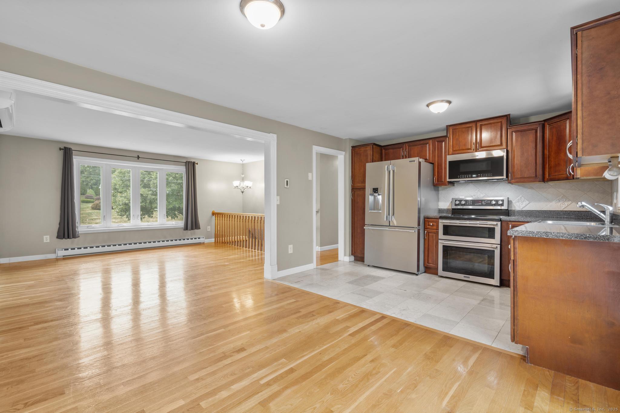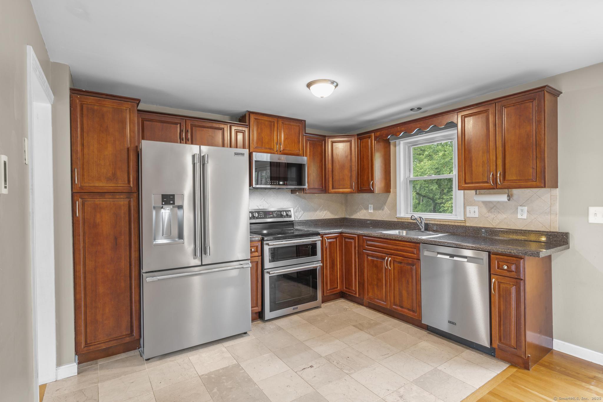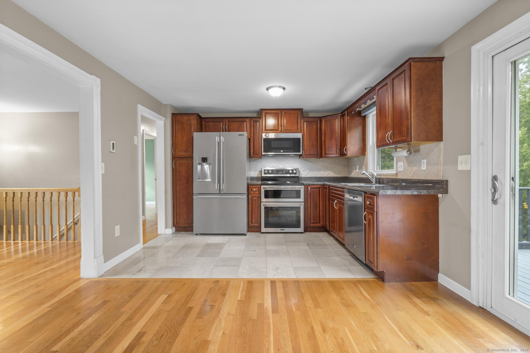 FOR RENT ! This unique raised ranch offers a rare layout-fully above grade-with versatile living spaces & thoughtful upgrades throughout. Located in a prime, private setting backing up to town-owned land, you'll enjoy peace, privacy & natural surroundings. Once you head upstairs, you're welcomed into a modern open-concept layout. The living room features a brand-new oversized bay window, flooding the space with natural light. It flows seamlessly into the dining area & remodeled kitchen, making it perfect for family gatherings. The kitchen includes newer cabinetry, stainless appliances & stylish finishes. The main bathroom has been remodeled & features dual sinks. The primary bedroom is generously sized & you'll find 2 well-appointed guest bedrooms-one with a custom paneled accent wall. While raised in design, the entire home is fully above ground, offering natural light on both levels. Upon entry, you can head straight into the living area or a few steps up to the bedroom level. The ground level includes: a large finished family room, a beautifully upgraded full bathroom with a walk-in shower & an adjacent laundry area, direct access to the attached garage, & a spacious bonus room, open to a bar area, with doors leading to the covered patio and backyard-ideal for entertaining or hosting overnight guests. Step outside & enjoy a deck overlooking a level, grassy backyard, A shed for added storage & a covered patio-perfect for shaded outdoor relaxation.