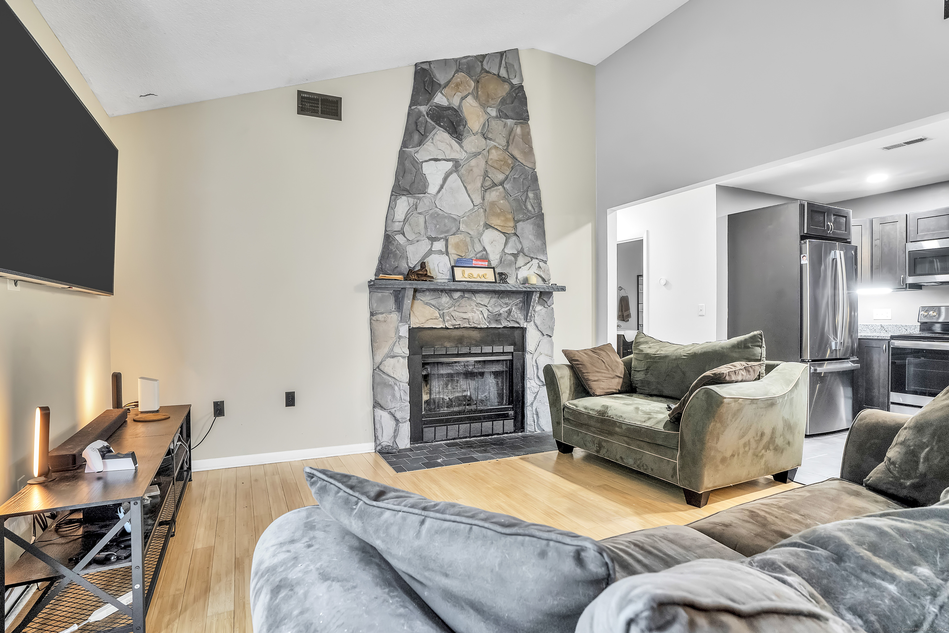 Welcome to Hidden Pond - where privacy meets contemporary charm! Tucked away in the peaceful, rarely available, and highly sought-after Hidden Pond complex, this beautifully maintained townhouse offers the perfect blend of comfort, style, and privacy. The main level has open concept living with dining area that showcases vaulted ceilings, a cozy fireplace, and sliding doors to the deck with tranquil wooded views. The remodeled kitchen is a standout, featuring granite counters, modern cabinets and stainless steel appliances. There is a primary bedroom with an updated full bath, charming barn doors, and even a deck for your morning coffee. To complete this level there is a second bedroom, full bath and laundry area. Upstairs you'll find large third bedroom, which could also make the perfect home office.