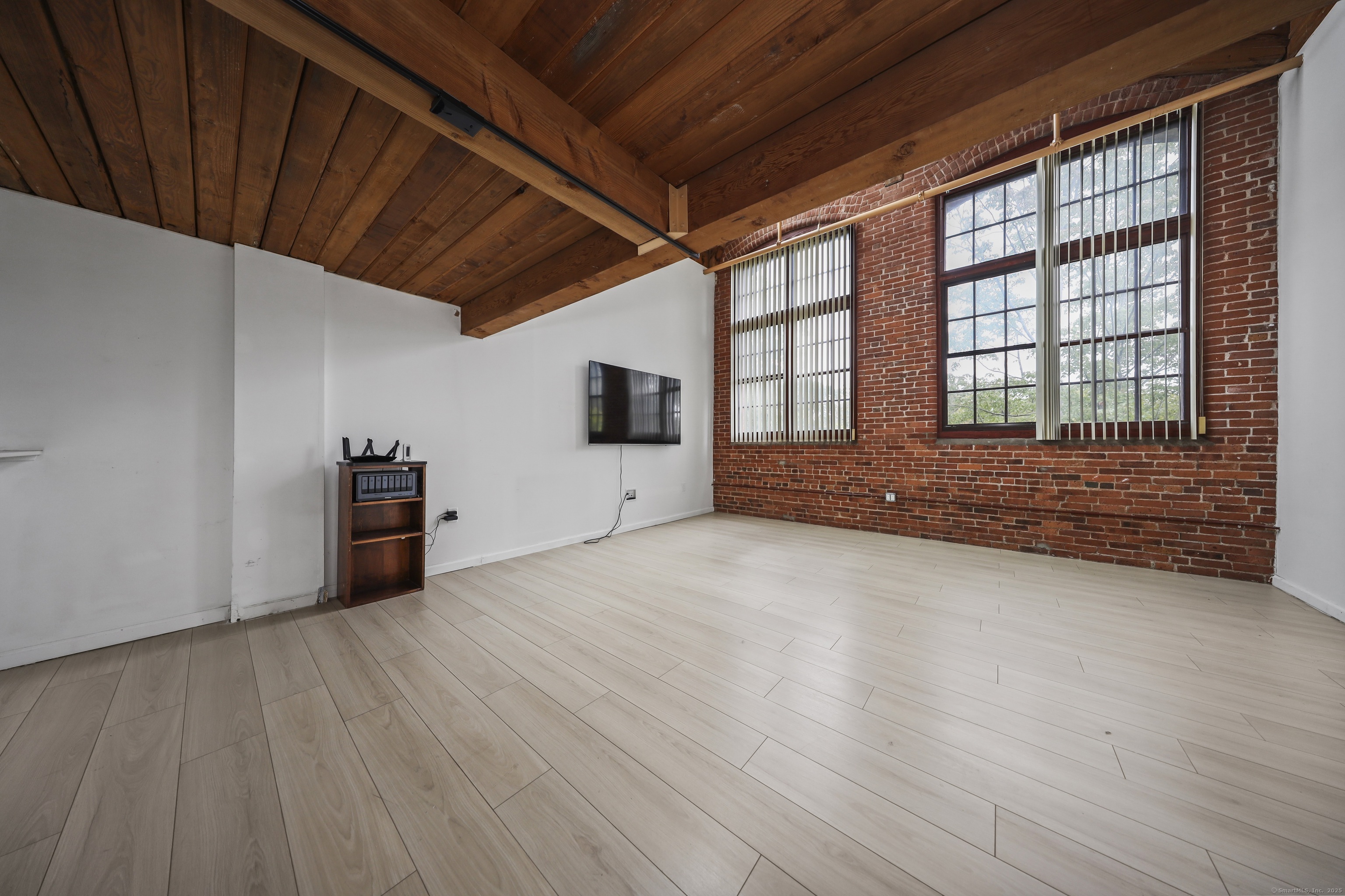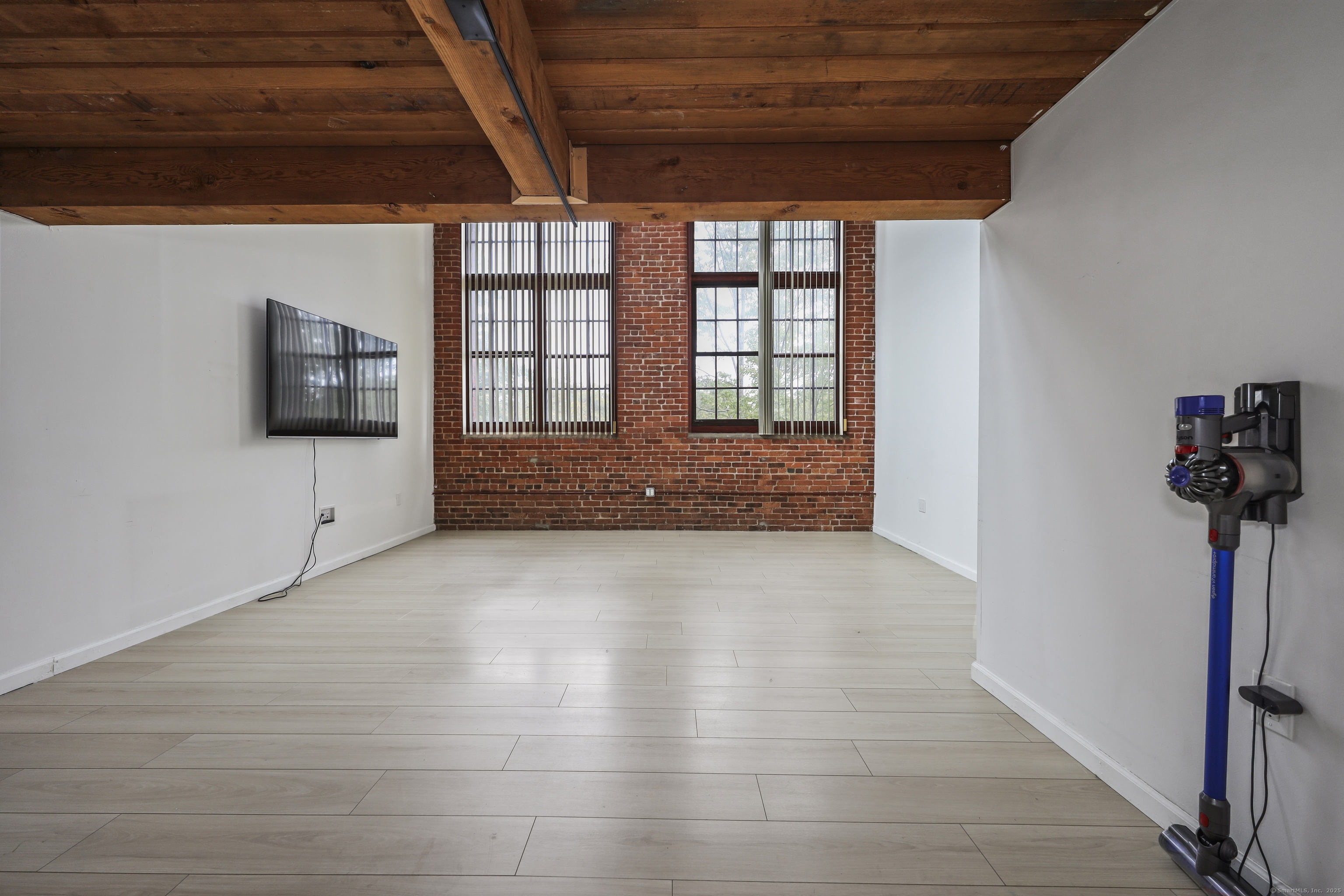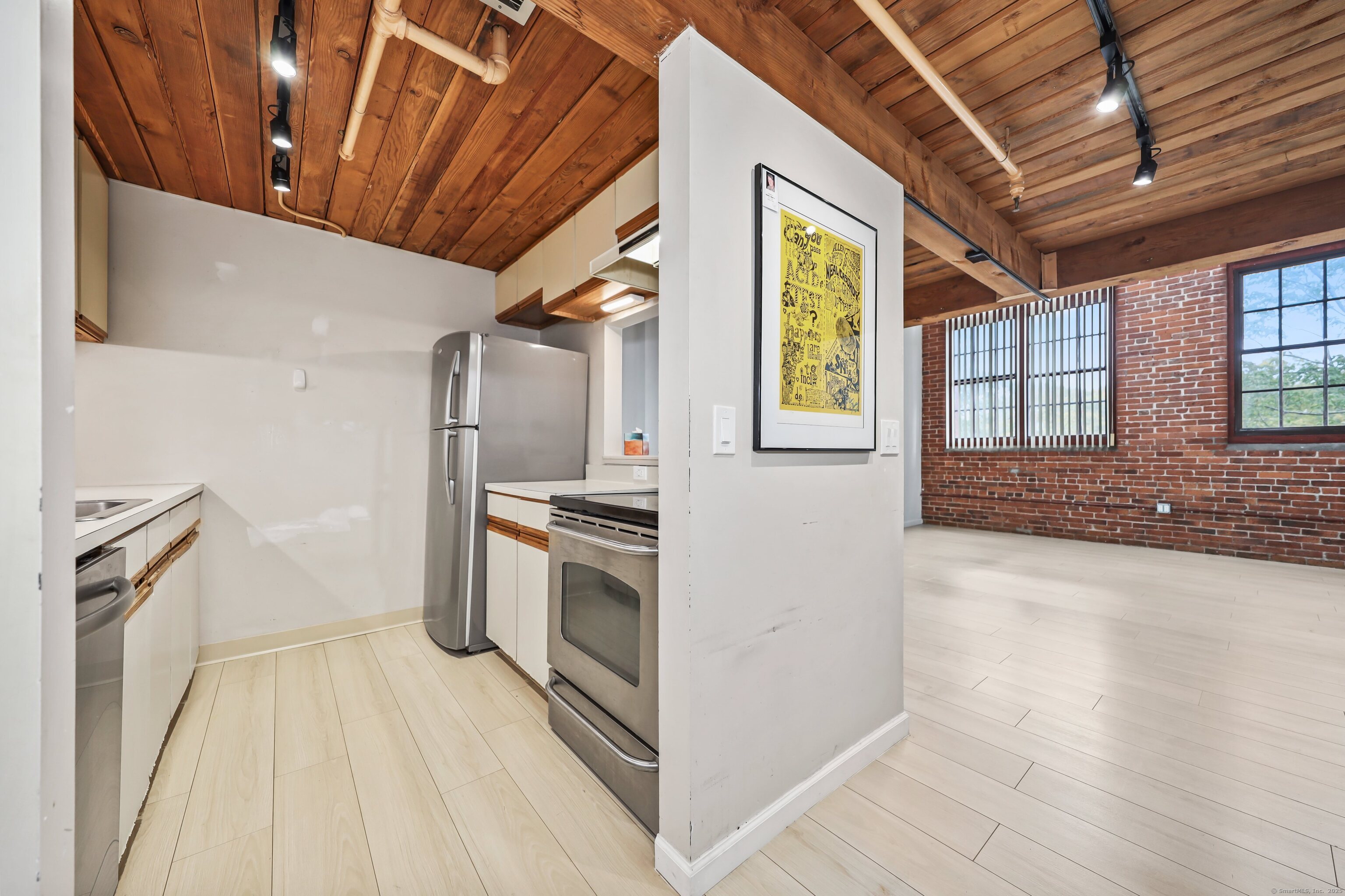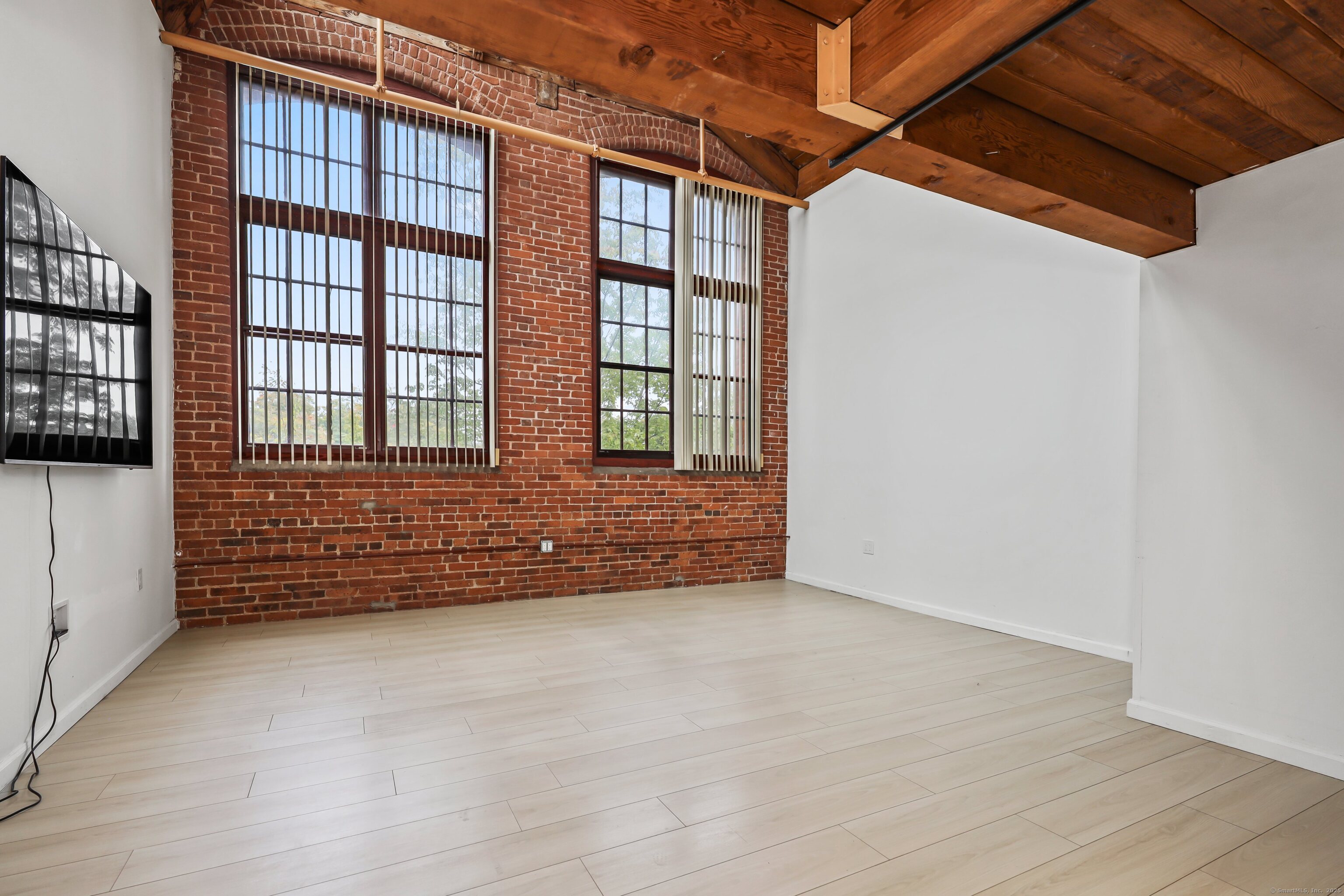 Welcome to this beautifully updated 1-bedroom, 1.5-bath, 800 sq ft, loft-style condo in the historic Warrenton Mill complex in Torrington, CT. This unique residence blends the charm of early 20th-century industrial architecture with modern upgrades for today's lifestyle. With soaring ceilings, exposed brick walls, original wood beams, and oversized factory-style windows, the space is filled with natural light and timeless character. Inside, the main floor features brand-new flooring, providing a fresh, clean look that complements the open-concept living and dining area. The galley kitchen includes stainless steel appliances and ample storage, making it both functional and stylish. The spacious primary bedroom includes a full en-suite bath and generous closet space, while a convenient half bath is located off the main living area-ideal for guests. The unit also benefits from updated mechanicals, offering added comfort and efficiency. Located in a secure, elevator-equipped, professionally managed building, residents enjoy shared laundry facilities, ample parking, and a pet-friendly community. Just minutes from downtown Torrington, Route 8, local parks, and restaurants, this condo offers low-maintenance living with unique industrial flair.