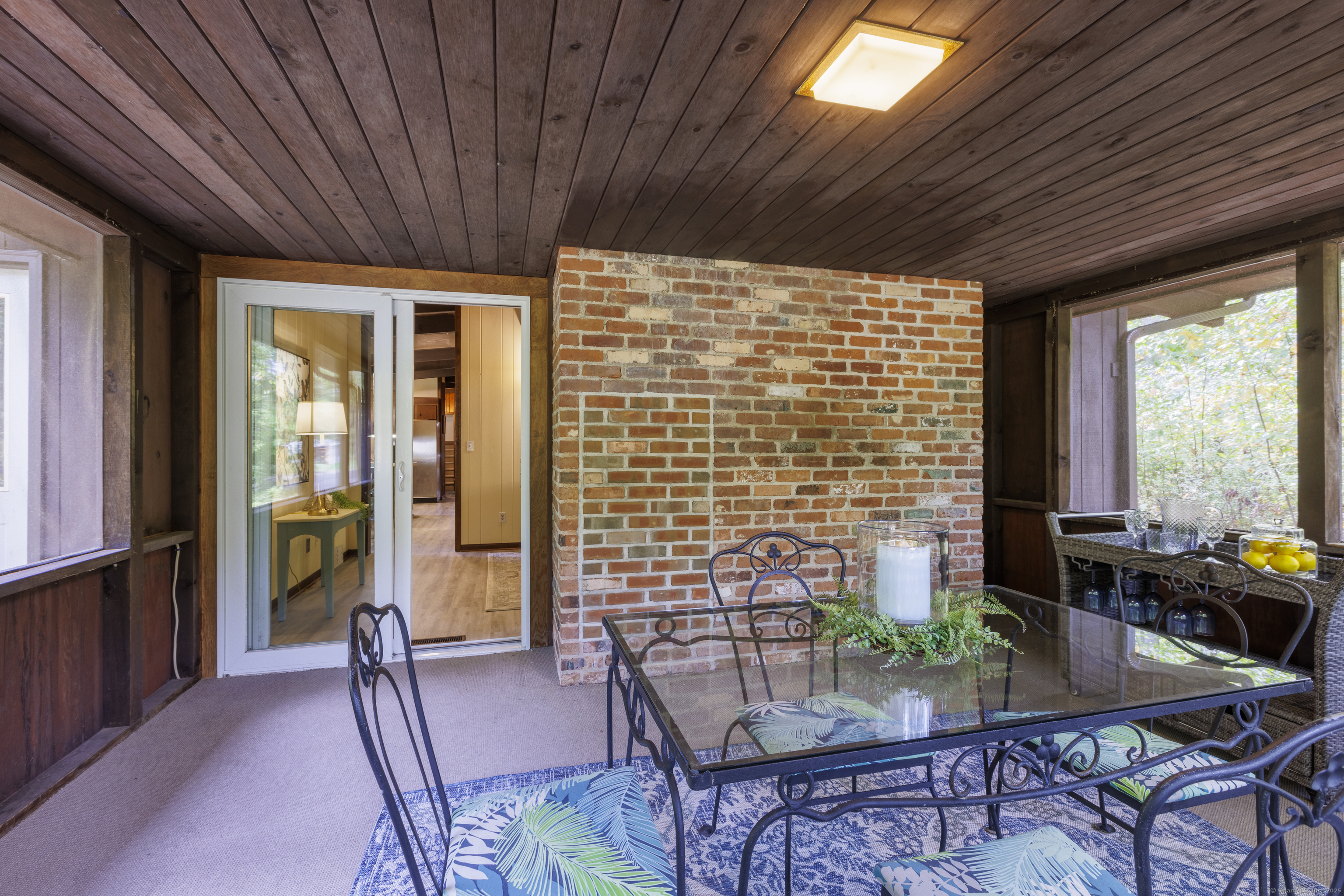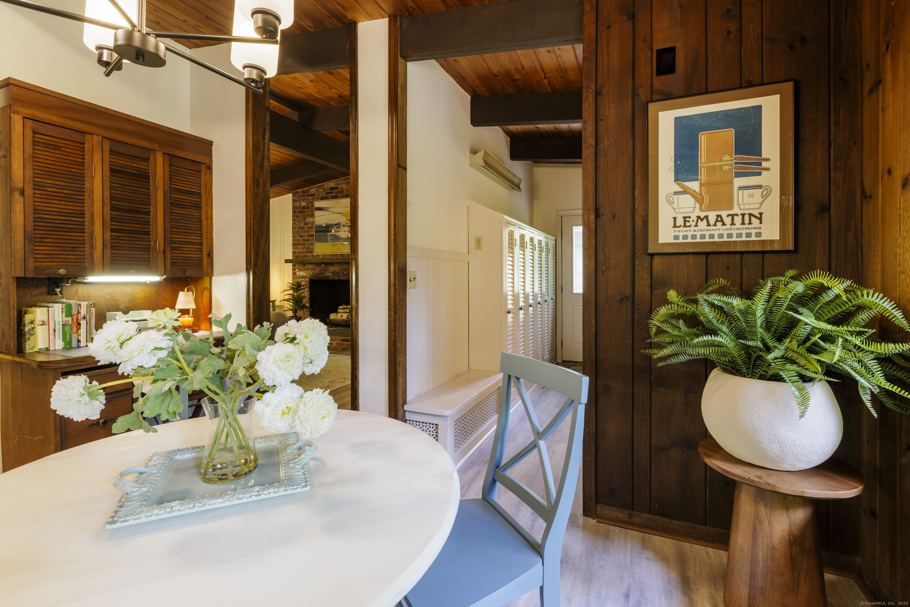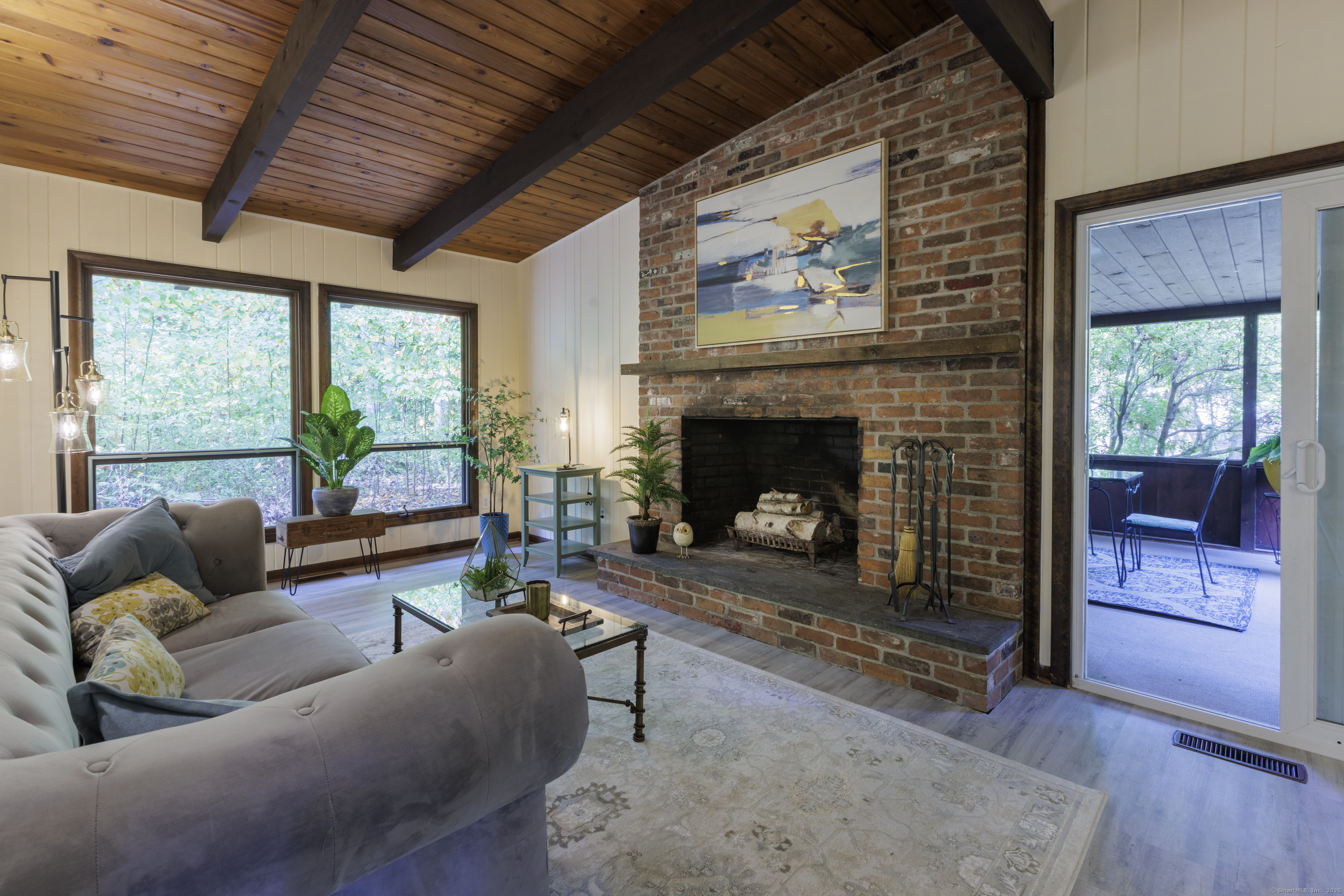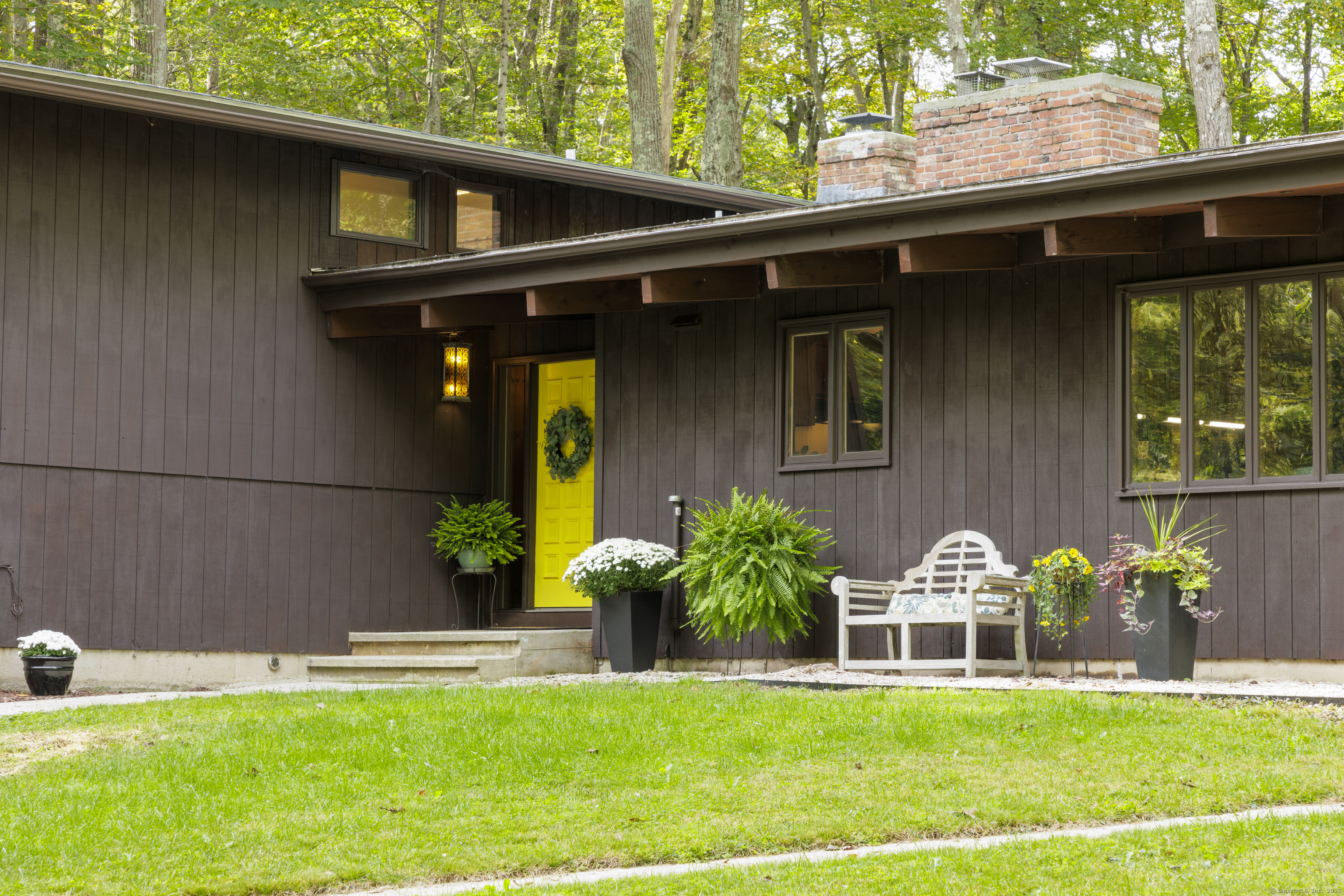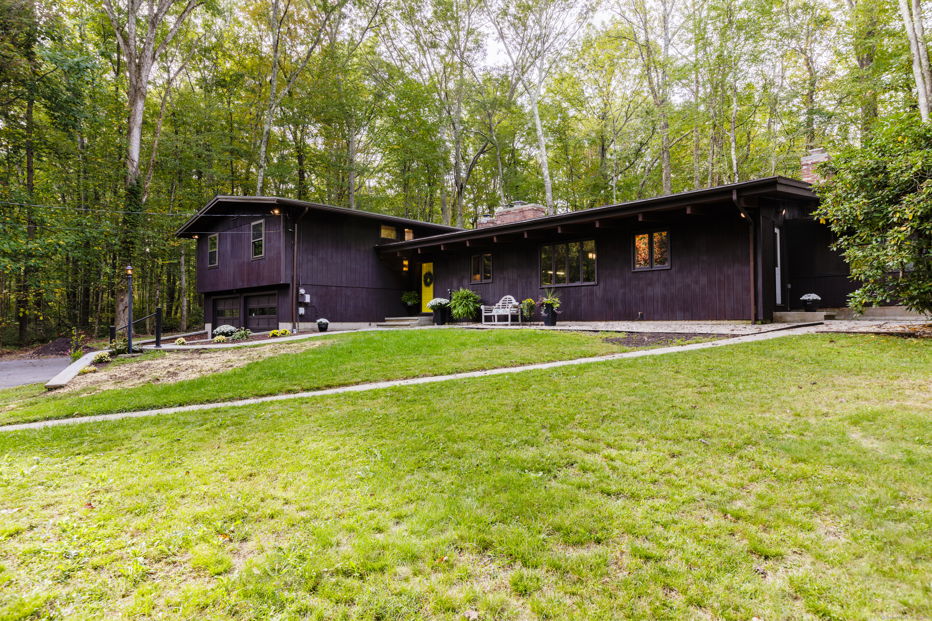 Never before offered to the public. A Local respected builder's own home blends contemporary mid century elements reminiscent of Franklin Lloyd Wright's "organic" design. Wooden interior textures, expansive windows invite the exterior landscape offering a place of solitude and refuge. Warm wood tones and naturalistic design of the vaulted wood ceilings, floor to ceiling fireplaces envelop you; providing a sense of warmth and safety. Four spacious bedrooms. One is currently used as a library. The primary bedroom has a built-in office with doors and shelving. The lower level has a family room with a large flat screen for sporting events and movie nights. The kitchen is equipped with a breakfast bar island , separate eating area, and built-in desk. Off of the family room with another floor to ceiling fireplace are sliders leading to a screened in porch. If you want the privacy of approximately two acres, yet have the ability to affiliate within a cul-de sac neighborhood this home is not to be missed.