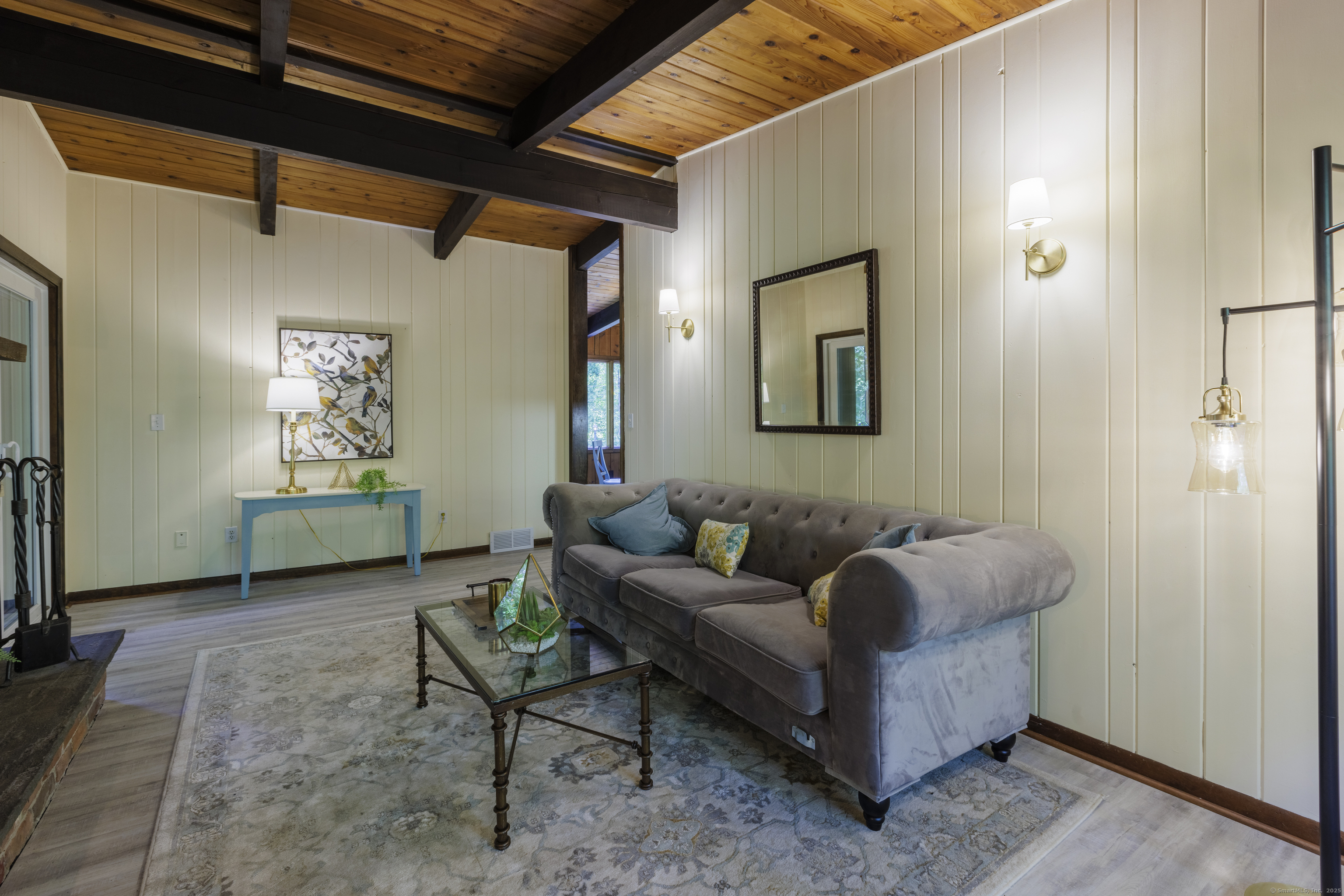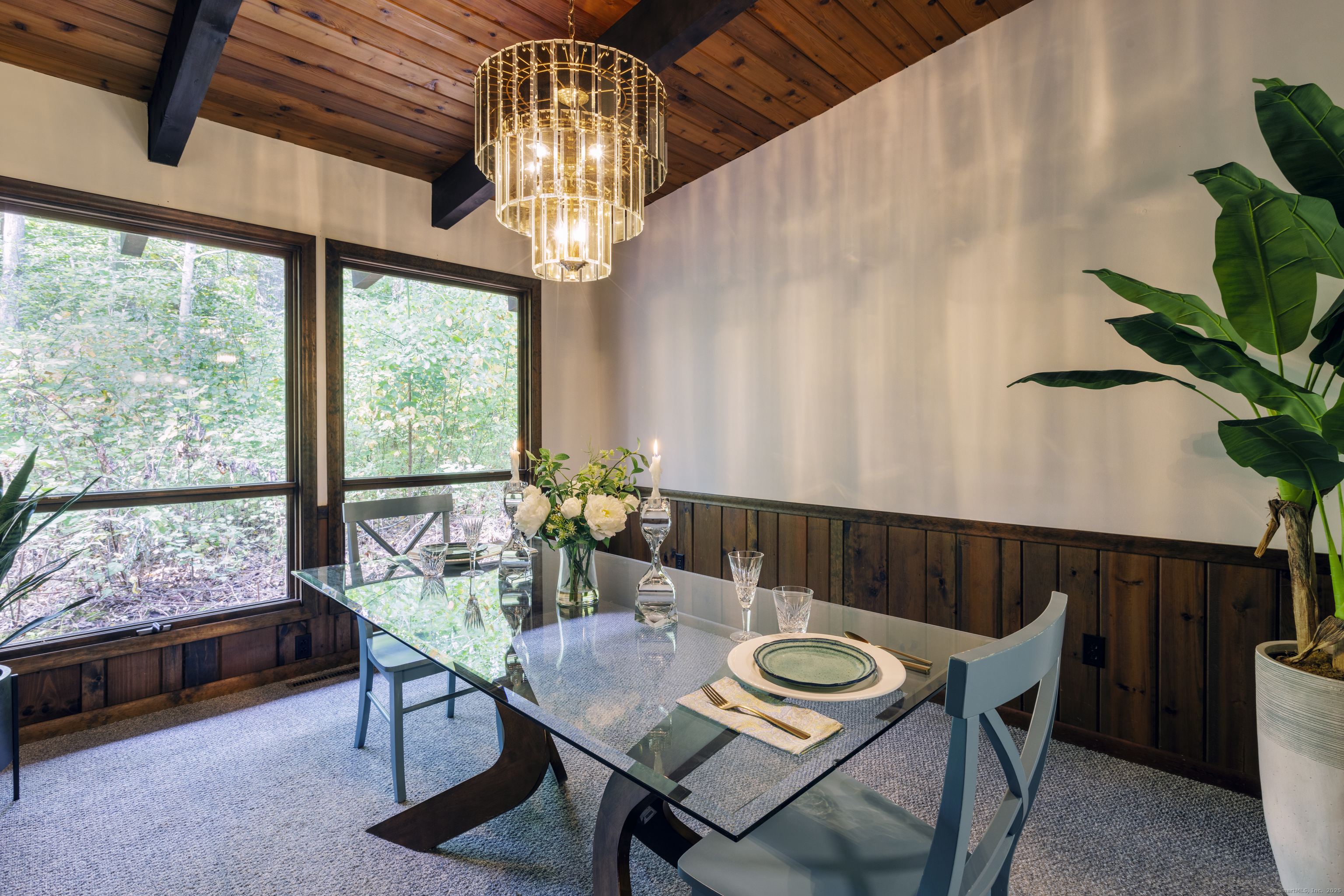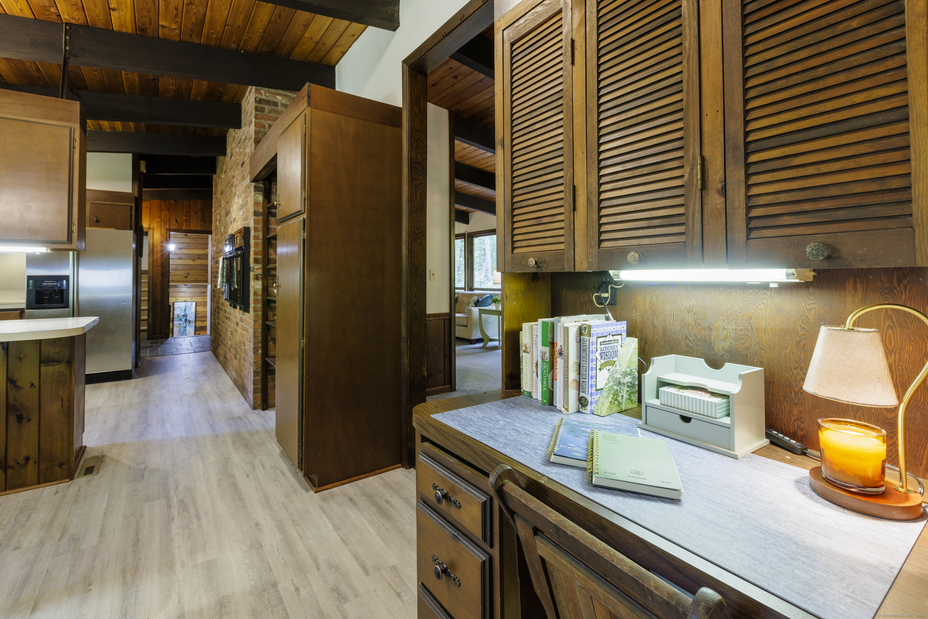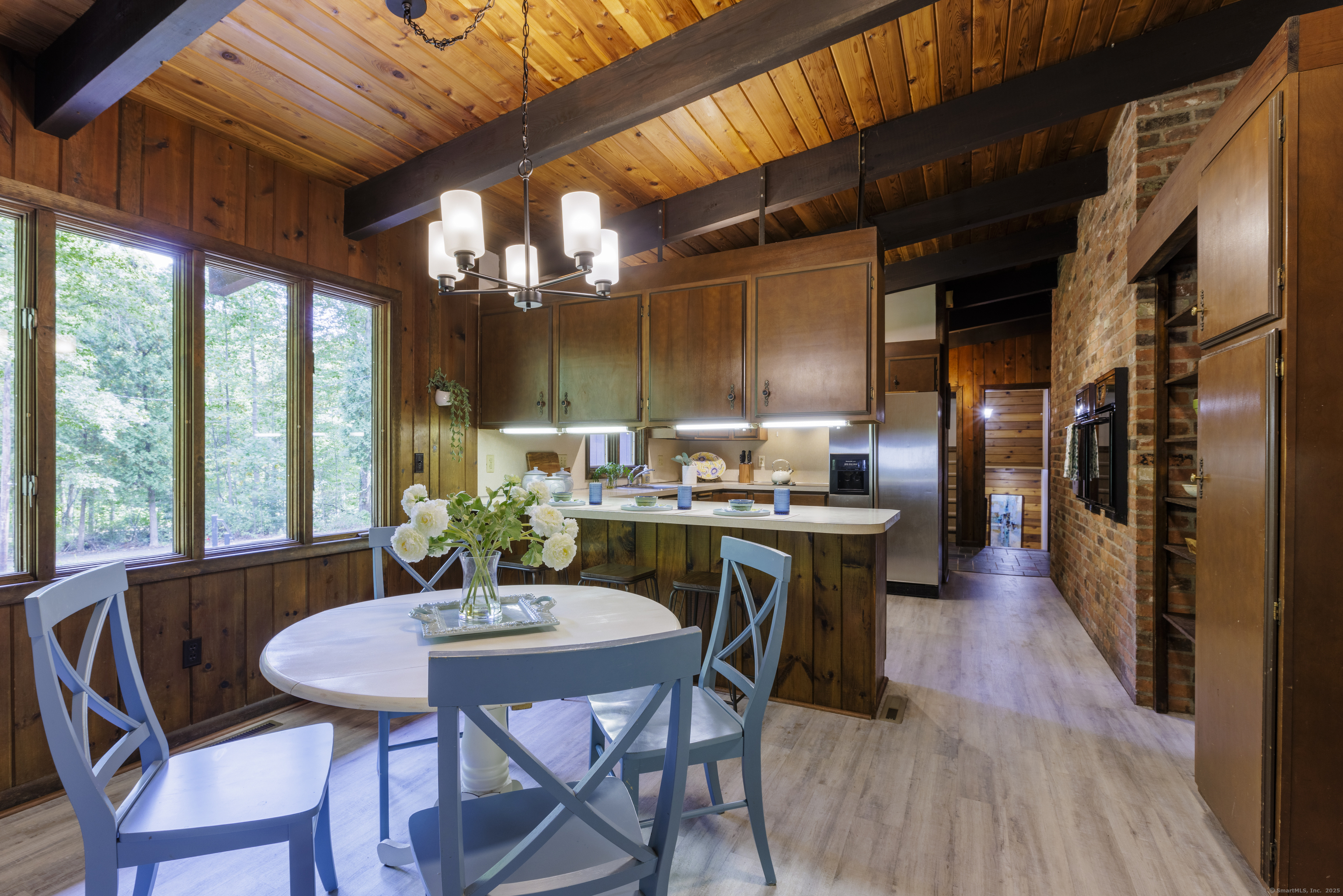 Never before offered to the public. A Local respected builder's own home blends contemporary mid century elements reminiscent of Franklin Lloyd Wright's "organic" design. Wooden interior textures, expansive windows invite the exterior landscape offering a place of solitude and refuge. Warm wood tones and naturalistic design of the vaulted wood ceilings, floor to ceiling fireplaces envelop you; providing a sense of warmth and safety. Four spacious bedrooms. One is currently used as a library. The primary bedroom has a built-in office with doors and shelving. The lower level has a family room with a large flat screen for sporting events and movie nights. The kitchen is equipped with a breakfast bar island , separate eating area, and built-in desk. Off of the family room with another floor to ceiling fireplace are sliders leading to a screened in porch. If you want the privacy of approximately two acres, yet have the ability to affiliate within a cul-de sac neighborhood this home is not to be missed.