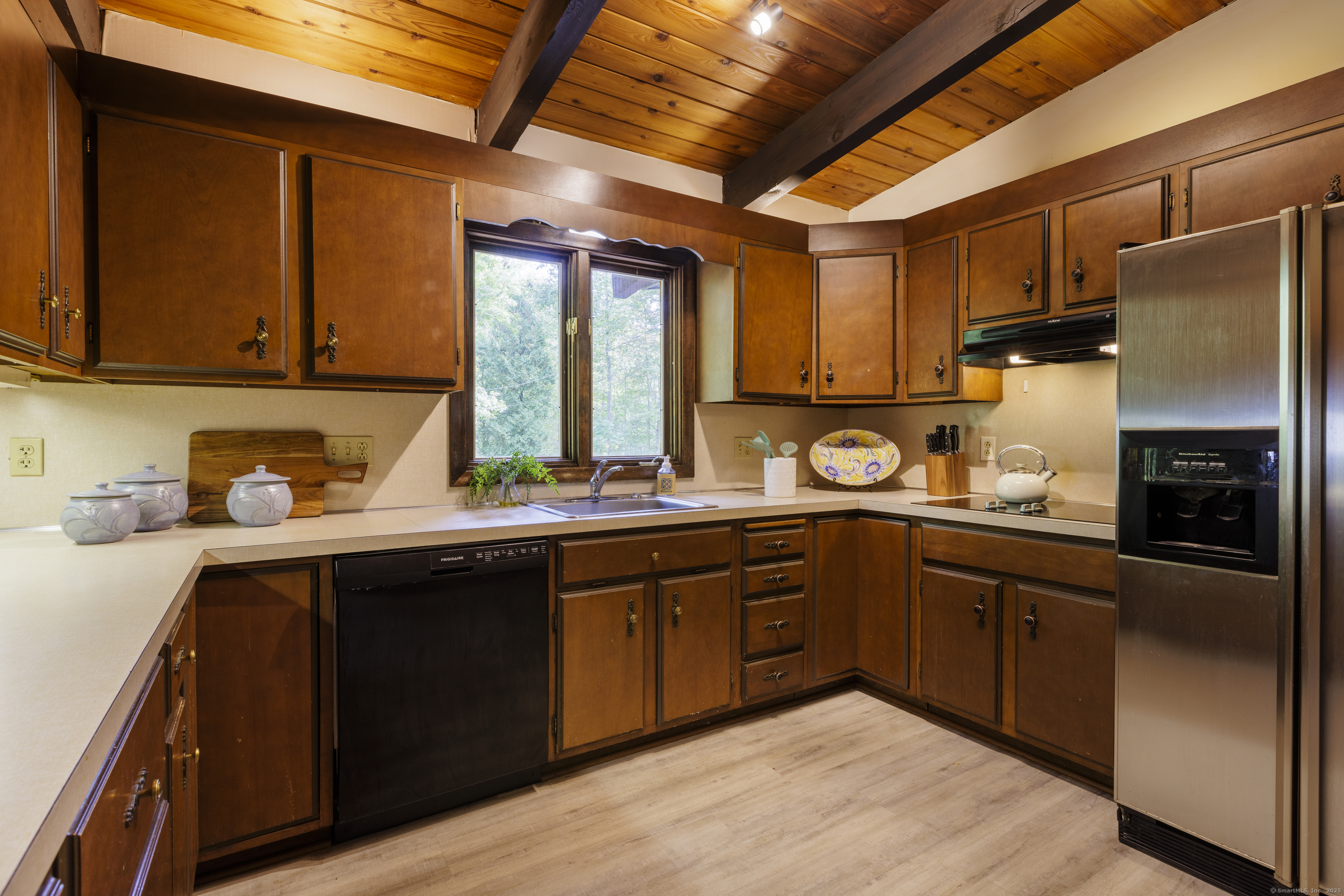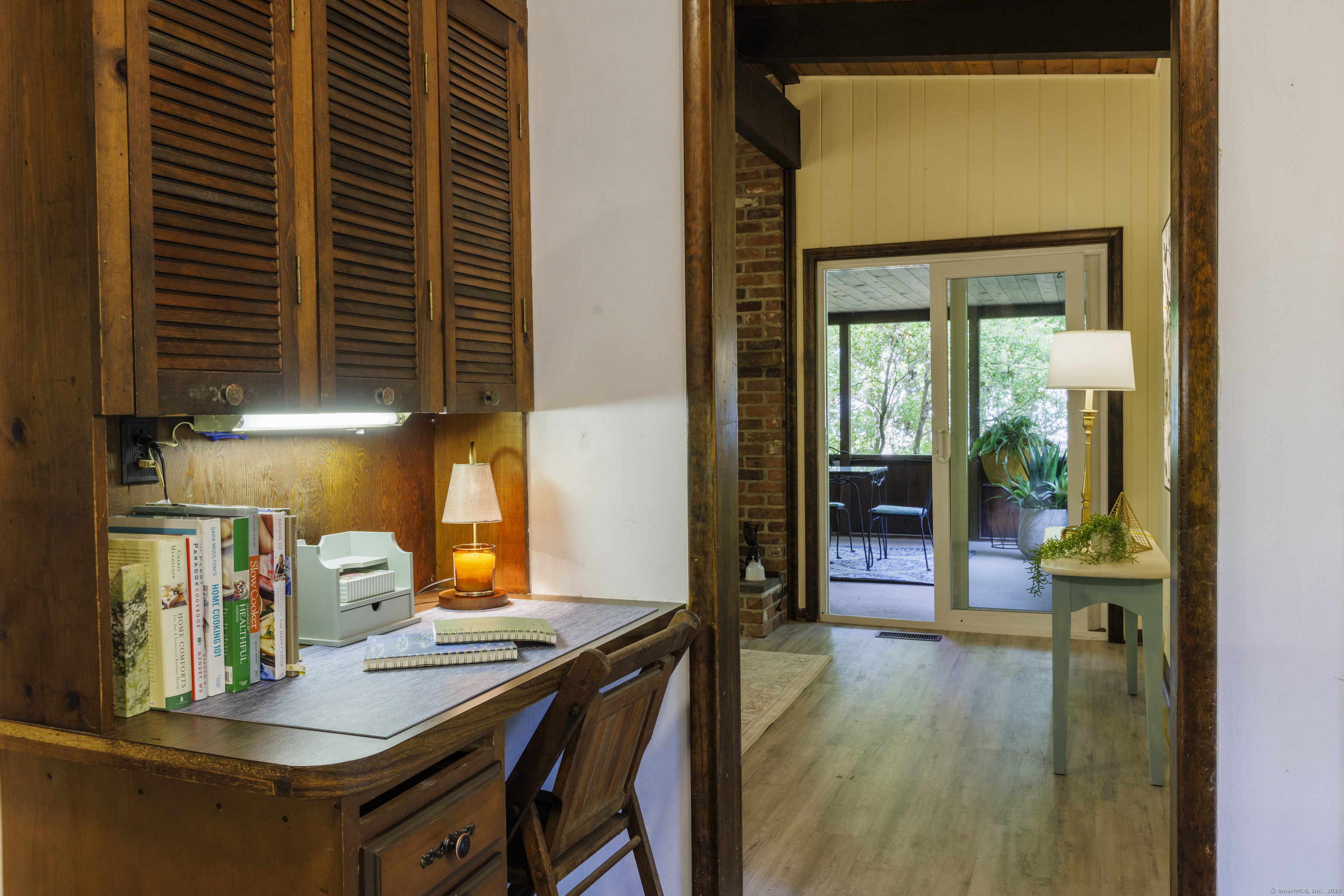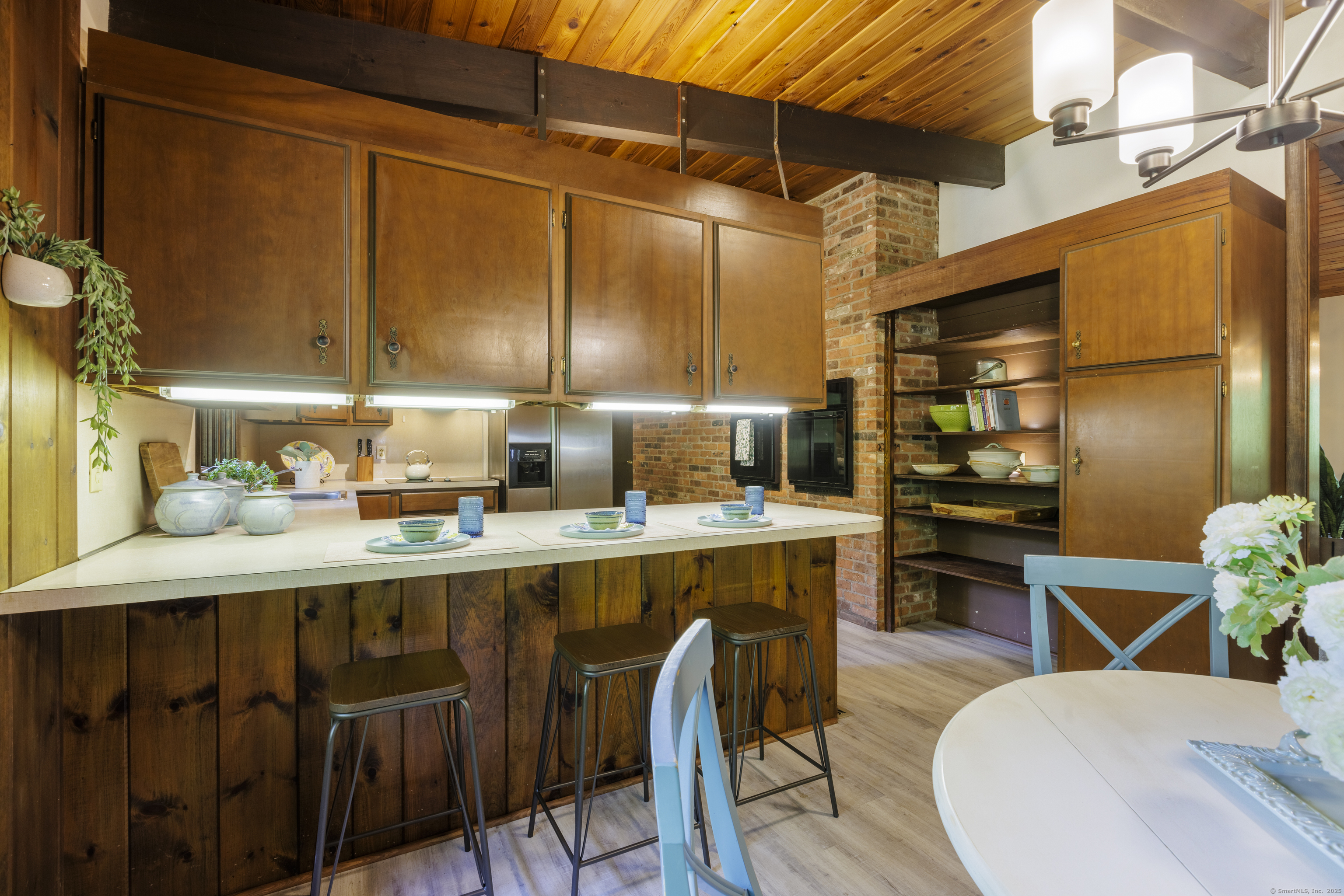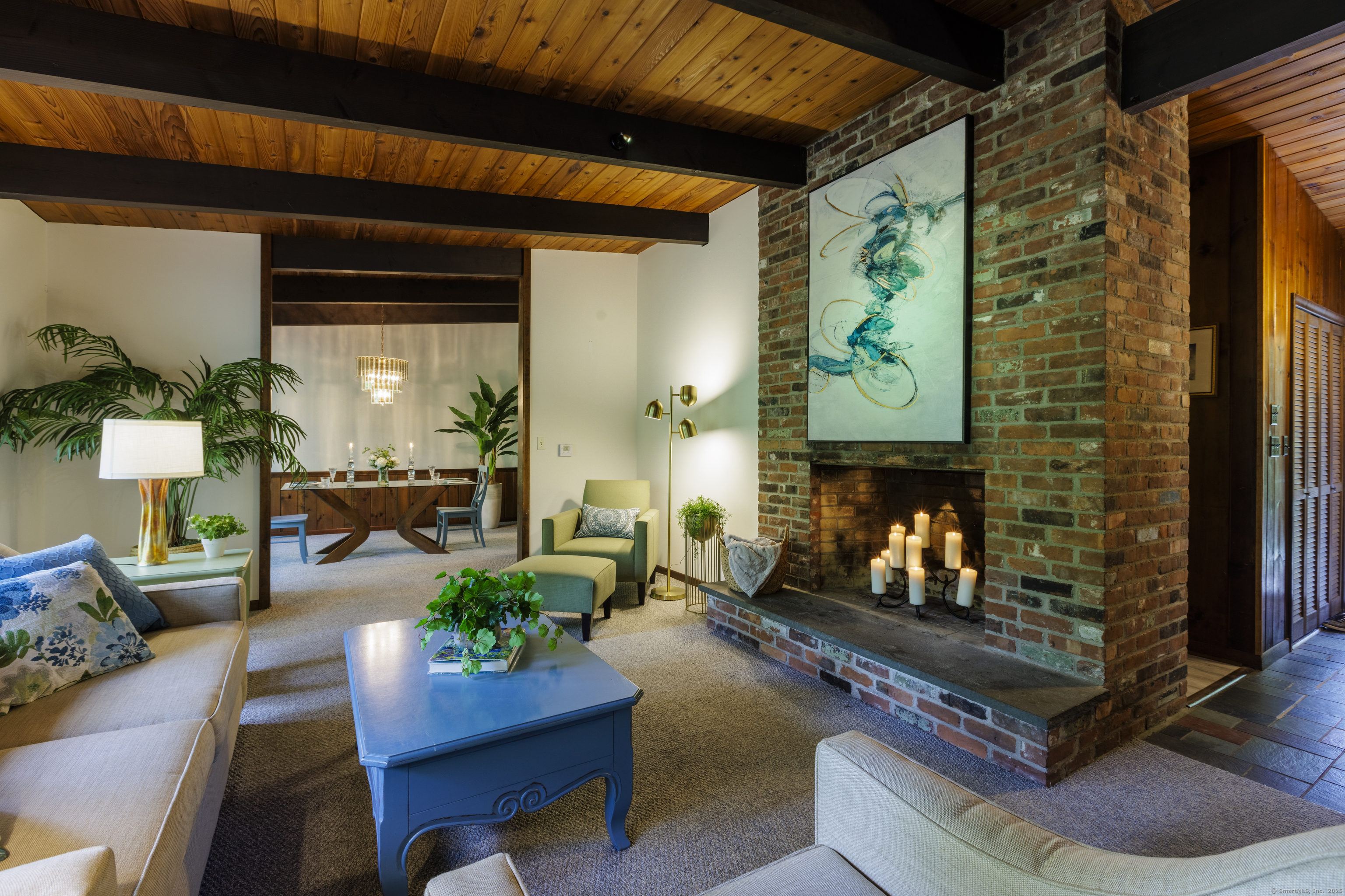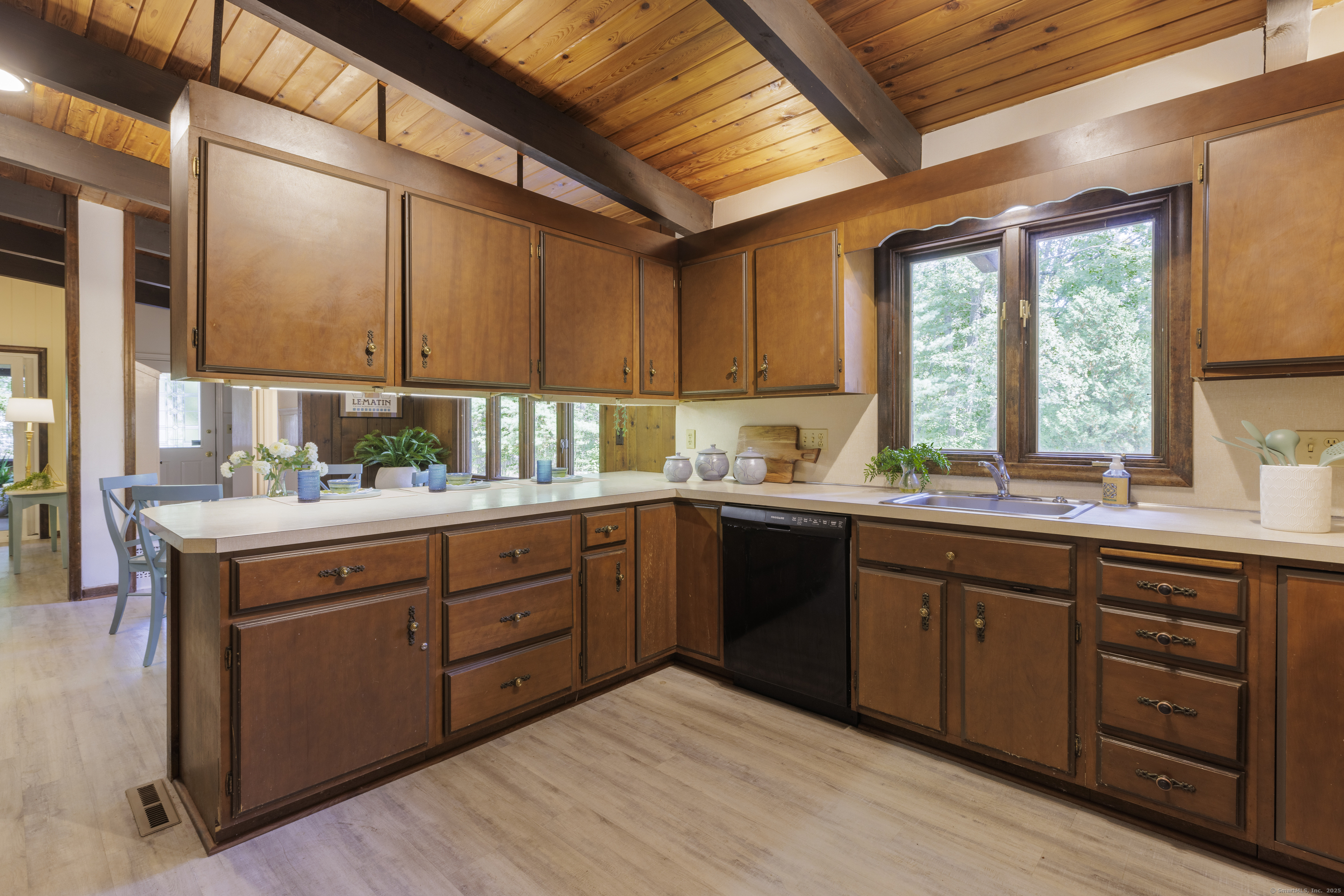 Never before offered to the public. A Local respected builder's own home blends contemporary mid century elements reminiscent of Franklin Lloyd Wright's "organic" design. Wooden interior textures, expansive windows invite the exterior landscape offering a place of solitude and refuge. Warm wood tones and naturalistic design of the vaulted wood ceilings, floor to ceiling fireplaces envelop you; providing a sense of warmth and safety. Four spacious bedrooms. One is currently used as a library. The primary bedroom has a built-in office with doors and shelving. The lower level has a family room with a large flat screen for sporting events and movie nights. The kitchen is equipped with a breakfast bar island , separate eating area, and built-in desk. Off of the family room with another floor to ceiling fireplace are sliders leading to a screened in porch. If you want the privacy of approximately two acres, yet have the ability to affiliate within a cul-de sac neighborhood this home is not to be missed.