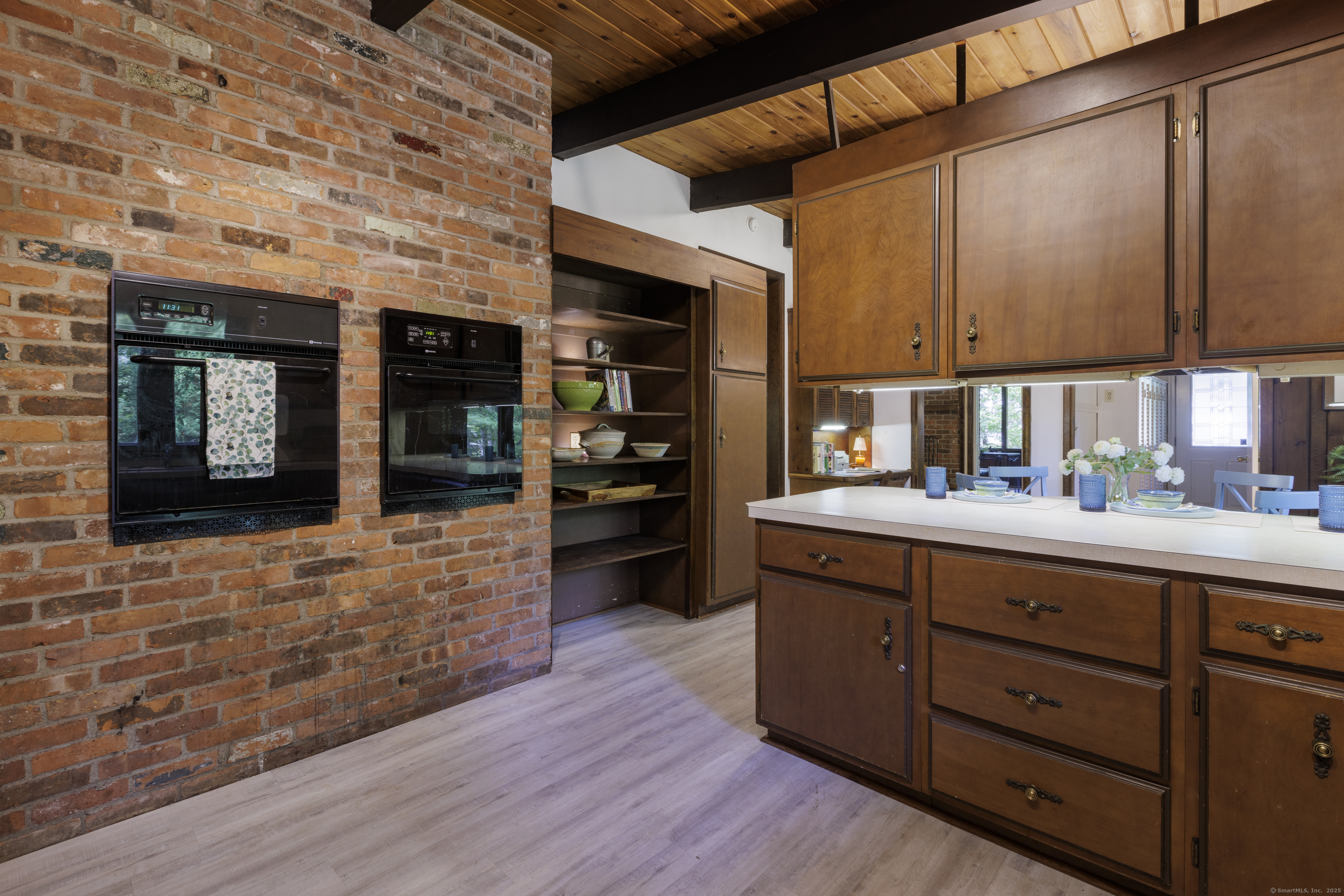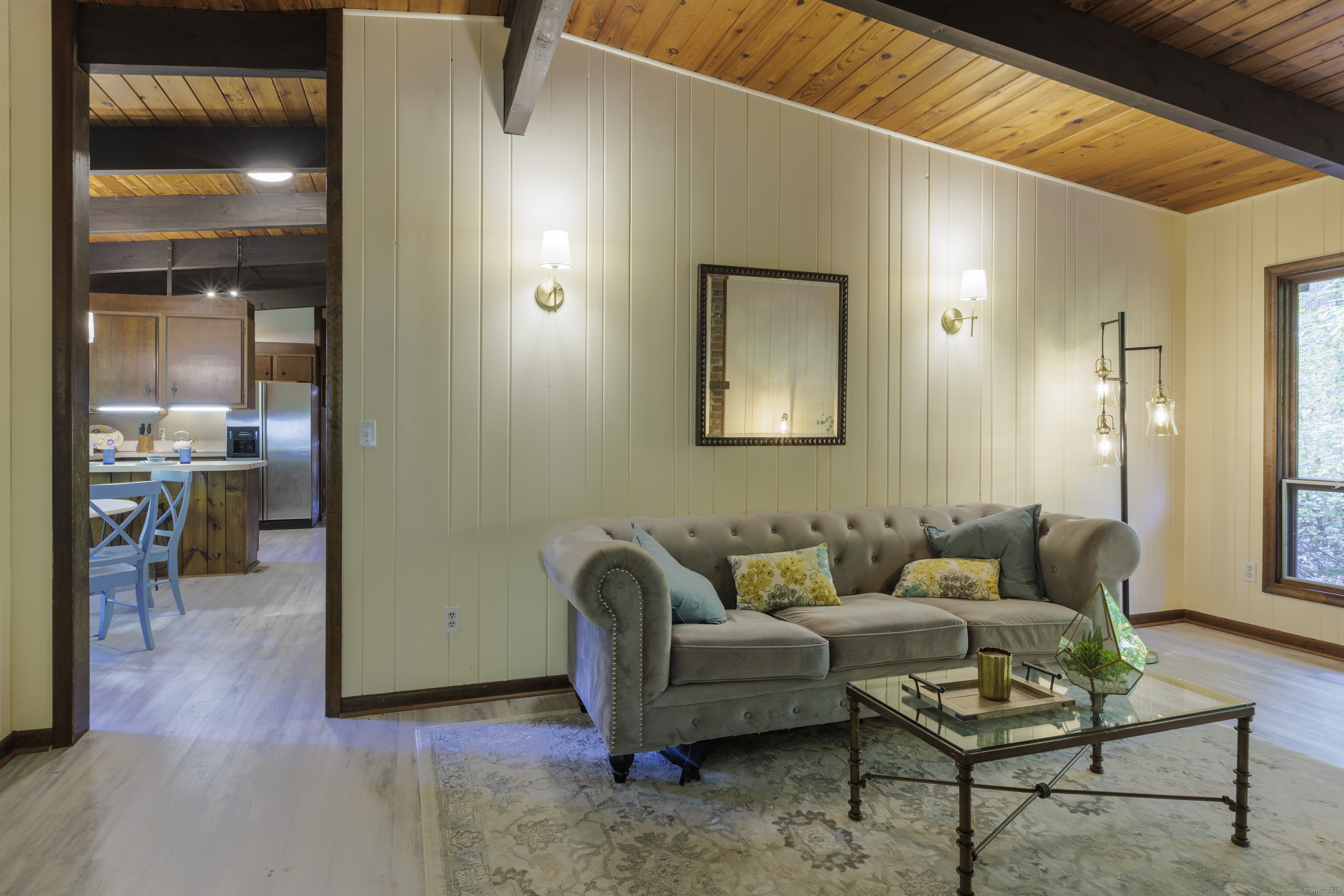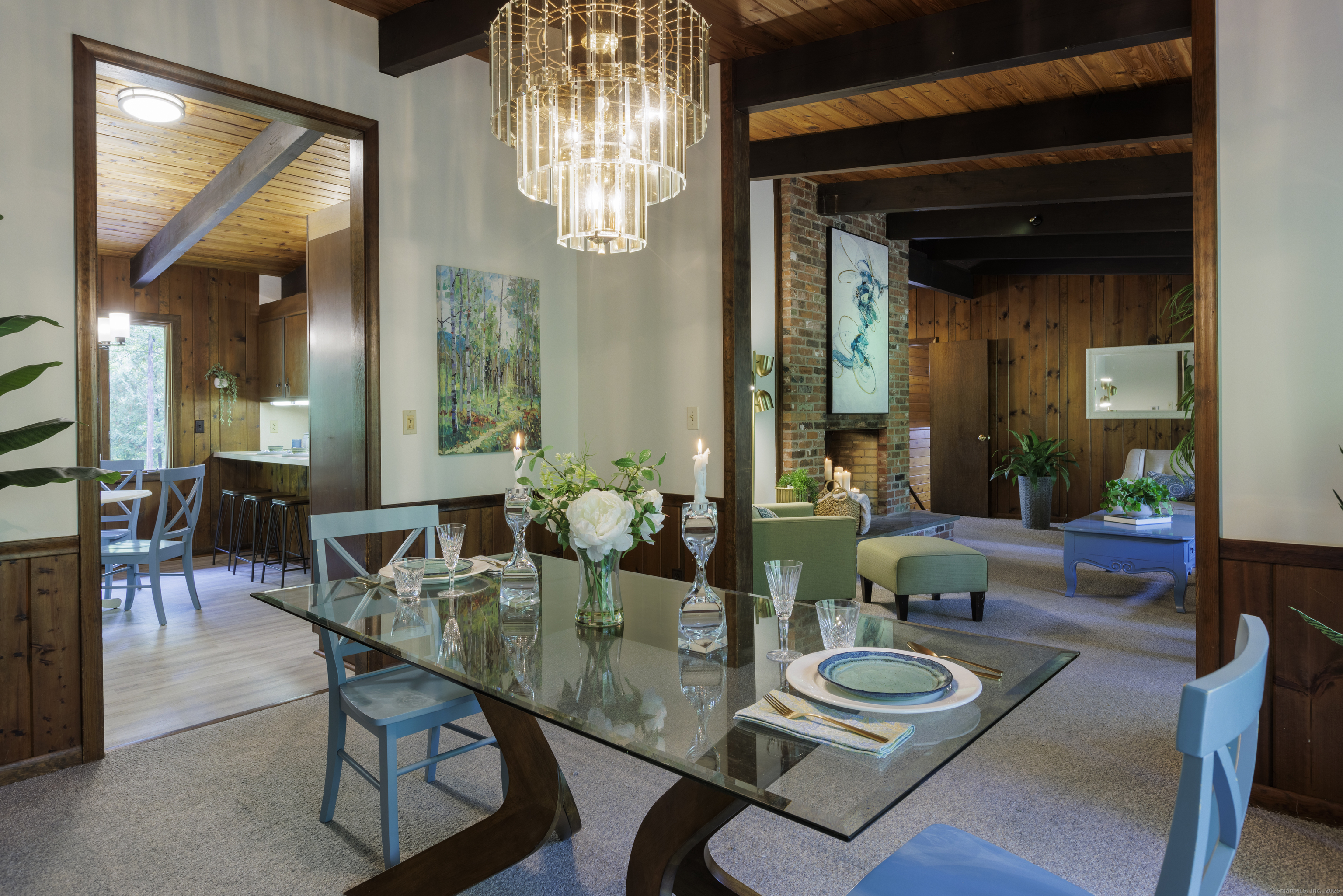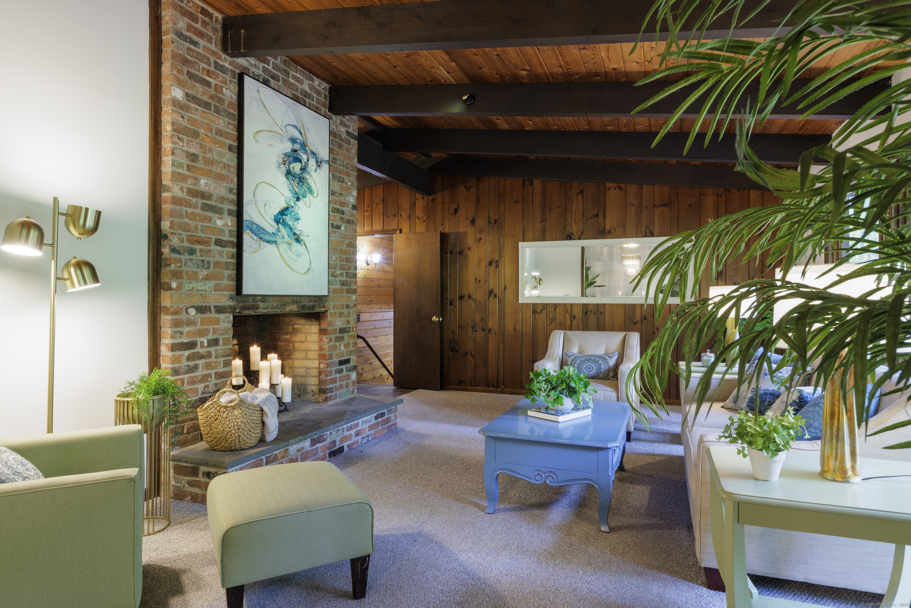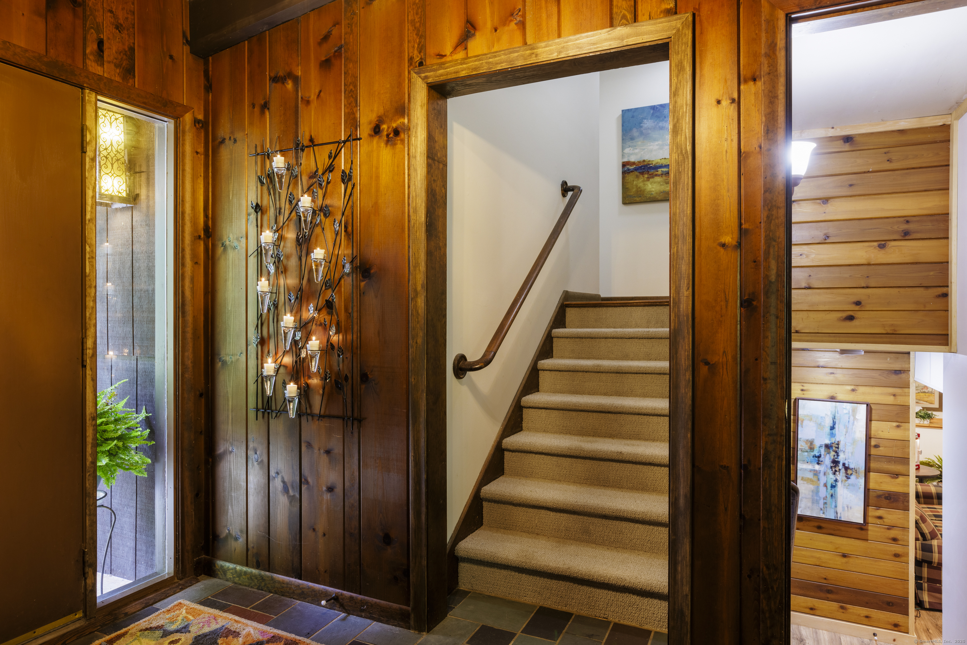 Never before offered to the public. A Local respected builder's own home blends contemporary mid century elements reminiscent of Franklin Lloyd Wright's "organic" design. Wooden interior textures, expansive windows invite the exterior landscape offering a place of solitude and refuge. Warm wood tones and naturalistic design of the vaulted wood ceilings, floor to ceiling fireplaces envelop you; providing a sense of warmth and safety. Four spacious bedrooms. One is currently used as a library. The primary bedroom has a built-in office with doors and shelving. The lower level has a family room with a large flat screen for sporting events and movie nights. The kitchen is equipped with a breakfast bar island , separate eating area, and built-in desk. Off of the family room with another floor to ceiling fireplace are sliders leading to a screened in porch. If you want the privacy of approximately two acres, yet have the ability to affiliate within a cul-de sac neighborhood this home is not to be missed.