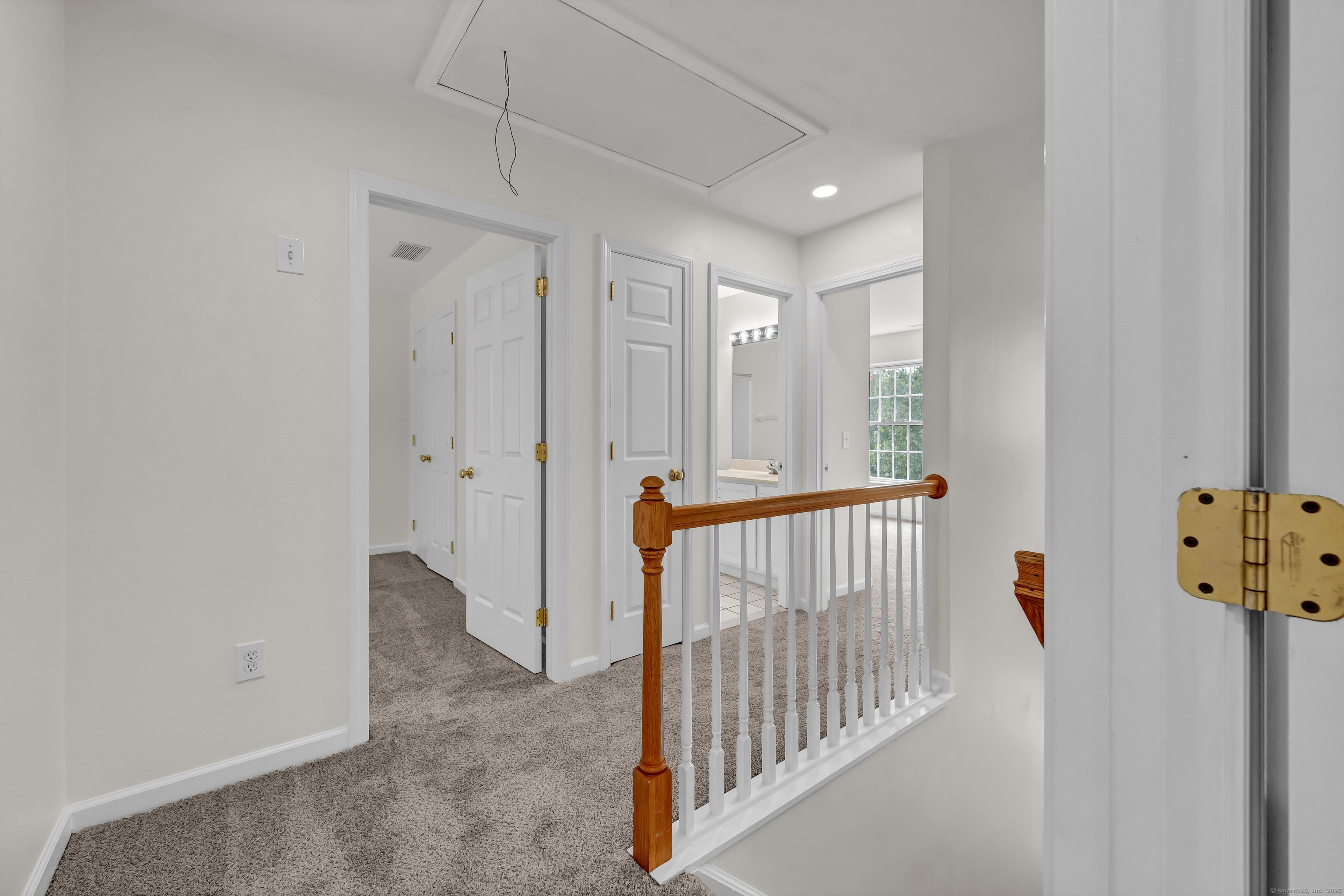 Beautifully updated 3 bedroom, 2.5 bathroom Colonial tucked away at the end of a quiet cul-de-sac. A two story entryway and newly refinished hardwood flooring greet you as you enter this bright and sunny home with new recessed lighting and paint throughout. The formal living room has a gas fireplace for staying cozy on chilly days and the formal dining room leads to the spacious eat-in kitchen with new Quartz counters, new stainless steel appliances, breakfast bar and dining area that walks out to the private back deck and yard. There is also a convenient half bathroom on the main level, plus a mudroom/laundry room leading to the two car garage. Upstairs there are three spacious bedrooms with brand new carpeting, plus two bathrooms, including a primary suite with walk-in closet and large full bath with dual sinks and walk-in shower. The lower level is fully finished with a huge bonus room, ideal as a home theater, office or play space. There are also numerous storage closets and a separate utility/storage room. All set on a perfectly level yard at the end of a cul-de-sac atop a hill, with easy access to the White Oak Estates playground and gazebo, yet located just a few minutes to I-84, Target, Walmart and tons of shops and restaurants. Common charges include exterior maintenance, including lawn care and snow removal, so come enjoy a mow-free summer and snow-free winter!