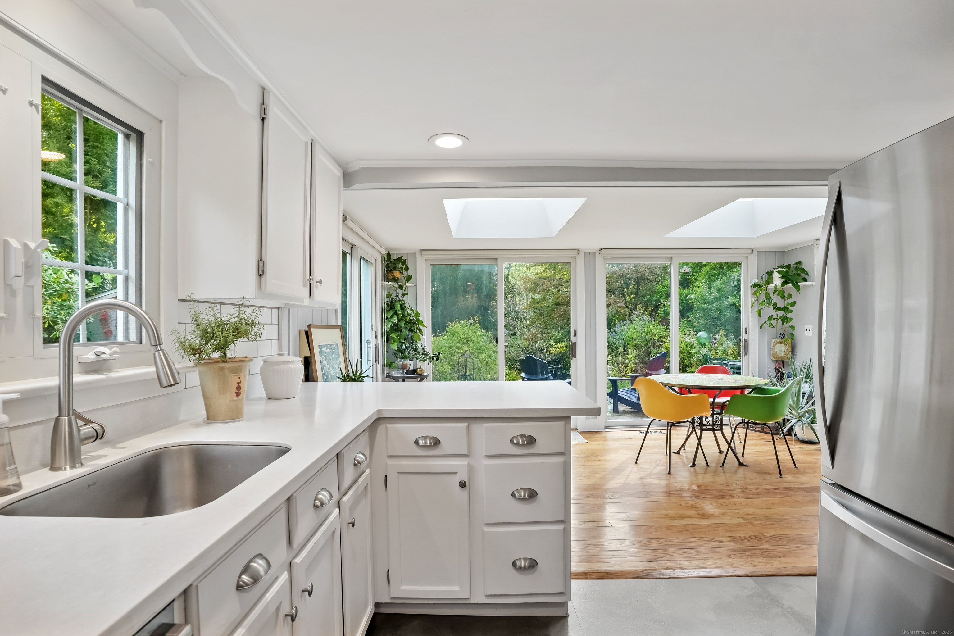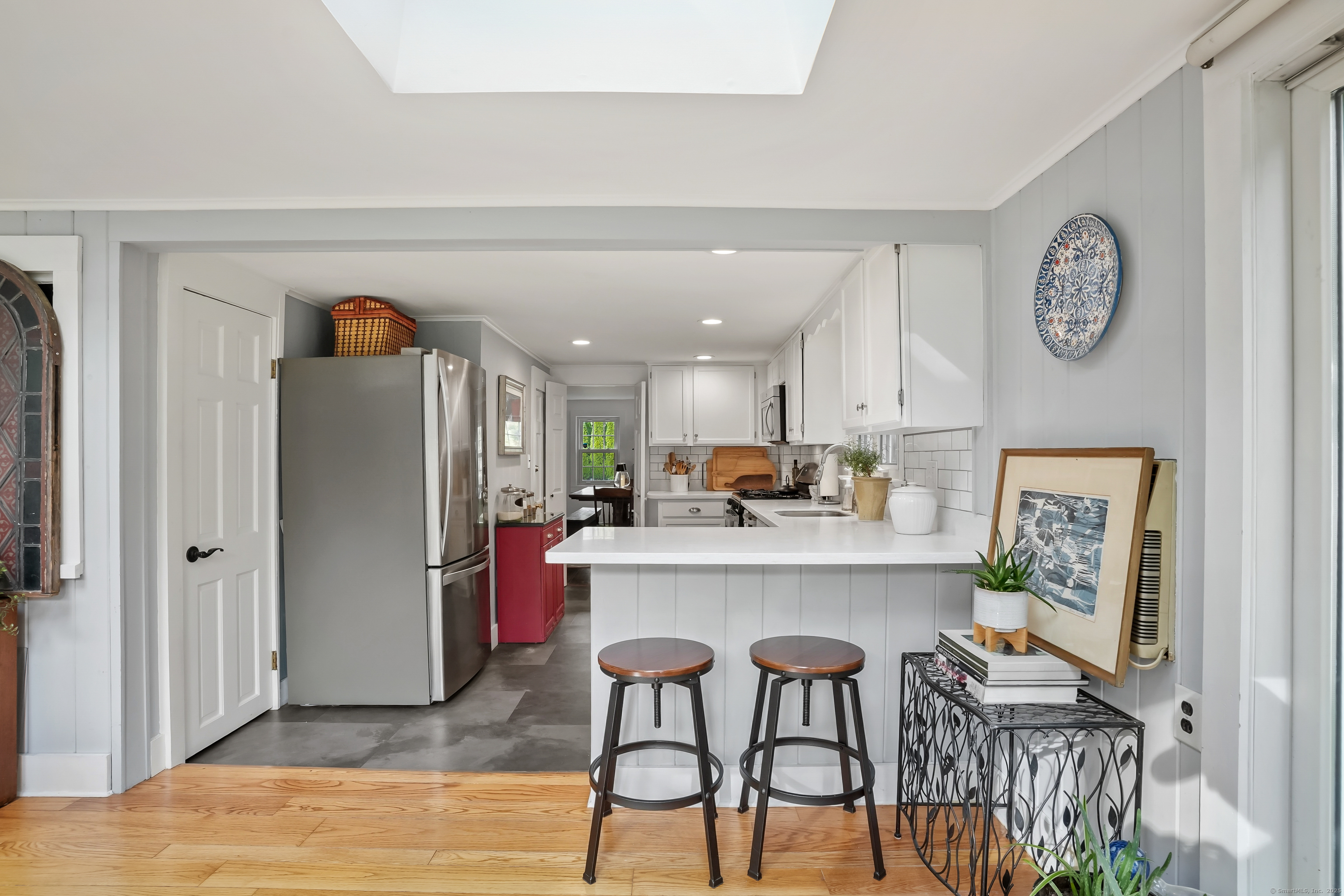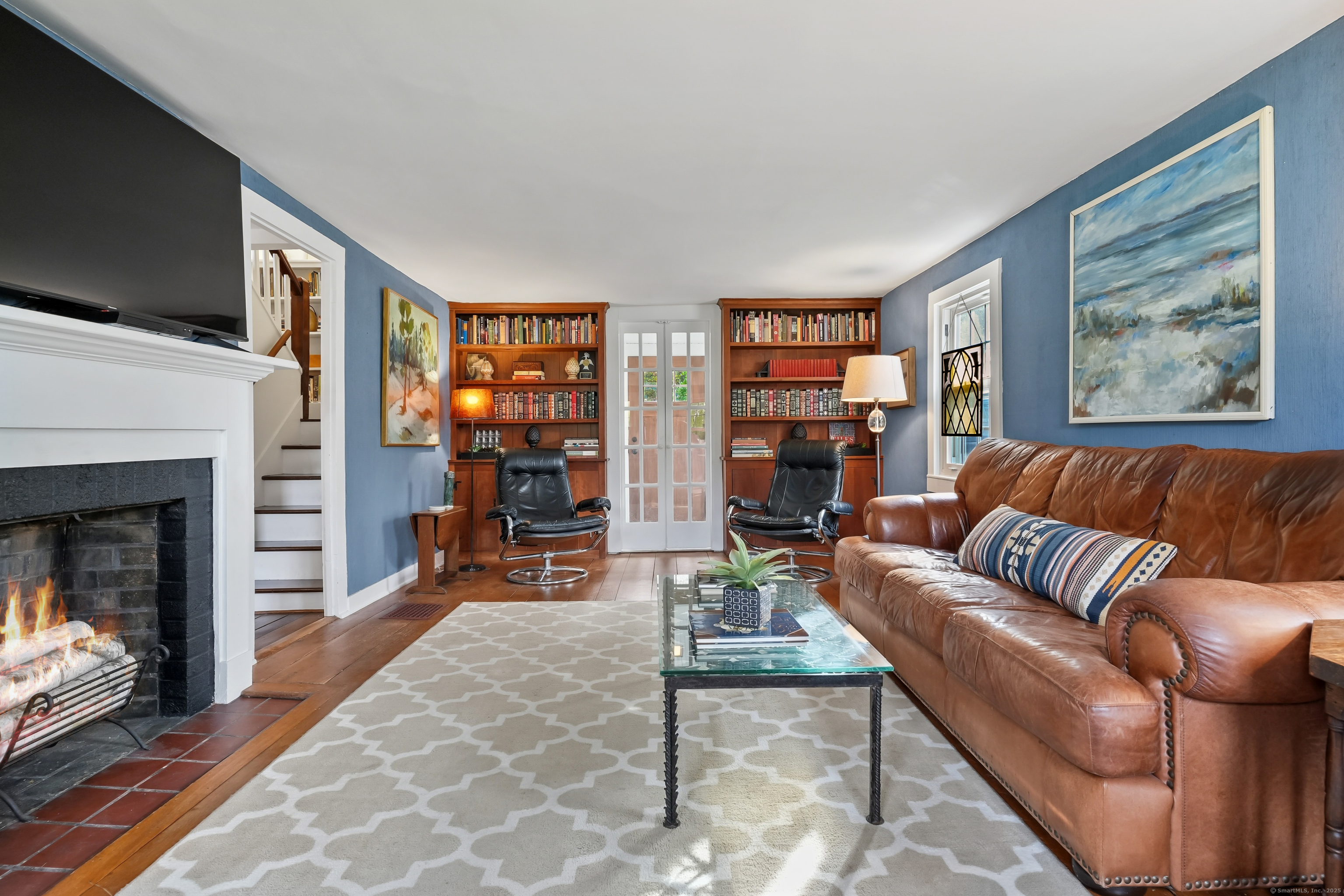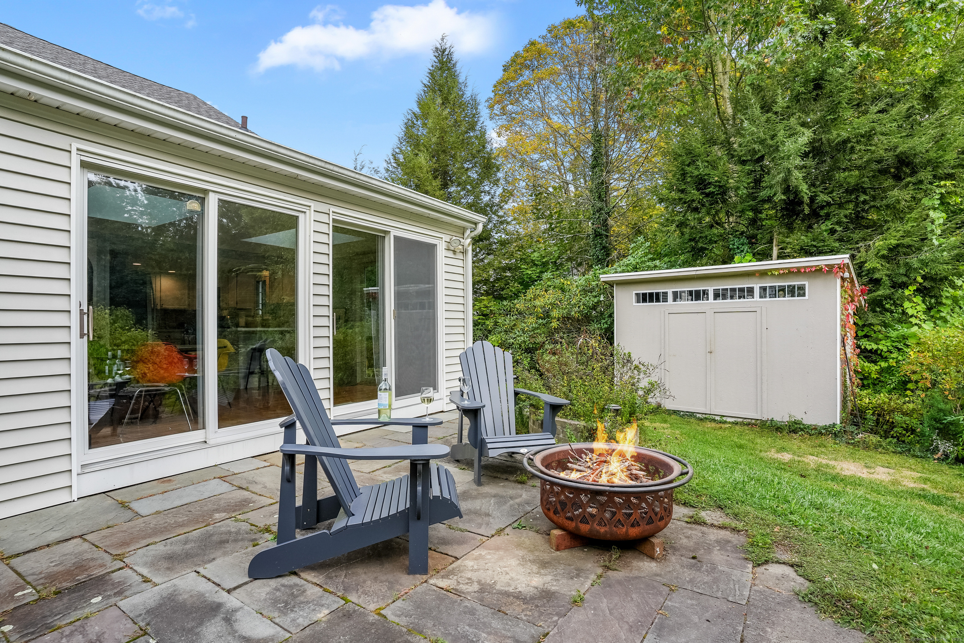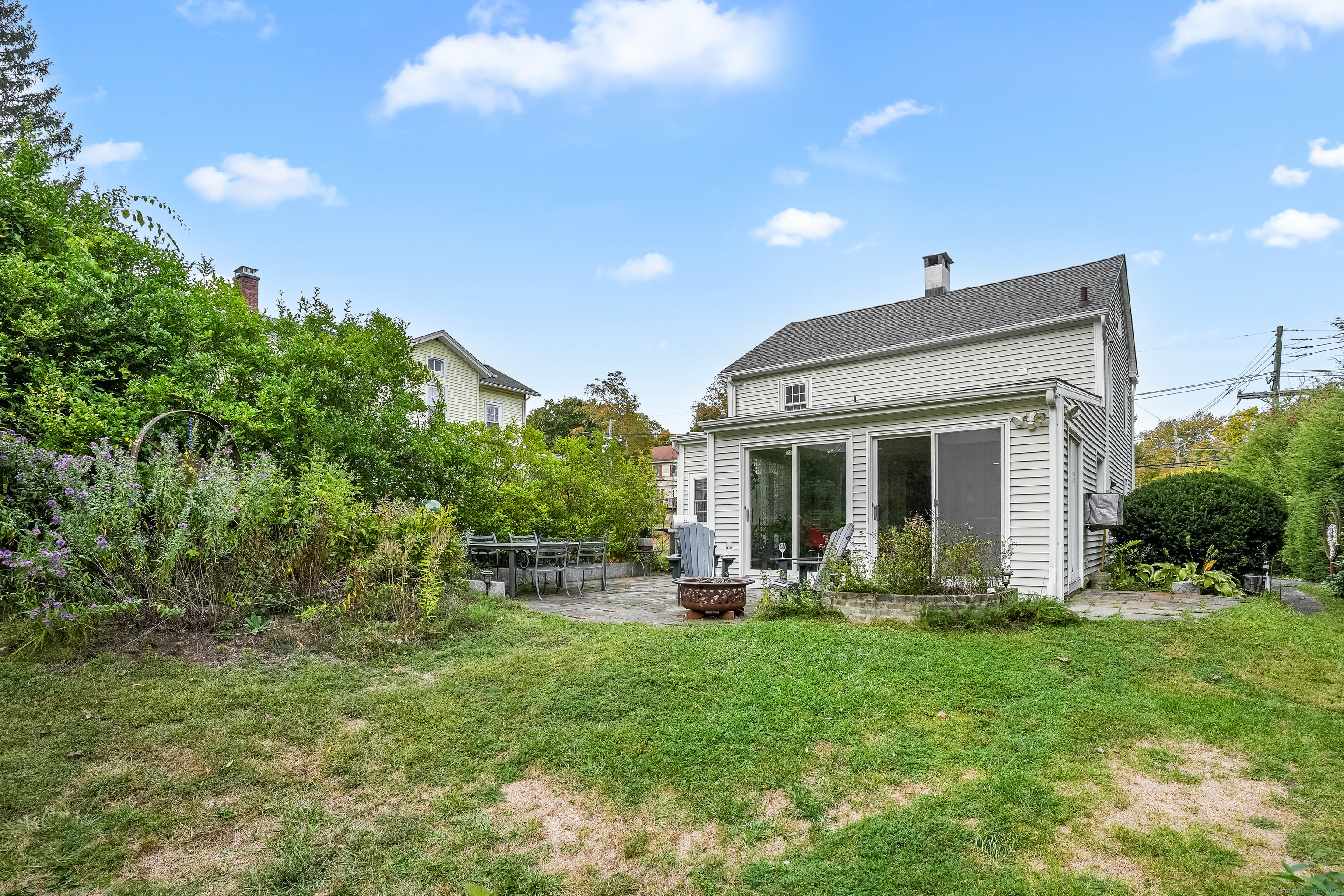 Charming in-town Bethel colonial with city water, gas and sewer. Large .42-acre lot with private backyard and lush gardens. The living room has a brick fireplace and built in bookcases with a main floor laundry/mudroom combo accessed through French doors. A separate dining room for hosting holiday feasts also has wide-board floors and built-ins. There is an updated kitchen with stainless appliances, solid surface countertops and a breakfast bar. The adjacent sunroom has skylights and sliding doors on 3 sides framing the view of the private backyard. Upstairs are 3 bedrooms and a full bathroom featuring a clawfoot soaking tub, as well as a separate tile shower. Storage is abundant in the walk-up attic. You will appreciate the large bluestone patio for hosting BBQ's and fall firepit gatherings. This private back yard has a large shed and gardens bursting with colorful perennials, shrubs, herb, fruit trees as well as a flowing brook. This home has vinyl siding, Central AC and an updated furnace, as well as extra insulation. Off-street parking for 4 cars. Short walk to downtown Bethel with restaurants, grocery, movie theatre and Metro-North train to NYC. Local bus stop is around the corner. Owner/Agent.