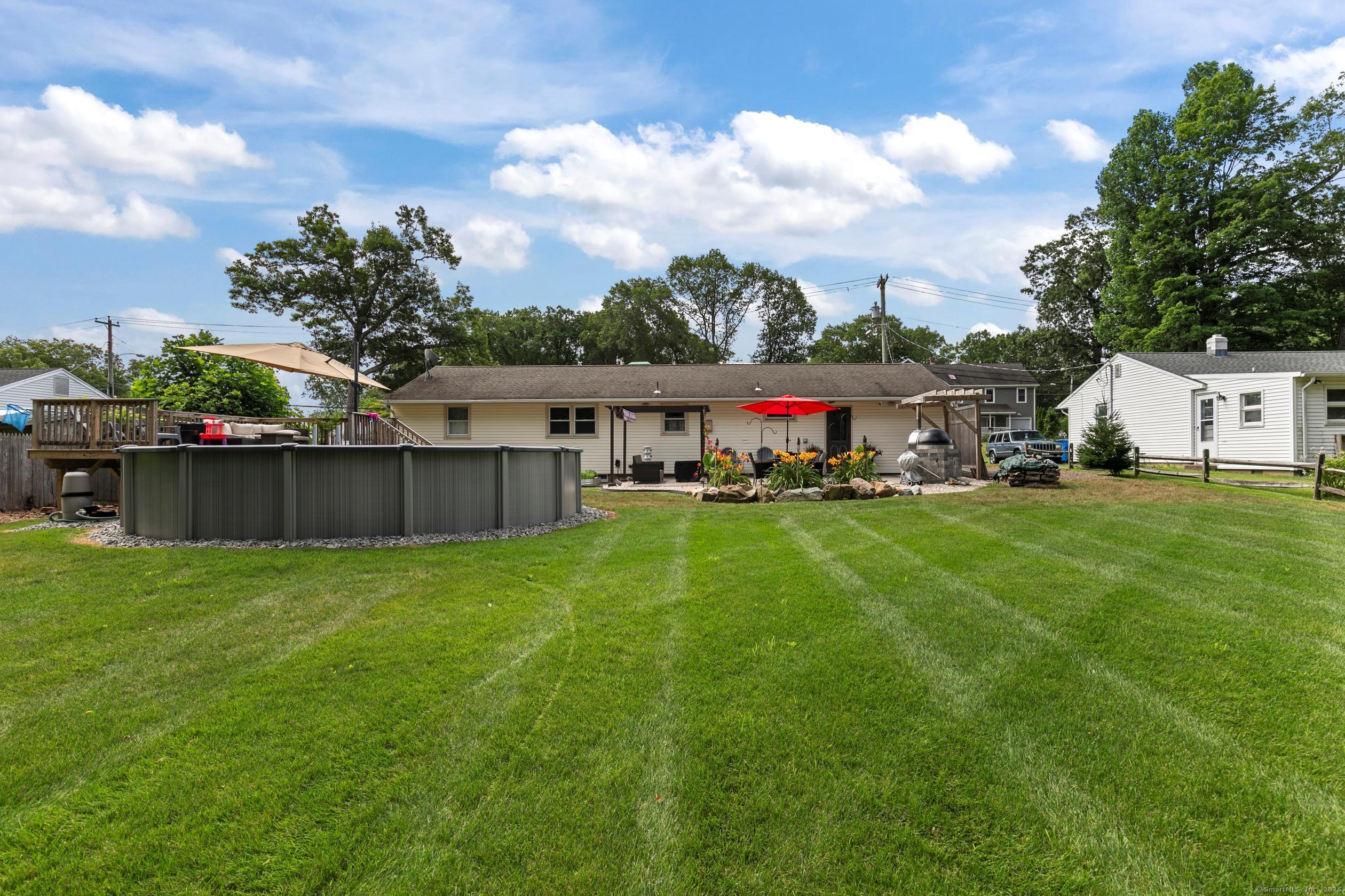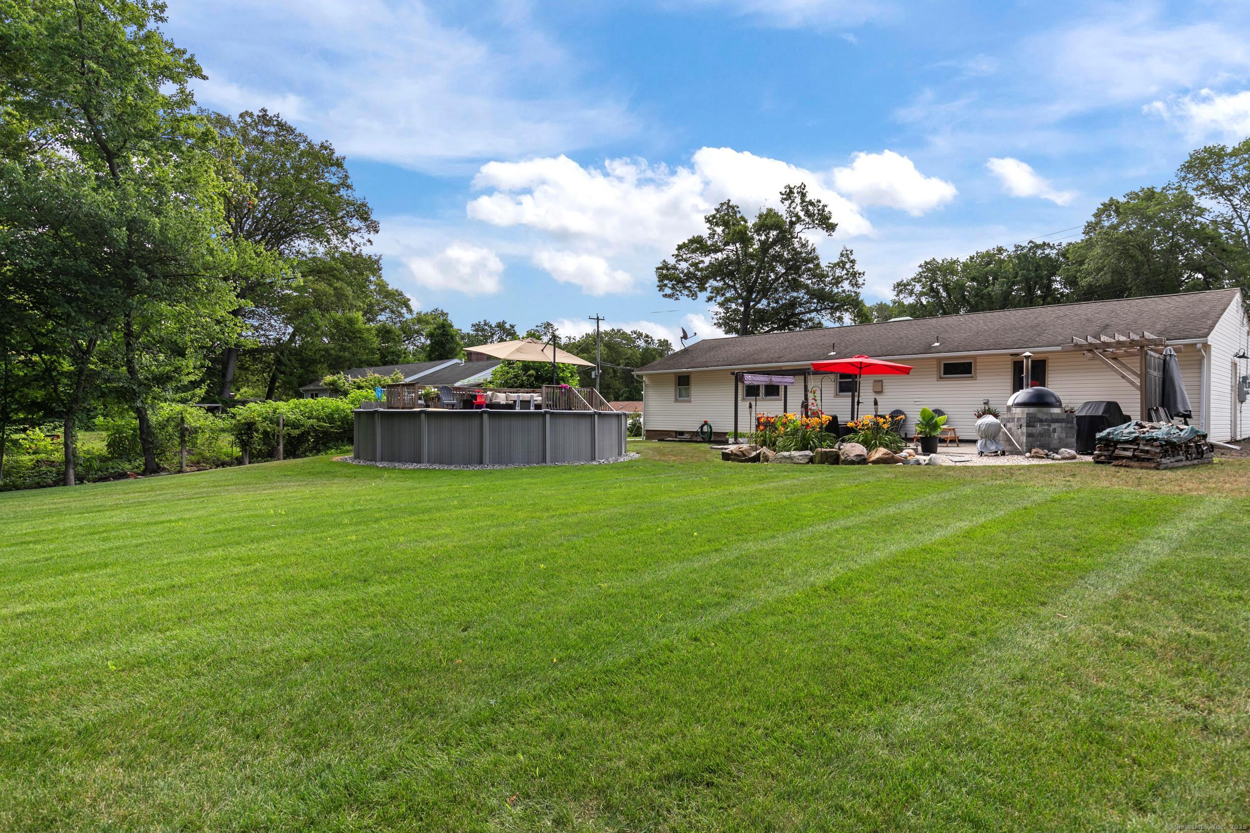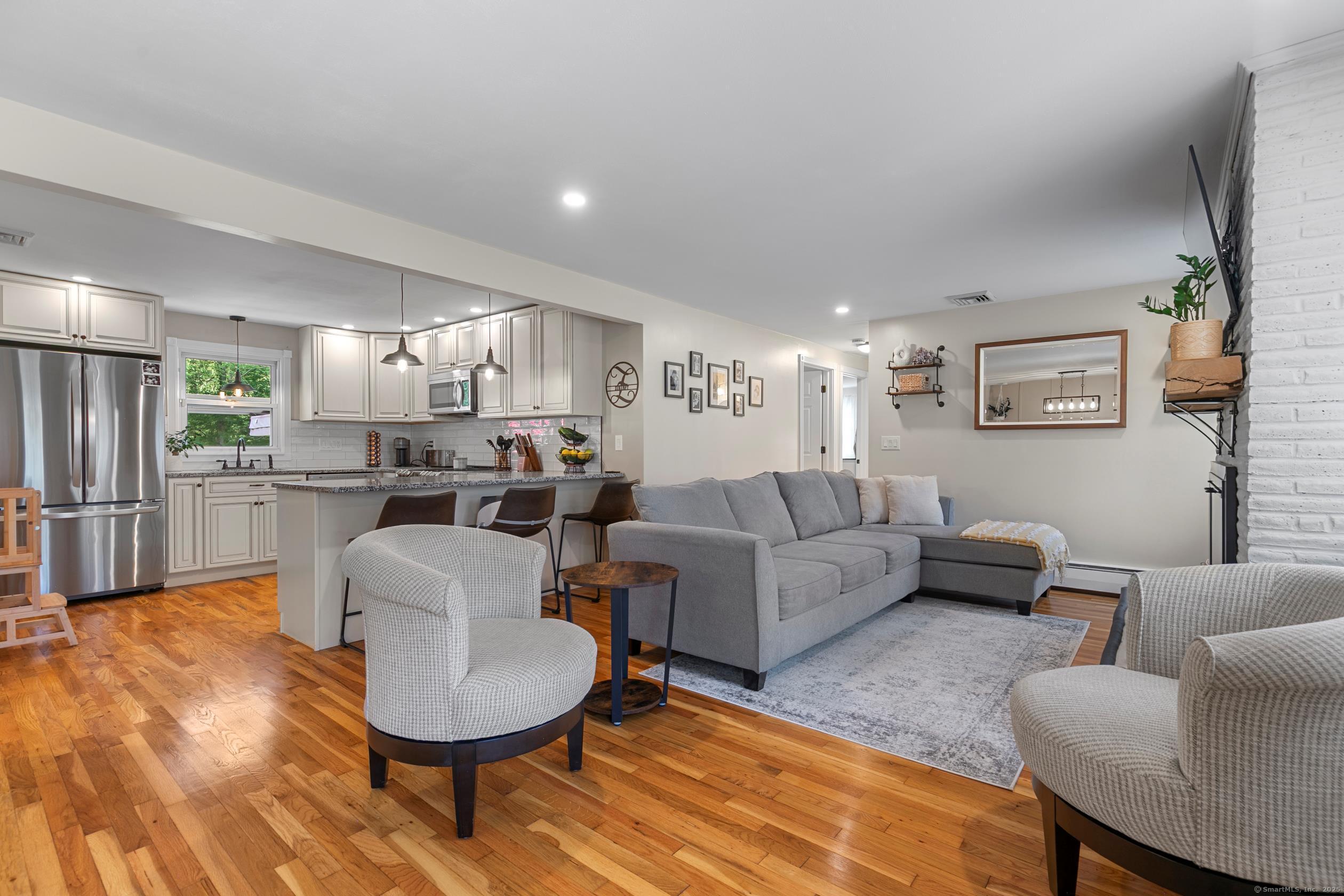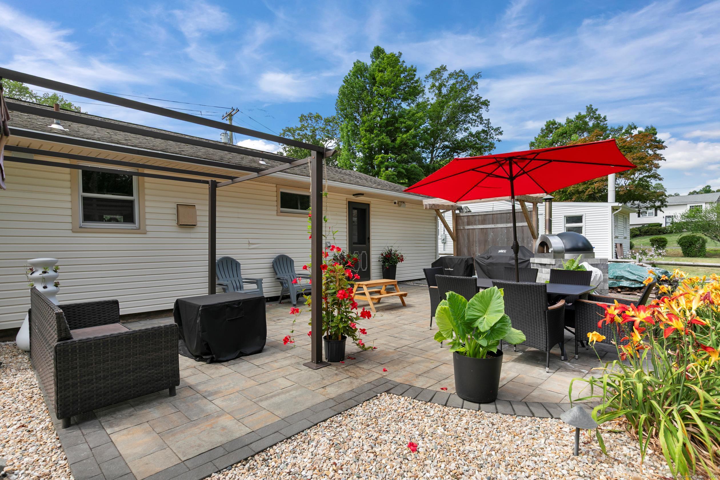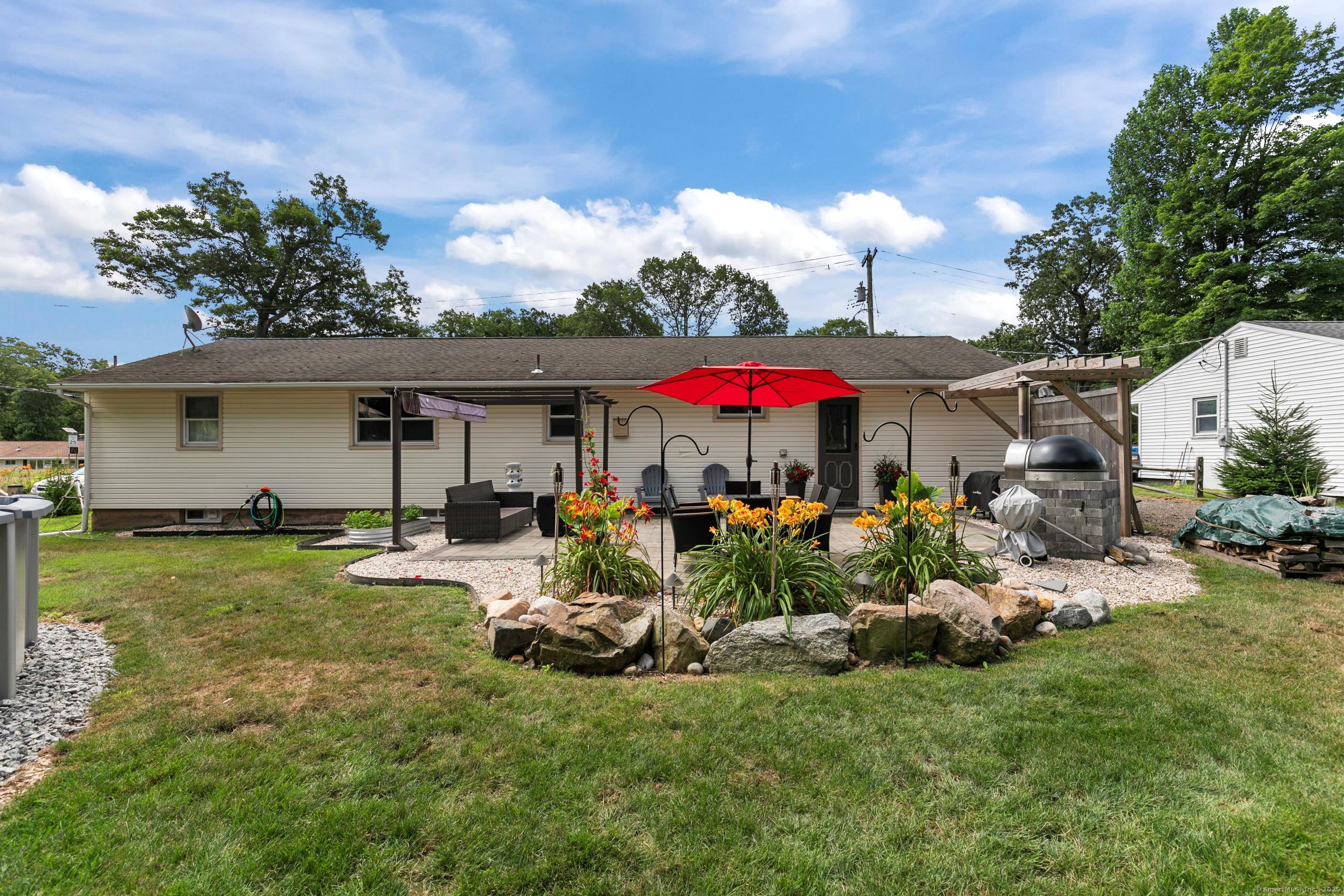Welcome to this completely remodeled, meticulously maintained ranch offering true one-level living! Step inside to a gorgeous custom kitchen with granite countertops, beautiful cabinetry, brand-new stainless steel appliances, and a breakfast bar that flows seamlessly into the open floor plan. The spacious living room with a cozy fireplace and the large dining area make this home perfect for entertaining. The main level features 3 generously sized bedrooms, an updated full bathroom, and the convenience of a completely remodeled guest bath along with gorgeous hardwood floors throughout. Let's not forget the fabulous mudroom with a custom bench and storage cabinet that leads to the attached one-car garage. Outside, enjoy the beautiful backyard with a generous sized paver patio, a new above-ground pool with deck and professionally landscaping throughout with plenty of space for outdoor fun. Additional highlights include a brand-new driveway, New oil tank, hot water holding tank and added insulation in the basement & attic. This move-in ready home combines comfort, style, and convenience-don't miss it! Highest and best due October 5 by 6 PM