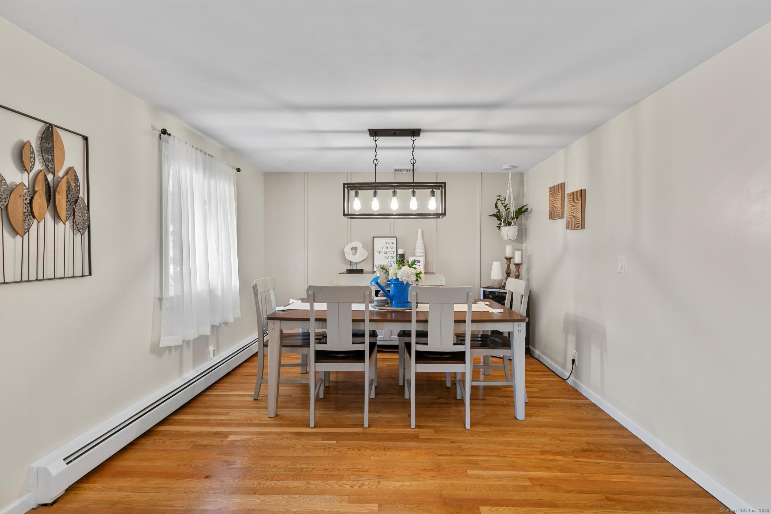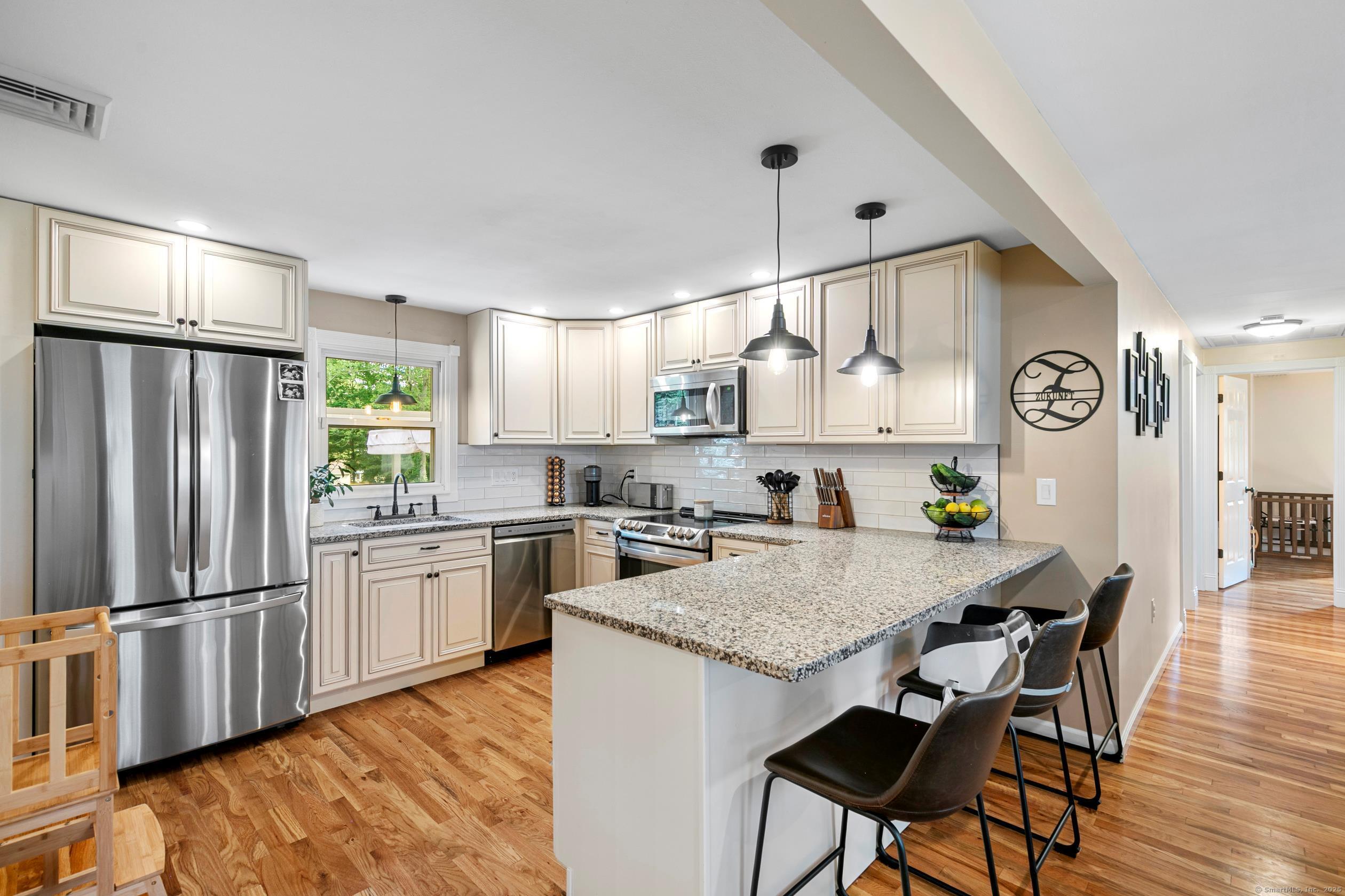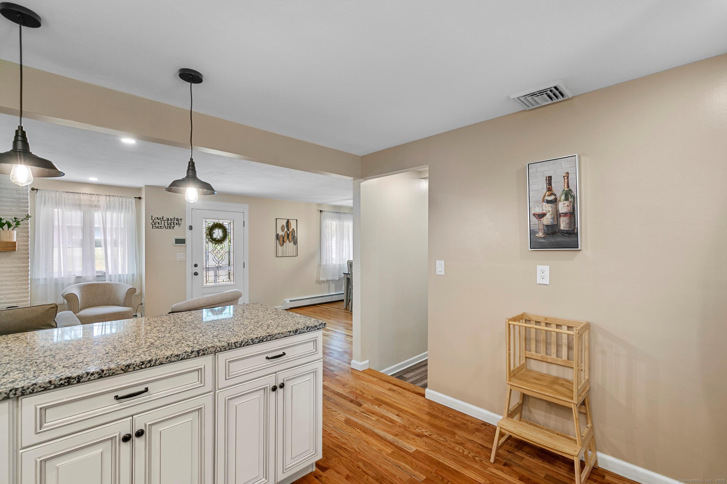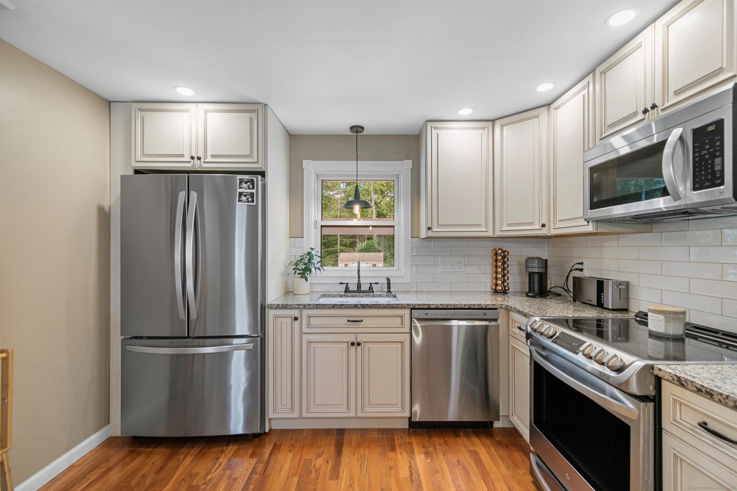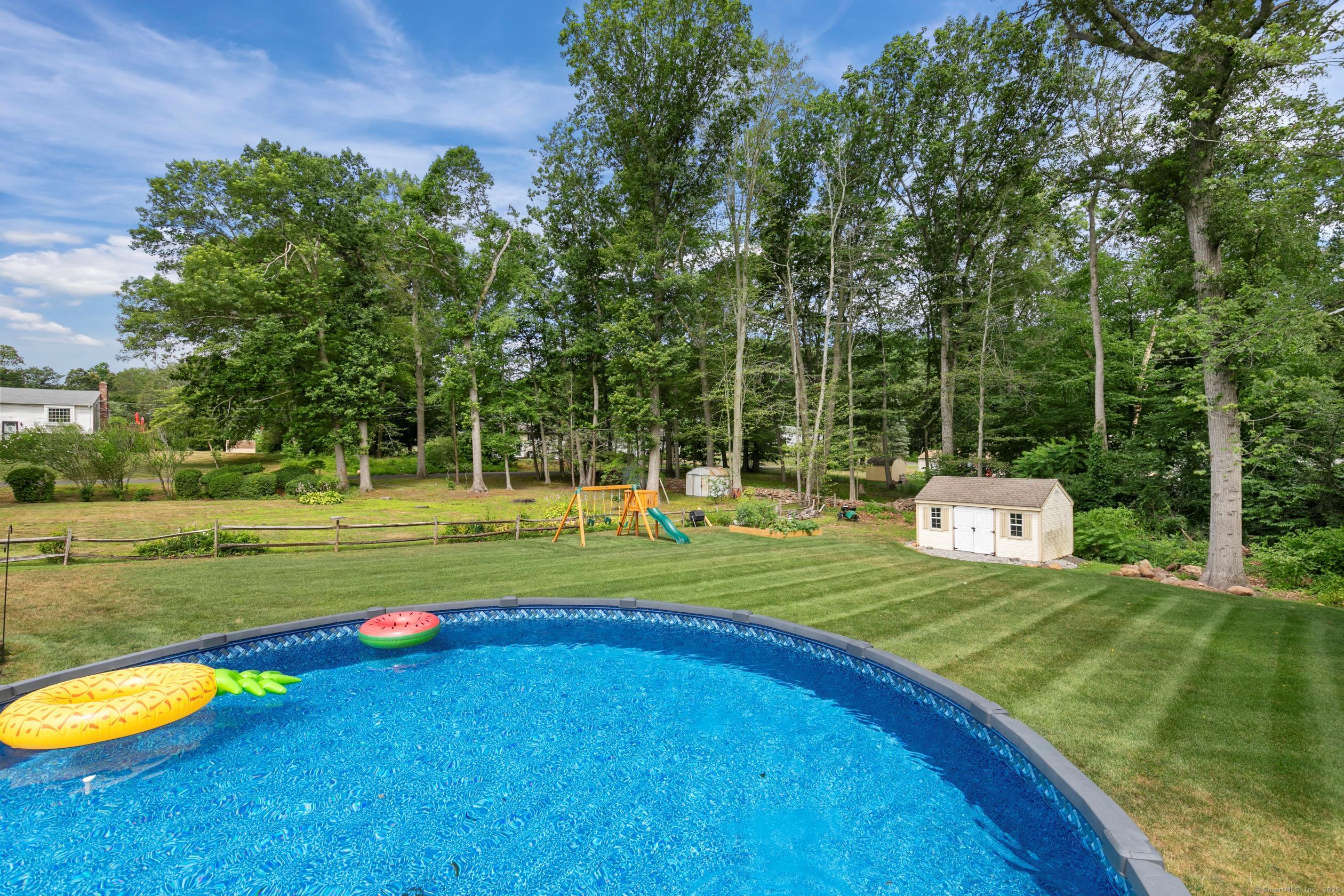 Welcome to this completely remodeled, meticulously maintained ranch offering true one-level living! Step inside to a gorgeous custom kitchen with granite countertops, beautiful cabinetry, brand-new stainless steel appliances, and a breakfast bar that flows seamlessly into the open floor plan. The spacious living room with a cozy fireplace and the large dining area make this home perfect for entertaining. The main level features 3 generously sized bedrooms, an updated full bathroom, and the convenience of a completely remodeled guest bath along with gorgeous hardwood floors throughout. Let's not forget the fabulous mudroom with a custom bench and storage cabinet that leads to the attached one-car garage. Outside, enjoy the beautiful backyard with a generous sized paver patio, a new above-ground pool with deck and professionally landscaping throughout with plenty of space for outdoor fun. Additional highlights include a brand-new driveway, New oil tank, hot water holding tank and added insulation in the basement & attic. This move-in ready home combines comfort, style, and convenience-don't miss it! Highest and best due October 5 by 6 PM