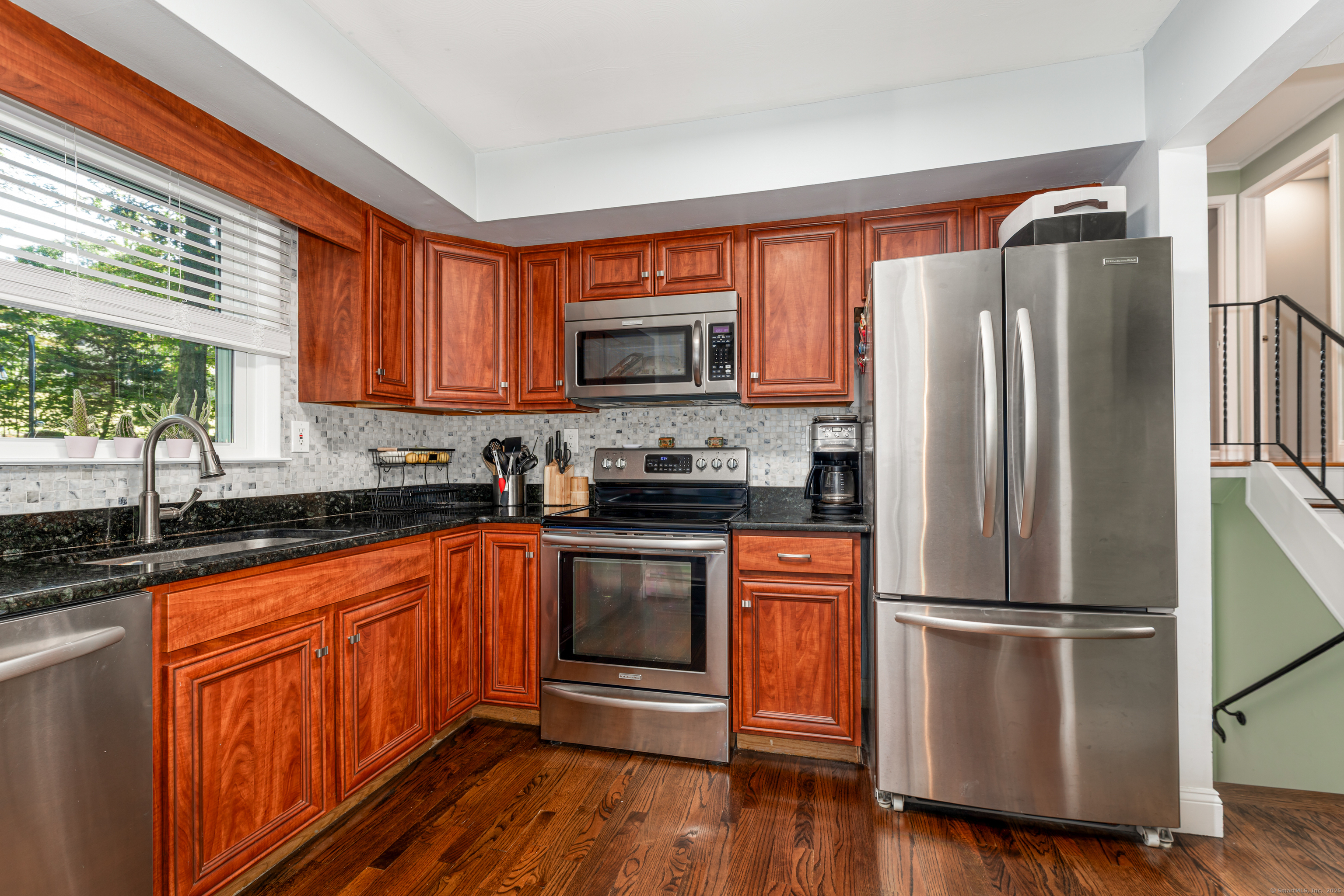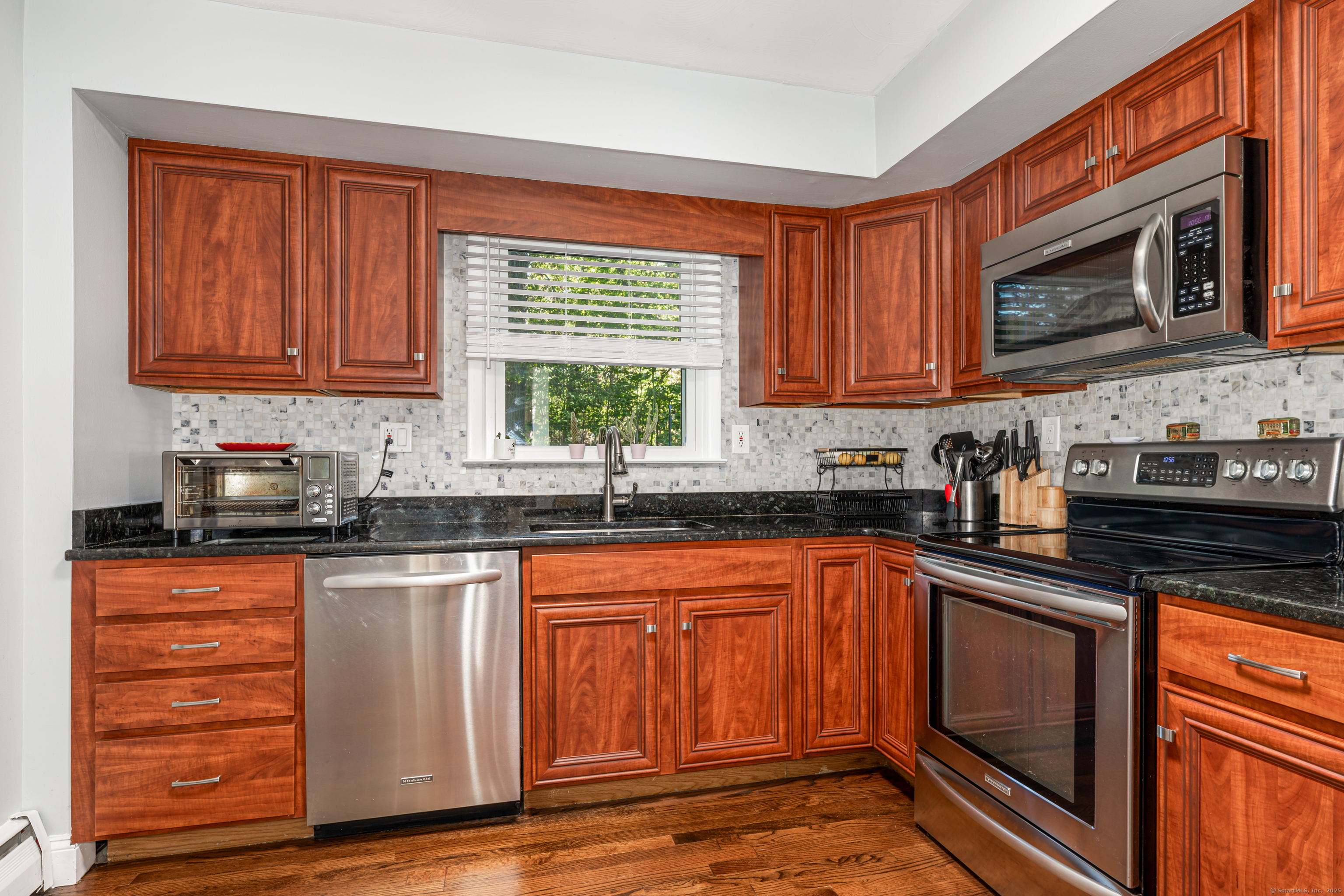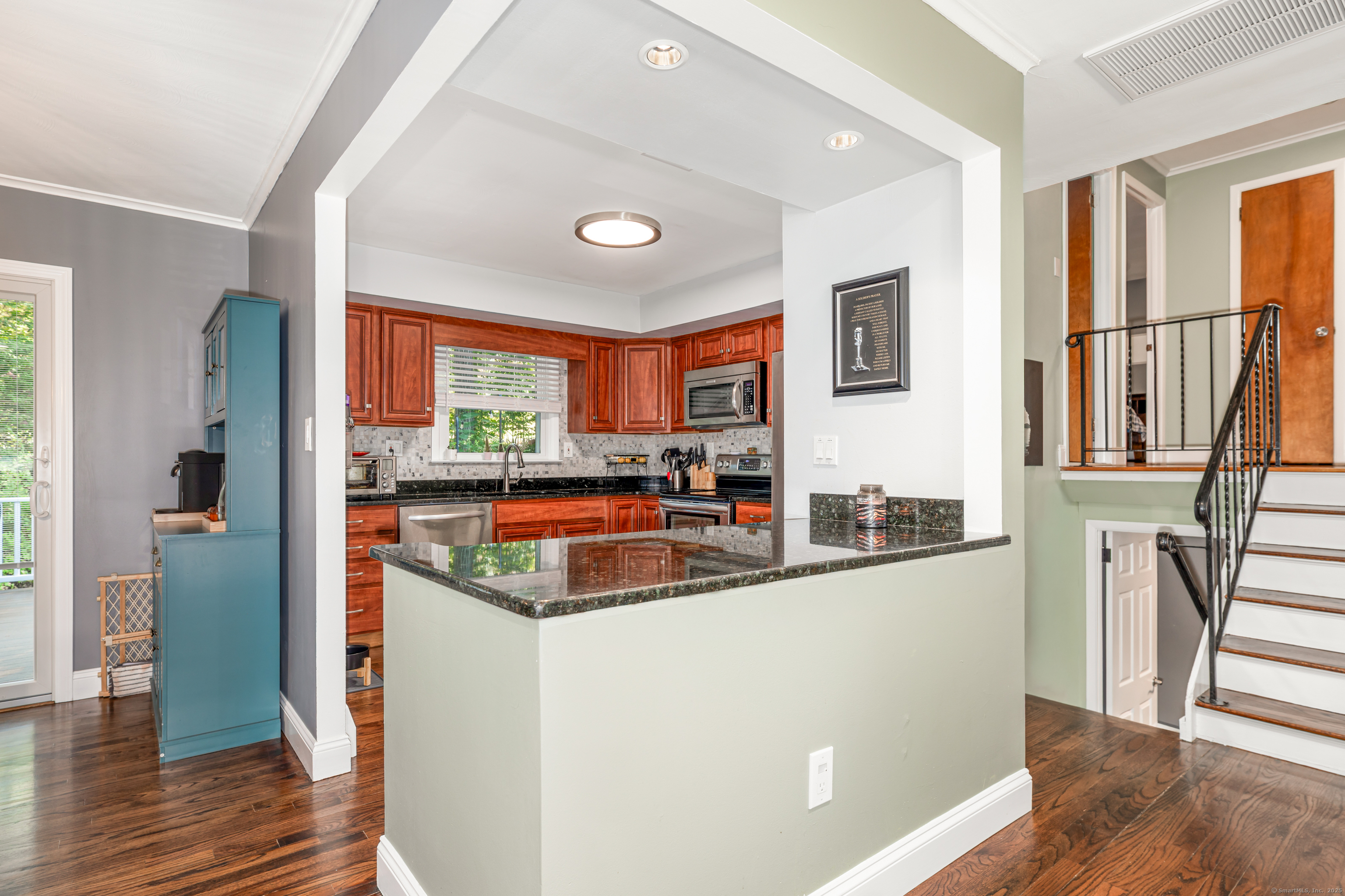 Welcome to this beautifully updated split-level, nestled in one of Meriden's most sought-after neighborhoods. The home has been meticulously maintained and thoughtfully improved with major investments inside and out, offering modern comfort while preserving its timeless character. Recent upgrades include a **NEW ROOF INSTALLED 10/31/2025**, Weil-McLain boiler (2025), a 3-ton Heil central air system, Mastic vinyl siding, Harvey Low-E windows, Andersen bay window and patio slider, plus a stunning oversized Trex deck (all 2024). The interior shines with hardwood floors, crown molding, a remodeled kitchen with stainless steel appliances, granite countertops, island, and tiled backsplash. Additional features include an updated bathroom, LED motion lighting, and a widened driveway. With these extensive updates, this home is truly move-in ready, offering energy efficiency, style, and peace of mind. Get ready to pack your bags and make this one home! Field card updated 9/2025 to reflect current three bedroom layout.