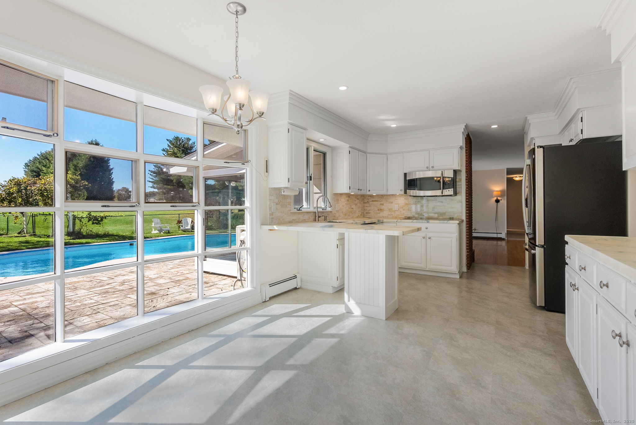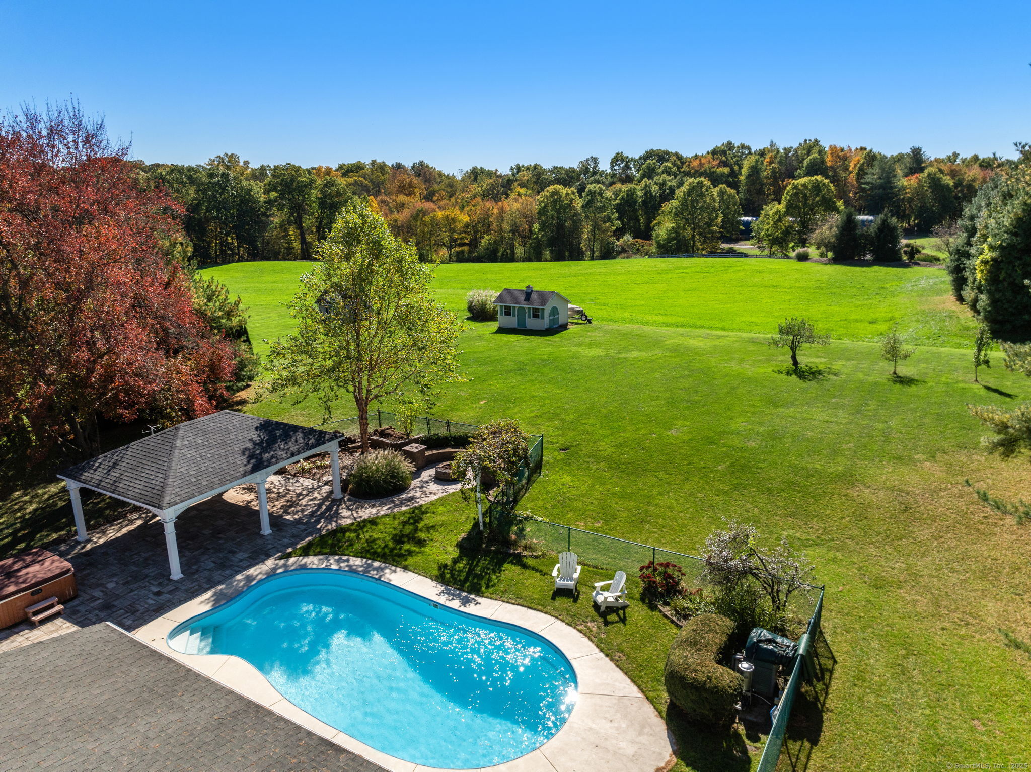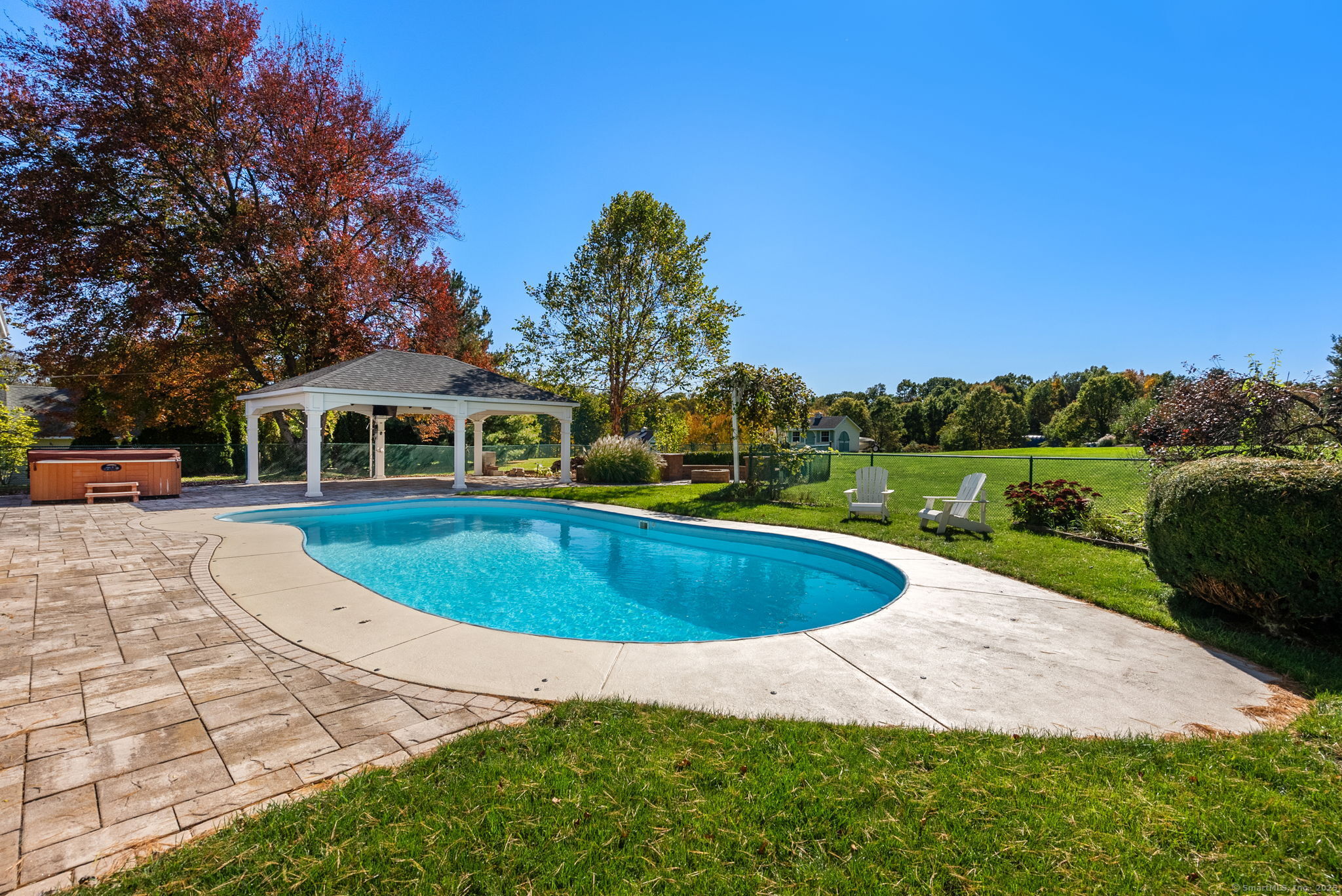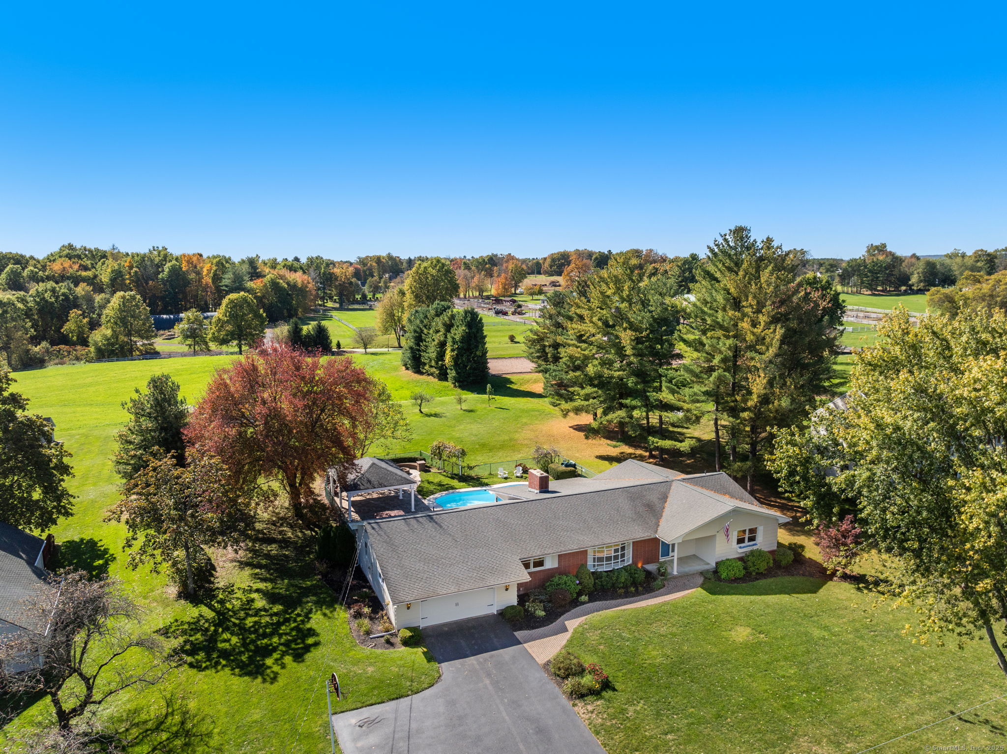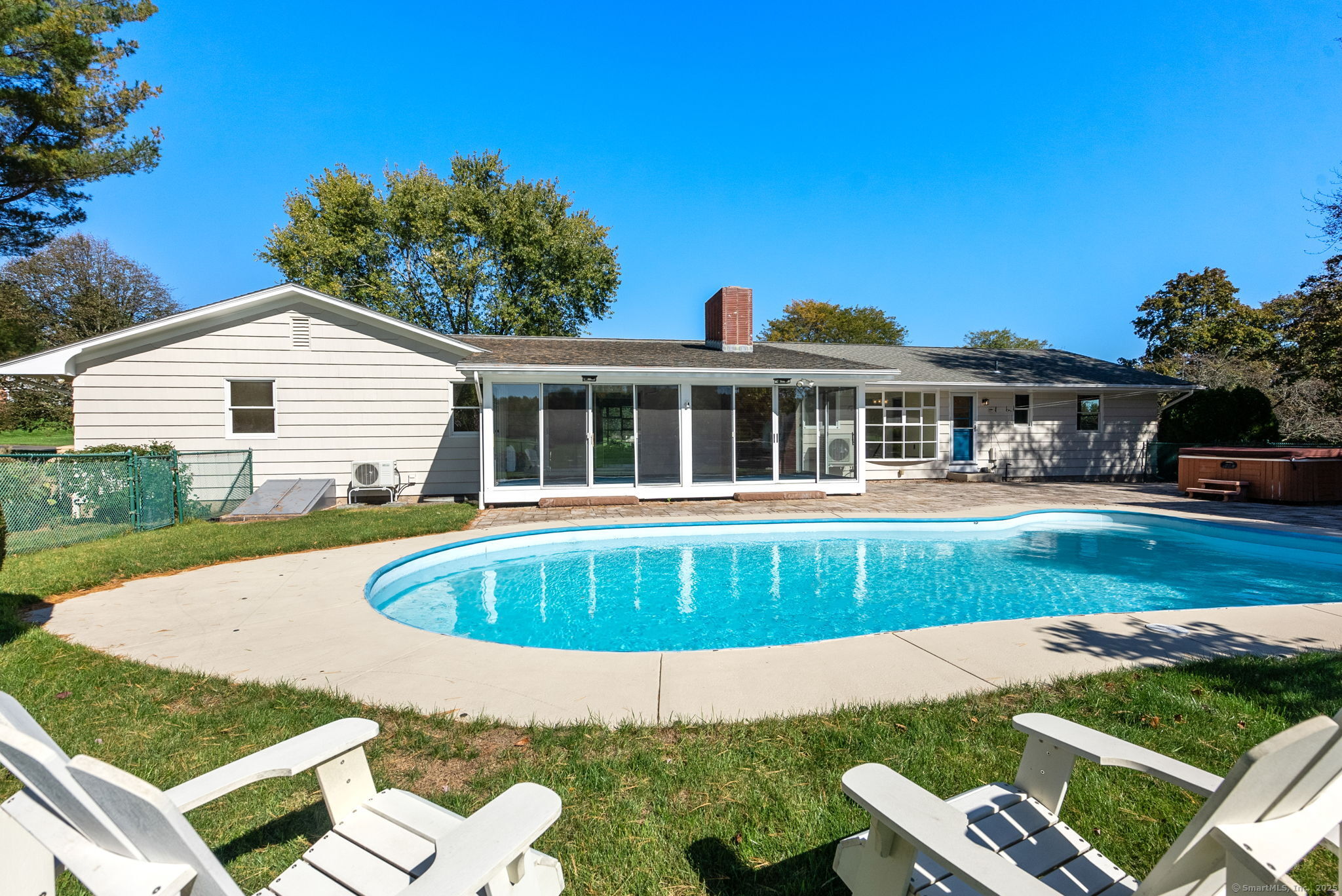 Your Dream Ranch Awaits in sought after neighborhood set on a picturesque 1-acre lot. This spacious ranch offers comfort, elegance, refinished hardwood floors and thoughtful updates throughout. A welcoming foyer opens to a light-filled living room with a large bow window and a formal dining room with crown molding. The beautiful kitchen features stainless steel appliances, under-cabinet lighting, a breakfast bar, pantry, and a bay-windowed eat-in area overlooking the pool and patio. The cozy family room boasts a raised-hearth fireplace and sliders to the sunroom, a four-season retreat with heat and A/C that can double as a home office. The bedroom wing offers two bedrooms, a full bath, and a spacious primary suite with walk-in closet, two additional closets, a vanity table with mirror, and a full bath with luxurious walk-in tile shower. Off the kitchen is the fourth bedroom and a full bath making an ideal guest area or office. There's a finished Rec. room w/heat in the LL. A convenient laundry/mudroom provides direct access to the back patio and the oversized 2-car garage that offers ample space for vehicles and storage. Step outside to your beautifully landscaped Oasis! The backyard with paver patio and walkways and serene views of a horse farm allows you to entertain in style with a sparkling pool, hot tub, elegant hand built pavilion and firepit-enhanced by special lighting under the pavilion and around the firepit-perfect for gatherings or relaxing evenings. Freshly