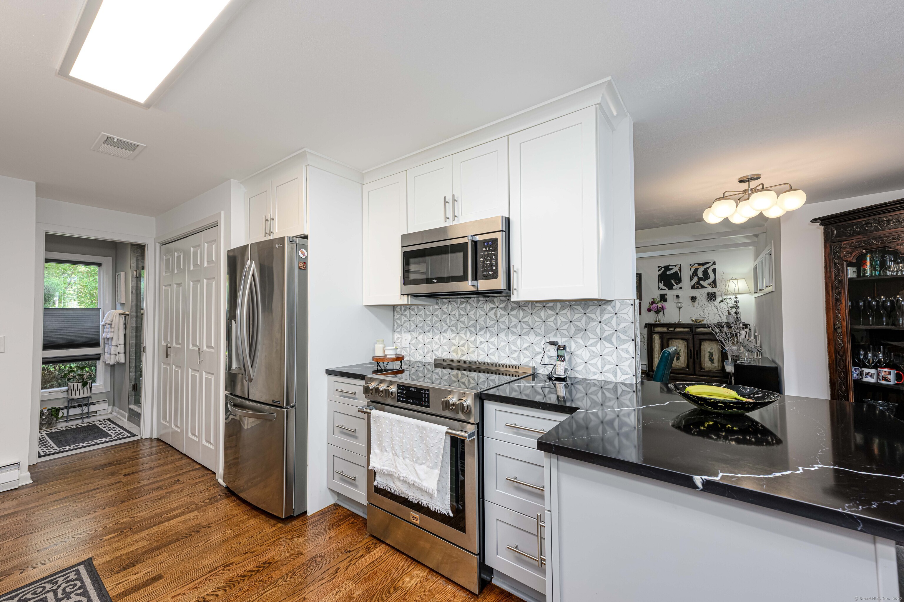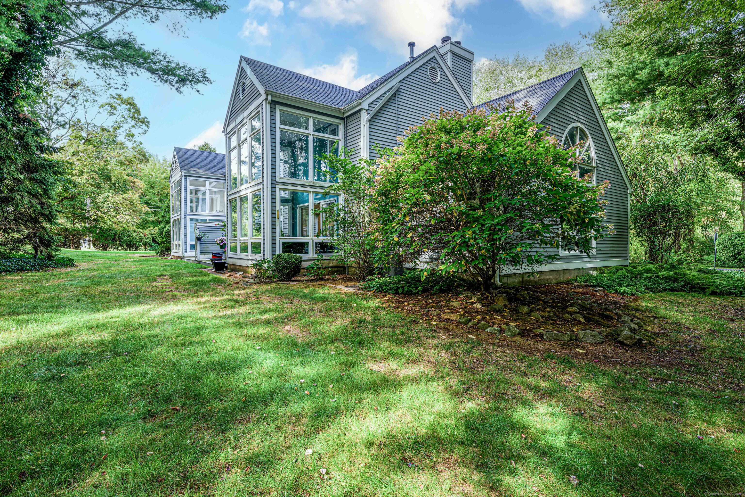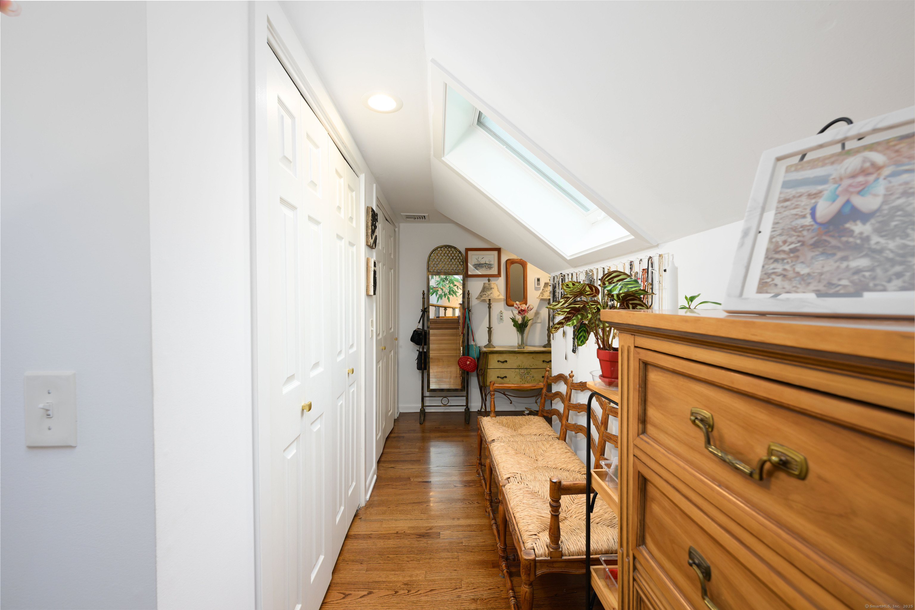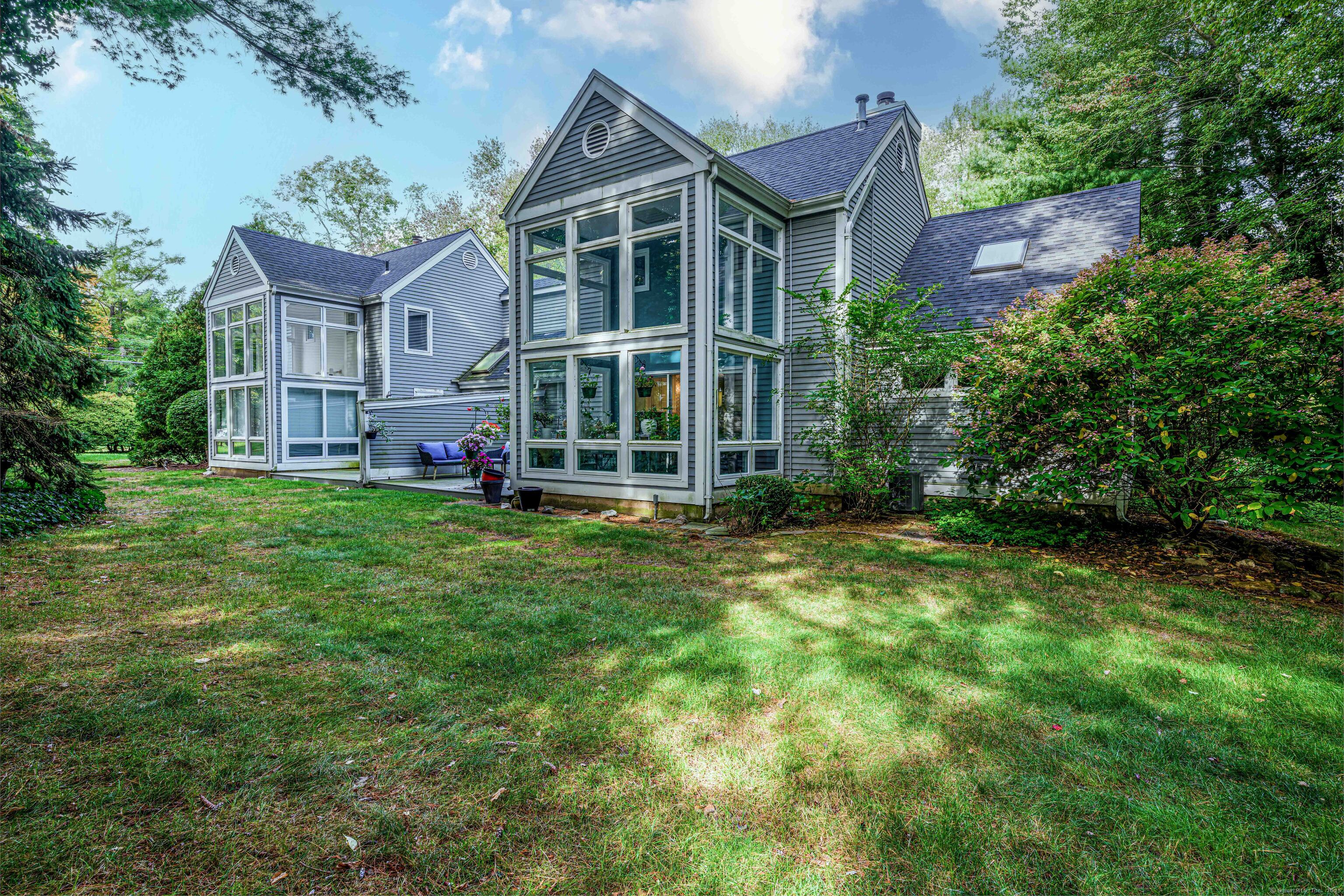 Desirable location! Perfectly positioned where everything you need is just a short stroll away. Vibrant shoreline community. Walkability to town center, the historic town green. Shoreline East CTrail station offering direct access to nearby cities and making it ideal for commuters, weekenders, and year-round residents alike. Very private unit in the complex with most spacious grounds. This home has been thoughtfully updated with a contemporary flair. High quality renovations to kitchen and baths. Kitchen with quartz countertops, plenty of storage and counter space in the kitchen, island eating area and stainless-steel appliances. Spacious size Bathrooms. Two story all-glass, ground floor to ceiling sunroom providing year-round living with a private natural scenery. Private outdoor patio space. Lots of natural light. Beautiful hardwood flooring throughout. Vaulted ceiling in open living room. Wood burning fireplace. Additional room on main floor can be used as a guest room, den or home office, has skylights and door that opens to back deck with a full bath just steps away. Attached garage and laundry off kitchen. Central air-conditioning. Upstairs to the 2nd floor loft has an open comfortable living area. Primary room offers so much space, skylights and lots of storage. Full bath, walk-in cedar closet, double closets, extra space for changing room/home office or craft room. A must see!