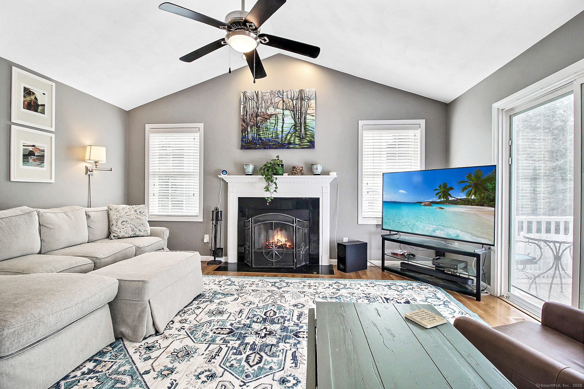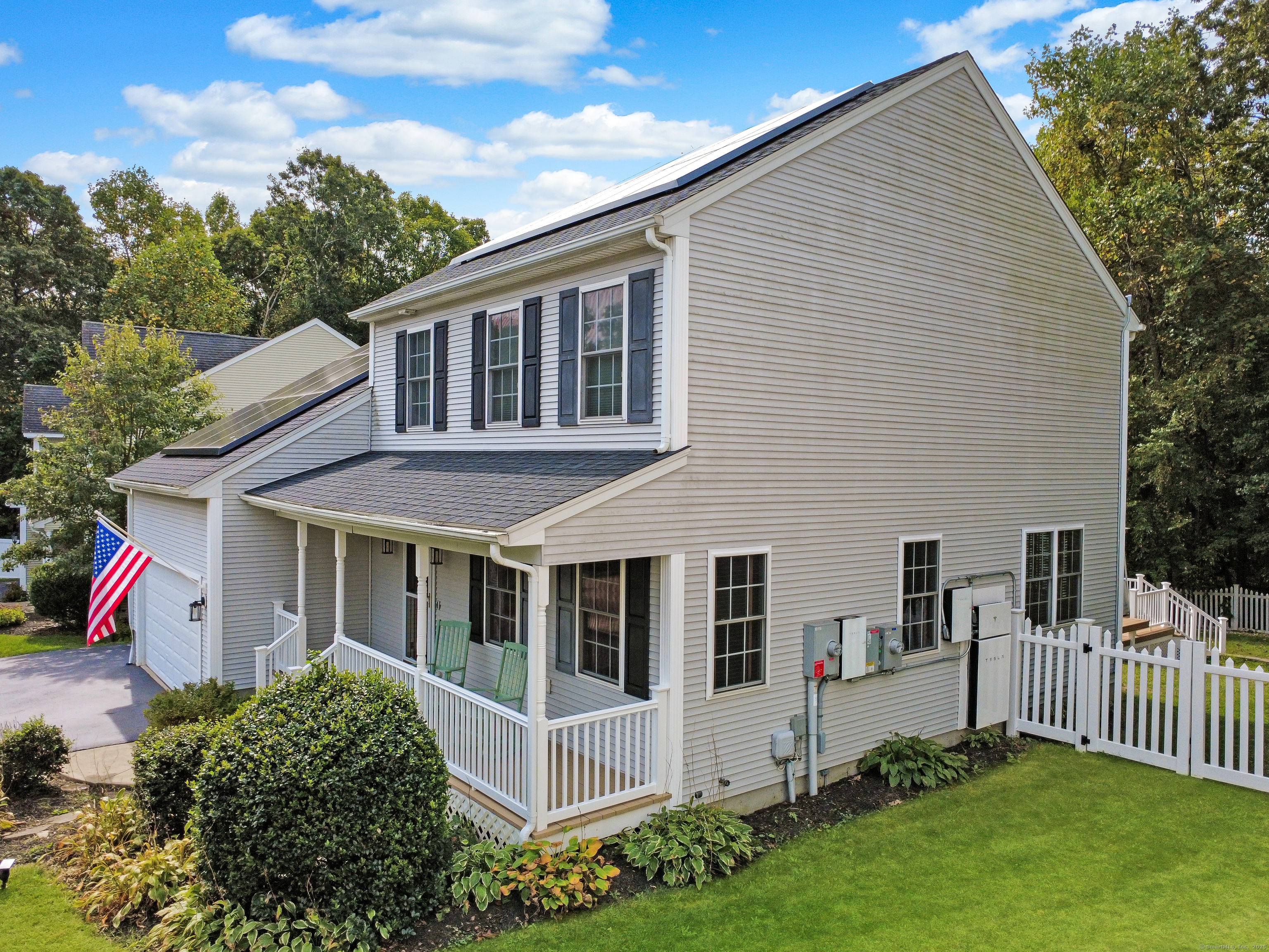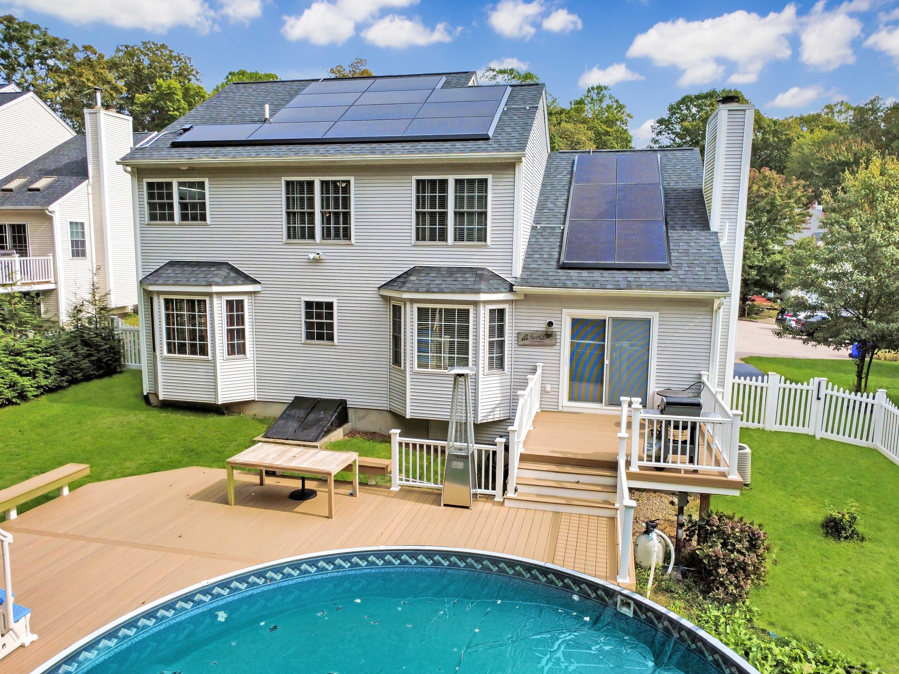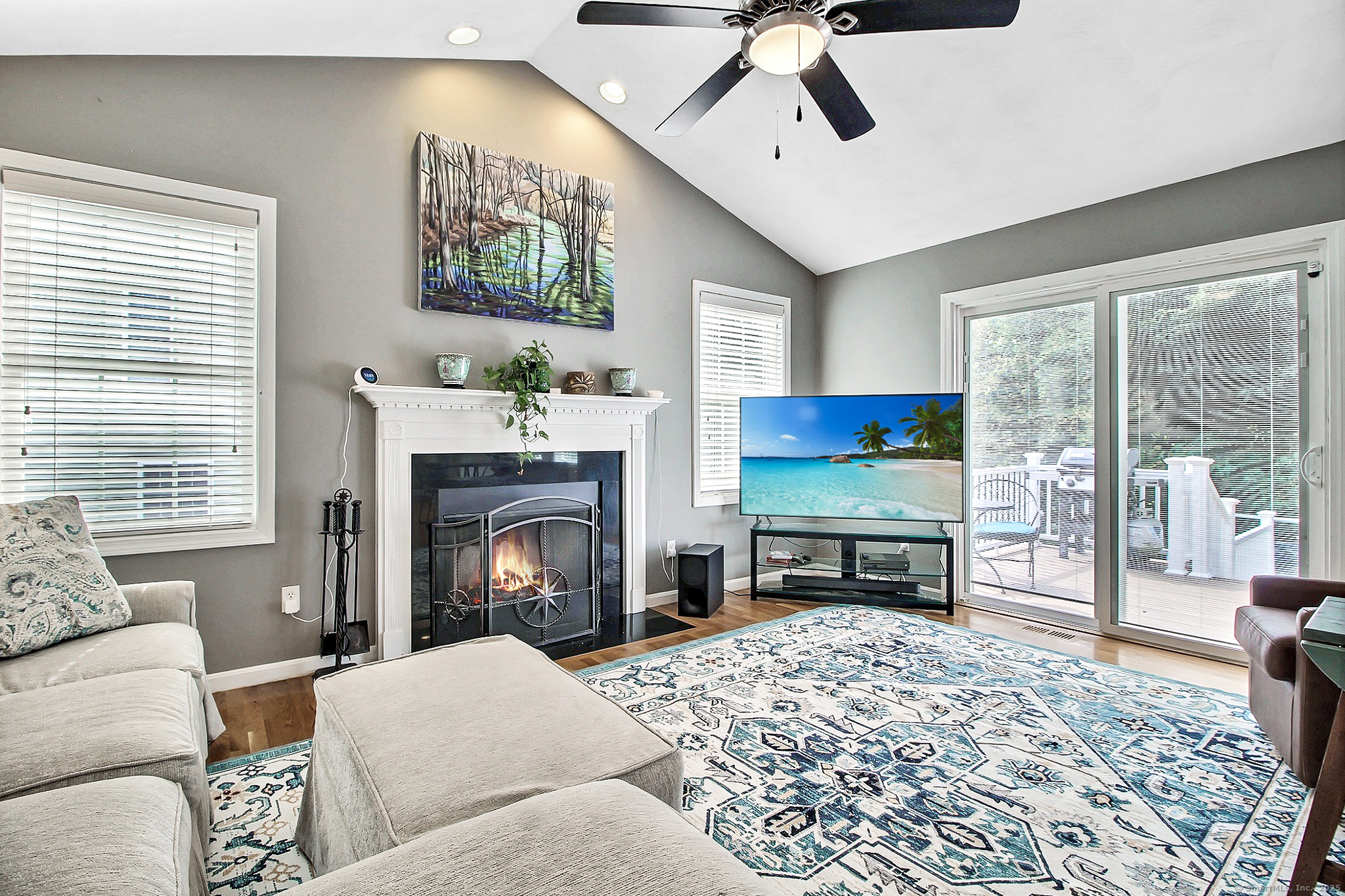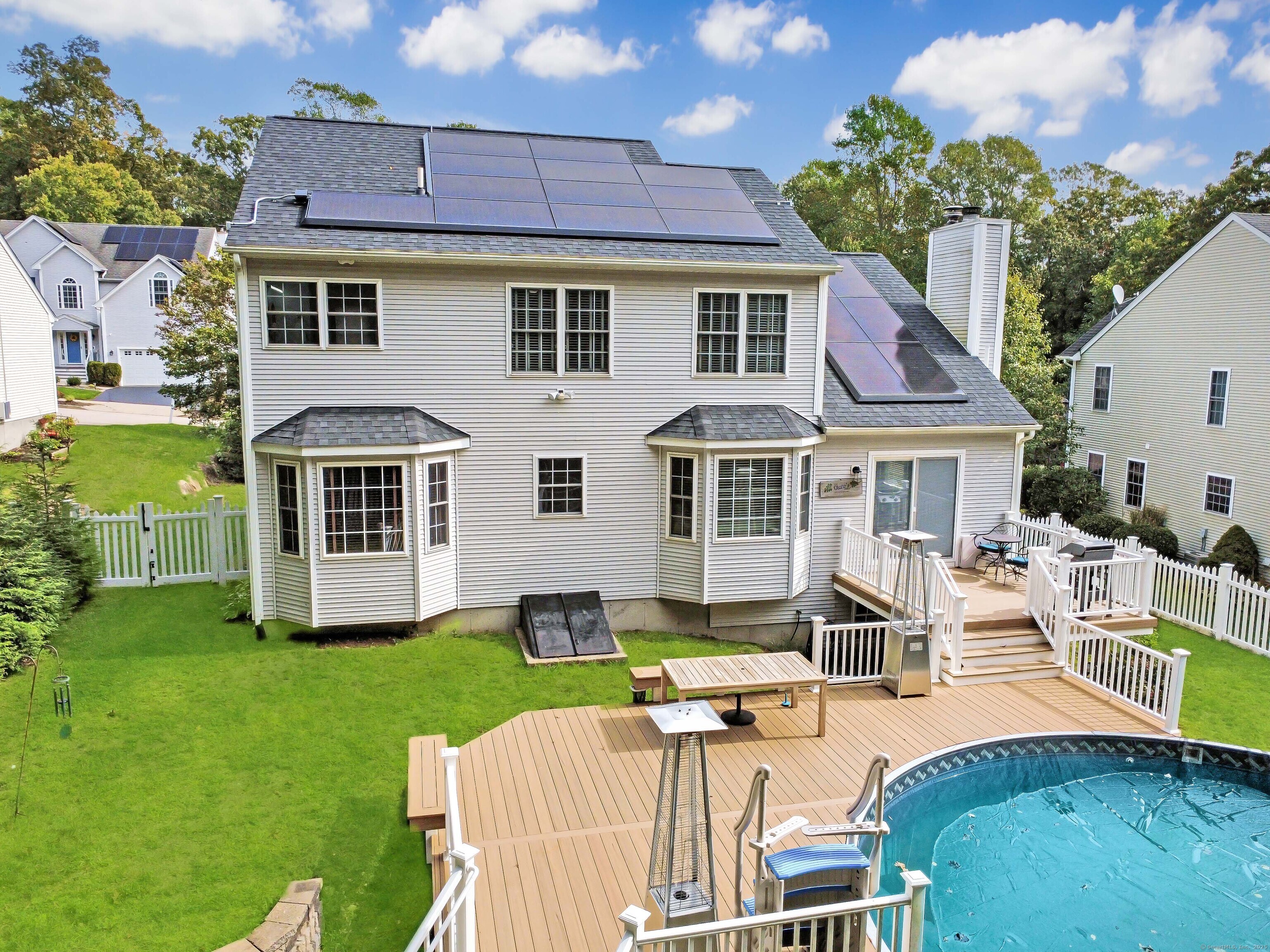 Pristine 3BR, 2.5BA Colonial tucked on a quiet cul-de-sac in one of the area's most desirable neighborhoods. A welcoming covered front porch overlooks the neighborhood setting. Step inside to find gleaming hardwood floors and a modern custom eat-in kitchen equipped with stainless steel appliances, quartz & walnut countertops, a farmer's sink, coffee bar, and abundant cabinetry. The kitchen opens to a generous family room with vaulted ceilings, a fireplace, and direct access to the 2-tiered deck and above-ground pool-perfect for entertaining or relaxing while enjoying the private, fenced yard framed by mature trees. The bright living room sits to the right of the entry and flows into a dining room highlighted by a curved accent wall and plantation-shuttered windows. Upstairs, the spacious primary suite features vaulted ceilings, a soaking tub, separate shower, and double vanity. Two additional bedrooms and another full bath complete the upper level, with ceiling fans throughout. The lower level offers versatile space for a rec room, gym, or storage. Additional highlights include a 2-car garage, owned Tesla solar roof panels with Powerwall for battery back up, electric car charger, newer roof, and a storage shed. Located close to the shoreline, I-95, shopping & dining, this move-in-ready home combines comfort, efficiency, and modern style in a sought-after location.