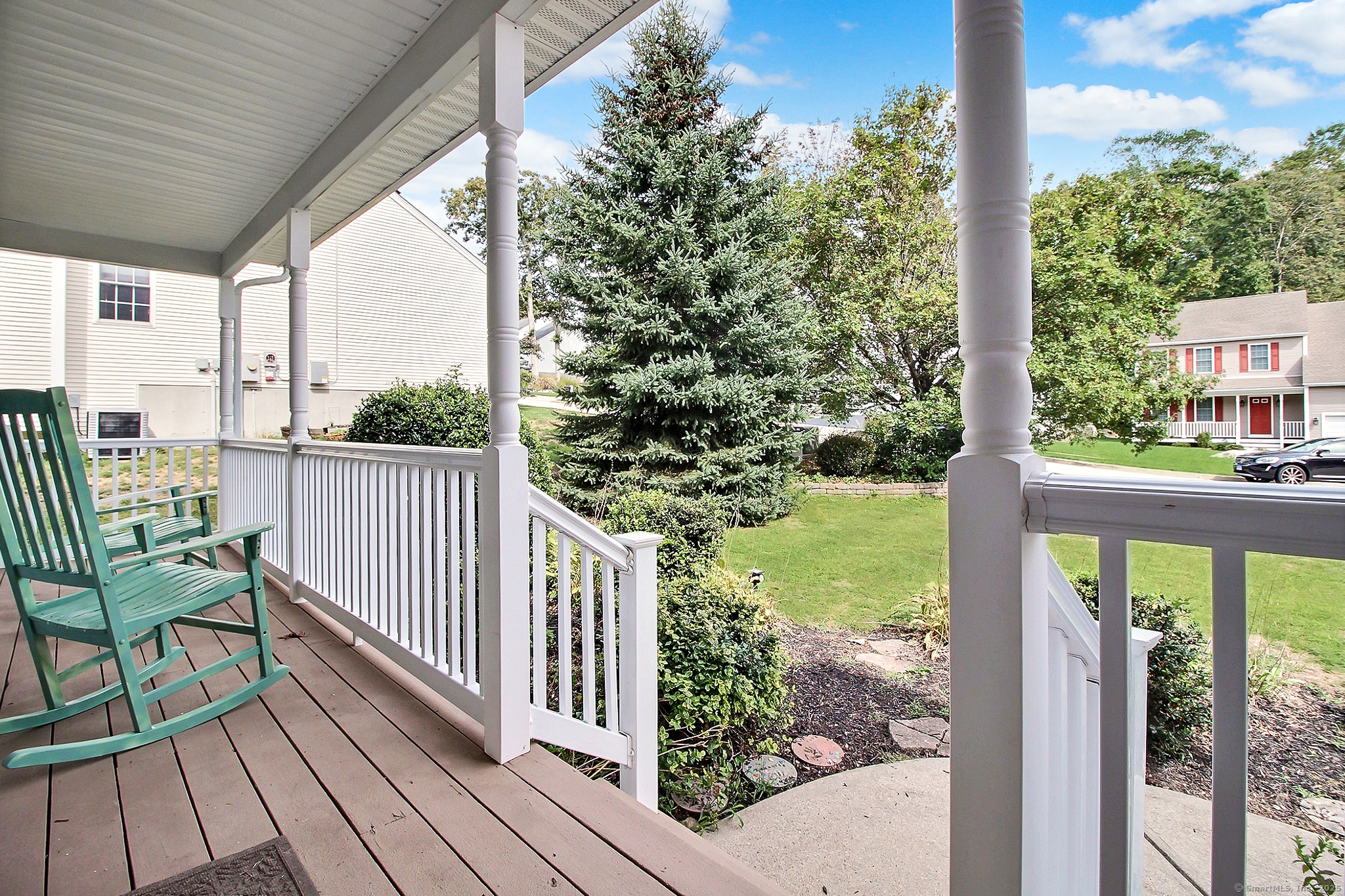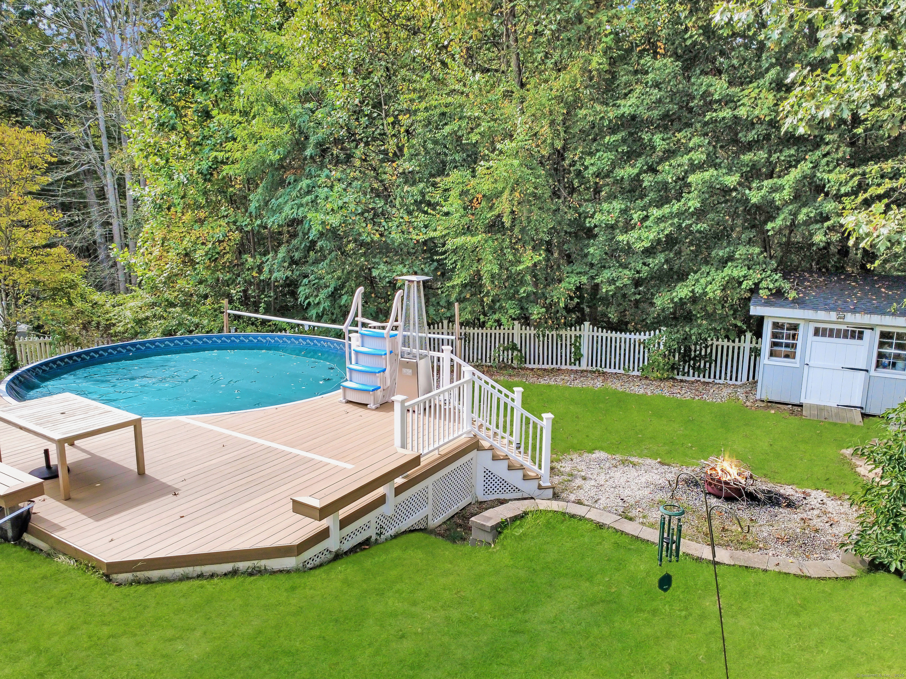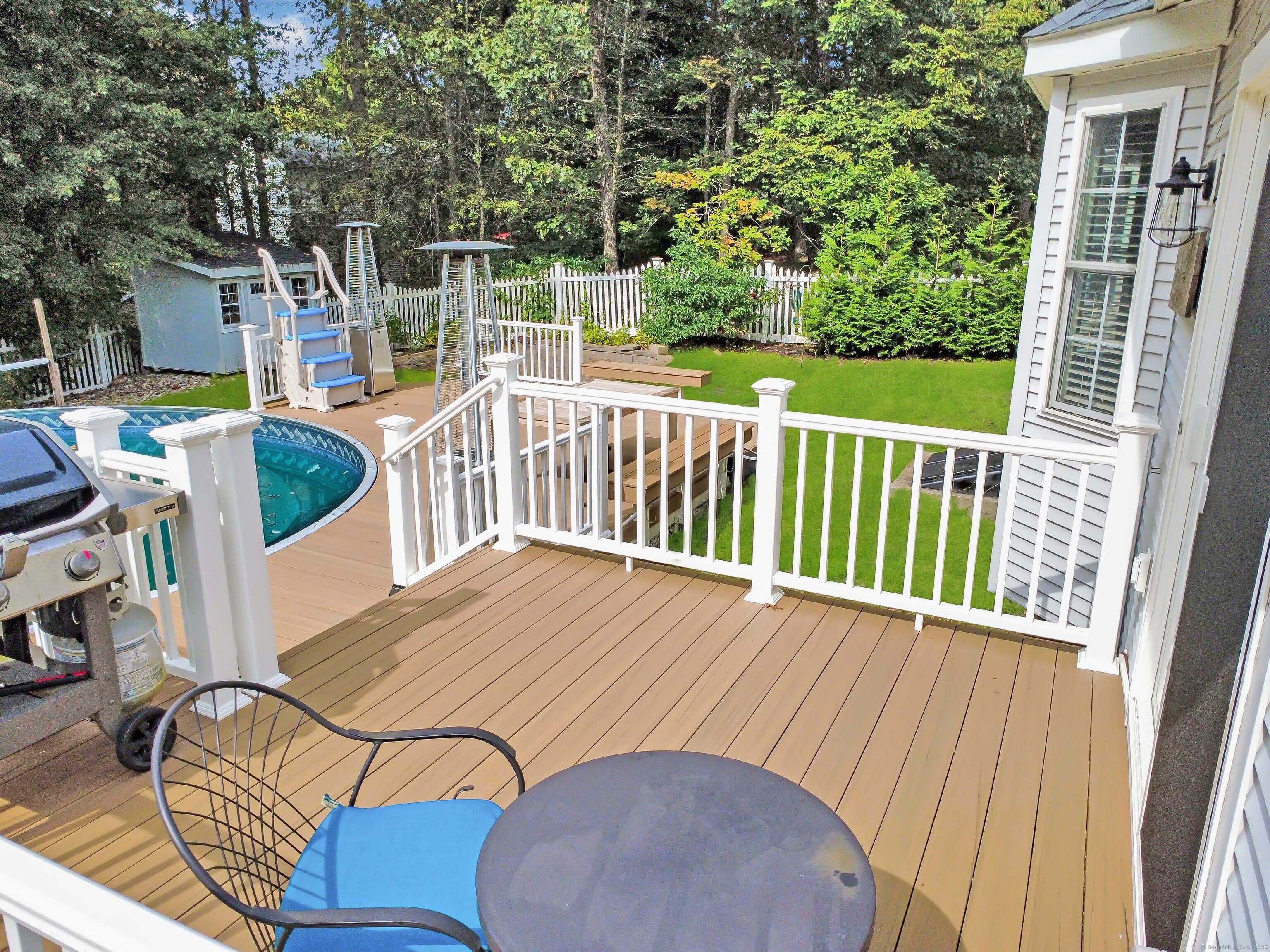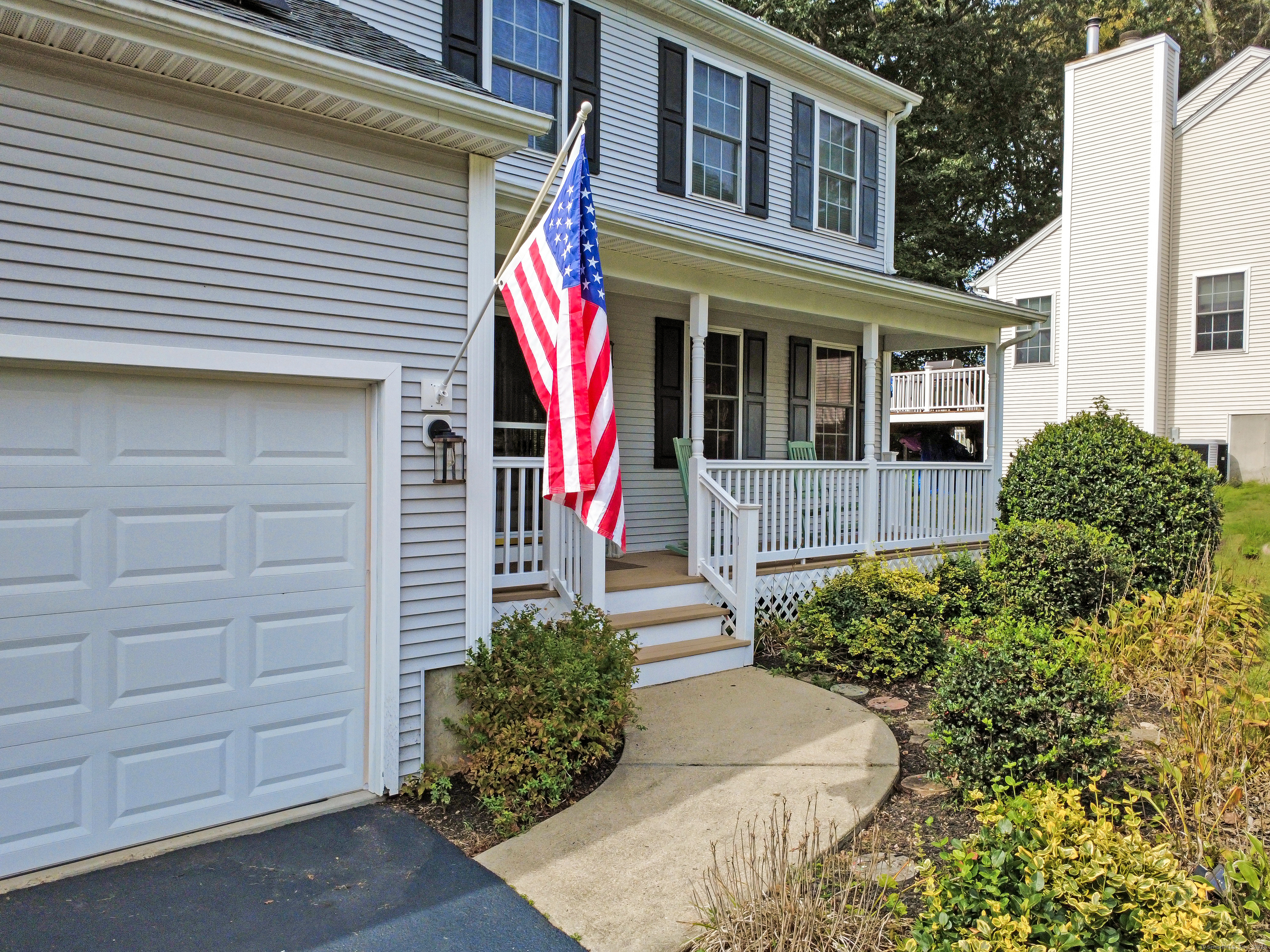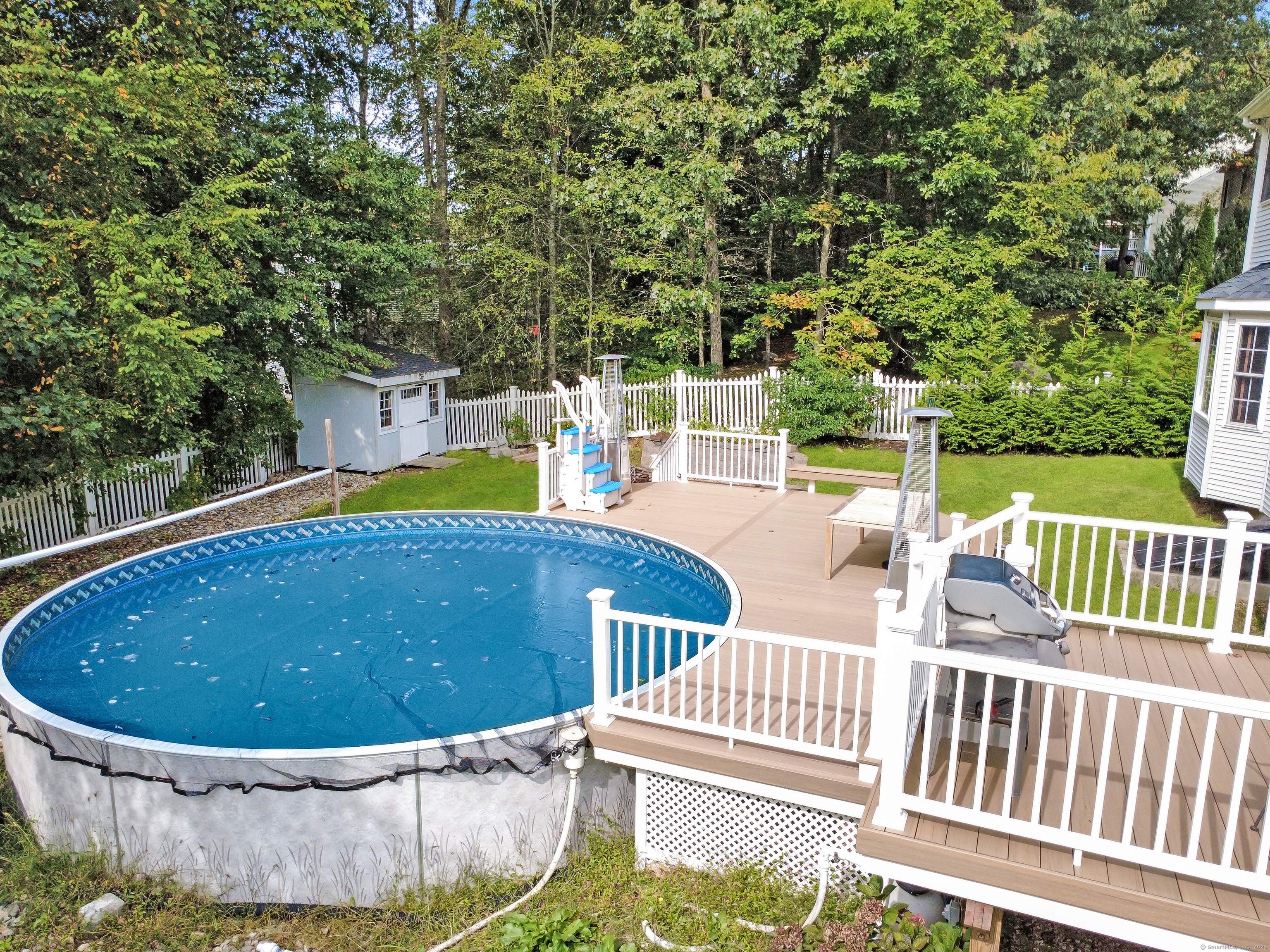 Pristine 3BR, 2.5BA Colonial tucked on a quiet cul-de-sac in one of the area's most desirable neighborhoods. A welcoming covered front porch overlooks the neighborhood setting. Step inside to find gleaming hardwood floors and a modern custom eat-in kitchen equipped with stainless steel appliances, quartz & walnut countertops, a farmer's sink, coffee bar, and abundant cabinetry. The kitchen opens to a generous family room with vaulted ceilings, a fireplace, and direct access to the 2-tiered deck and above-ground pool-perfect for entertaining or relaxing while enjoying the private, fenced yard framed by mature trees. The bright living room sits to the right of the entry and flows into a dining room highlighted by a curved accent wall and plantation-shuttered windows. Upstairs, the spacious primary suite features vaulted ceilings, a soaking tub, separate shower, and double vanity. Two additional bedrooms and another full bath complete the upper level, with ceiling fans throughout. The lower level offers versatile space for a rec room, gym, or storage. Additional highlights include a 2-car garage, owned Tesla solar roof panels with Powerwall for battery back up, electric car charger, newer roof, and a storage shed. Located close to the shoreline, I-95, shopping & dining, this move-in-ready home combines comfort, efficiency, and modern style in a sought-after location.