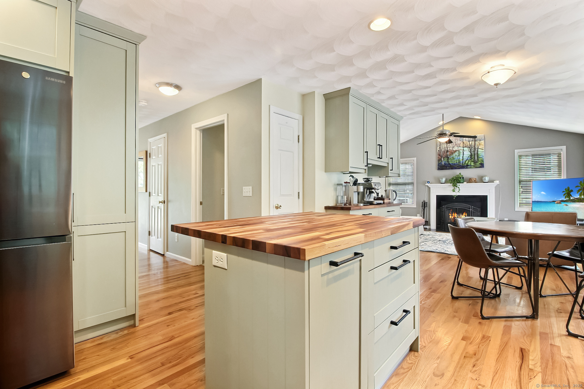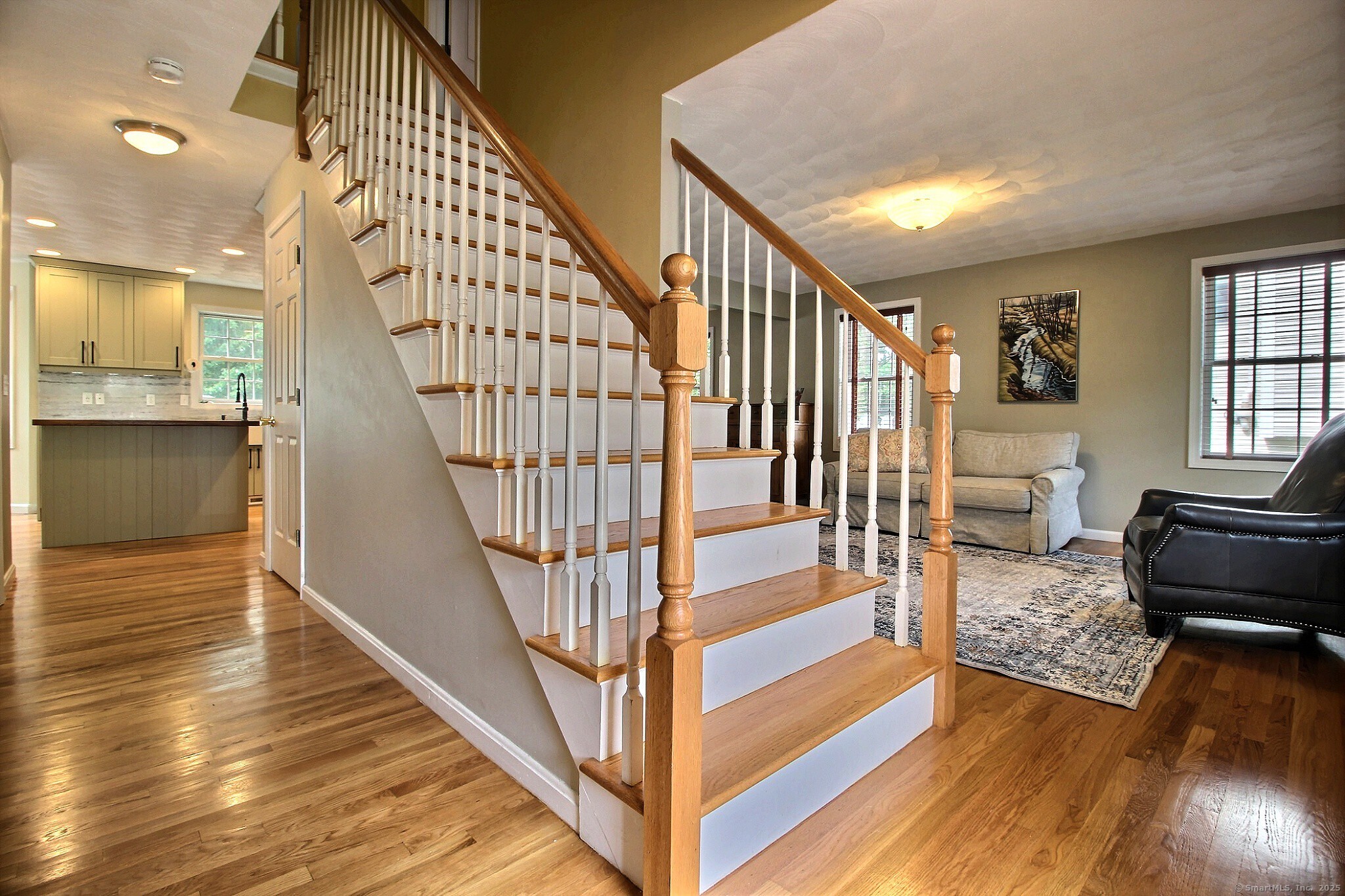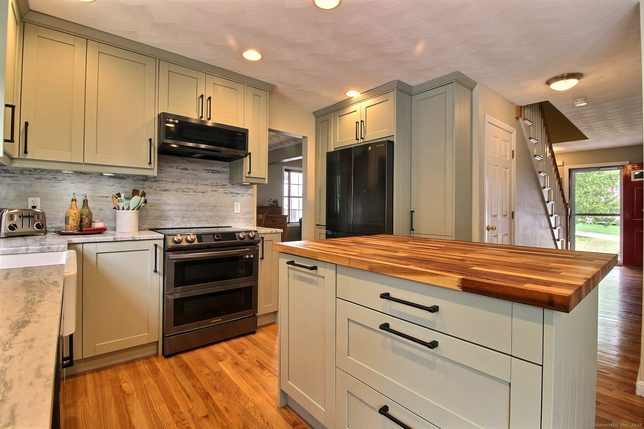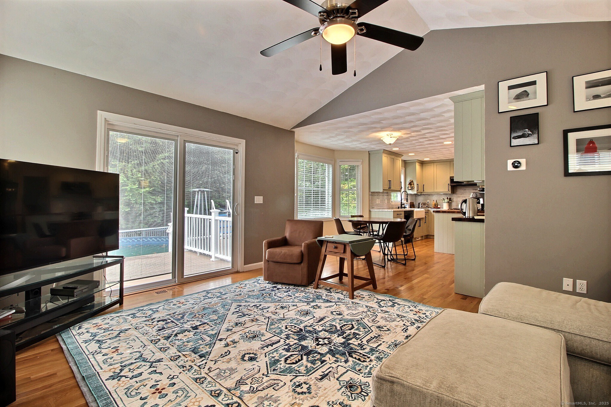 Pristine 3BR, 2.5BA Colonial tucked on a quiet cul-de-sac in one of the area's most desirable neighborhoods. A welcoming covered front porch overlooks the neighborhood setting. Step inside to find gleaming hardwood floors and a modern custom eat-in kitchen equipped with stainless steel appliances, quartz & walnut countertops, a farmer's sink, coffee bar, and abundant cabinetry. The kitchen opens to a generous family room with vaulted ceilings, a fireplace, and direct access to the 2-tiered deck and above-ground pool-perfect for entertaining or relaxing while enjoying the private, fenced yard framed by mature trees. The bright living room sits to the right of the entry and flows into a dining room highlighted by a curved accent wall and plantation-shuttered windows. Upstairs, the spacious primary suite features vaulted ceilings, a soaking tub, separate shower, and double vanity. Two additional bedrooms and another full bath complete the upper level, with ceiling fans throughout. The lower level offers versatile space for a rec room, gym, or storage. Additional highlights include a 2-car garage, owned Tesla solar roof panels with Powerwall for battery back up, electric car charger, newer roof, and a storage shed. Located close to the shoreline, I-95, shopping & dining, this move-in-ready home combines comfort, efficiency, and modern style in a sought-after location.