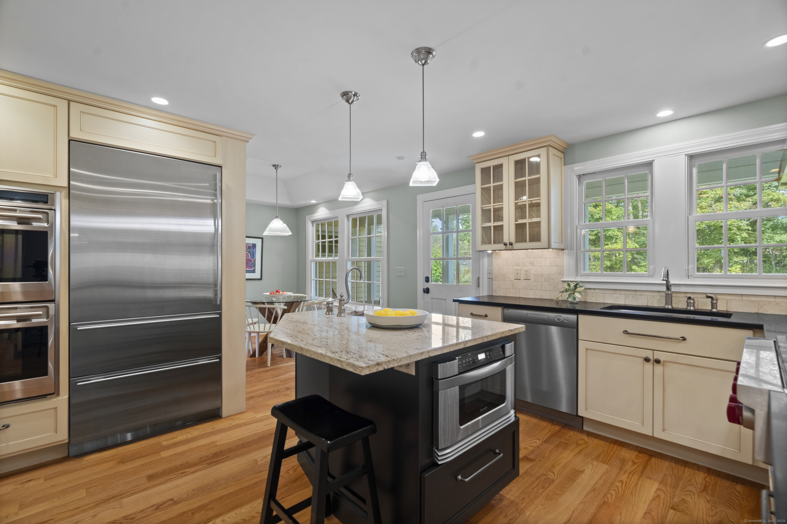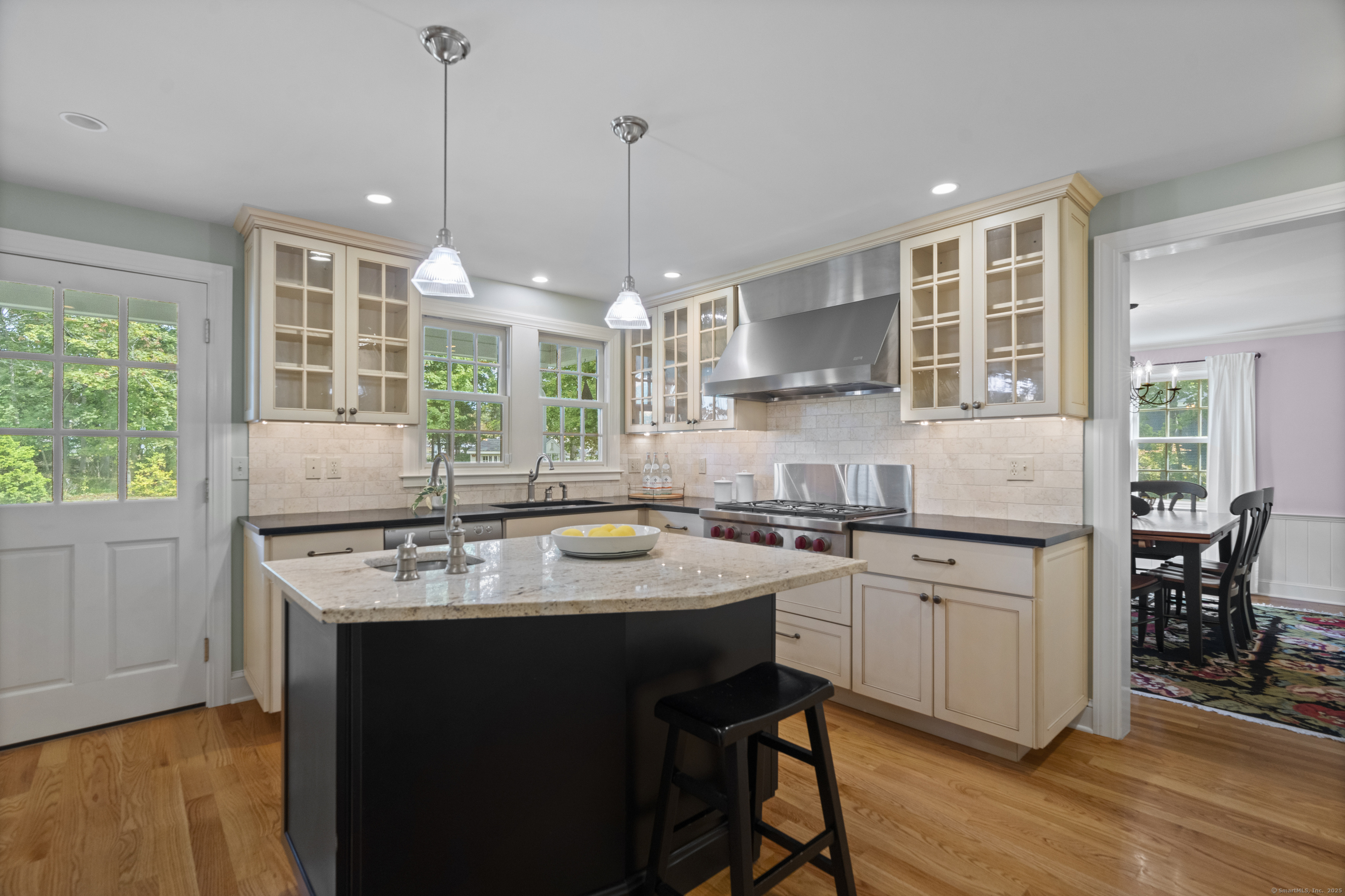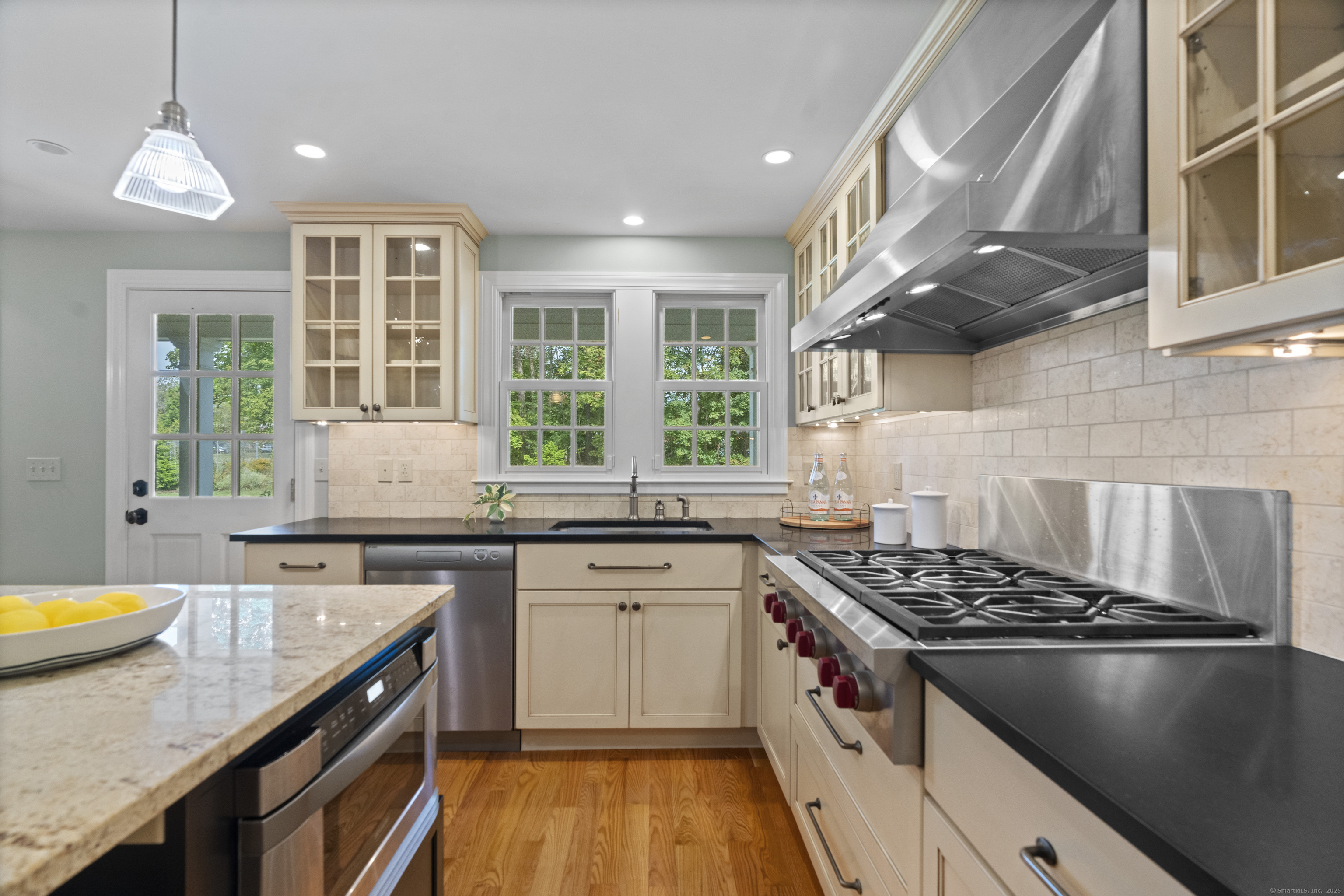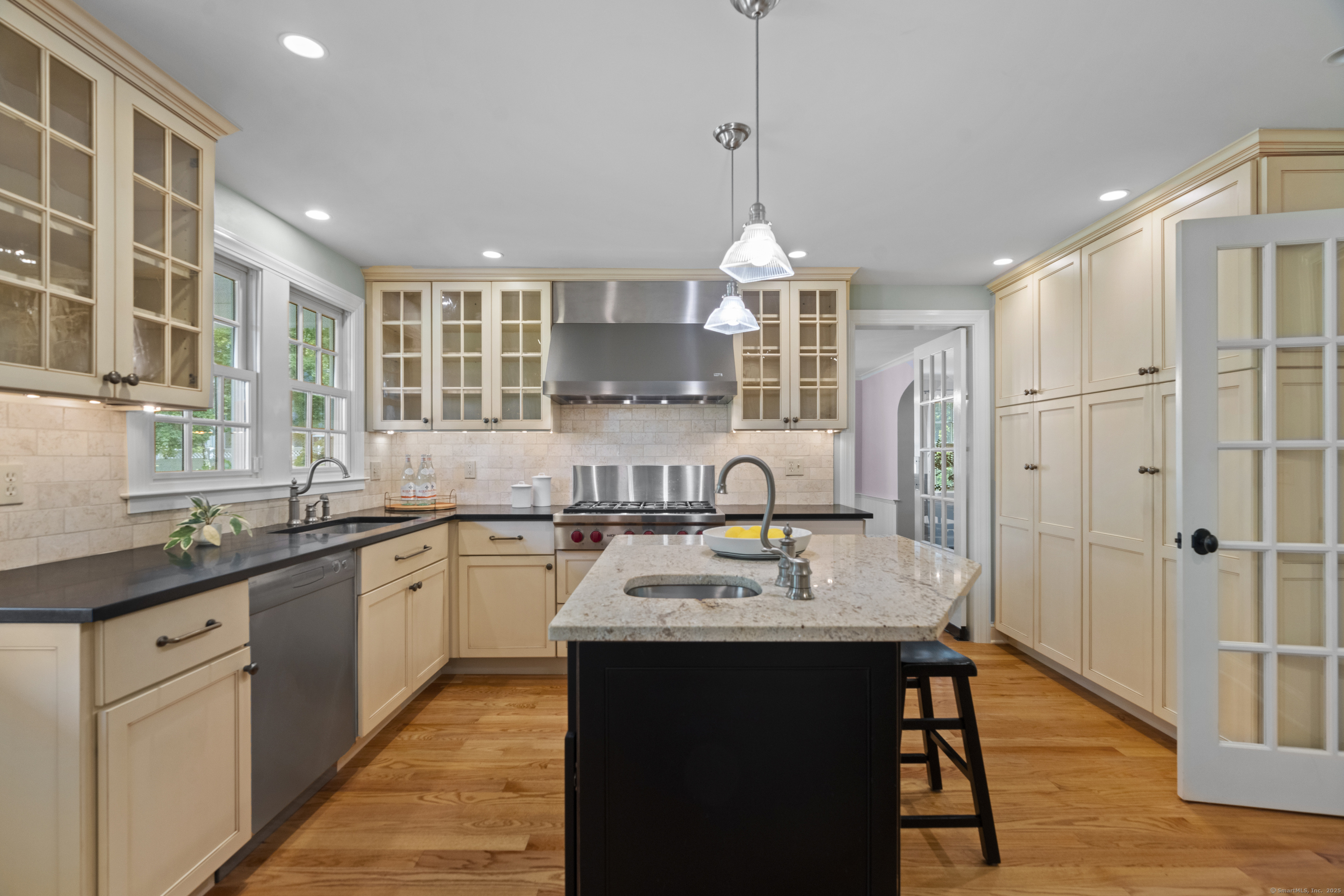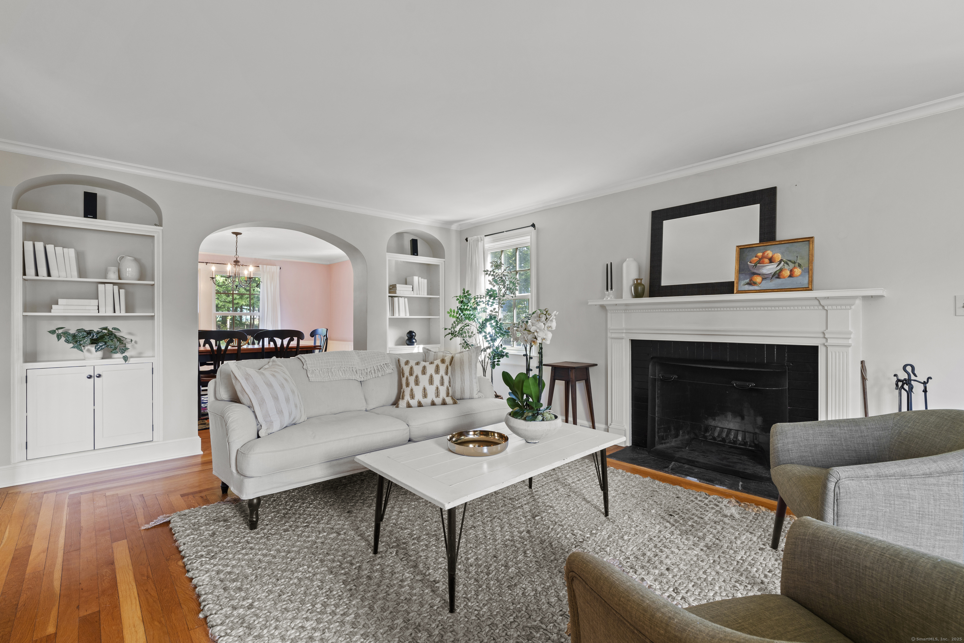 Stunning Custom Colonial w/ 3 beds & 2.5 baths, ideally located in the sought-after South End of Cheshire. This elegant home features over 2,200 sq ft of living space w/ abundant natural light, HW floors & custom details throughout. The formal living room showcases a beautiful wood-burning FP, custom built-in bookshelves, charming window seats & classic archways. A formal dining room provides an inviting space for entertaining & opens through a French door to an impressive kitchen with breakfast nook overlooking the backyard. The upscale kitchen is a chef's dream, featuring high-end Wolf appliances (cooktop and double oven), a center island with bar seating & generous cabinet & counter space. Completing the main level is an office w/ custom built-ins & renovated 1/2 bath. Upstairs, the spacious primary suite boasts a wall of custom white built-ins, a walk-in closet & a beautifully tiled en-suite bath with a walk-in shower. Two additional large bedrooms share a full bath. Laundry is conveniently located on the 2nd floor. Set on a spacious 0.65-acre lot, this home offers a level front & backyard-ideal for gardening enthusiasts or anyone who loves spending time outdoors. Additional highlights include a 2 car attached garage, large wood shop & a newer hot water heater (2025). Enjoy a prime location just steps from Cheshire High School, Bartlem Park, & the Town Pool, with shopping, restaurants, & easy access for all commuters. This impressive home is ready to welcome its new owner
