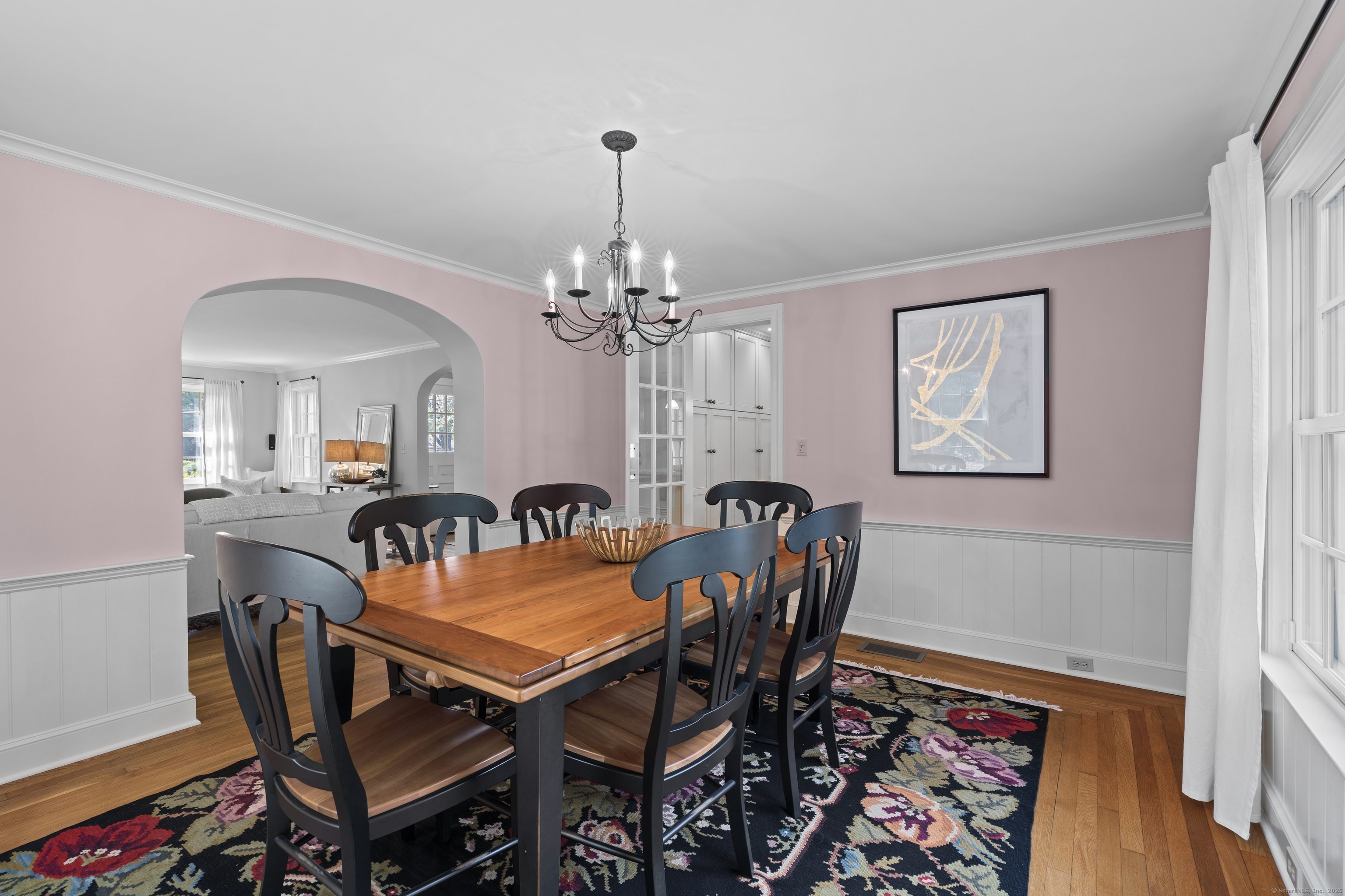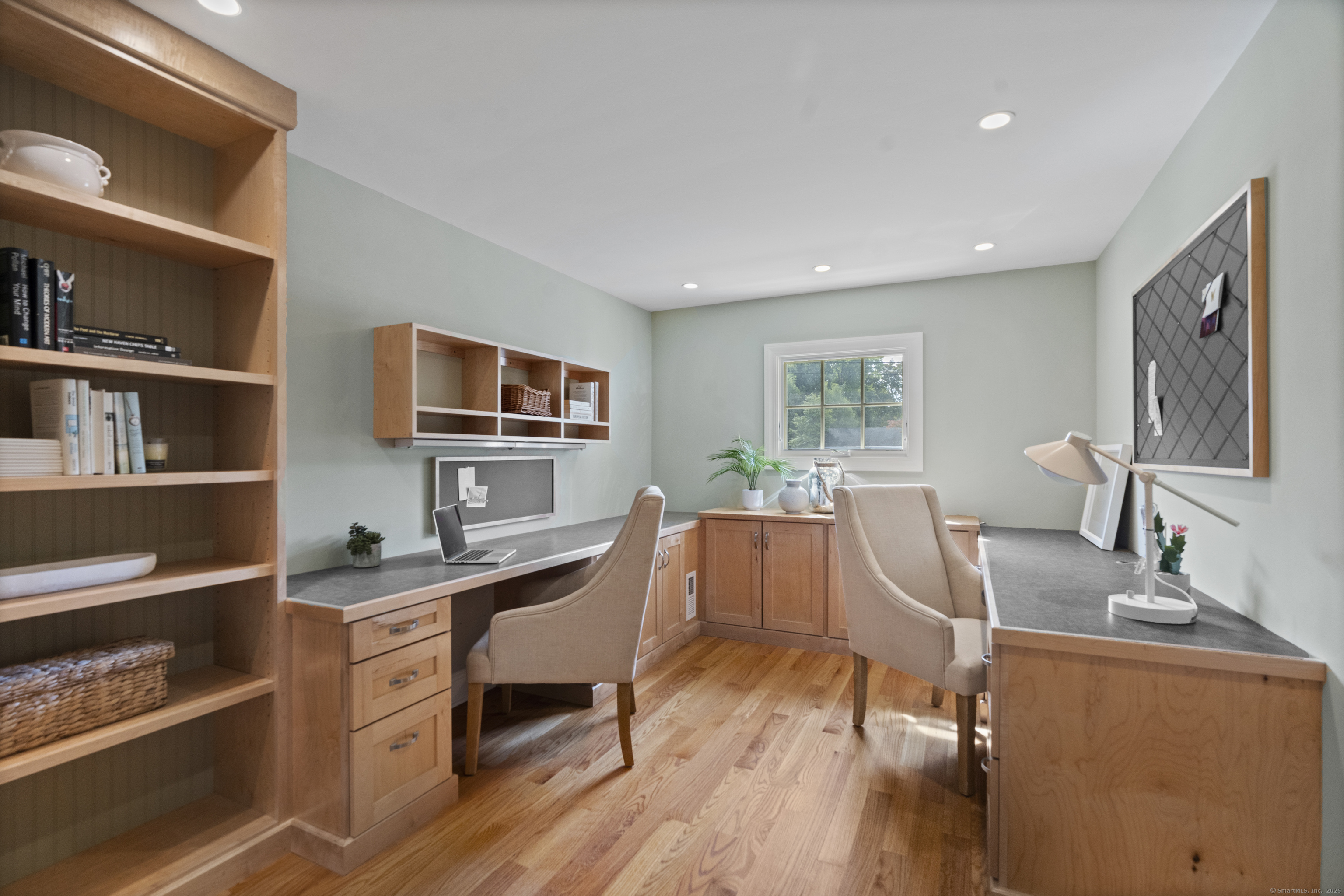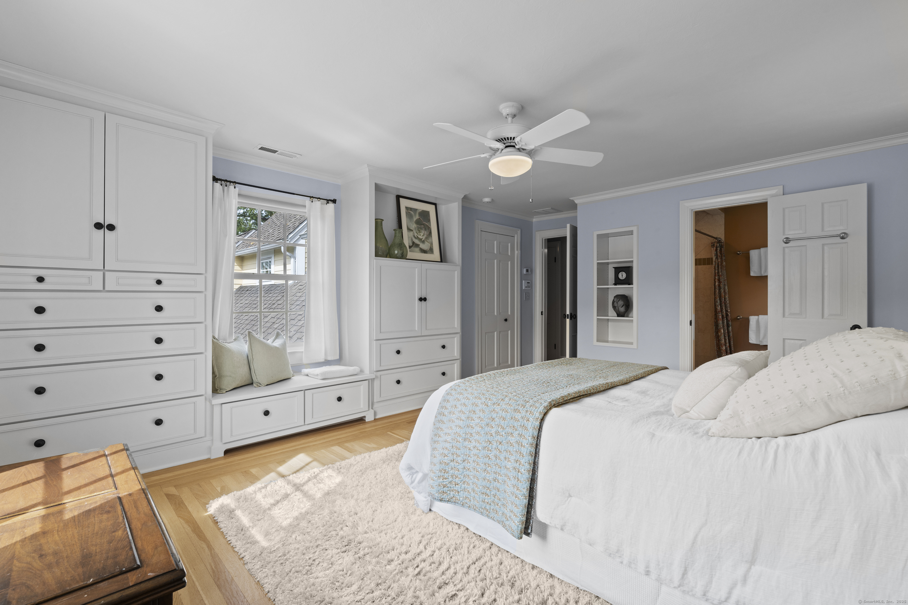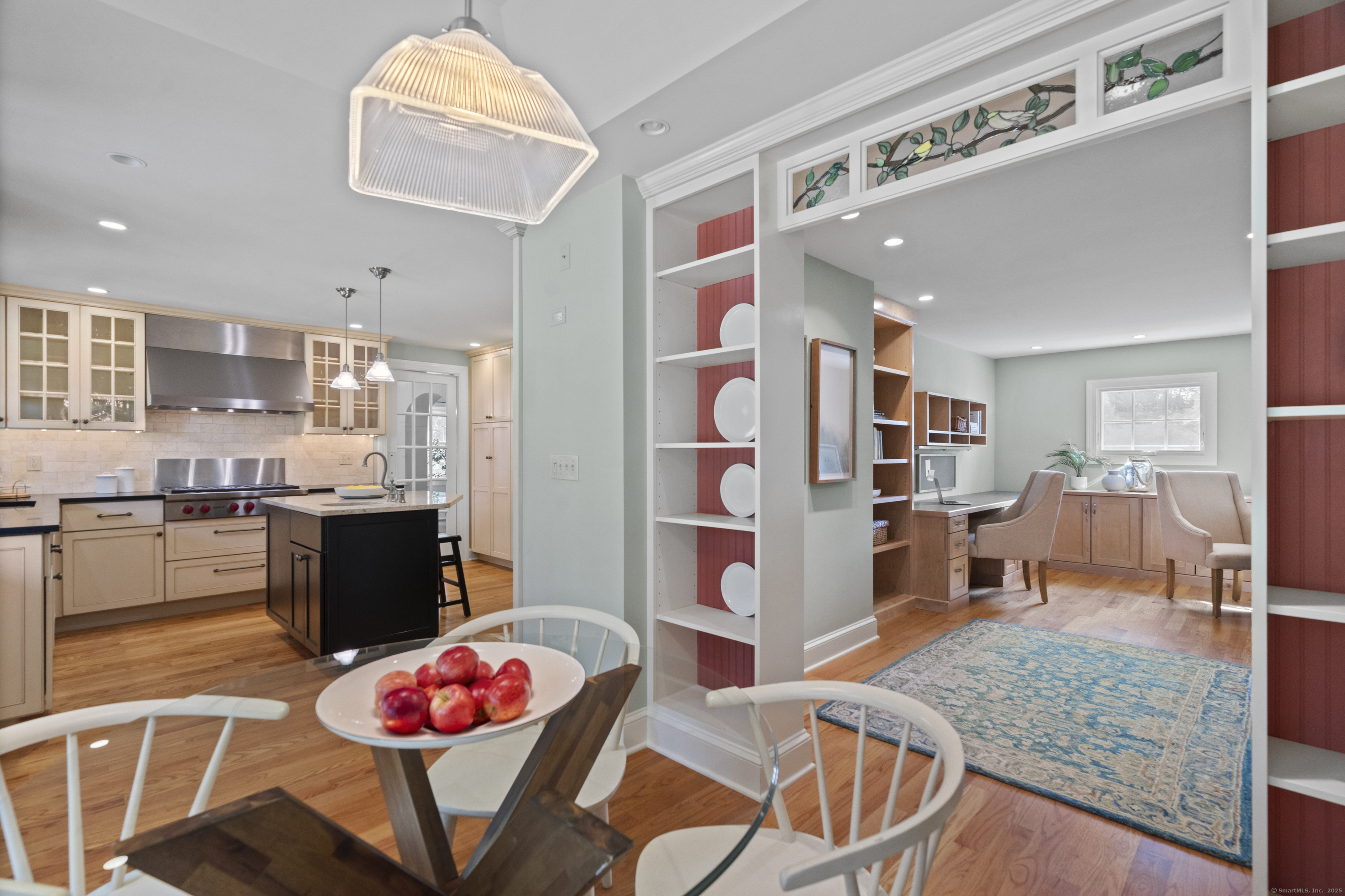 Stunning Custom Colonial w/ 3 beds & 2.5 baths, ideally located in the sought-after South End of Cheshire. This elegant home features over 2,200 sq ft of living space w/ abundant natural light, HW floors & custom details throughout. The formal living room showcases a beautiful wood-burning FP, custom built-in bookshelves, charming window seats & classic archways. A formal dining room provides an inviting space for entertaining & opens through a French door to an impressive kitchen with breakfast nook overlooking the backyard. The upscale kitchen is a chef's dream, featuring high-end Wolf appliances (cooktop and double oven), a center island with bar seating & generous cabinet & counter space. Completing the main level is an office w/ custom built-ins & renovated 1/2 bath. Upstairs, the spacious primary suite boasts a wall of custom white built-ins, a walk-in closet & a beautifully tiled en-suite bath with a walk-in shower. Two additional large bedrooms share a full bath. Laundry is conveniently located on the 2nd floor. Set on a spacious 0.65-acre lot, this home offers a level front & backyard-ideal for gardening enthusiasts or anyone who loves spending time outdoors. Additional highlights include a 2 car attached garage, large wood shop & a newer hot water heater (2025). Enjoy a prime location just steps from Cheshire High School, Bartlem Park, & the Town Pool, with shopping, restaurants, & easy access for all commuters. This impressive home is ready to welcome its new owner