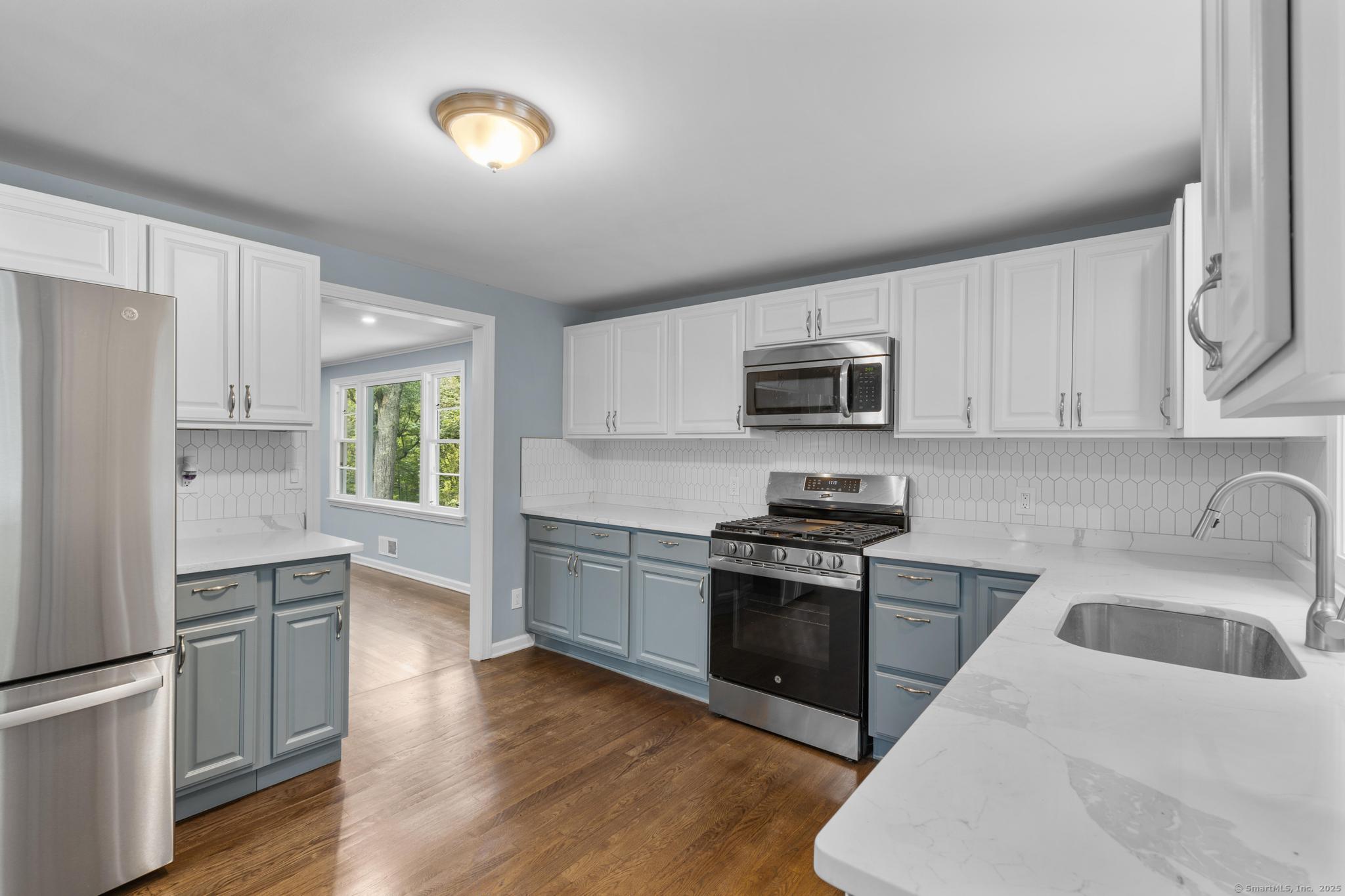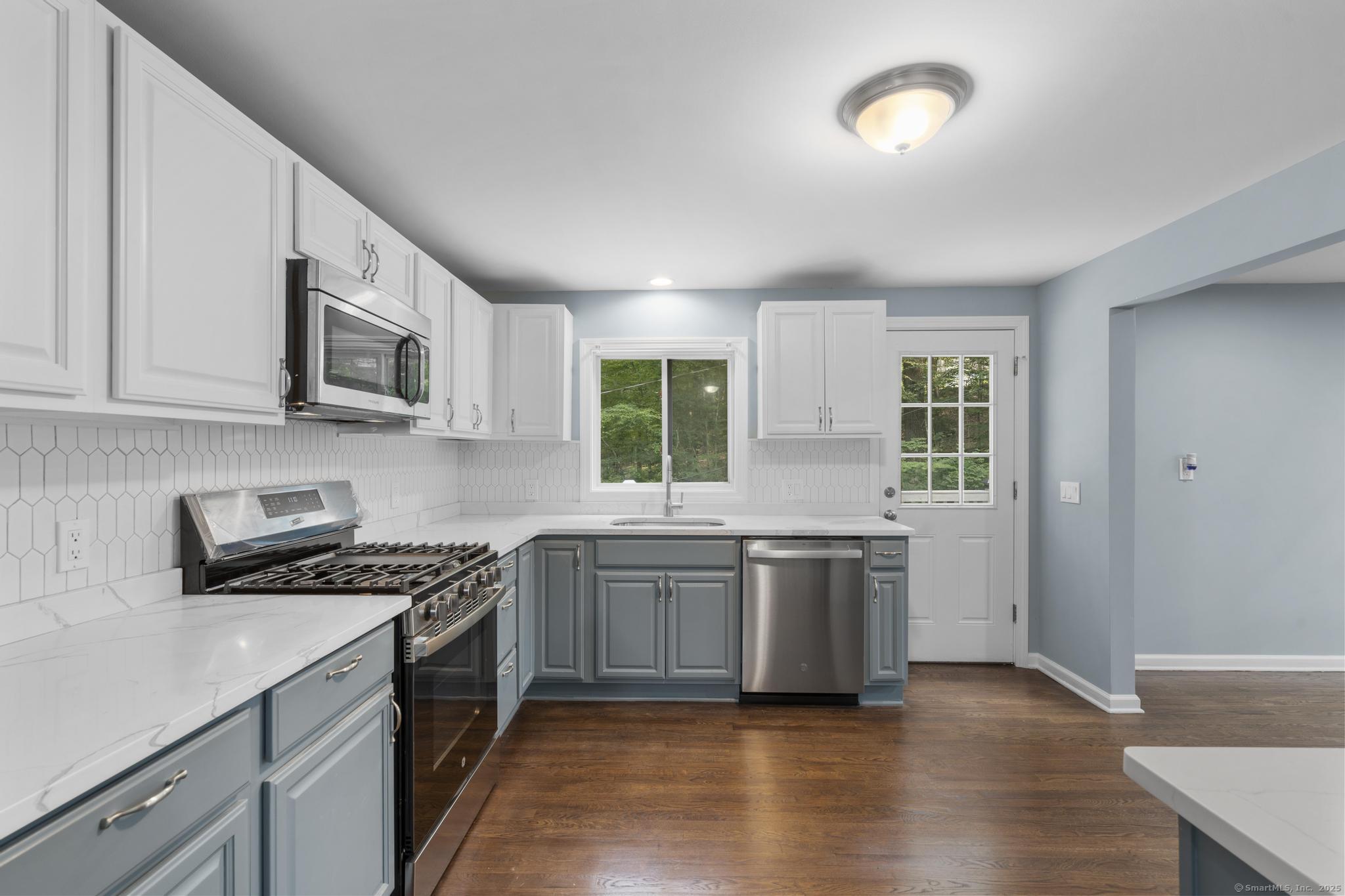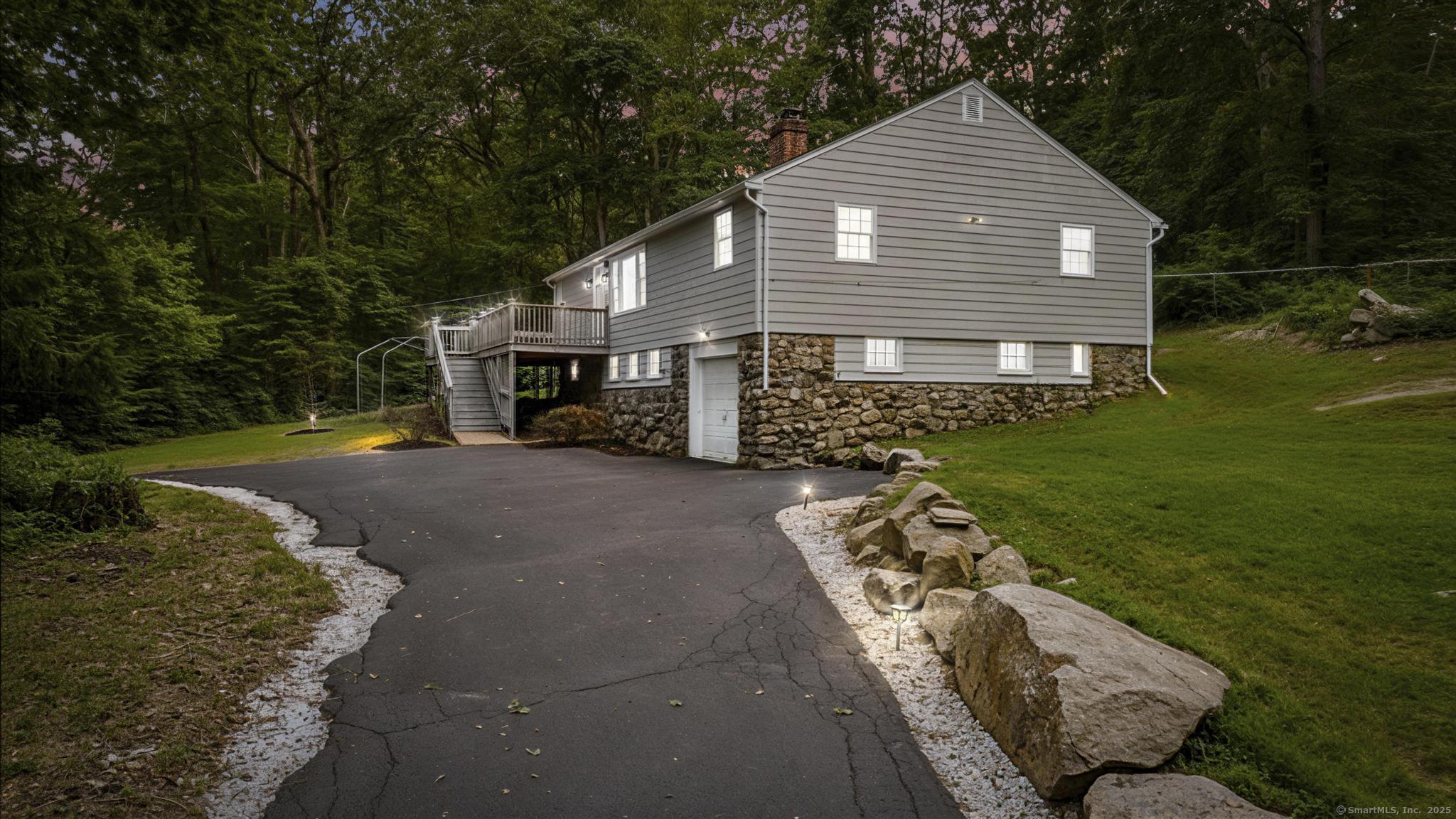 Tucked away in Guilford's sought-after Westwoods neighborhood, this fully renovated 3-bedroom, 2-bath ranch combines modern updates with rare natural privacy. Set on a wooded lot with no visible neighbors, the home features a stunning kitchen with two-tone shaker cabinets, quartz countertops, and stainless steel appliances, a spacious living room with a wood-burning fireplace, refinished hardwood floors, and recessed lighting, along with two completely remodeled bathrooms showcasing floor-to-ceiling tile showers and custom vanities. The primary suite offers backyard views and an en-suite bath, while the walk-out lower level provides a dedicated laundry area and flexible space ideal for a home gym, office, or playroom. Outside, enjoy a newer deck overlooking the secluded lot, fresh landscaping, an expanded driveway with one-car garage, and quick access to the Westwoods Trails for hiking and biking. With its blend of privacy, style, and proximity to the Guilford Green, beaches, train, and I-95, this turn-key home offers the best of both retreat living and everyday convenience.