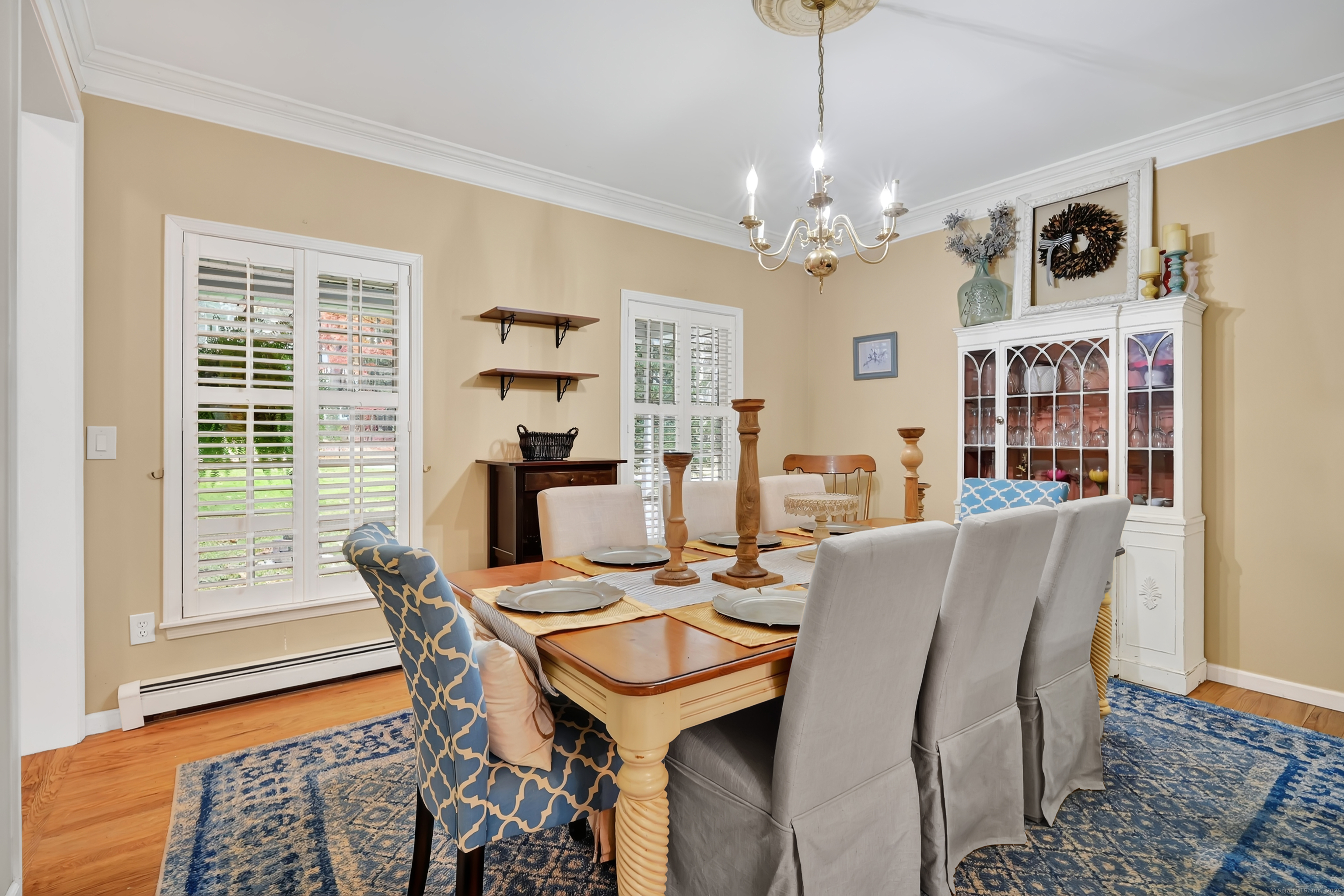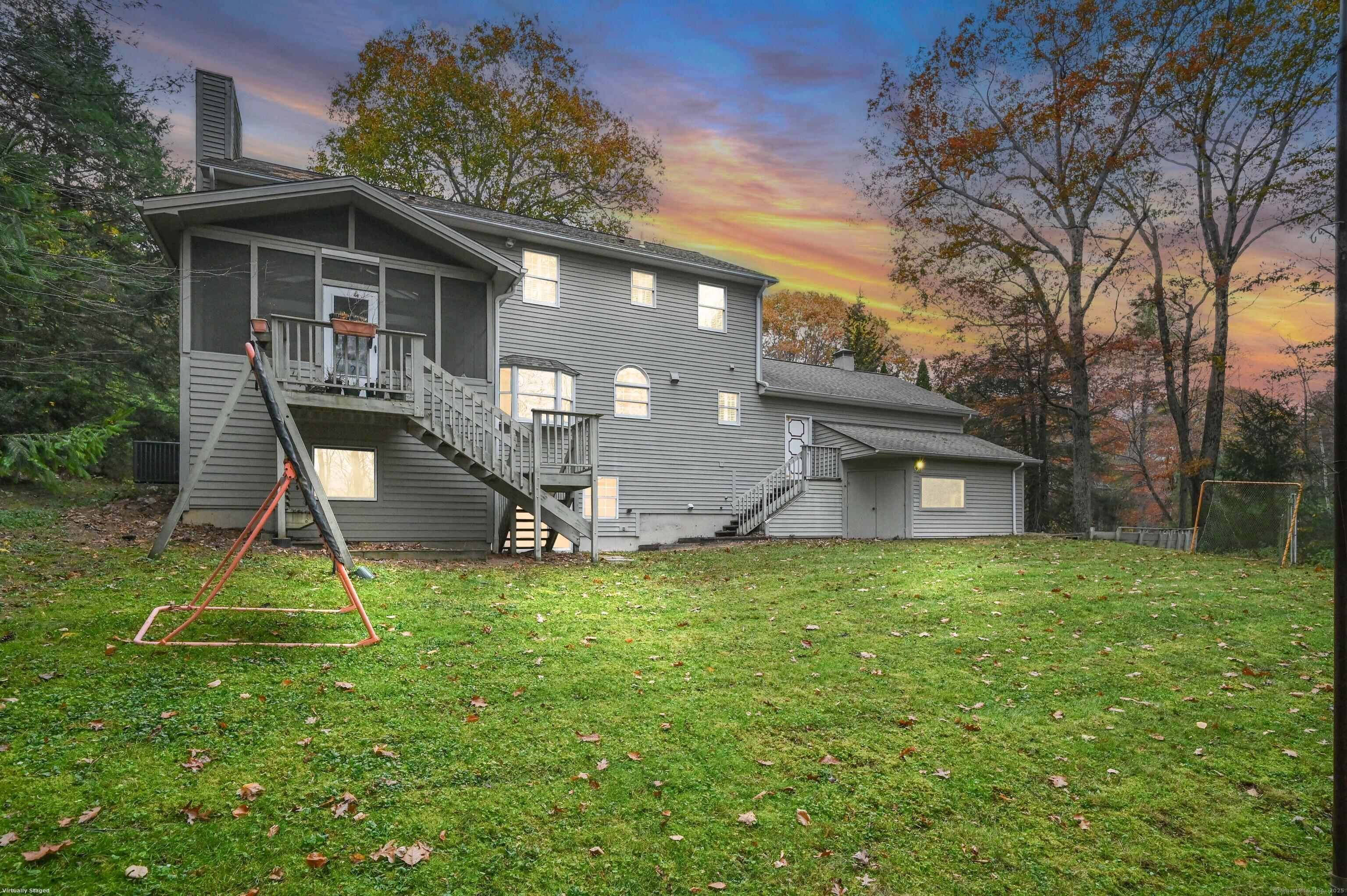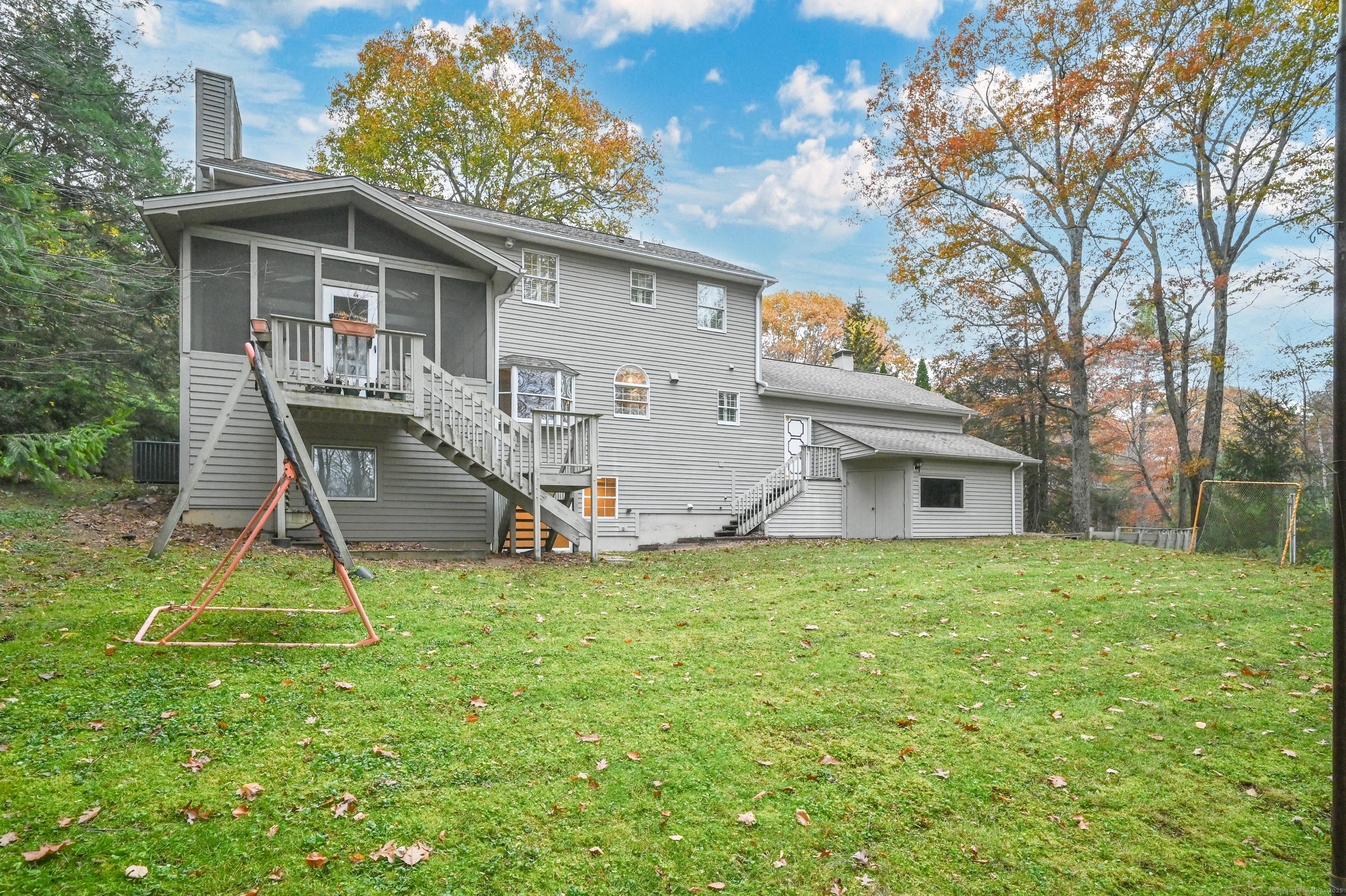 FALL in love with 9 Greenwoods, a charming 4 bedroom colonial in the bucolic town of North Granby, CT! Situated on 2.7 private acres in a sought-after cul-de-sac of upscale homes, this country retreat offers tranquility & convenience. As you approach, you'll immediately notice the inviting front porch & cozy patio w/ a fire pit, perfect for relaxing & entertaining guests. Step inside to be greeted by a sun-filled two-story foyer with an elegant staircase and abundant windows. The spacious formal living room features thick crown molding & a bay window, ideal for quiet moments or enjoying music. The formal dining room has ample space for a buffet & hutch. The generous sized country kitchen features tall grey wooden cabinetry, a butcher block island, desk, arched window & it opens to an eat-in area & family room. The family room boasts a wood-burning fireplace, a coffered wood ceiling & French doors leading to a serene screened porch. A mudroom off the kitchen leads to the powder room, laundry & two-car garage, w/ an additional 3rd bay at the rear. The primary bedroom has 2 walk-in closets! The large walk-out lower level offers a 5th bed/office, 3rd full bath, recreation & gym space. Nearly every room in this home has plantation shutters, smooth ceilings & new carpet. Enjoy nearby Lost Acres Vineyard, Enders Falls, McLean Game Refuge, Old Mill Pond Village Shops & restaurants in downtown Granby. Convenient to Bradley International Airport. Make it your home for the 2025 holidays