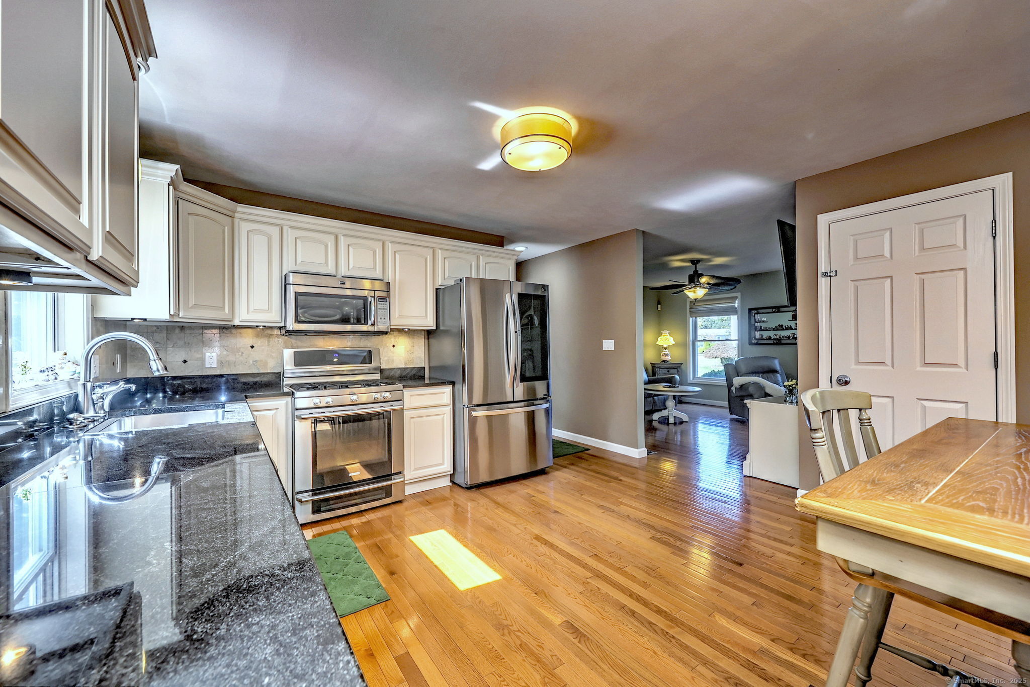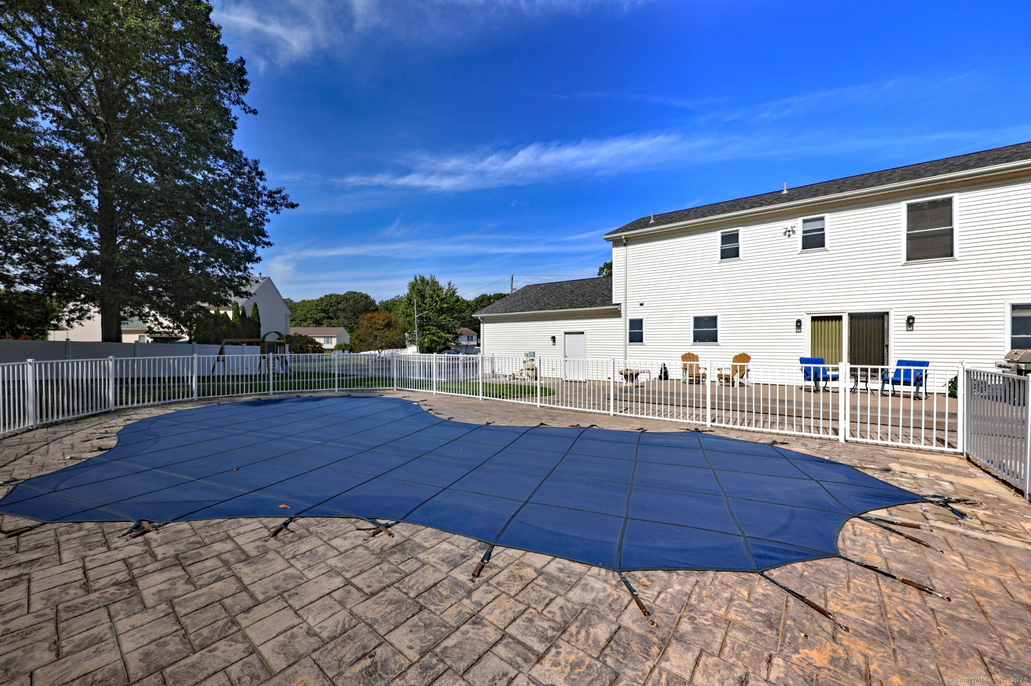 Impressive and beautifully maintained, this 3 bedroom, 2 1/2 bath Colonial is set on a level lot in West Ridge Estates. The spacious eat-in kitchen offers plenty of cabinetry and counter space, with a slider that opens to a patio overlooking the manicured yard and inviting in-ground pool. A half wall with a granite counter creates a stylish separation to the dining room, while the living room with its beautiful fireplace, provides the perfect space for relaxing or entertaining. A den and half bath complete the main floor. Upstairs, the primary bedroom features a vaulted ceiling, walk-in closet, and a newly remodeled full bath. There are two additional generously sized bedrooms and a second remodeled bath. Some of this homes' other features include gleaming hardwood floors, an impressive two-story foyer, stainless steel appliances, furnace and central air (2019), tankless hot water heater (2020), a new roof on both the house and shed (April 2024) newer garage doors and openers, and a fenced in back yard with an additional fence around the pool. The pool filter, liner and cover have also been replaced. West Ridge Estates is a 22-home subdivision consisting of three cul-de-sacs, offering a true neighborhood feel. Enjoy East Haven's beach, restaurants, and town green home to concerts, festivals, a farmer's market and much more. This home is also an easy commute to New Haven's schools, hospitals, colleges, train station, Coast Guard, Tweed Airport, and shoreline communities.