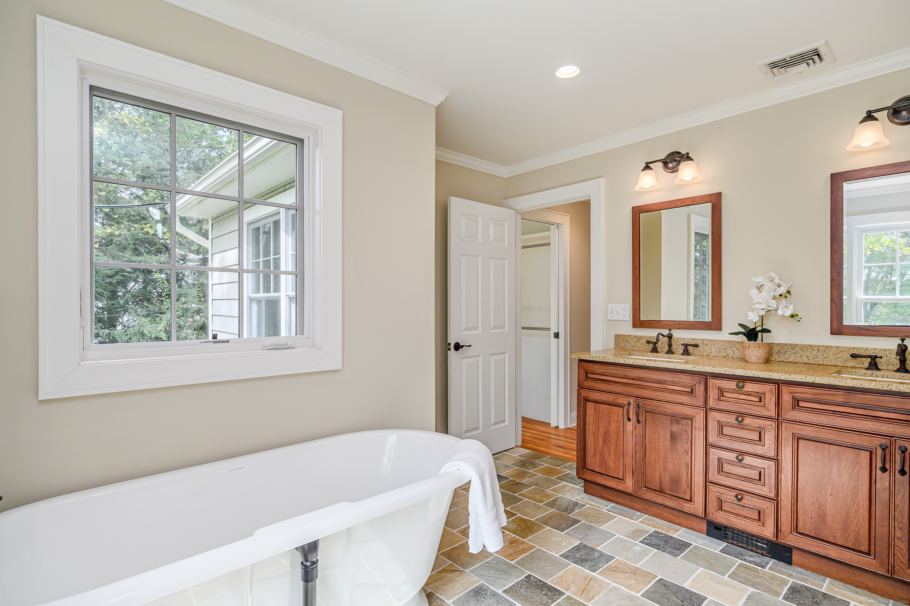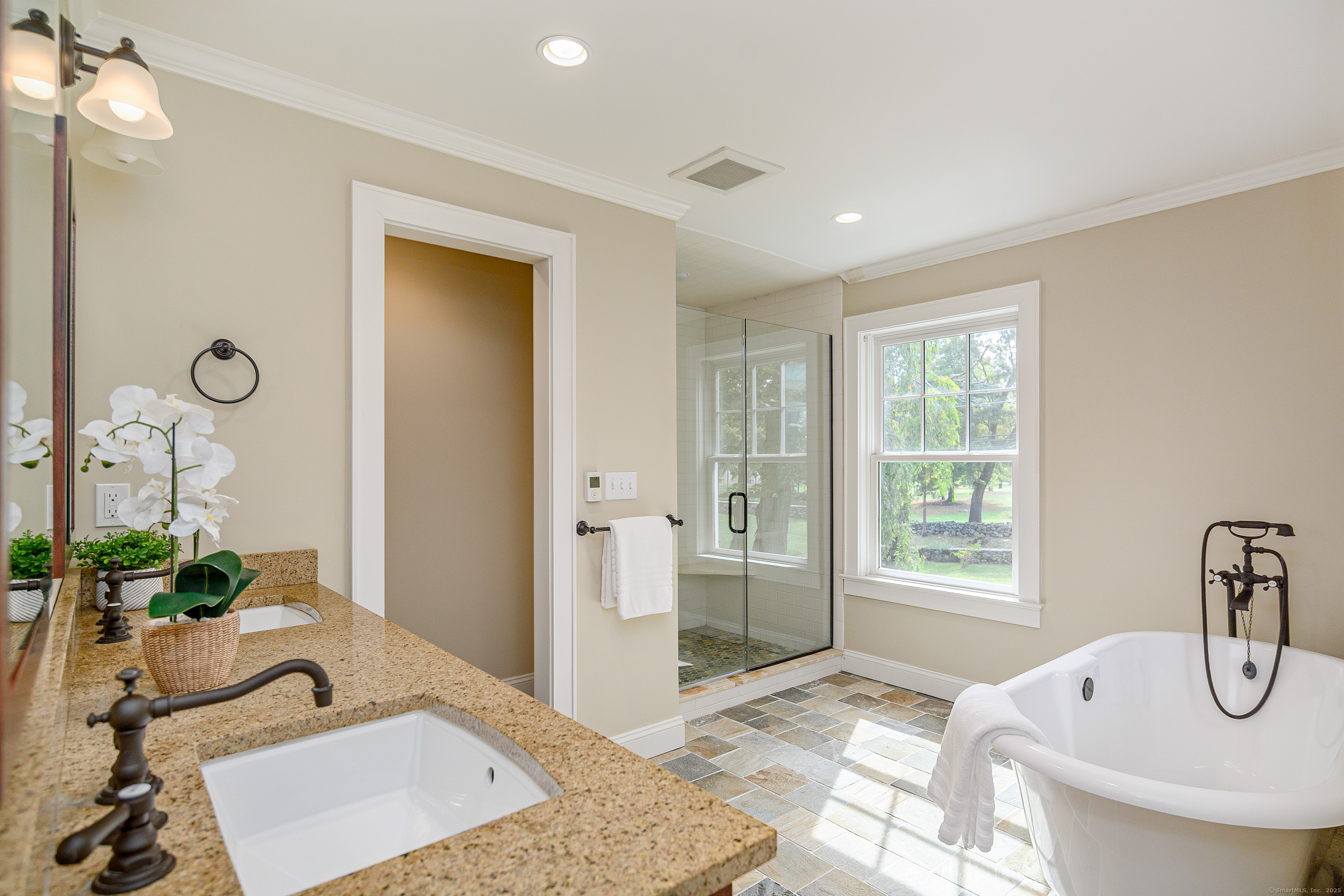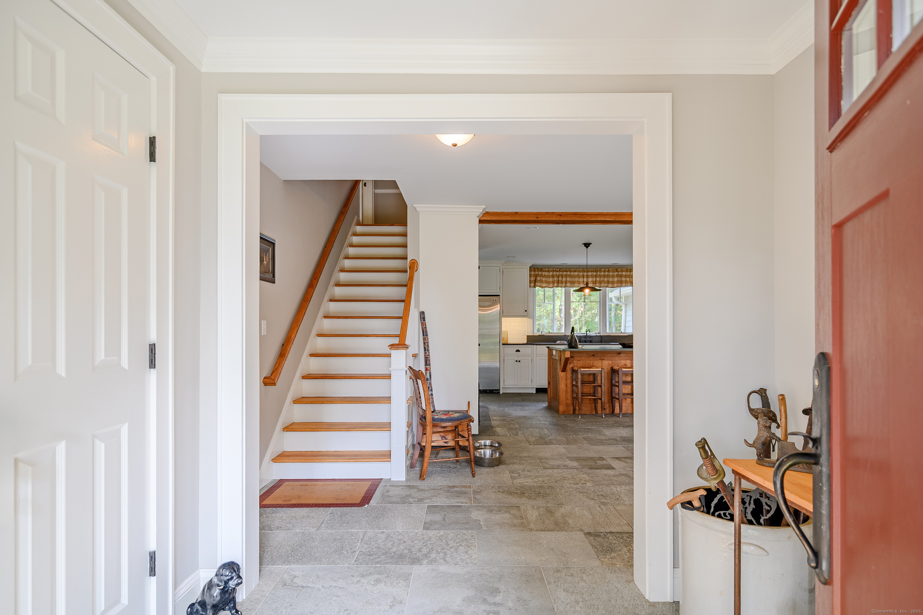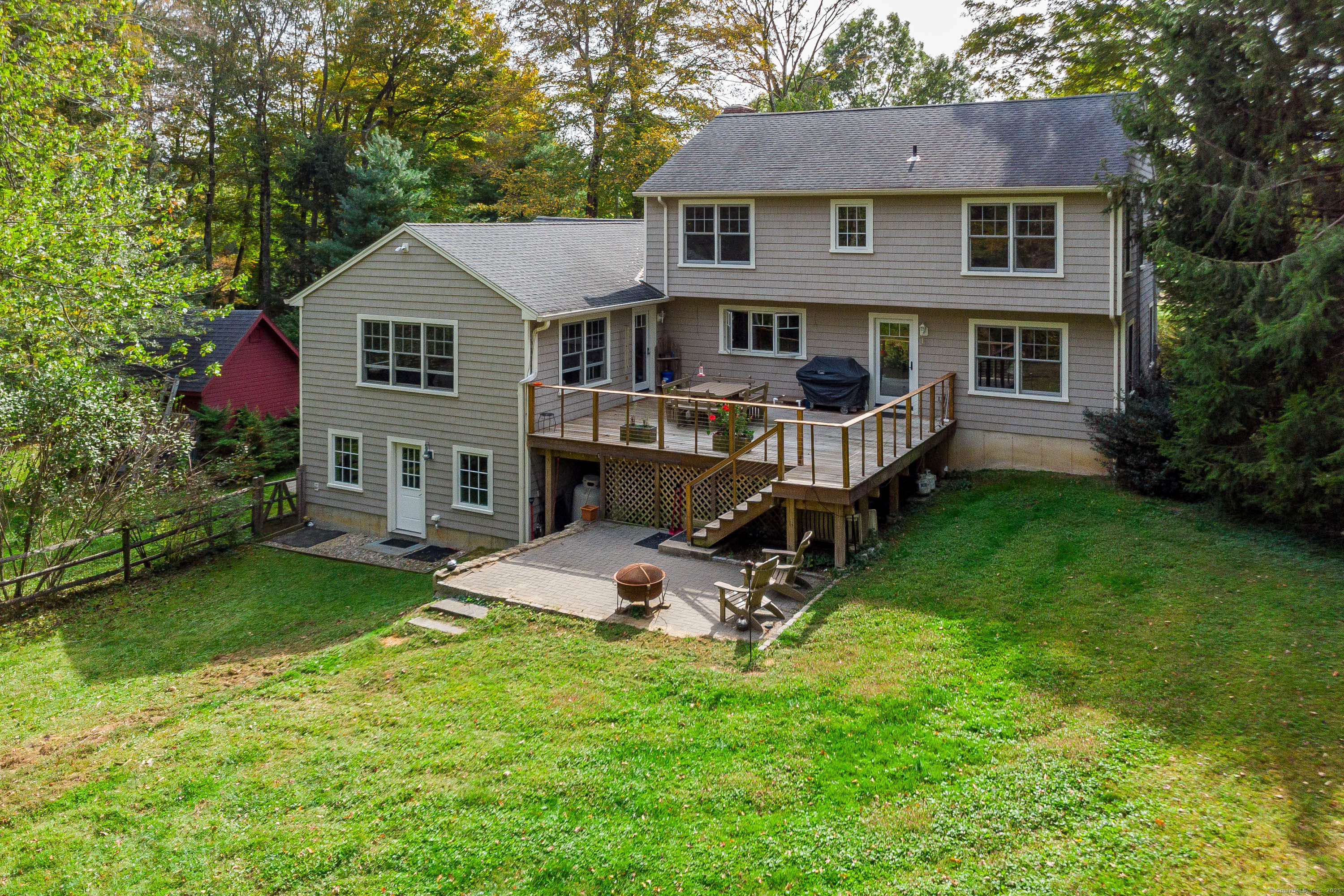 Welcome to 16 Rock Ridge, a home that blends timeless craftsmanship with today's luxury lifestyle. Perfectly positioned across from Rock Ridge Country Club, in the southwest corner of Newtown. This residence is bathed in natural light and was fully reconstructed in 2013 new electrical, plumbing, roof, siding, windows, flooring, baths, kitchen, plus the addition of a main-level primary suite. At the heart of the home is a chef's kitchen featuring natural wood beams, honed quartz countertops, a farmhouse sink, six-burner gas range, GE Profile refrigerator, and ceiling-height cabinetry. Crown molding and fine details run throughout. The sun-drenched great room invites gathering with its dramatic floor-to-ceiling stone gas fireplace, convertible back to wood-burning if desired. With two primary suites (one main level), and four bedrooms total, this home offers flexibility for multi-generational living or guests. The radiant-heated lower level includes a custom mudroom and a large bonus room, currently for dog grooming, easily adaptable to your needs. Step outside to a wood deck, fully rebuilt in 2020 with stylish cabling, overlooking a level 2.7-acre lot framed by classic stone walls. Plenty of room for a pool, gardens, or play. This is more than a move-in ready home it's an elegant lifestyle opportunity in one of Newtown's most desirable locations. The sale is subject to the owner finding suitable housing.