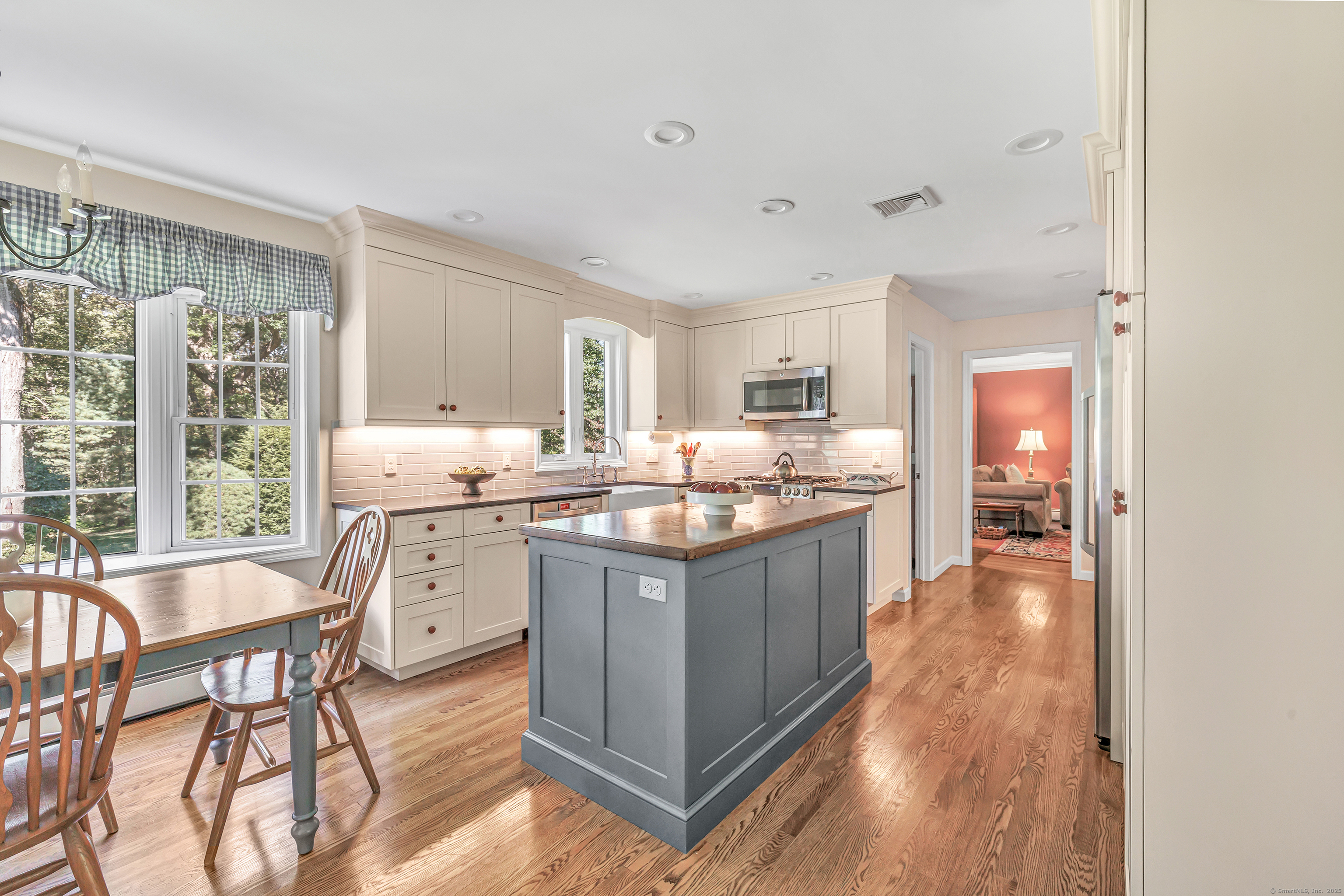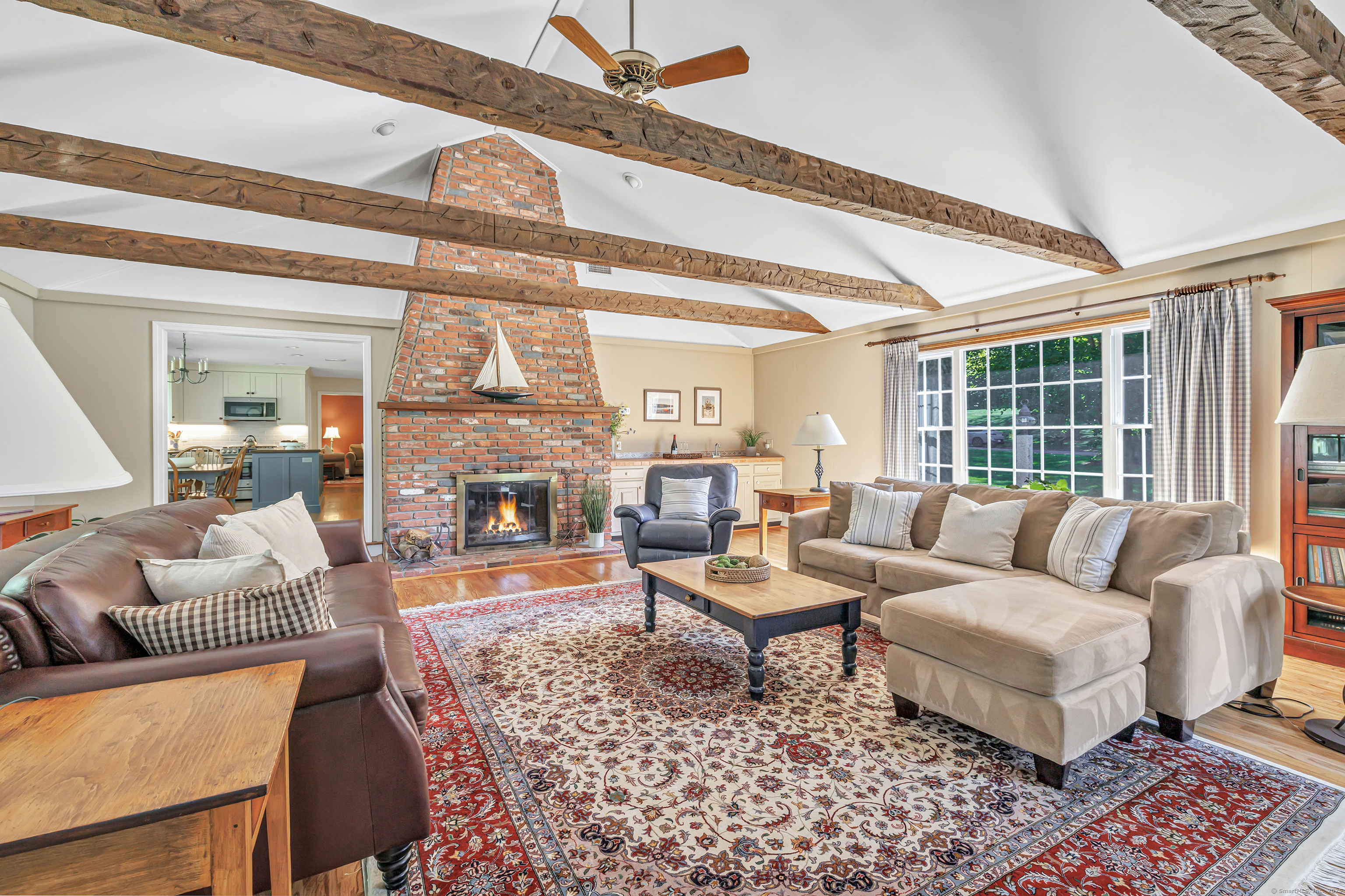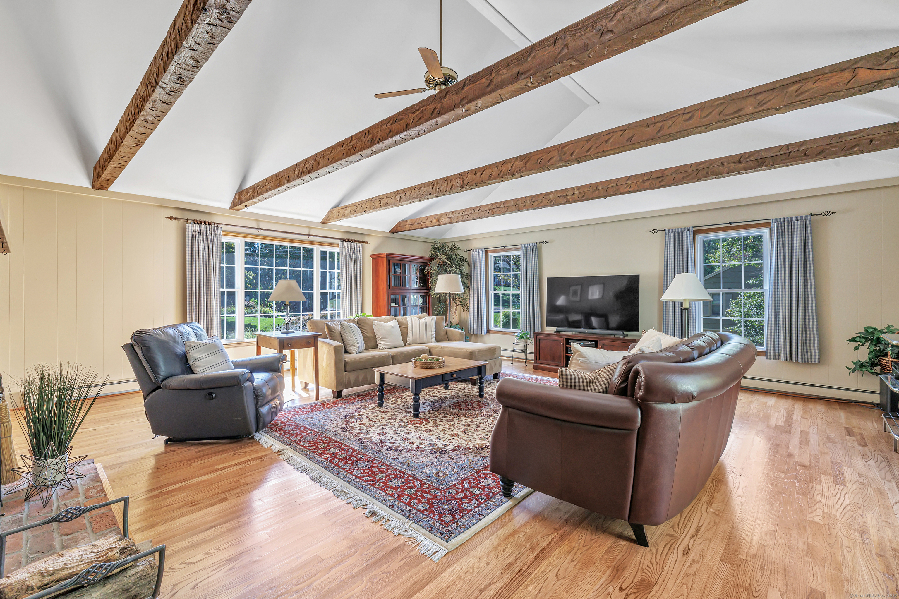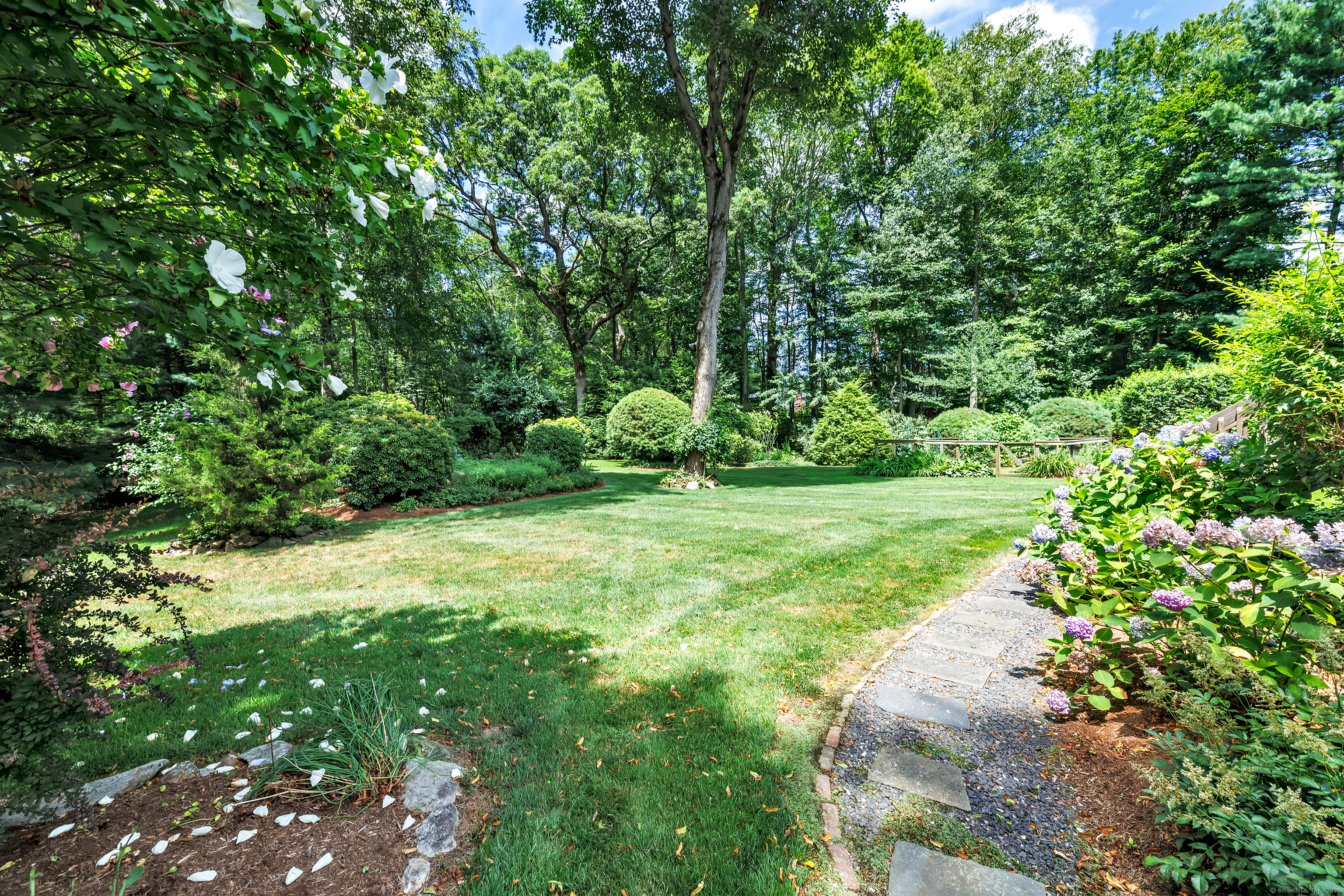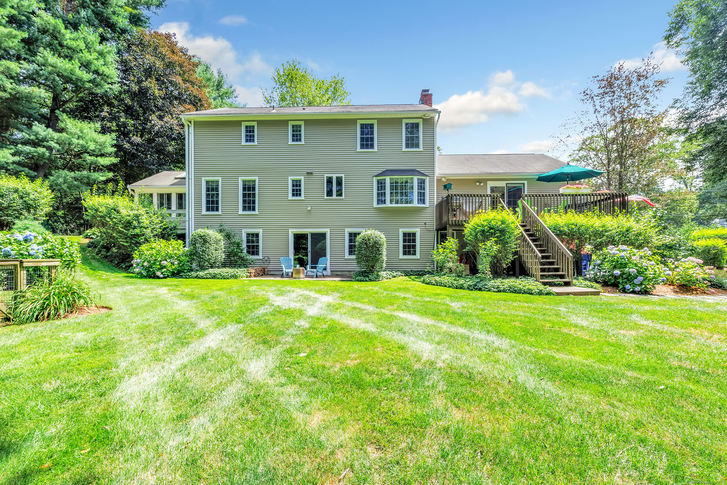 Welcome to 23 Finchwood Drive, nestled in the highly sought-after Nichols neighborhood! This gorgeous colonial blends timeless charm with modern updates, featuring hardwood floors, French doors, and abundant character throughout. The inviting foyer opens to a spacious front-to-back living room with French doors leading to a charming sun porch-perfect for peaceful evenings or family dinners. The sun porch opens to a second deck, creating a seamless indoor-outdoor flow. The custom, updated kitchen is an entertainer's dream with granite counters, a reclaimed wood-top island, gas stove, farmhouse sink, wet bar, and pantry. Adjacent are the formal dining room, half bath, and a magnificent family room with vaulted ceilings, exposed wood beams, a floor-to-ceiling brick wood-burning fireplace, a second wet bar, and french doors leading to the main deck and backyard. Upstairs, the primary suite offers hardwood floors (under carpeting), a walk-in closet, and full bath with double vanity and shower. Three additional bedrooms share an updated hall bath. The walk-out lower level adds great bonus space-perfect for a rec room, gym or playroom-along with a large laundry area, mudroom and extra storage. Set on a beautifully landscaped level one-acre lot, the property features park-like grounds with a granite walkway, shed, and fenced garden. Located near the Nichols Improvement Association, Merritt Parkway, Route 8, shopping, and dining. A must-see home!
