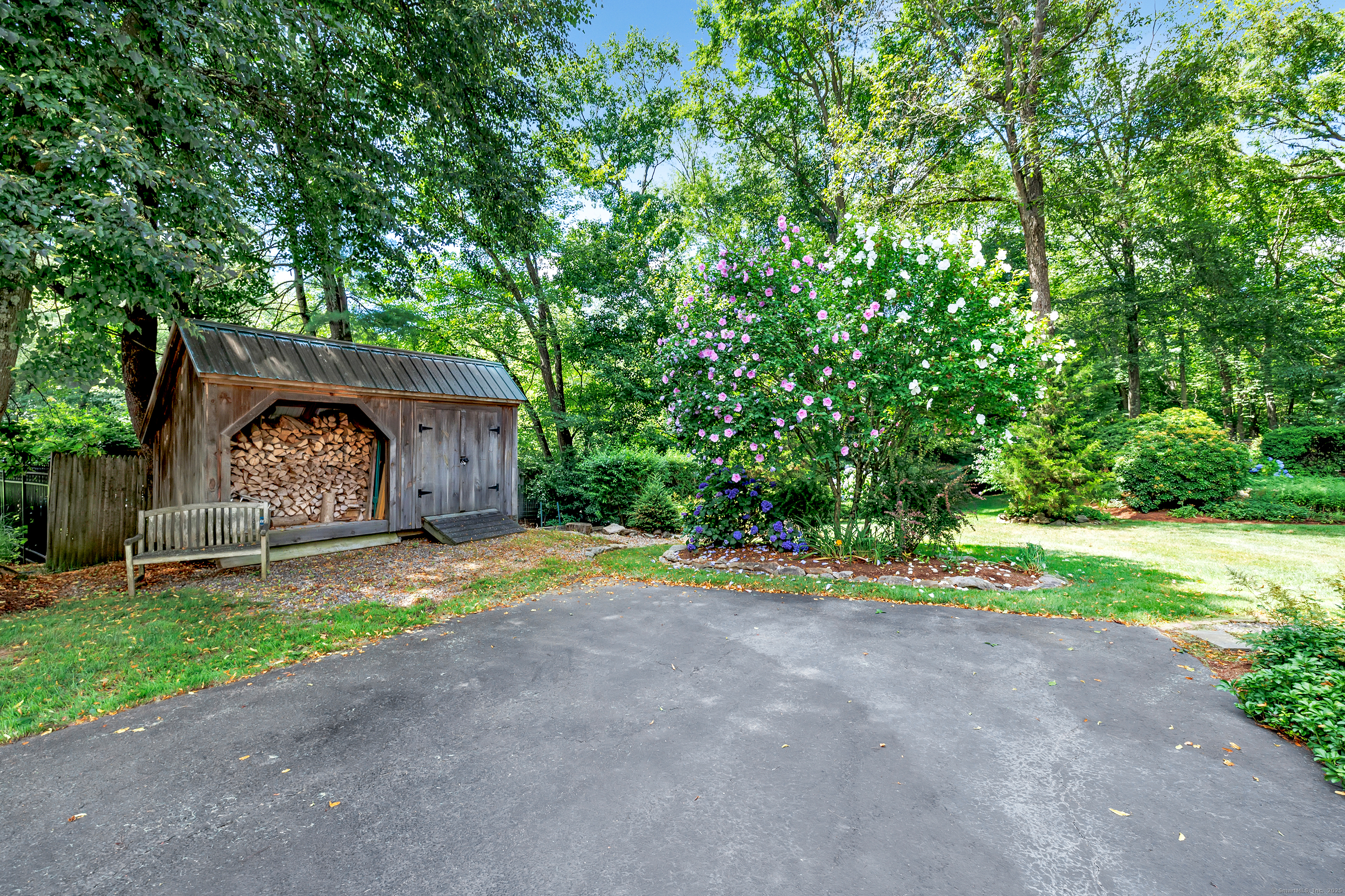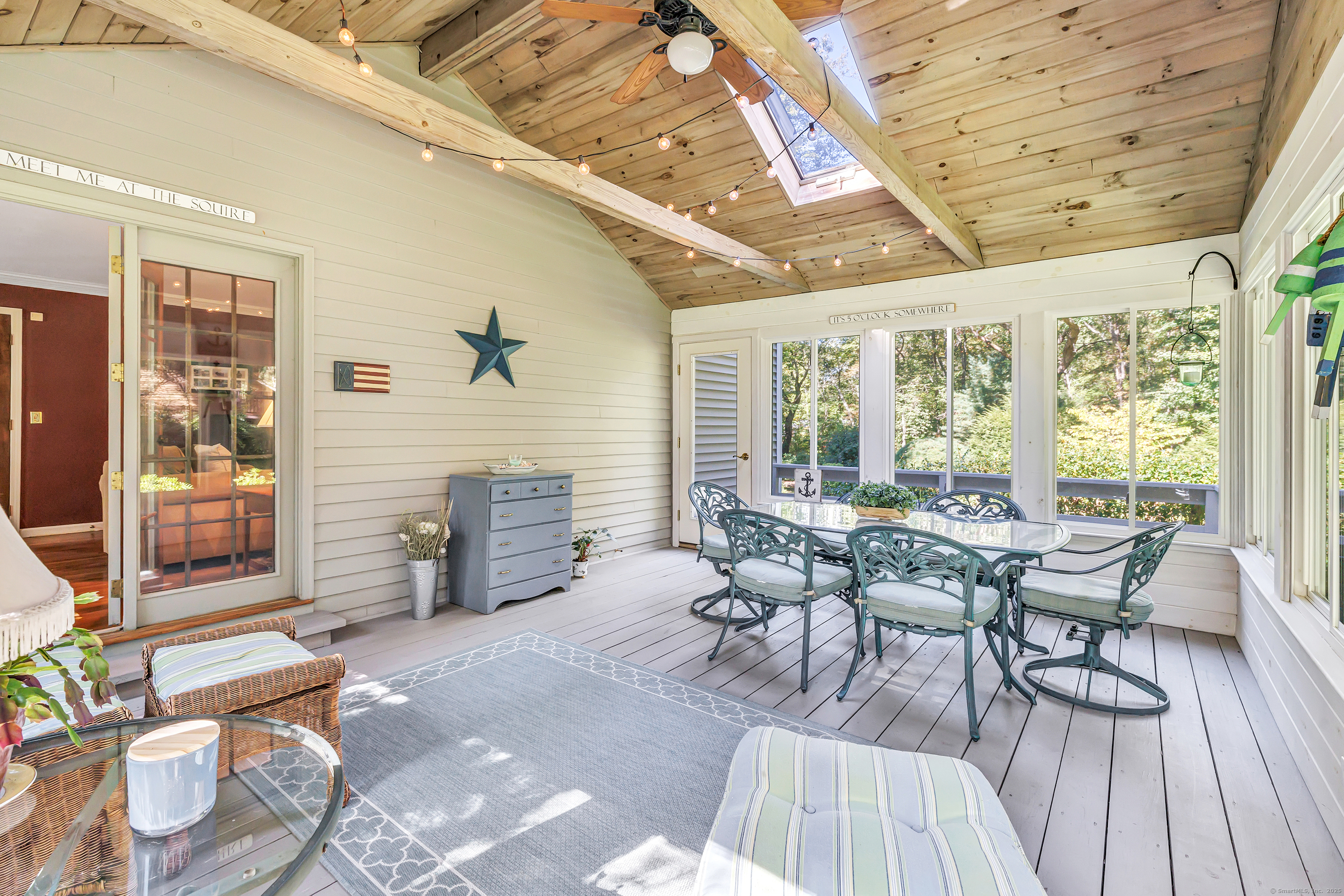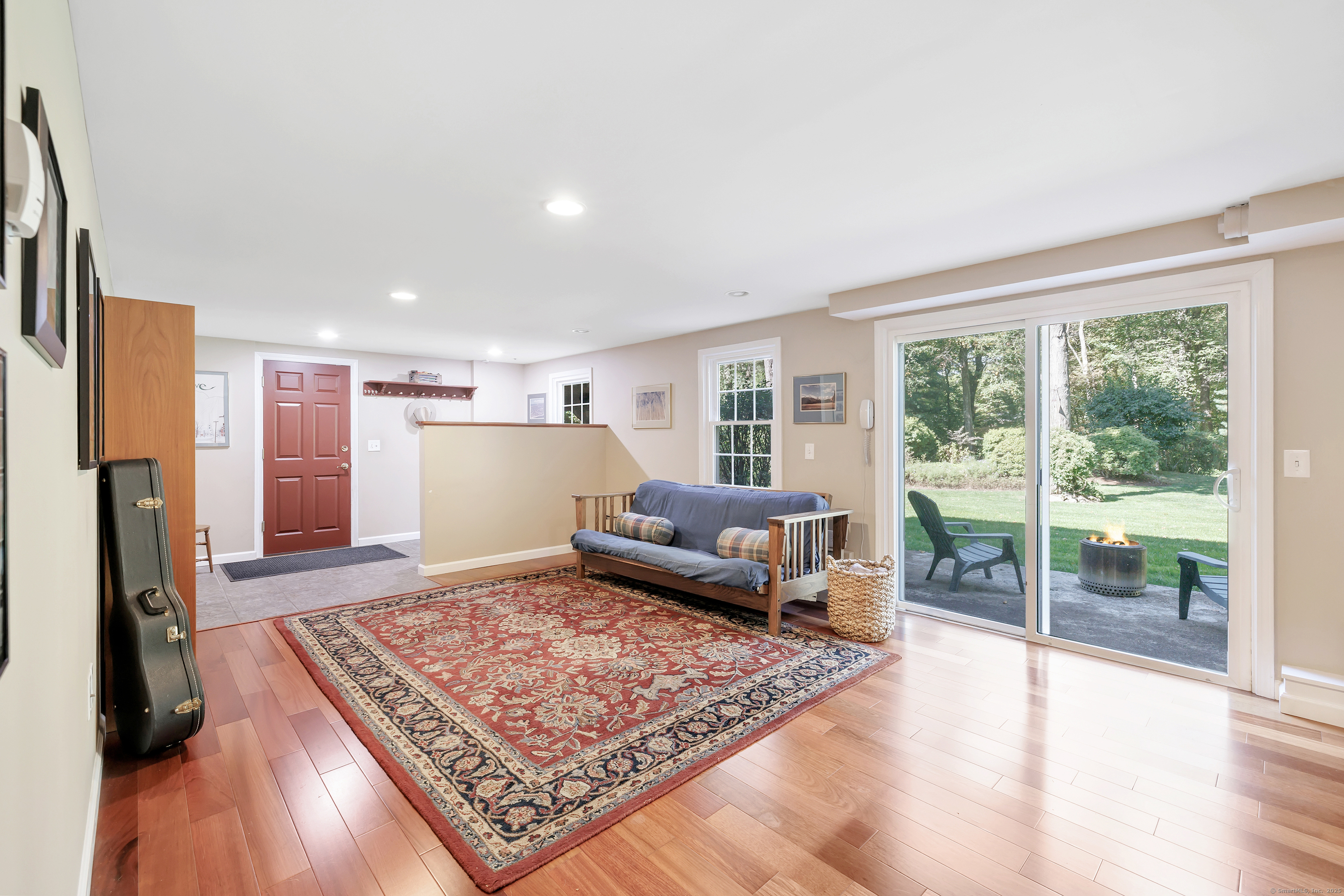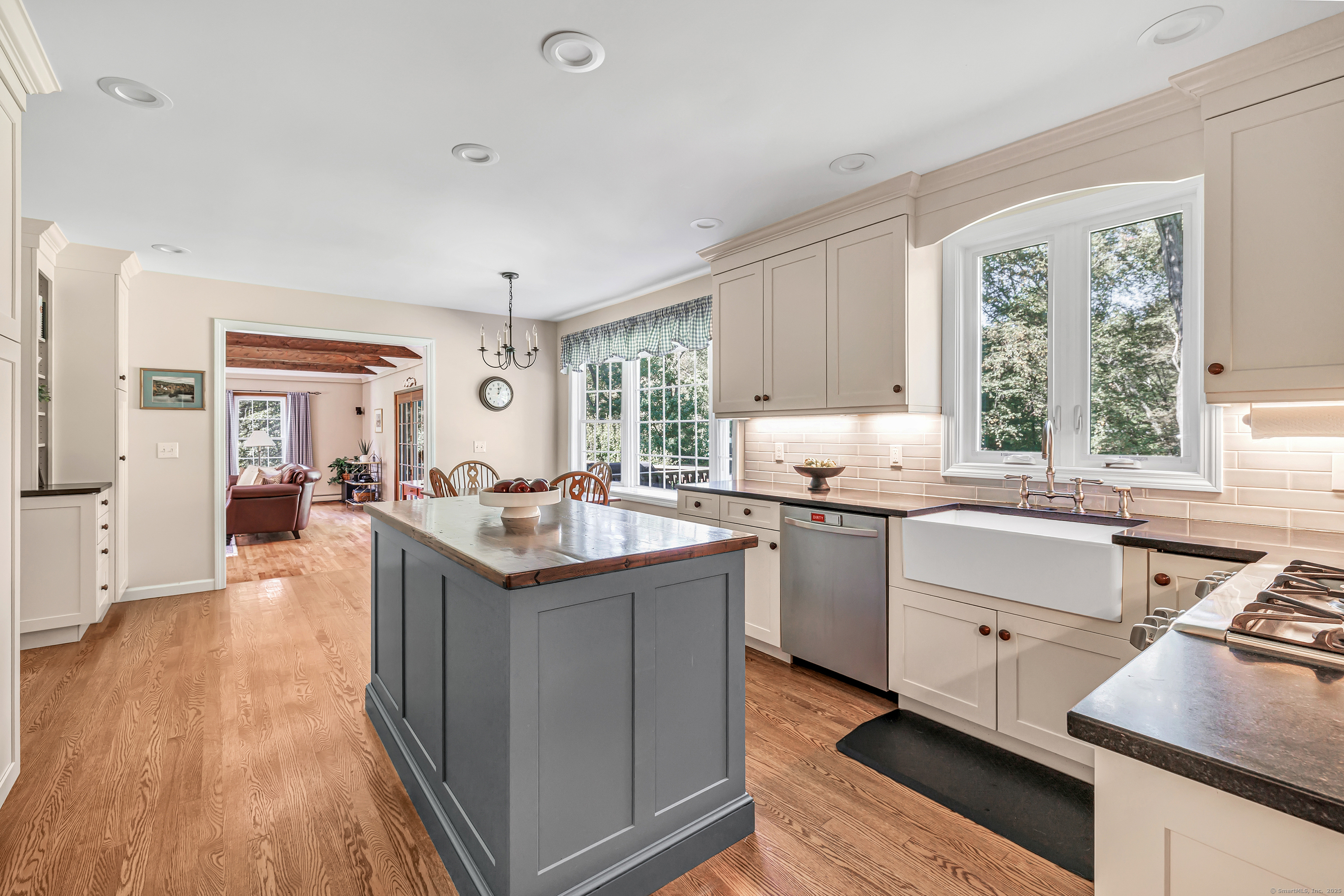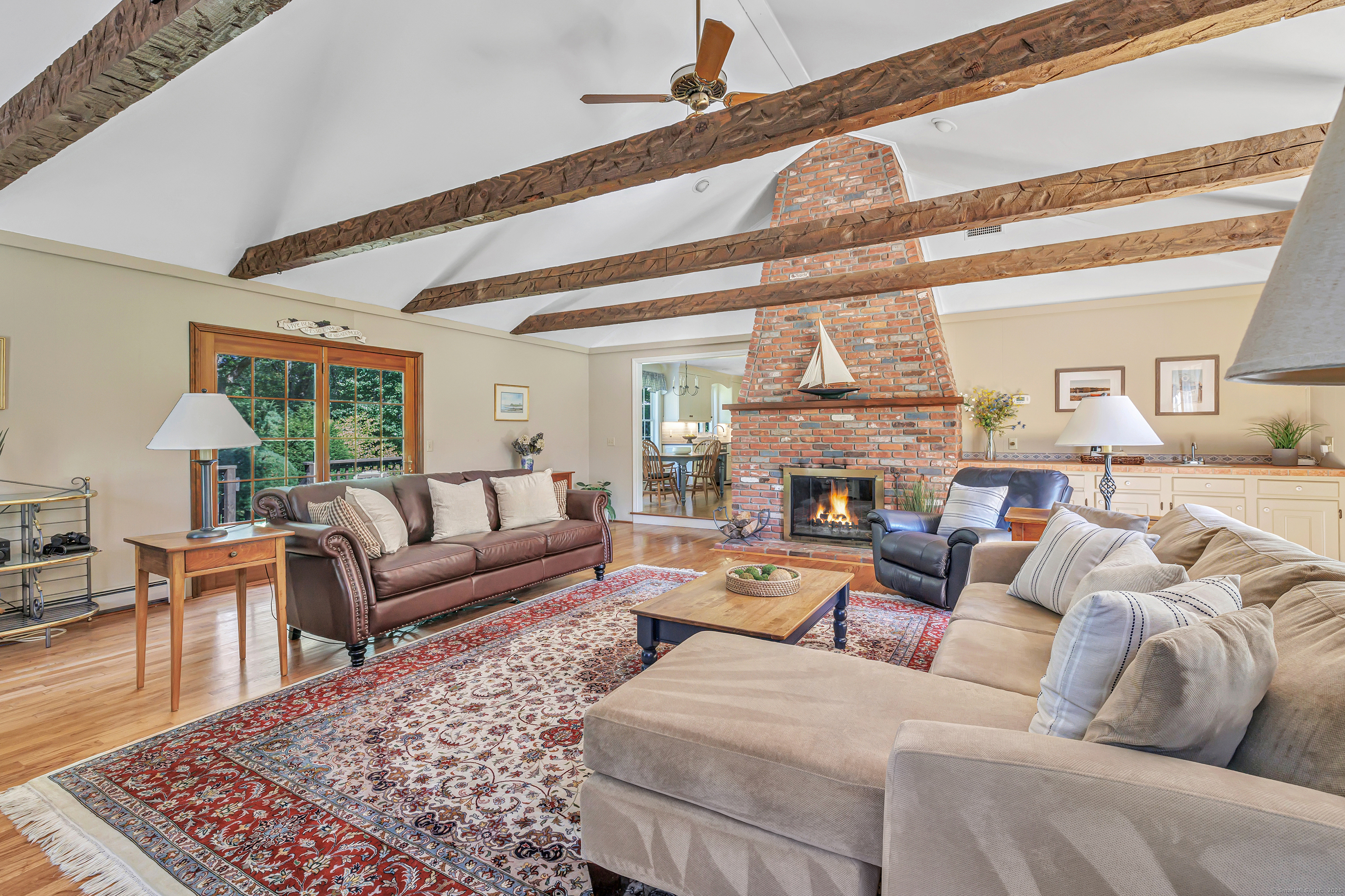 Welcome to 23 Finchwood Drive, nestled in the highly sought-after Nichols neighborhood! This gorgeous colonial blends timeless charm with modern updates, featuring hardwood floors, French doors, and abundant character throughout. The inviting foyer opens to a spacious front-to-back living room with French doors leading to a charming sun porch-perfect for peaceful evenings or family dinners. The sun porch opens to a second deck, creating a seamless indoor-outdoor flow. The custom, updated kitchen is an entertainer's dream with granite counters, a reclaimed wood-top island, gas stove, farmhouse sink, wet bar, and pantry. Adjacent are the formal dining room, half bath, and a magnificent family room with vaulted ceilings, exposed wood beams, a floor-to-ceiling brick wood-burning fireplace, a second wet bar, and french doors leading to the main deck and backyard. Upstairs, the primary suite offers hardwood floors (under carpeting), a walk-in closet, and full bath with double vanity and shower. Three additional bedrooms share an updated hall bath. The walk-out lower level adds great bonus space-perfect for a rec room, gym or playroom-along with a large laundry area, mudroom and extra storage. Set on a beautifully landscaped level one-acre lot, the property features park-like grounds with a granite walkway, shed, and fenced garden. Located near the Nichols Improvement Association, Merritt Parkway, Route 8, shopping, and dining. A must-see home!