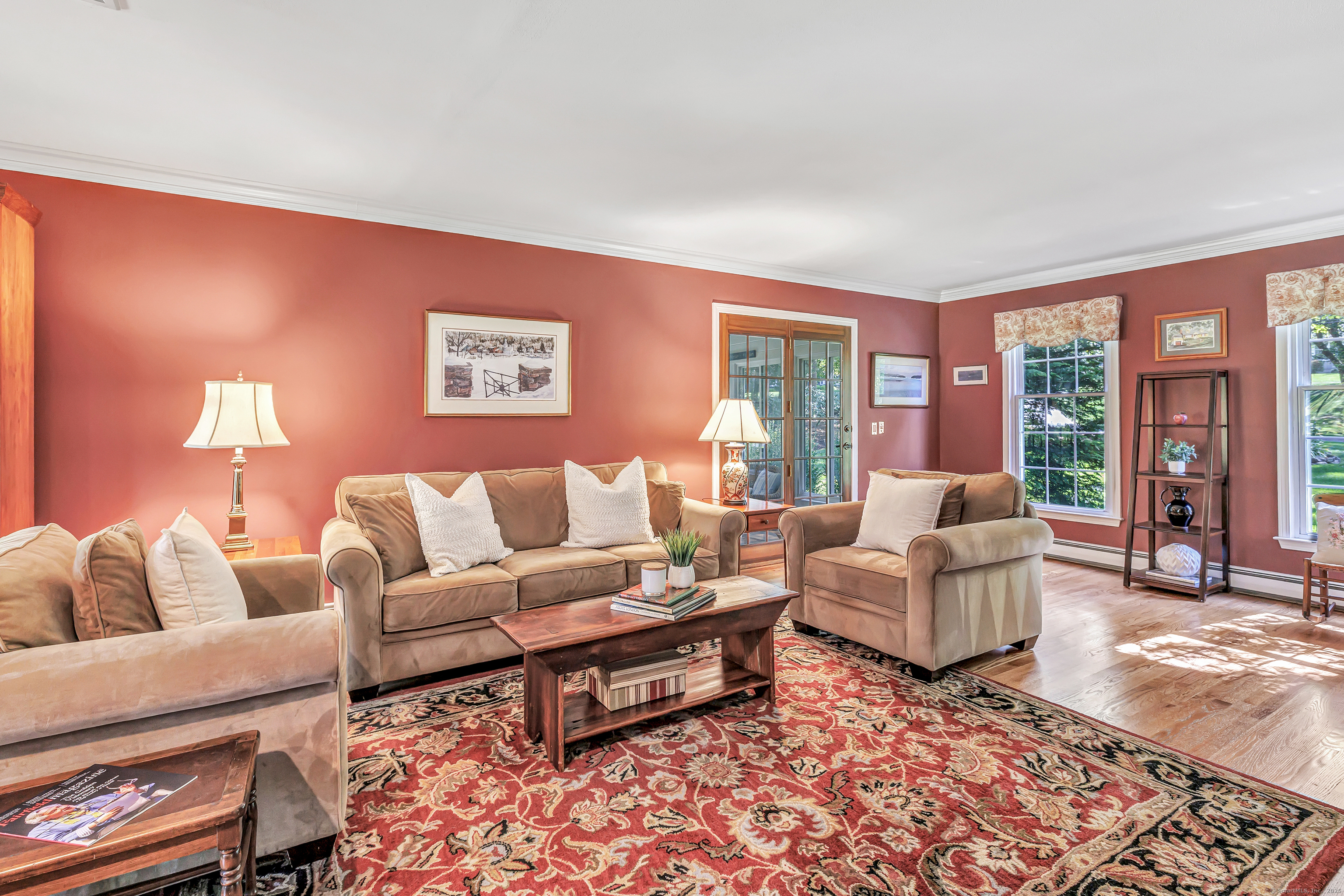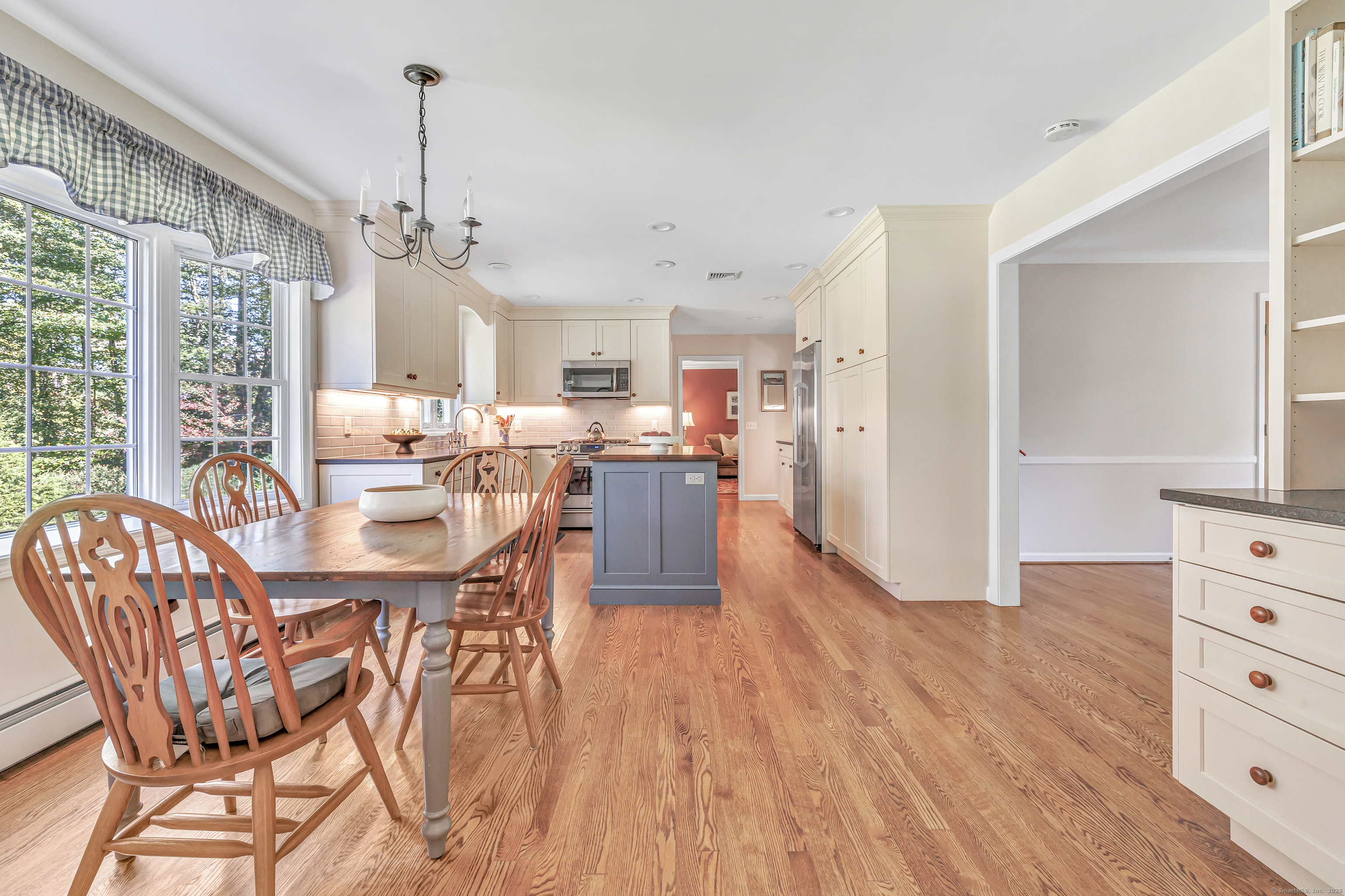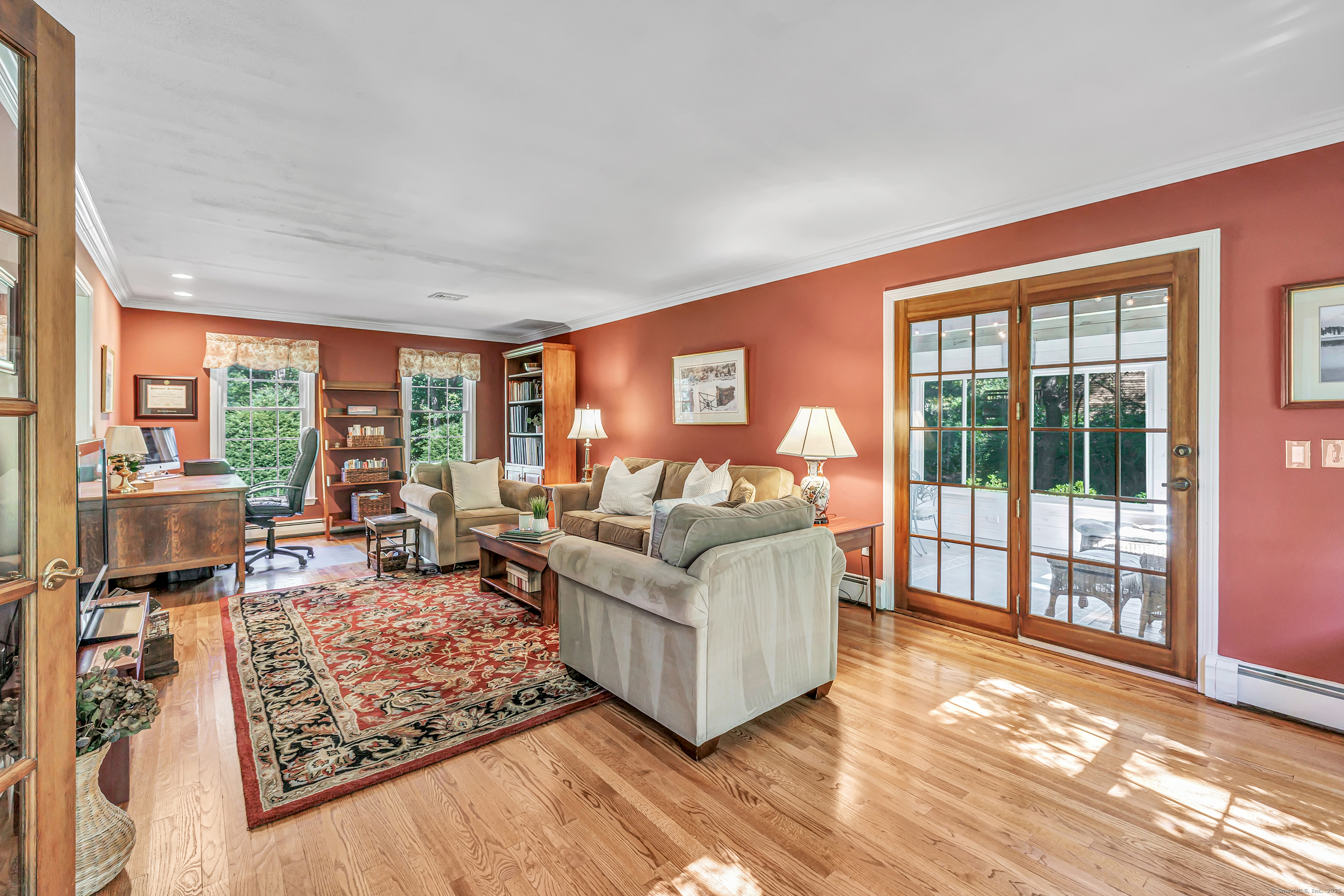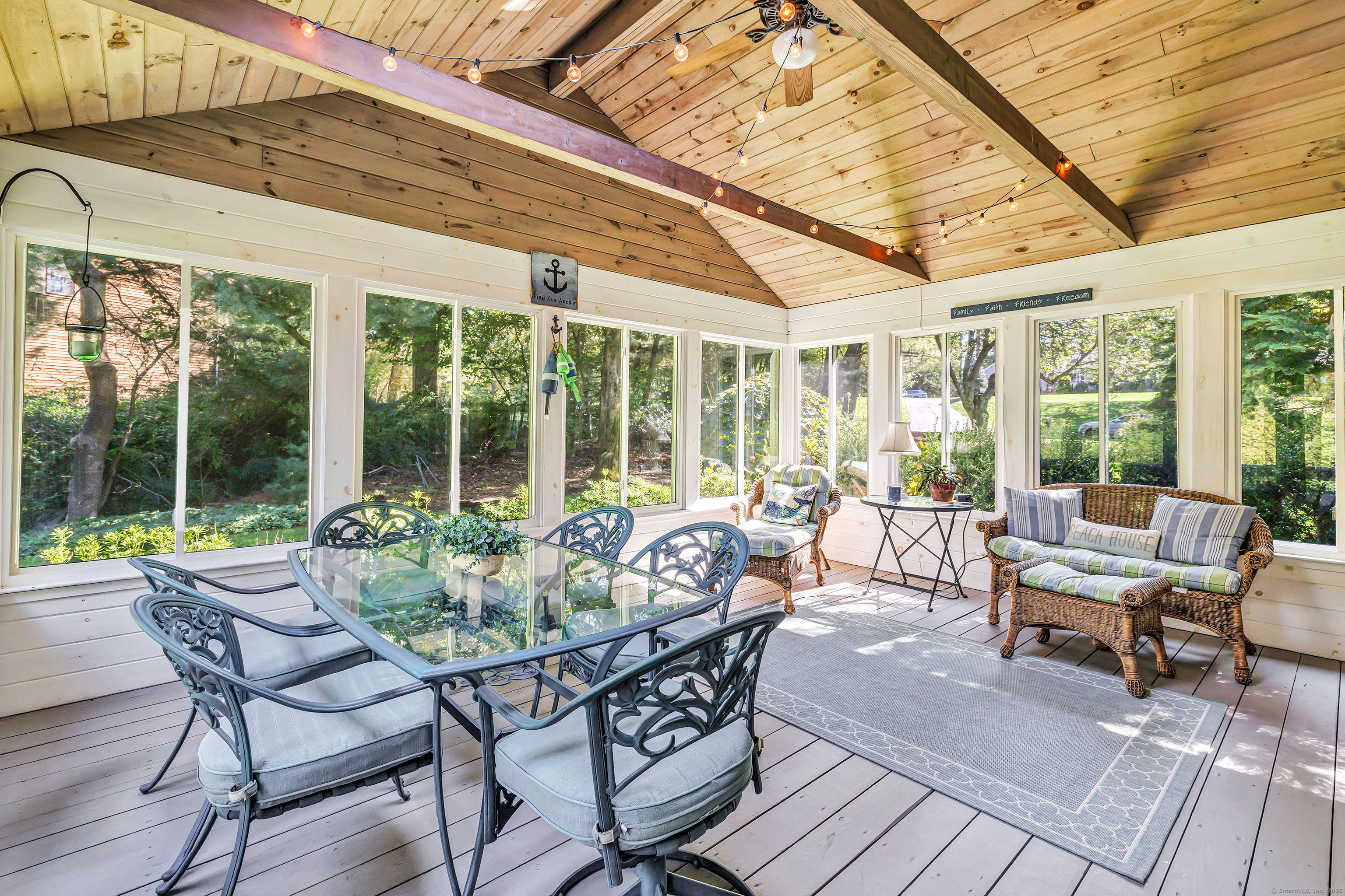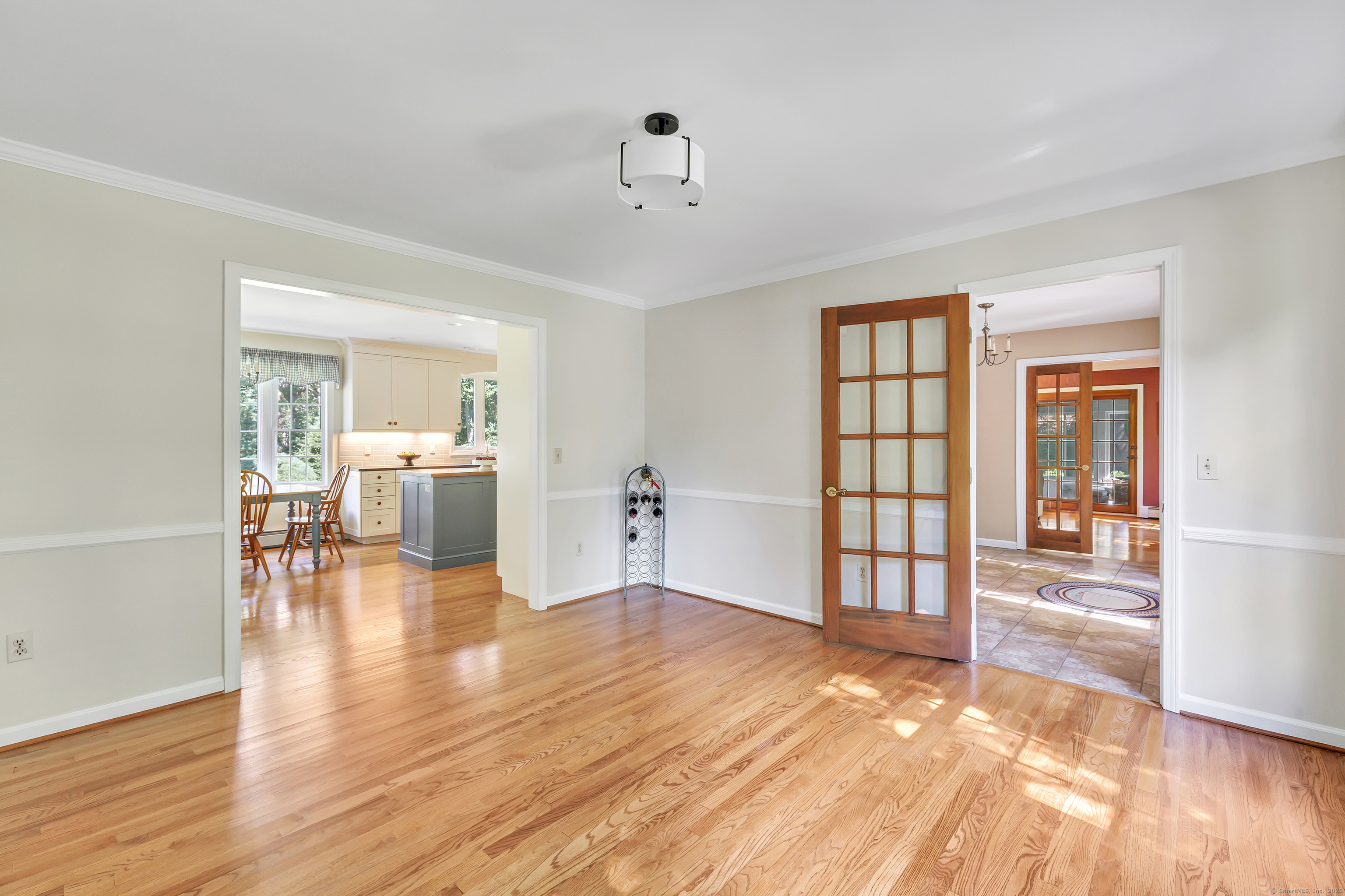 Welcome to 23 Finchwood Drive, nestled in the highly sought-after Nichols neighborhood! This gorgeous colonial blends timeless charm with modern updates, featuring hardwood floors, French doors, and abundant character throughout. The inviting foyer opens to a spacious front-to-back living room with French doors leading to a charming sun porch-perfect for peaceful evenings or family dinners. The sun porch opens to a second deck, creating a seamless indoor-outdoor flow. The custom, updated kitchen is an entertainer's dream with granite counters, a reclaimed wood-top island, gas stove, farmhouse sink, wet bar, and pantry. Adjacent are the formal dining room, half bath, and a magnificent family room with vaulted ceilings, exposed wood beams, a floor-to-ceiling brick wood-burning fireplace, a second wet bar, and french doors leading to the main deck and backyard. Upstairs, the primary suite offers hardwood floors (under carpeting), a walk-in closet, and full bath with double vanity and shower. Three additional bedrooms share an updated hall bath. The walk-out lower level adds great bonus space-perfect for a rec room, gym or playroom-along with a large laundry area, mudroom and extra storage. Set on a beautifully landscaped level one-acre lot, the property features park-like grounds with a granite walkway, shed, and fenced garden. Located near the Nichols Improvement Association, Merritt Parkway, Route 8, shopping, and dining. A must-see home!