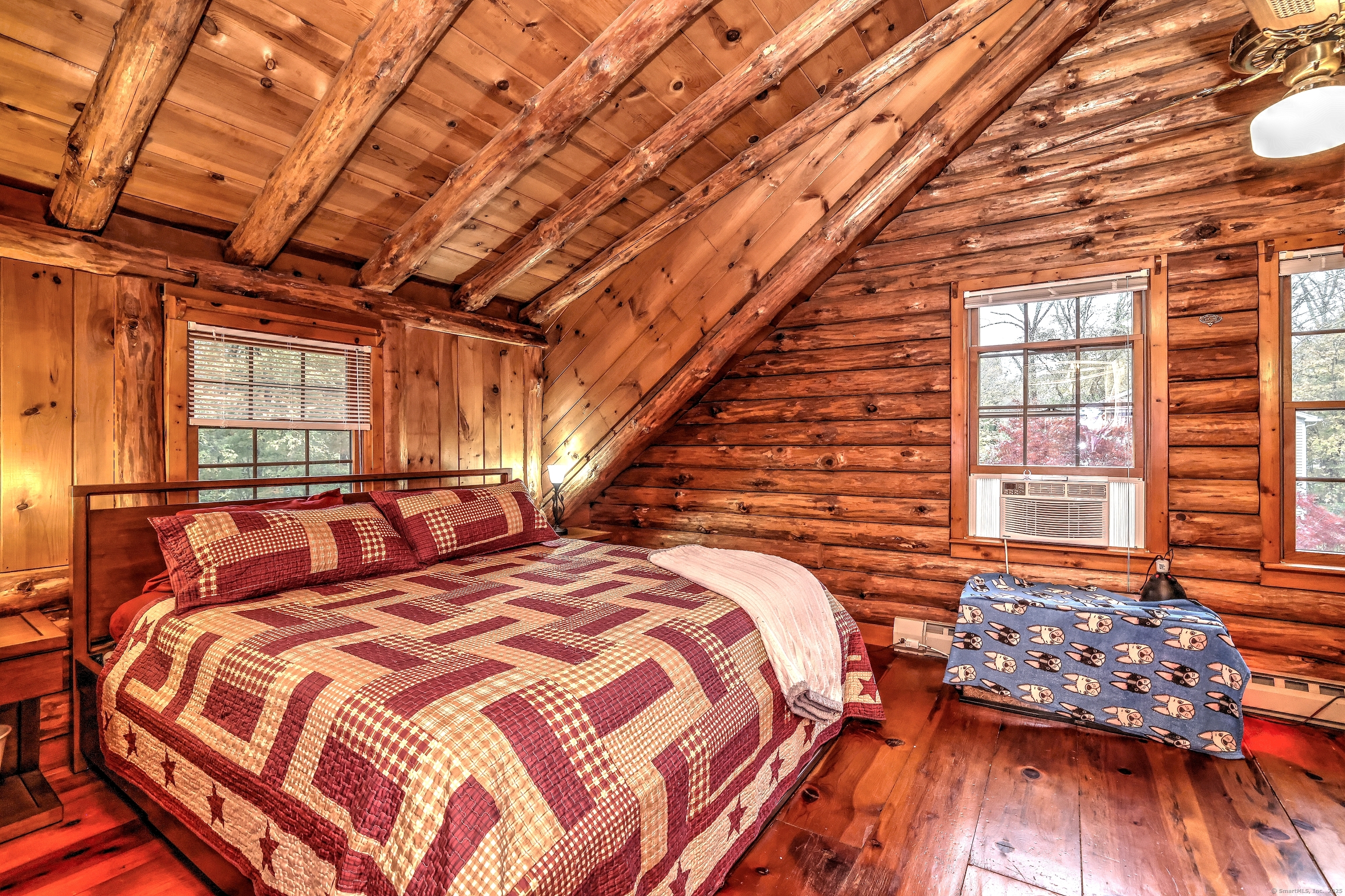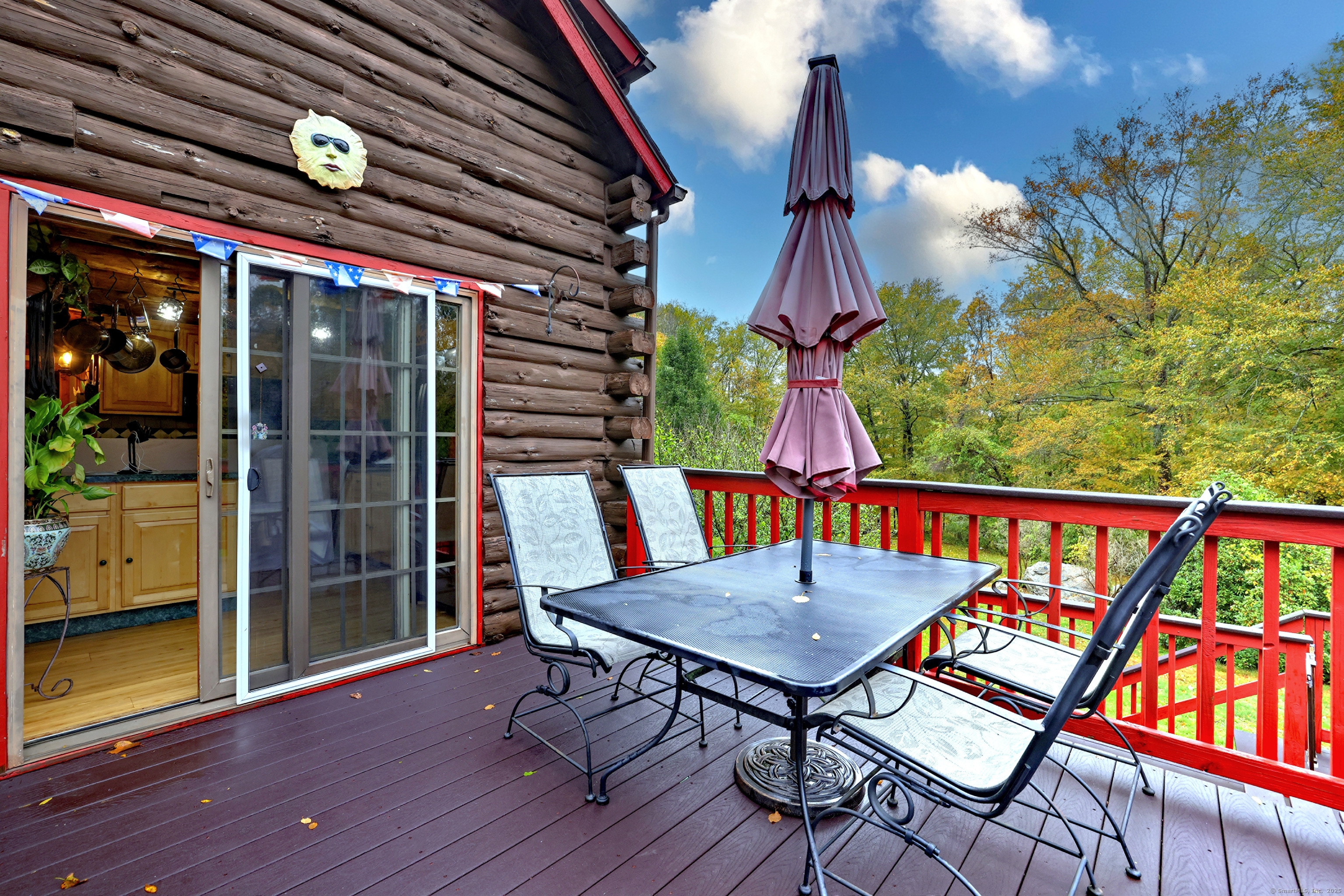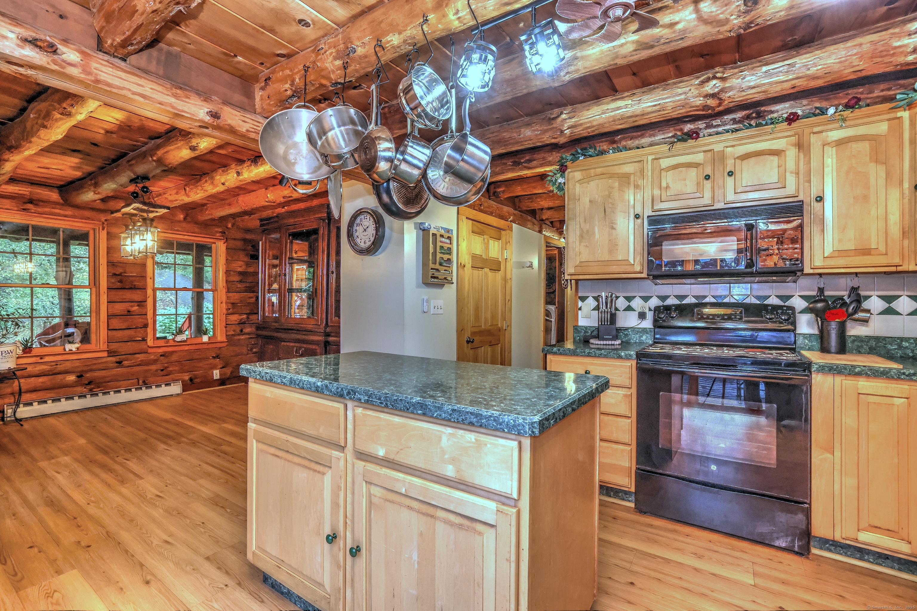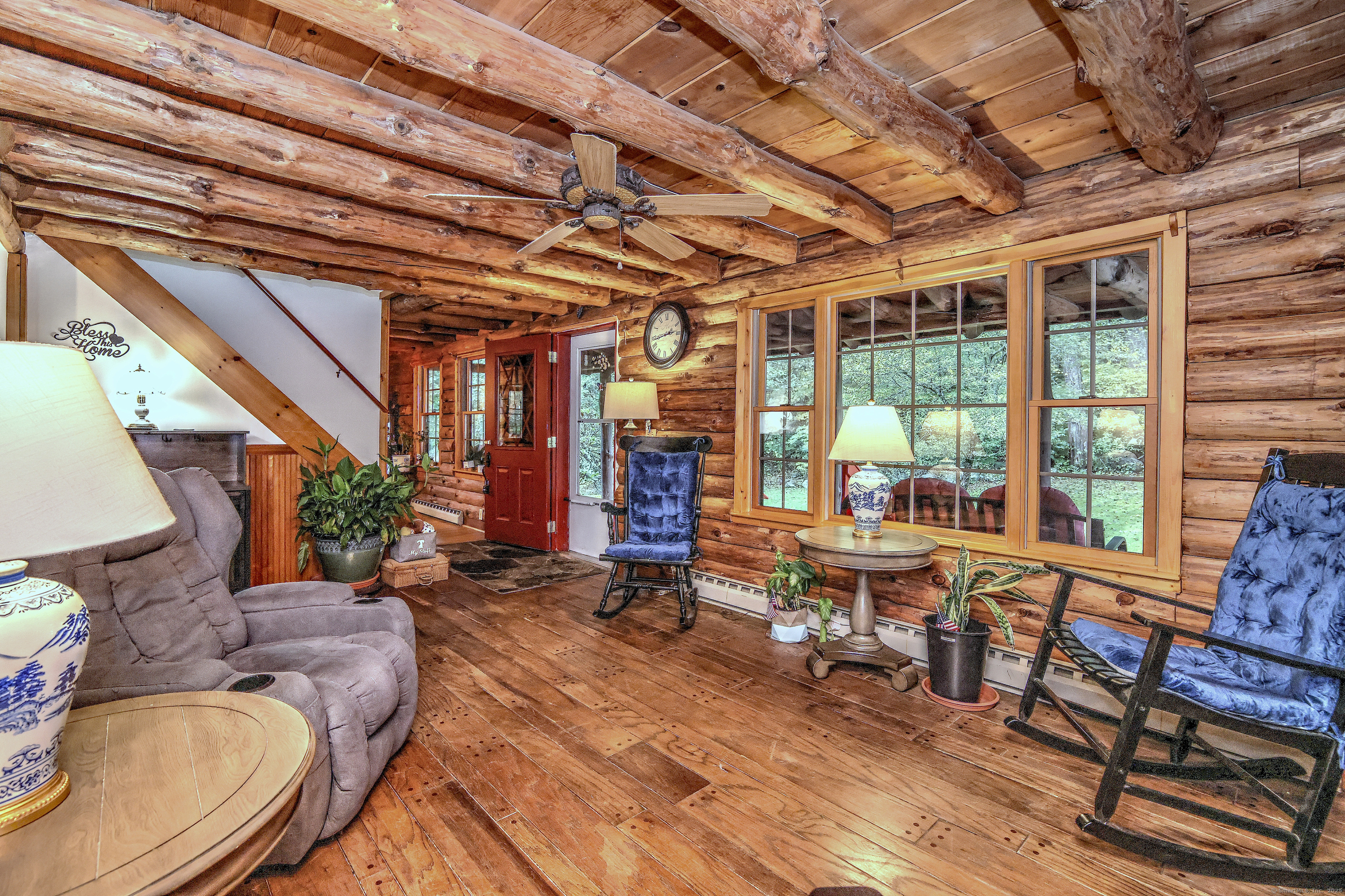 Set back from the road on over 2 acres, this handcrafted full-scribe log home offers peace, privacy, and the kind of warmth that only true country living can provide. Picture arriving home for the holidays, the porch strung with lights, and a fire crackling inside as snow drifts softly outside. At the heart of the home is a stunning stone fireplace, built with stones gathered from the property and topped with a hard rock maple mantel. For added comfort, two wood stoves, one in the rec room and another in the utility area, create a cozy atmosphere throughout the seasons. The home comes with six cords of seasoned wood, so you'll be ready this winter. The country kitchen, complete with a brand-new refrigerator and dishwasher, flows into a welcoming dining room and opens to a multi-level deck overlooking a landscaped backyard with flowering trees. A brook meanders through the 2.18-acre property, completing the retreat setting. A first-floor office or den with a closet offers flexibility to serve as a 4th bedroom if needed. The finished lower level provides a rec room with French doors to the backyard. Added conveniences include 200 amp service, a central vacuum system and a laundry chute. Car lovers and hobbyists will appreciate the oversized two-car garage with workshop and loft, plus three open bays accessible from the back for storage or projects. Conveniently located near Rte 11 and I-395.