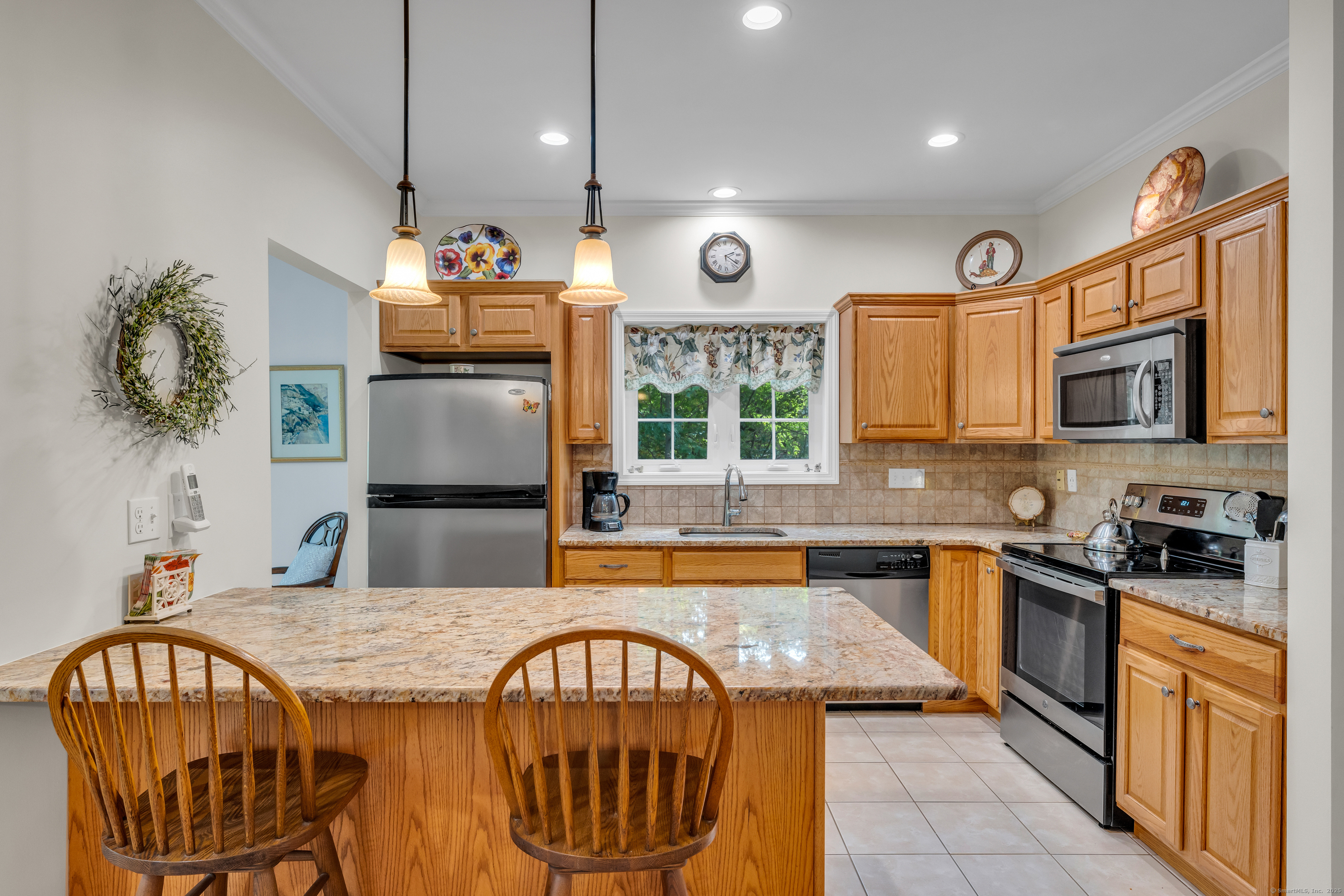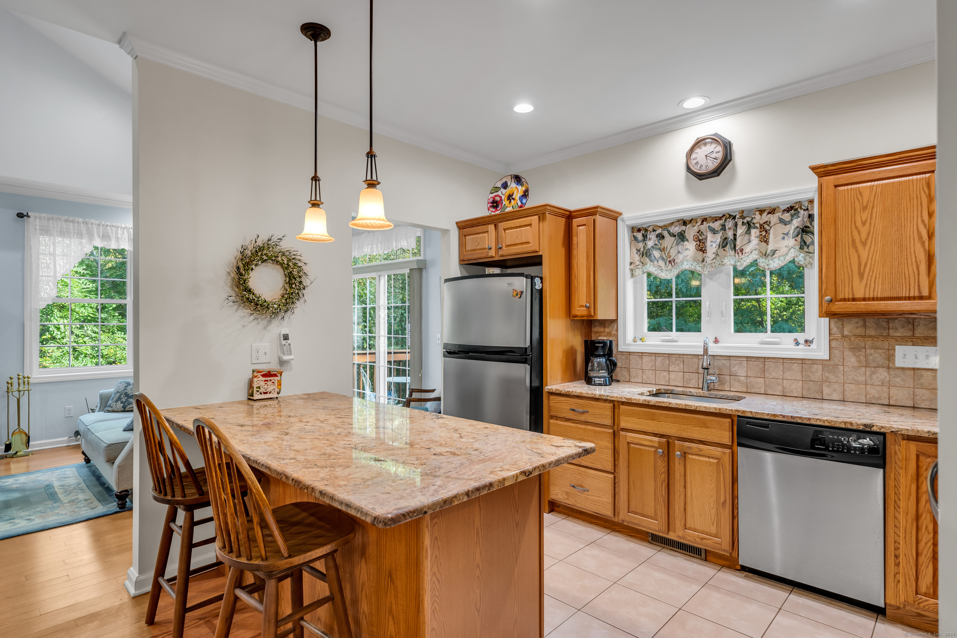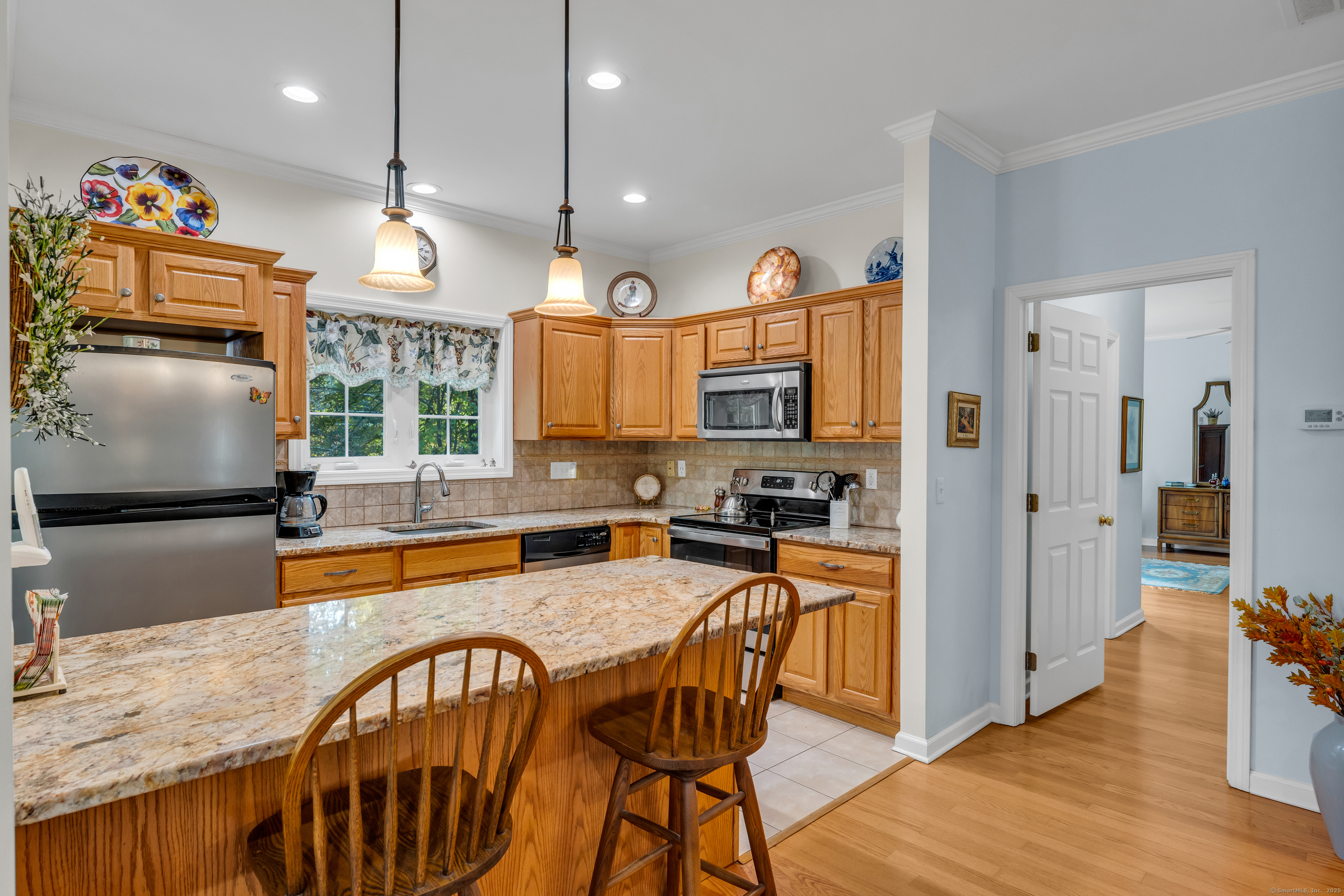 Welcome to Pond View Estates, a quiet and desirable 55+ community where this spacious 2-bedroom, 2.5-bath ranch offers comfortable living and thoughtful design. An inviting open floor plan features hardwood floors throughout, a living room with cathedral ceilings, gas fireplace, and sliders leading to a private deck-perfect for relaxing or entertaining. The kitchen is beautifully appointed with granite counters and stainless steel appliances. Each bedroom has its own private bath, with the primary suite offering a walk-in closet and stall shower. The walk-out lower level provides endless possibilities-whether as a family room, gym, workshop, or extra storage. A two-car attached garage and main-level laundry add convenience. With its stylish finishes and flexible spaces, this home is an ideal blend of comfort and practicality.