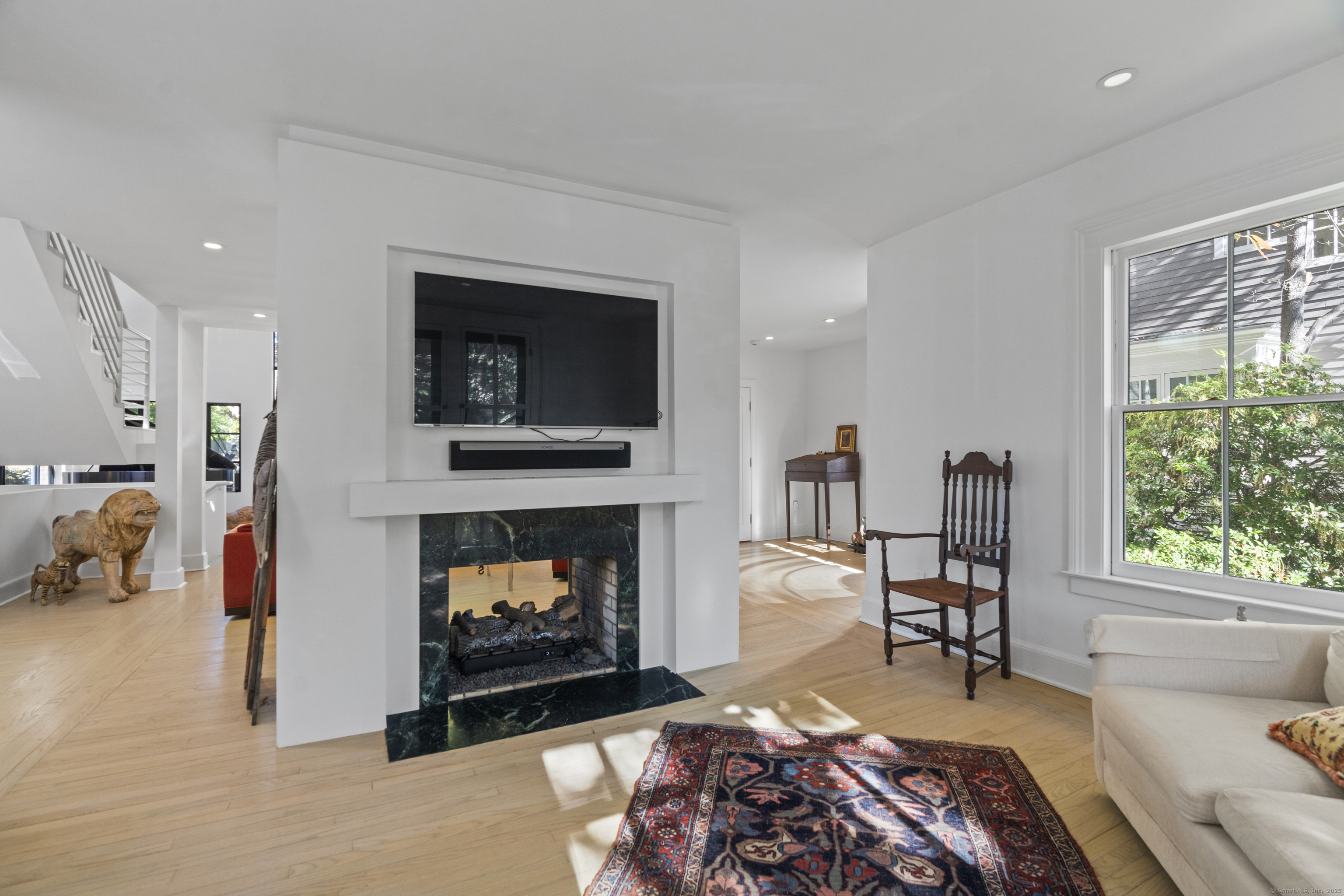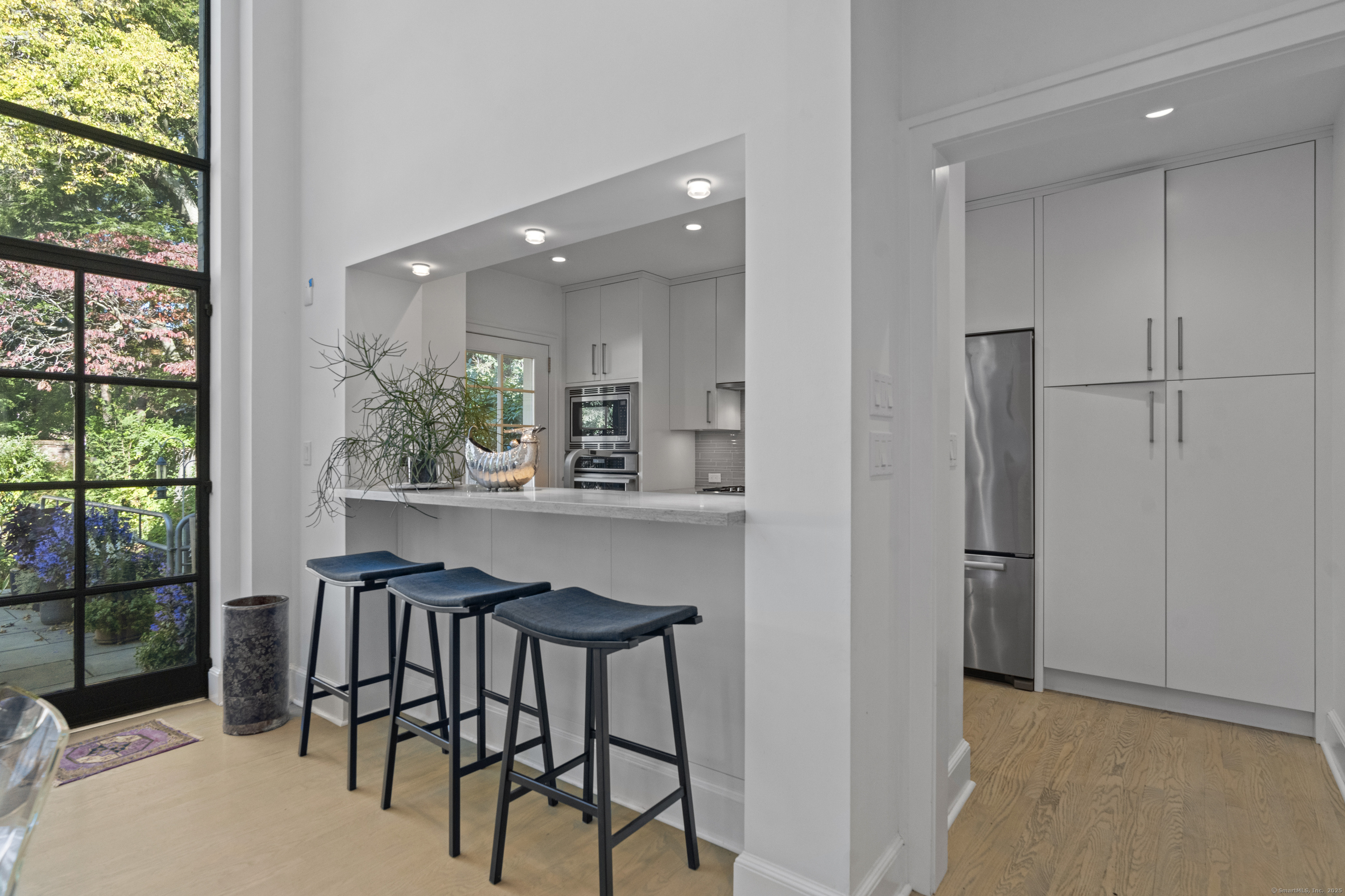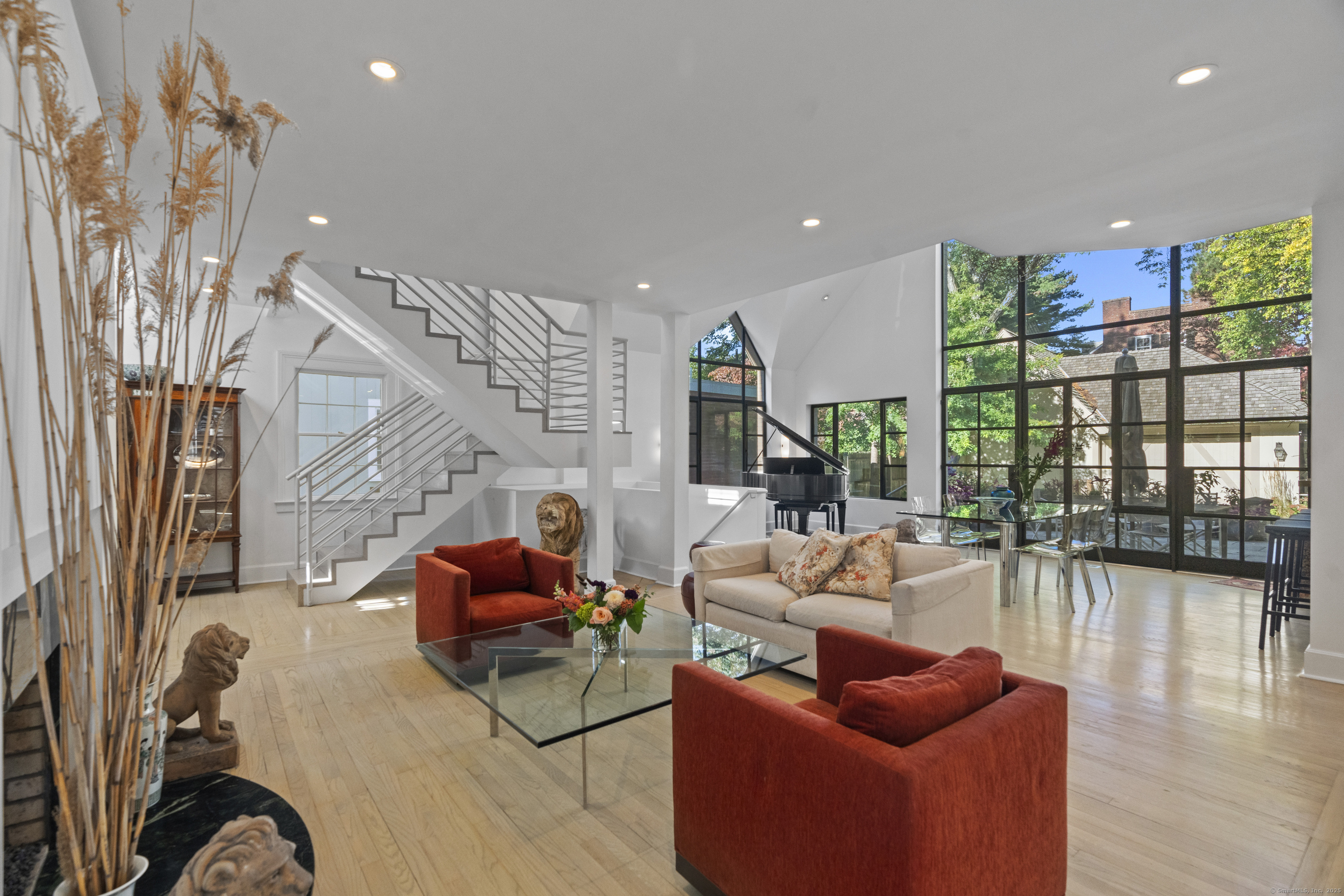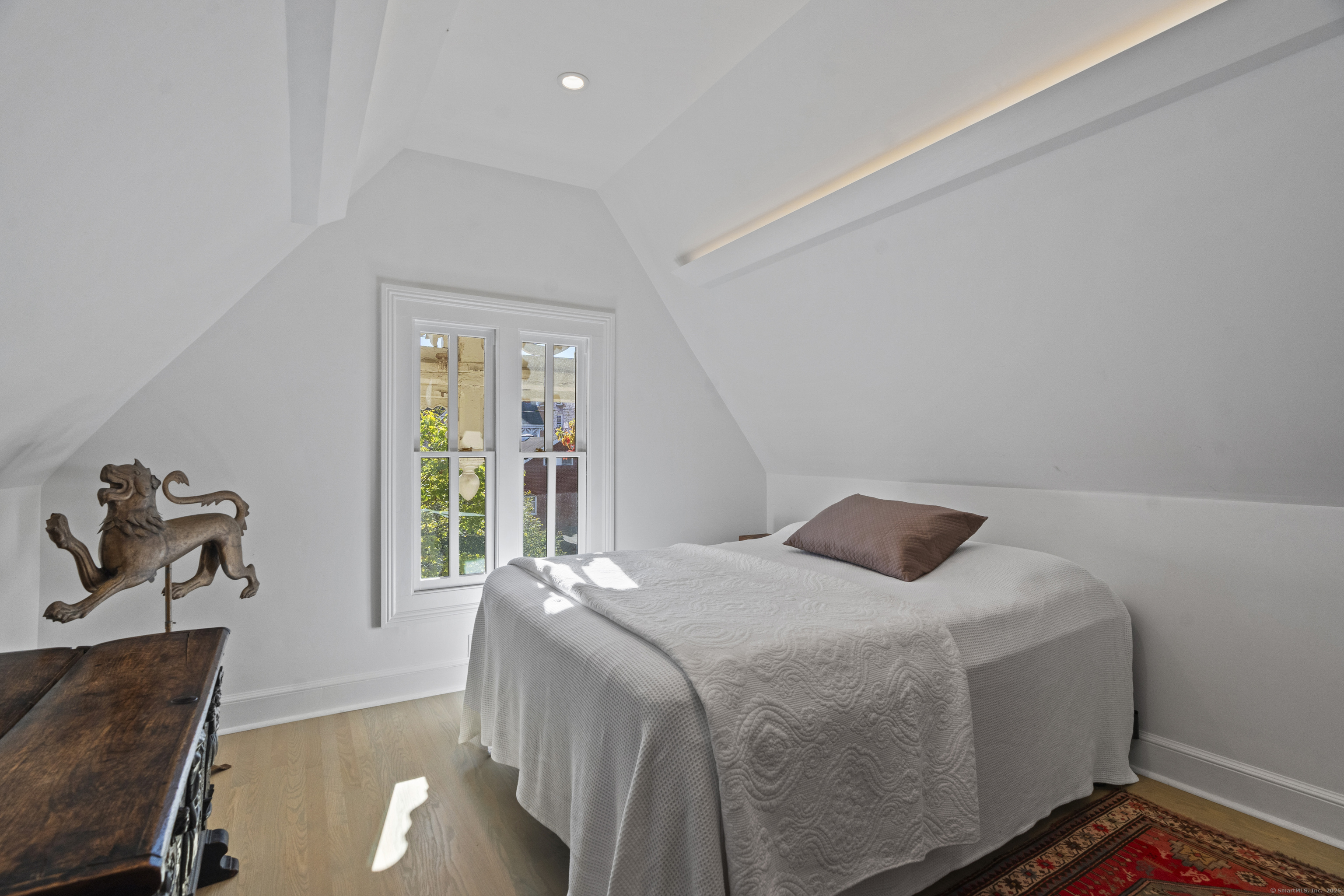 Architect designed, award-winning home on sought after Lincoln Street. Built in 1840 and renovated and expanded in 2016 by architect Paul Bailey, this contemporary design is truly breathtaking. The main level is an open concept floor plan with flexible living and dining space, soaring coffered ceilings, professional lighting, and a show stopping two story steel glass window. A cozy den or living space in the front of the house has restored original windows and a double-sided fireplace. The designer kitchen has stone counters, custom cabinetry, stainless appliances and a breakfast bar. An alcove is used for a piano currently and would also be well suited for an office, with more custom designed window. The first floor also includes a remodeled half bath, a stunning staircase, and an elevator for ease of access from first to second floor. The second floor offers a two-room primary suite with a walk-in closet and renovated bathroom. The third floor has a second bedroom with a remodeled bathroom, a large closet, and access to an incredible rooftop deck that overlooks New Haven. Professionally landscaped yard with a bluestone terrace, and a 2 car garage. Steps from Yale, Downtown New Haven, New Haven Lawn Club and Yale SOM. Houses like this one do not come on the market often!
