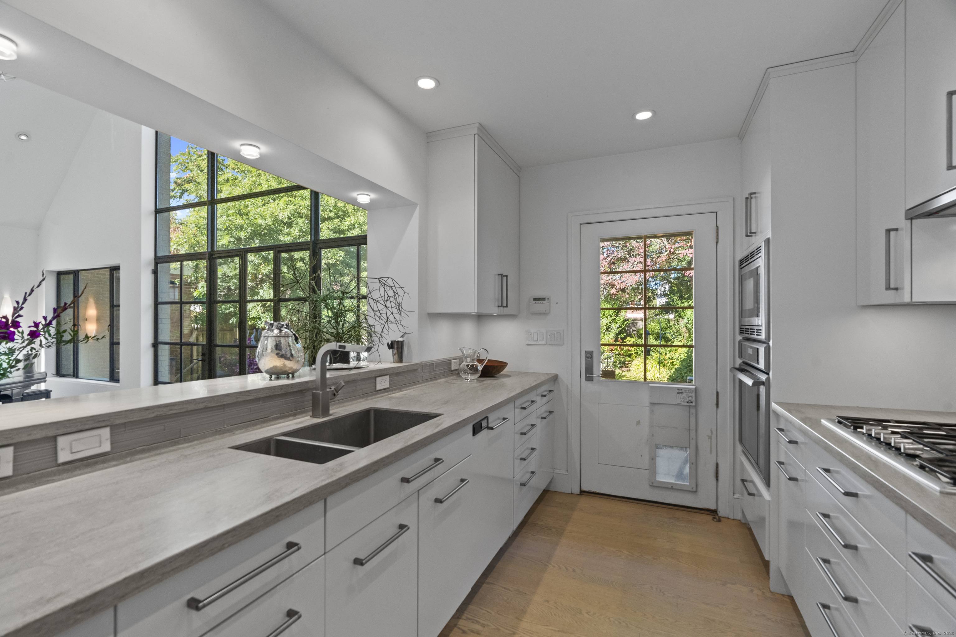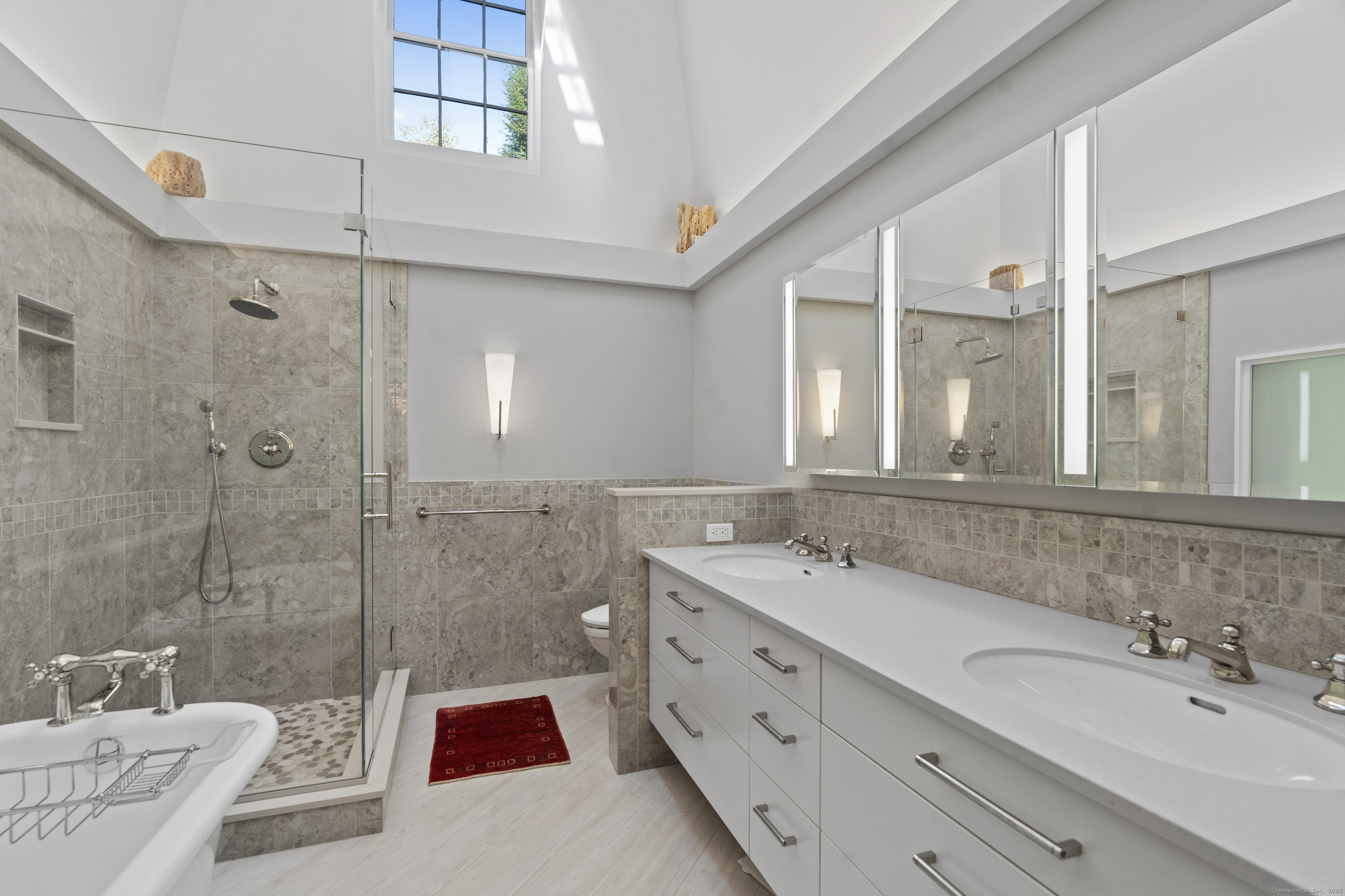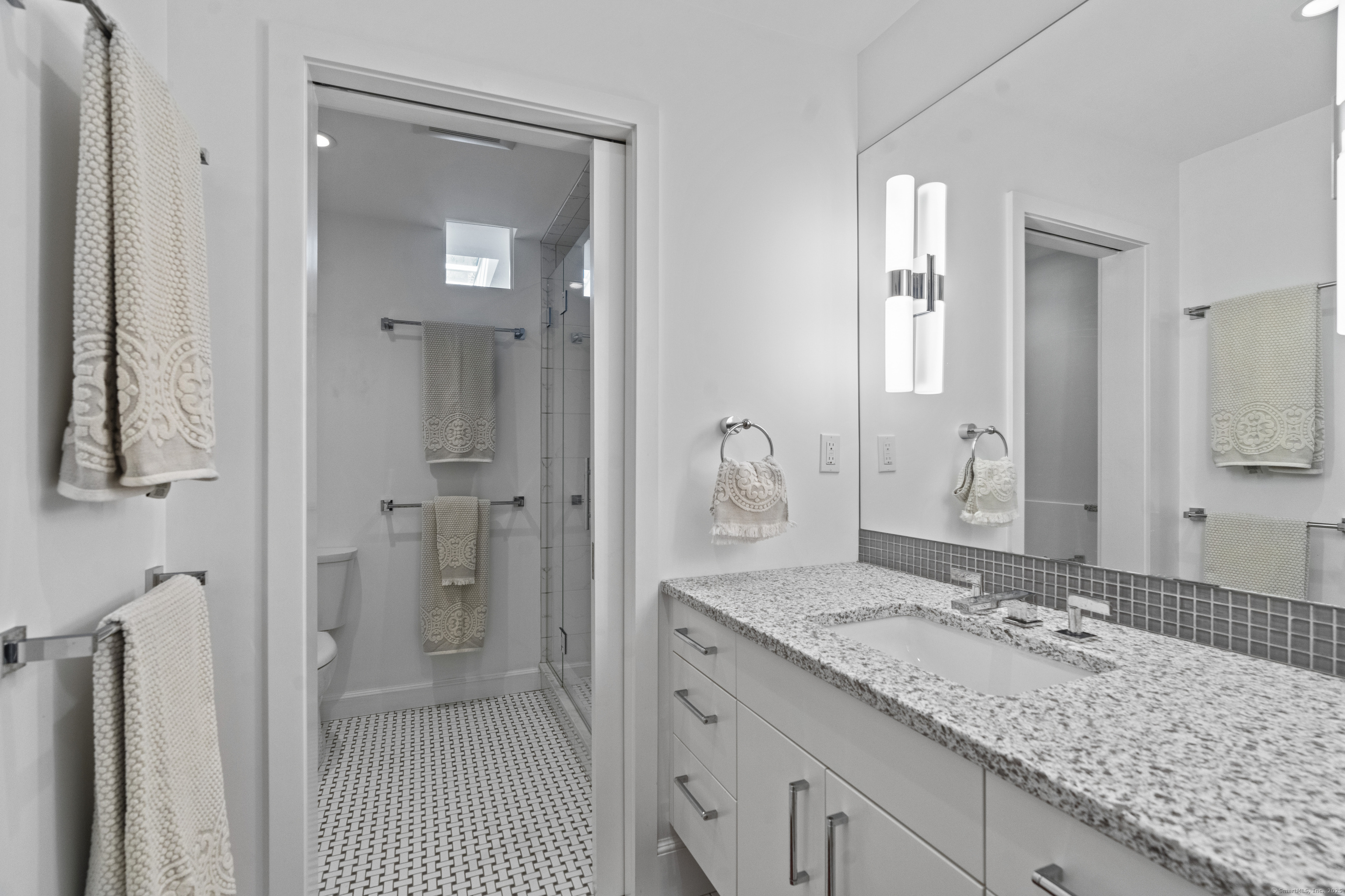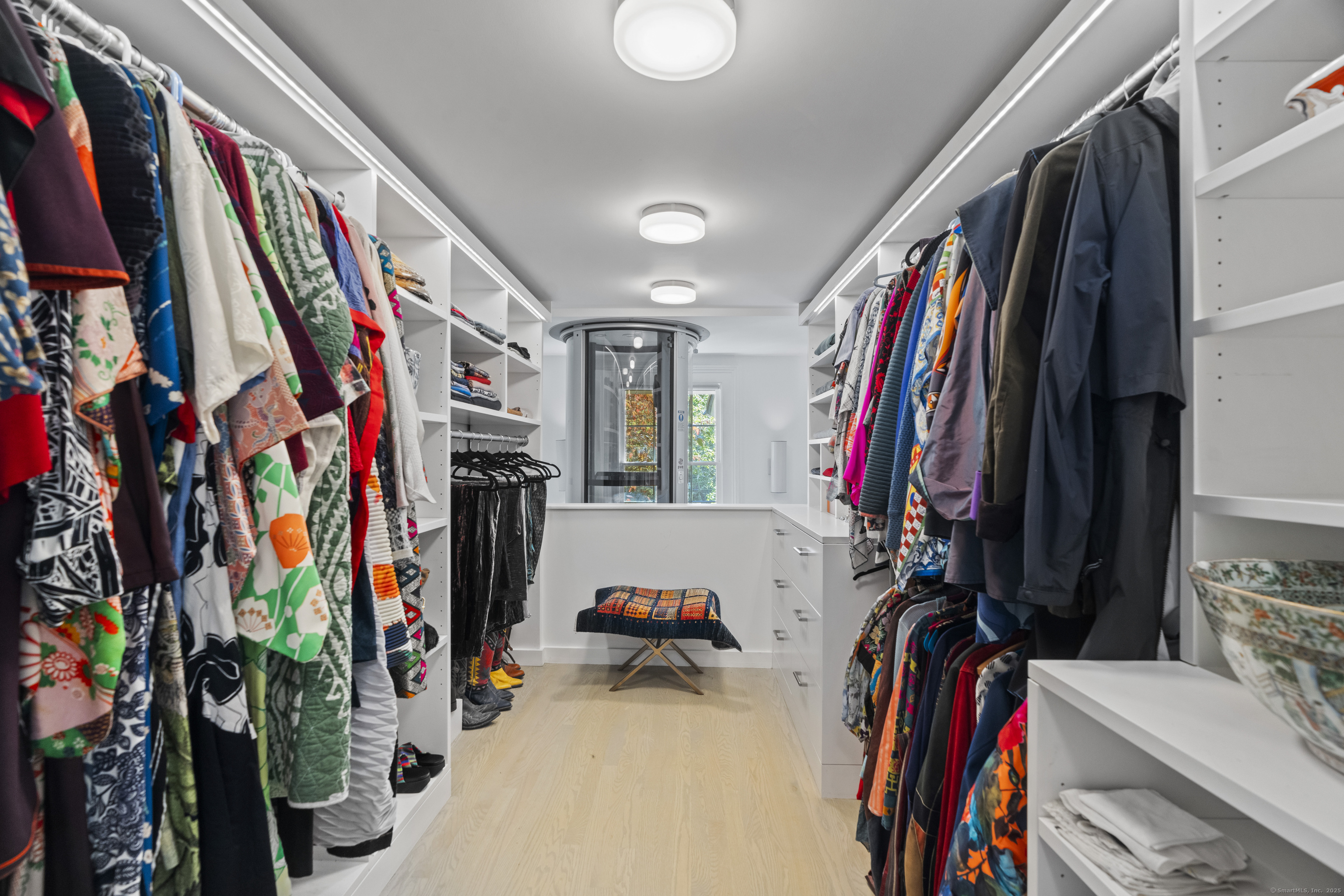 Architect designed, award-winning home on sought after Lincoln Street. Built in 1840 and renovated and expanded in 2016 by architect Paul Bailey, this contemporary design is truly breathtaking. The main level is an open concept floor plan with flexible living and dining space, soaring coffered ceilings, professional lighting, and a show stopping two story steel glass window. A cozy den or living space in the front of the house has restored original windows and a double-sided fireplace. The designer kitchen has stone counters, custom cabinetry, stainless appliances and a breakfast bar. An alcove is used for a piano currently and would also be well suited for an office, with more custom designed window. The first floor also includes a remodeled half bath, a stunning staircase, and an elevator for ease of access from first to second floor. The second floor offers a two-room primary suite with a walk-in closet and renovated bathroom. The third floor has a second bedroom with a remodeled bathroom, a large closet, and access to an incredible rooftop deck that overlooks New Haven. Professionally landscaped yard with a bluestone terrace, and a 2 car garage. Steps from Yale, Downtown New Haven, New Haven Lawn Club and Yale SOM. Houses like this one do not come on the market often!