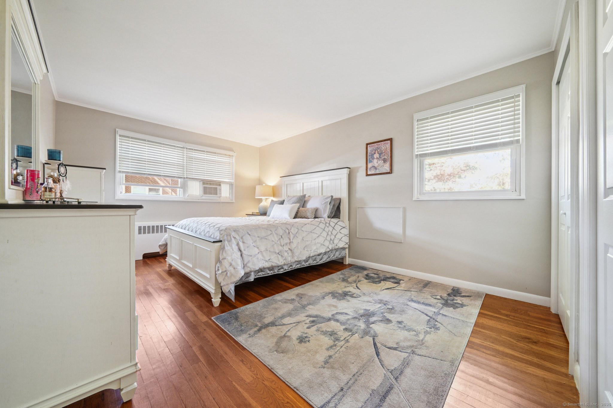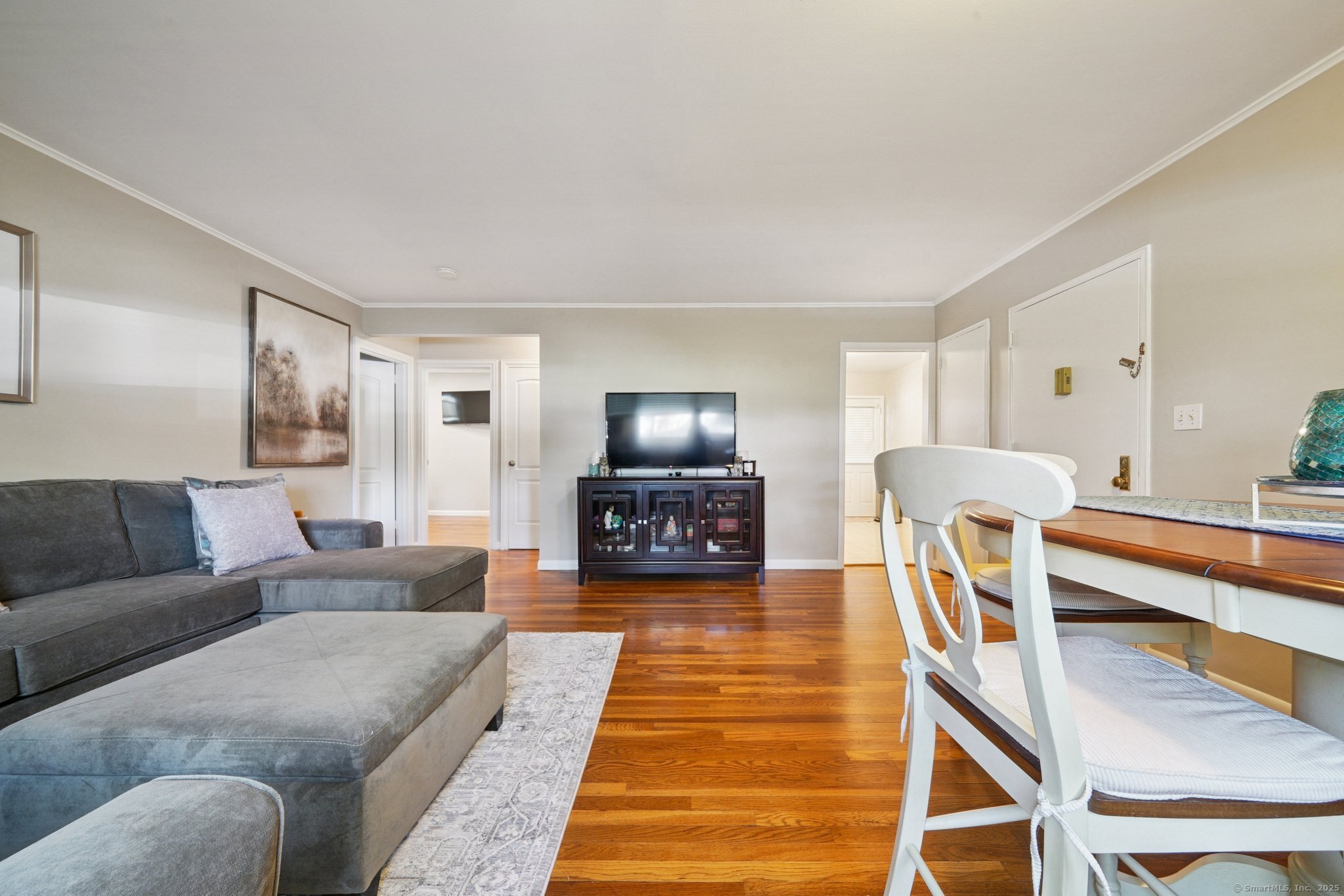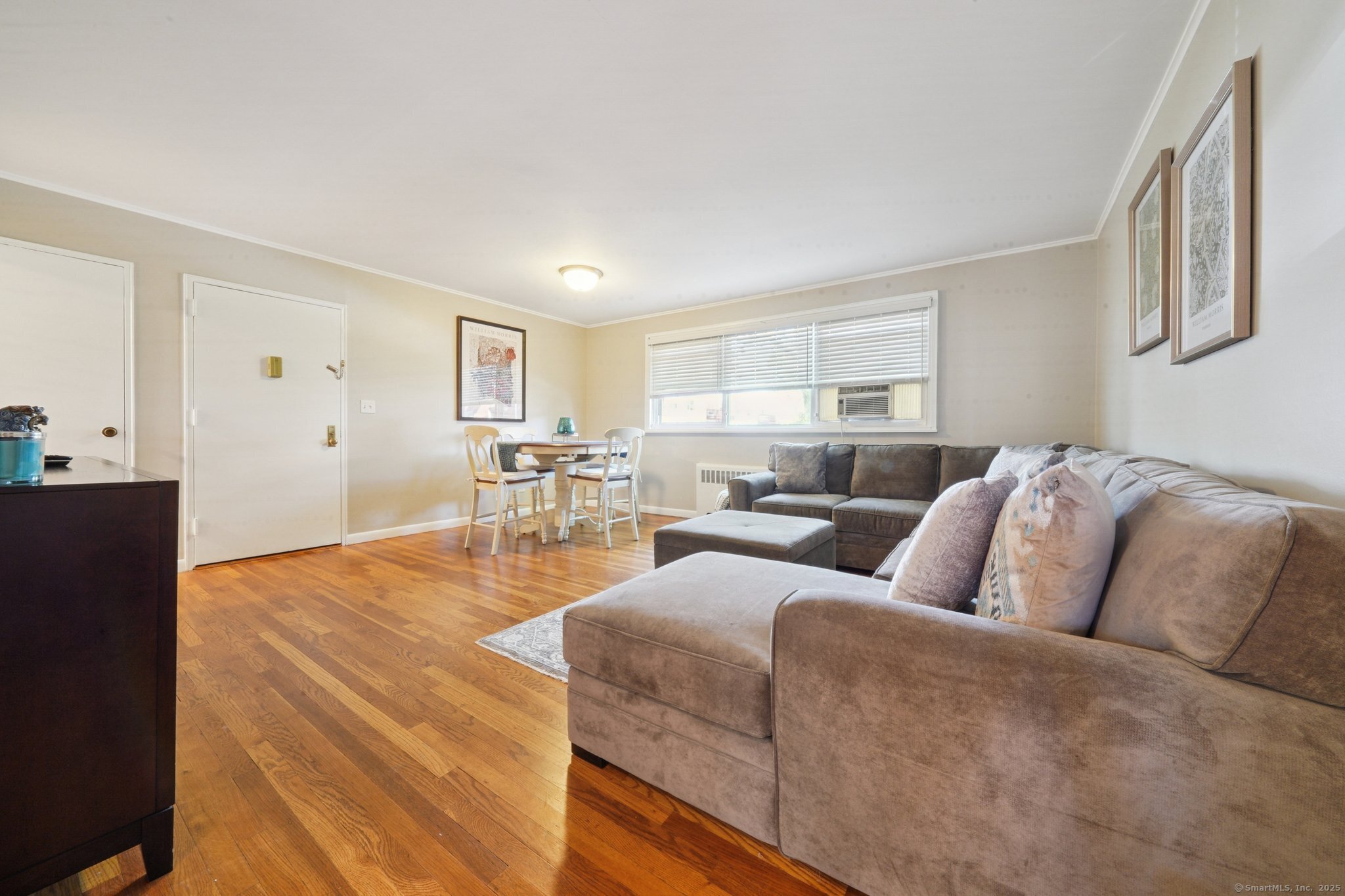 INCREDIBLE LOCATION AND UTILITIES INCLUDED IN COMMON CHARGES!!! This beautifully maintained end unit is located on the desired first floor. Pristine hardwood floors and custom crown molding throughout! Large living room/dining area combination, eat-in kitchen with gas stove have oversized windows which allow plenty of sunlight! Primary bedroom can easily fit a king-size bed and has tons of closet space. Guest bedroom has ample closet space and plenty of sunlight as well. One full bath with shower/tub and vanity. Brand-new blinds throughout and entire unit just painted in a neutral color! There is an option to install a ventless washer/dryer in the unit's hallway closet or use the convenient washer/dryer located just steps from kitchen door. Heat, hot water, ground maintenance, snow removal and taxes are all included in the monthly Common Charges. One assigned parking spot comes with the unit. Visitor parking included. Minutes to Shops, Restaurants, Park, Beach and easy access to I-95. 45 Mins from New York City! Don't let this opportunity pass you by!