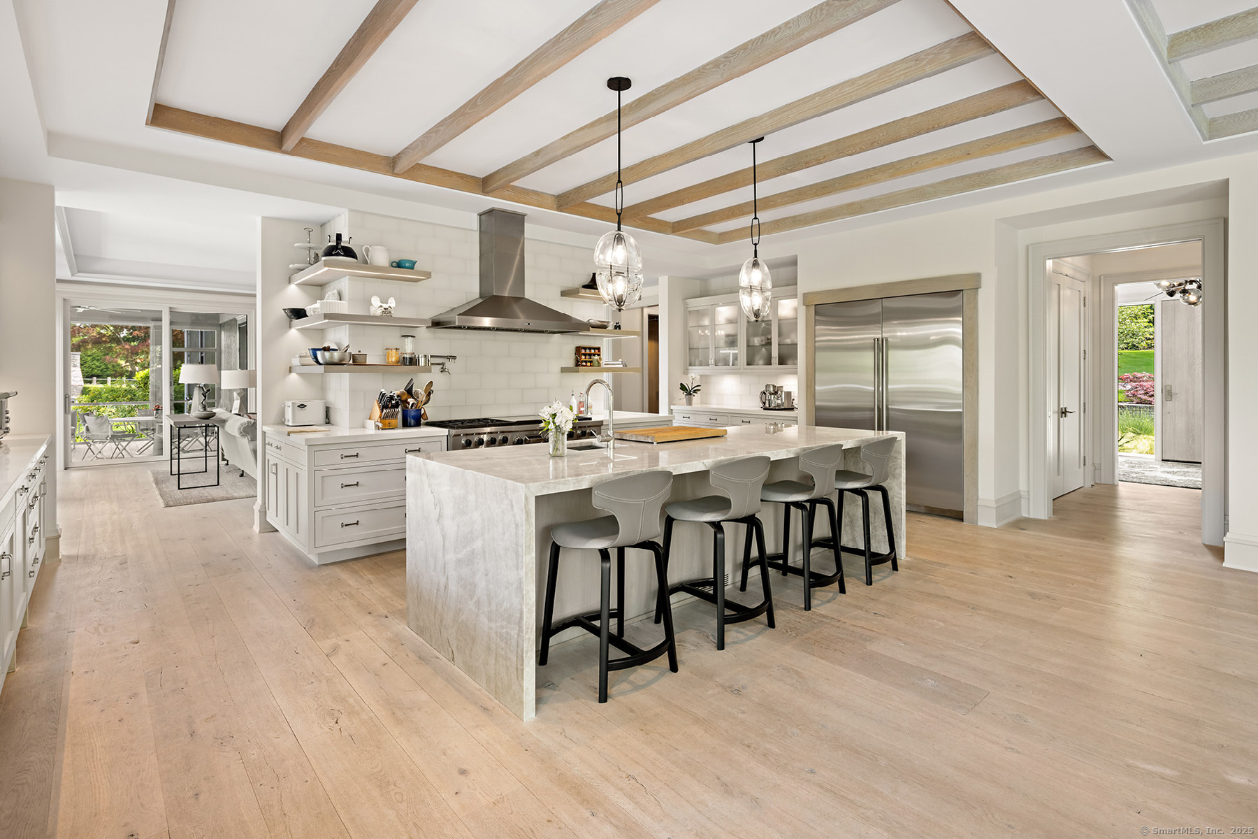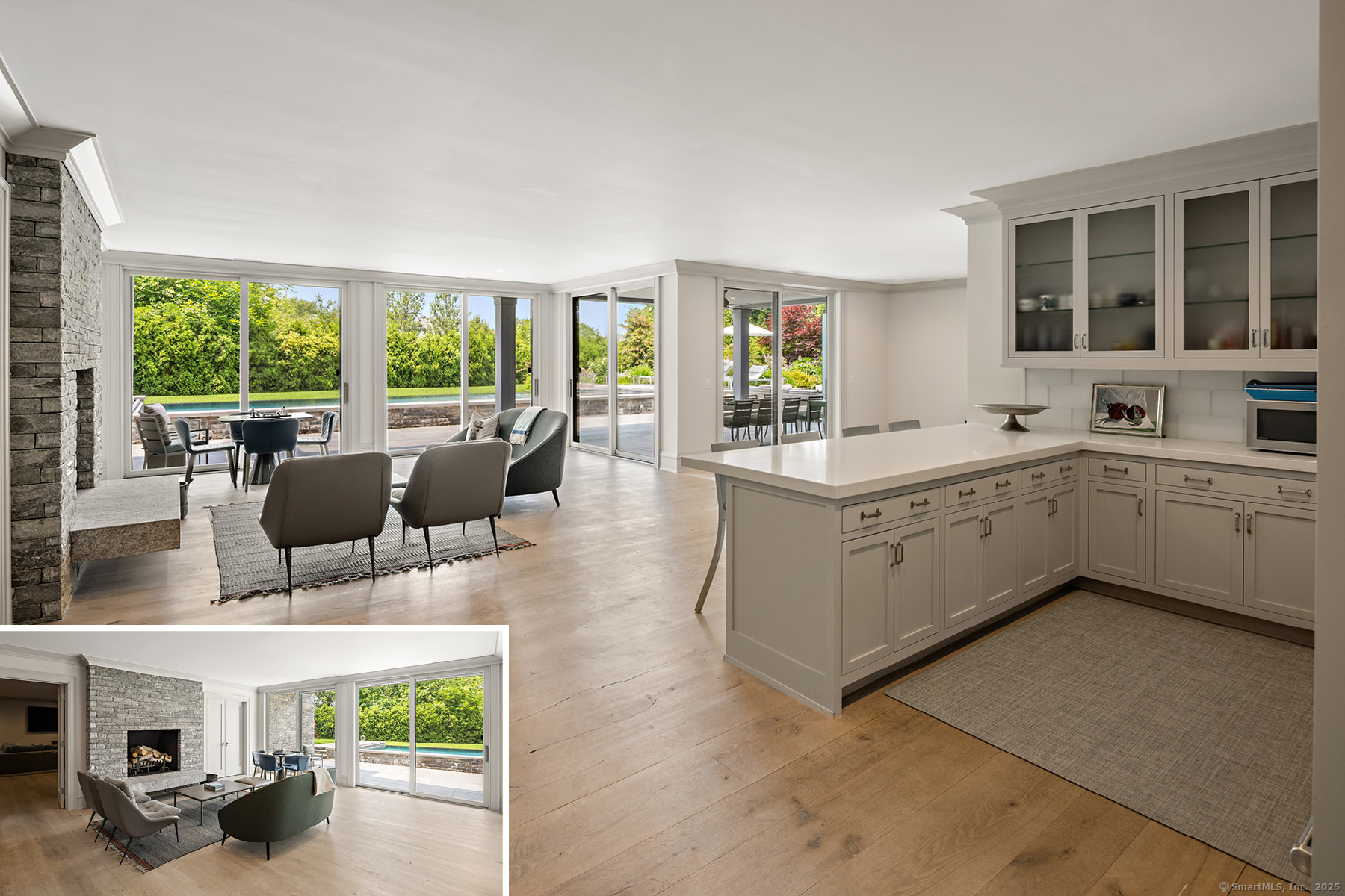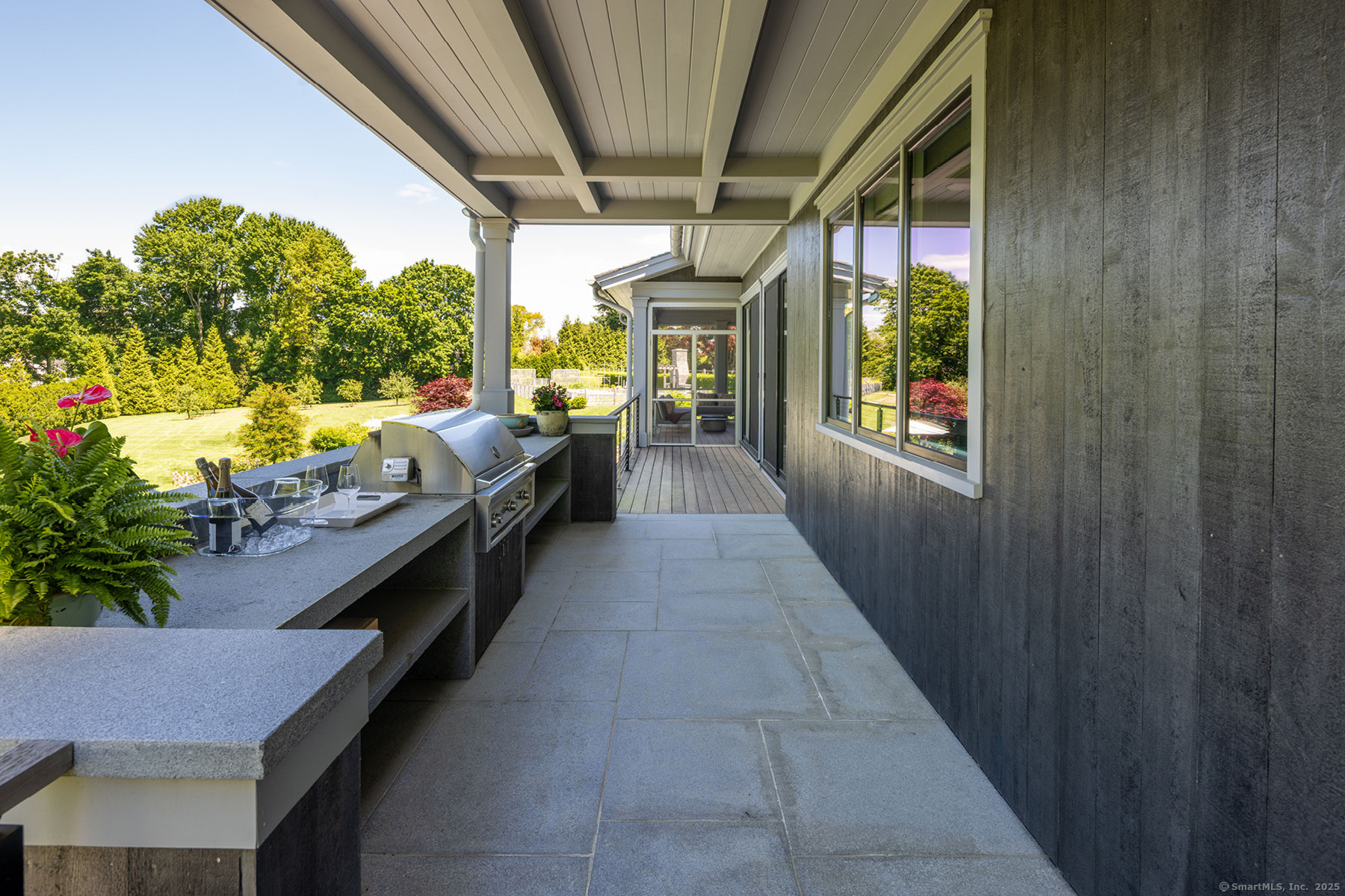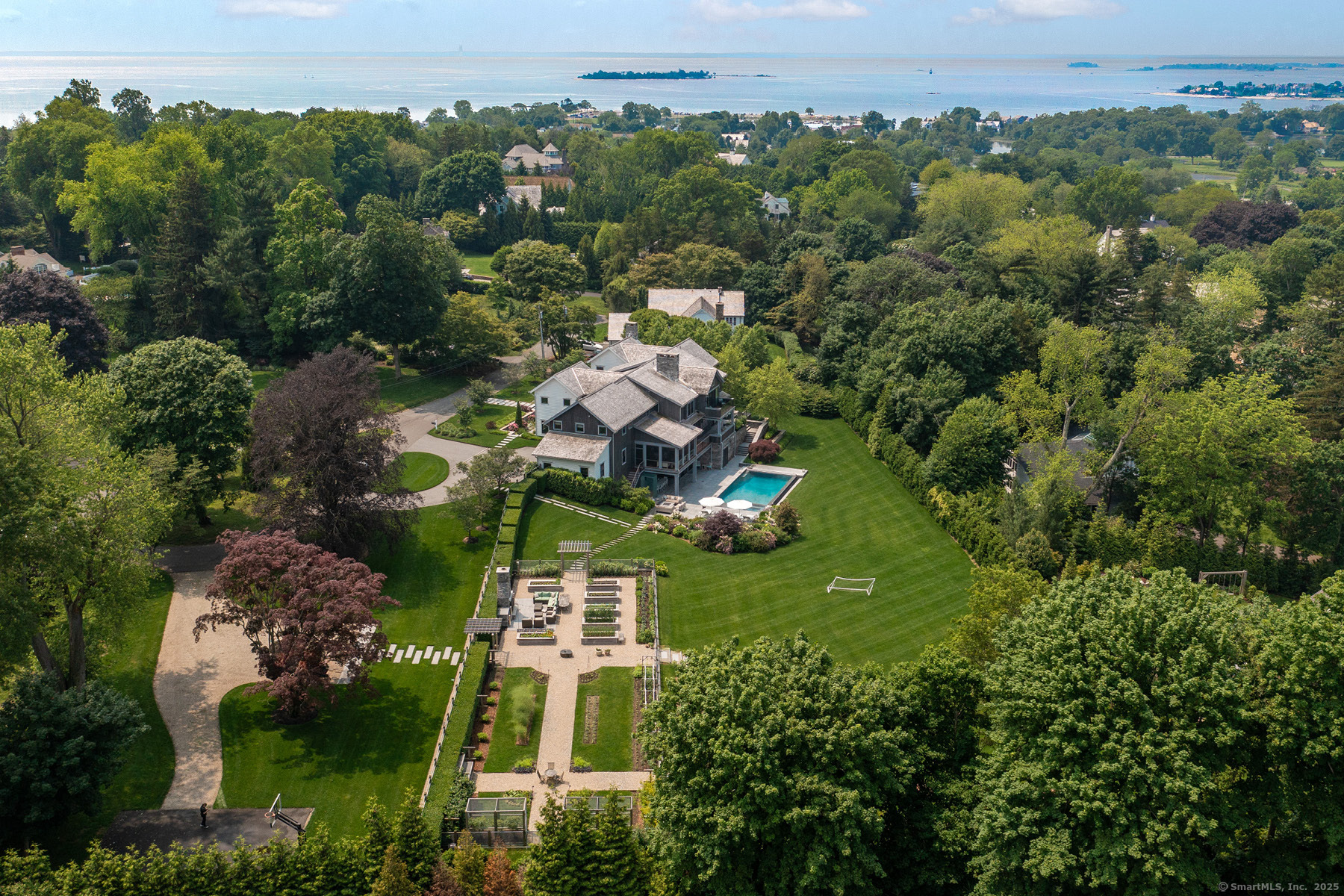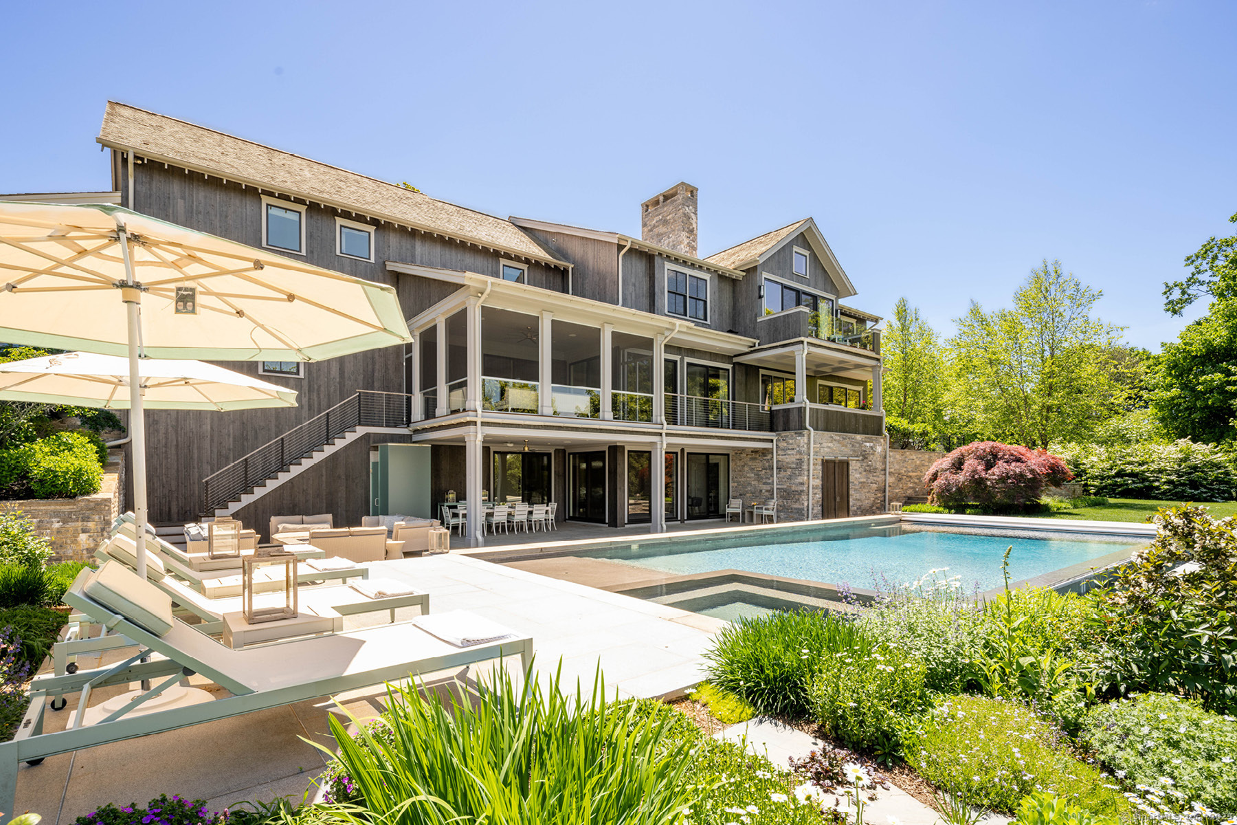 Welcome to your dream home on Westport's premier Compo Beach cul-de-sac - an extraordinary 2+ acre estate offering privacy, luxury, and resort-style living in one of Fairfield County's most coveted coastal neighborhoods. Custom-built by Schmiedeck Construction with interiors by Havilande Whitcom Design, this modern farmhouse blends stunning architecture with high function and comfort. Steps from Longshore Club CC & Compo Beach, the home centers around a dramatic infinity-edge pool, expansive patios, sculpted parterres, outdoor kitchen, multi-level decks, and a large screened porch. Meticulously landscaped with fruit orchard, raised garden w/ fireside seating, sprawling lawns, ambient lighting, firepit - every detail was curated for elevated indoor-outdoor living. Inside, enjoy sleek, state-of-the-art finishes: a show-stopping primary suite with balcony and spa bath, and a walk-out LL with media room, wine cellar, rec room, gym, kitchenette, and pool bath w/ changing room. Flexible spaces incl separate guest quarters and au pair suite - ideal for multigenerational living. Smart systems, 3-stop elevator, LED lighting, generator and energy-efficient HVAC add comfort and convenience. Room for a TC or guesthouse, plus rare sub-dividable potential in one of Westport's most prestigious enclaves.