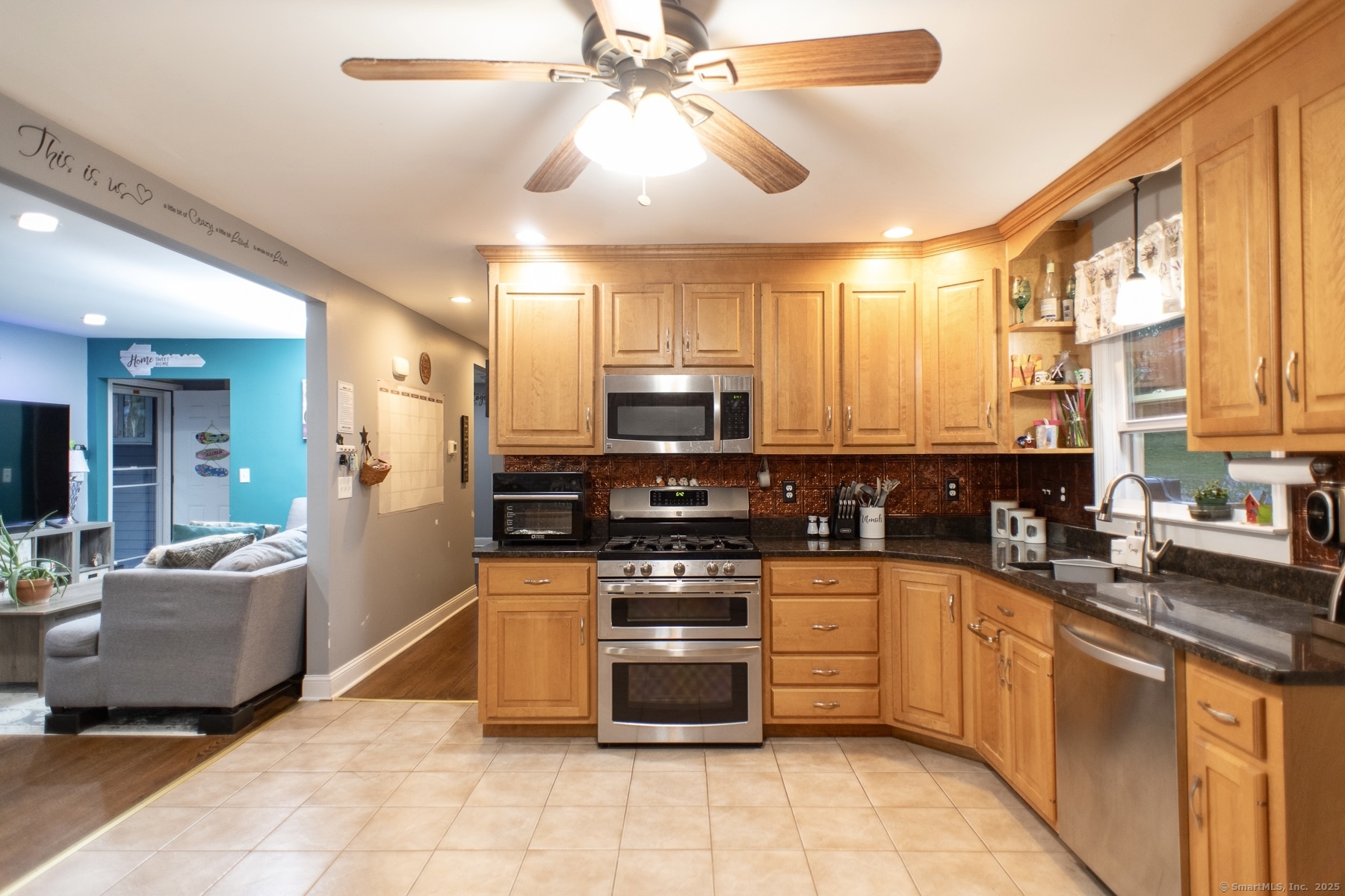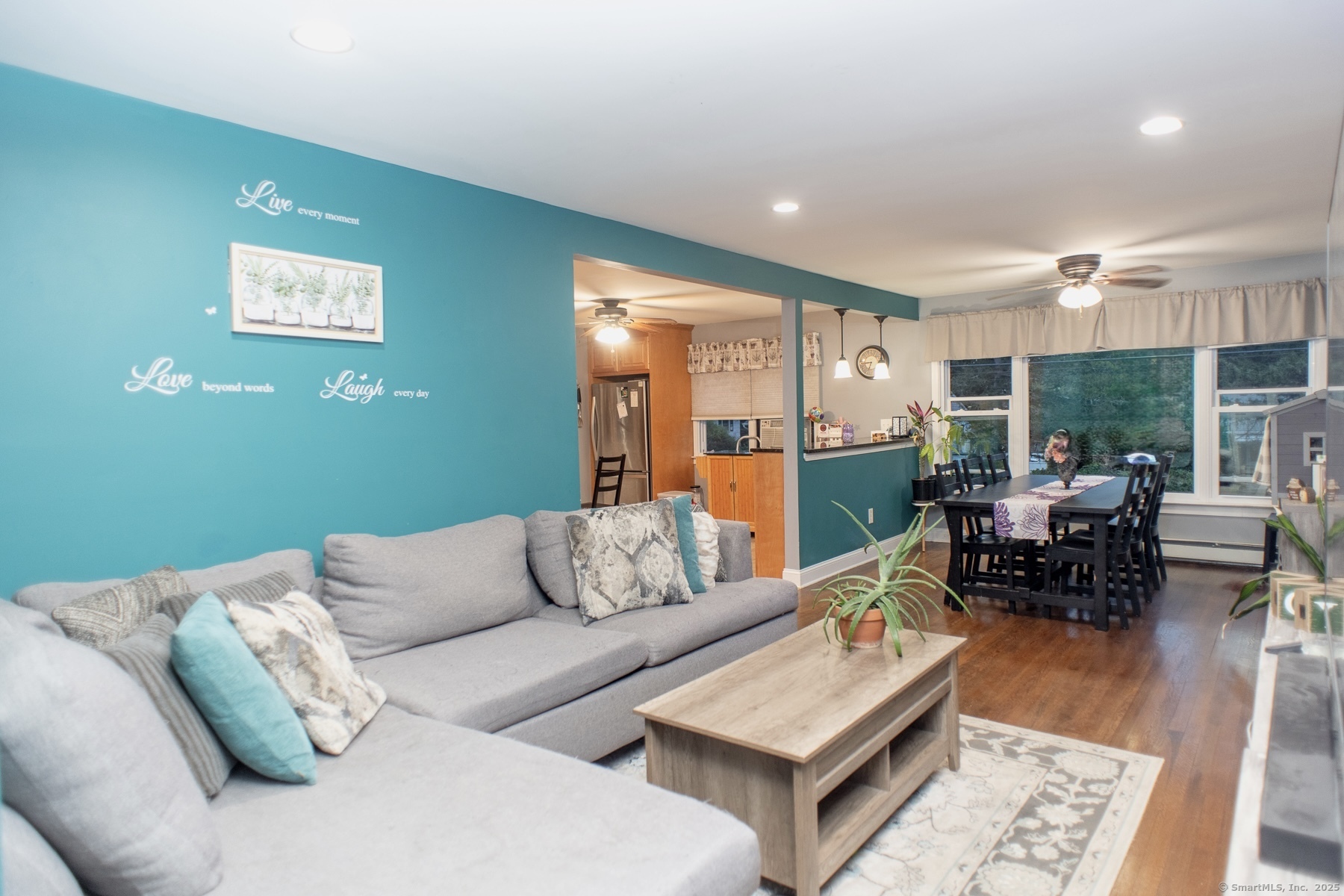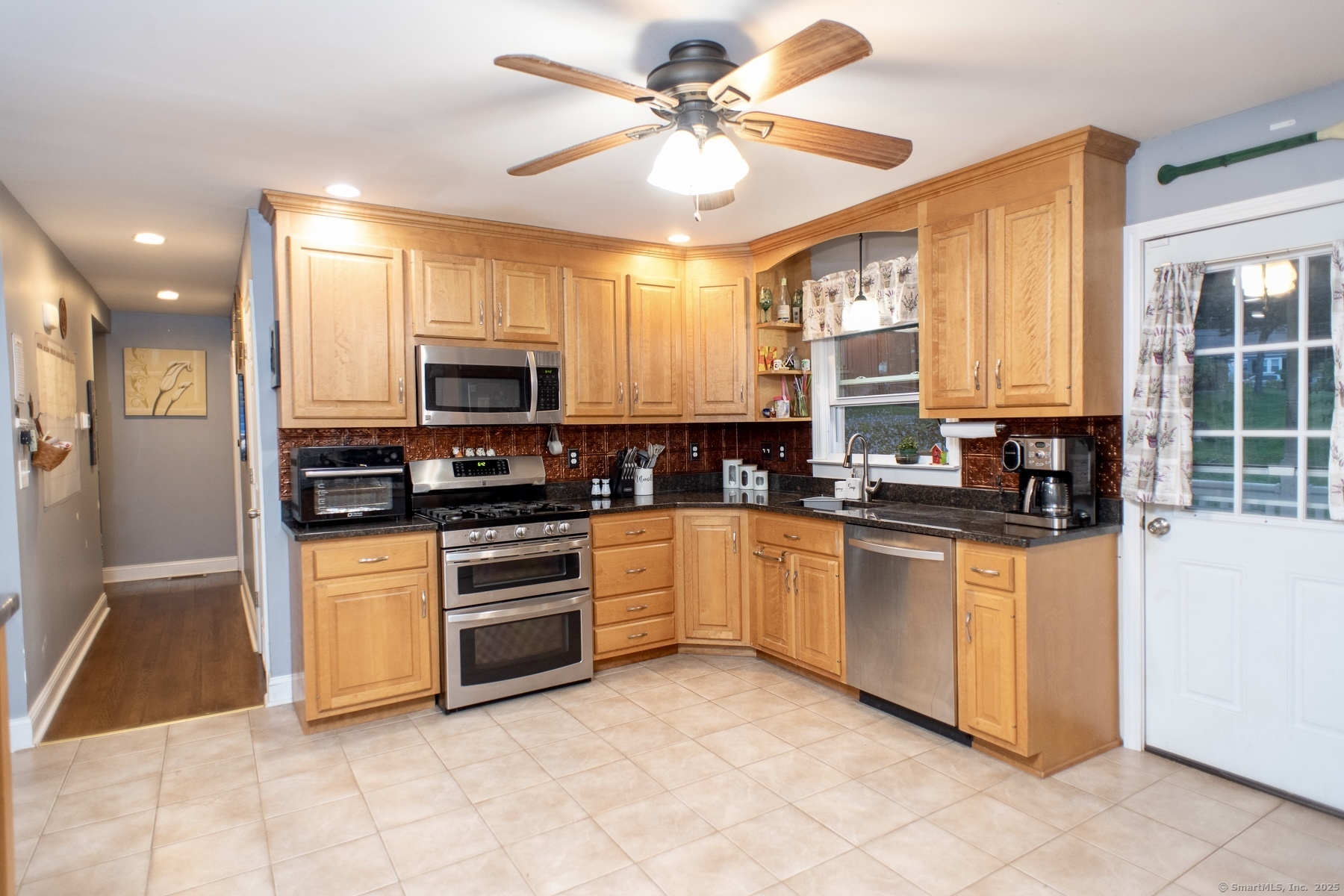 Welcome to this beautifully maintained ranch home that truly checks all the boxes. With its bright, open floor plan and thoughtful updates, this property offers both style and comfort from the moment you walk in. The spacious eat-in kitchen features granite counters, custom cabinetry, stainless steel appliances, a breakfast bar, and ceramic tile flooring. It flows seamlessly into the sun-filled dining room with hardwood floors, an oversized bay window, and ceiling fan. The inviting living room continues the hardwoods and opens to an expansive covered patio, perfect for entertaining or simply relaxing. The home offers four generously sized bedrooms, all with hardwood floors and ceiling fans, plus a full bath and a private half bath off the primary bedroom. A dry, walk-out basement provides abundant storage, a laundry area, and direct access to the two-car garage. Outside, the property shines with multiple spaces for outdoor living, including a covered deck off the kitchen and a covered patio. Custom stone walls and blue slate walkways enhance the landscaping, while recent updates-such as a newer roof and high-efficiency gas boiler-add peace of mind. Set in a desirable Town Plot location, this home is move-in ready and waiting for its next owner to enjoy. Don't miss your chance to see it!