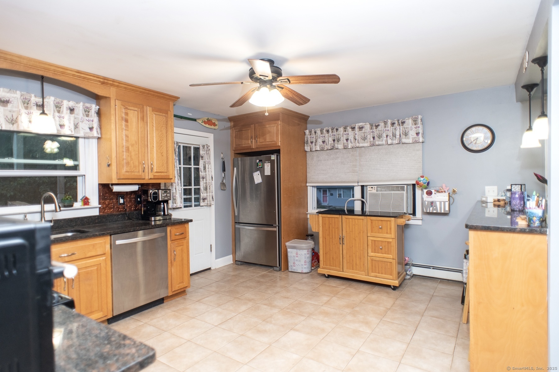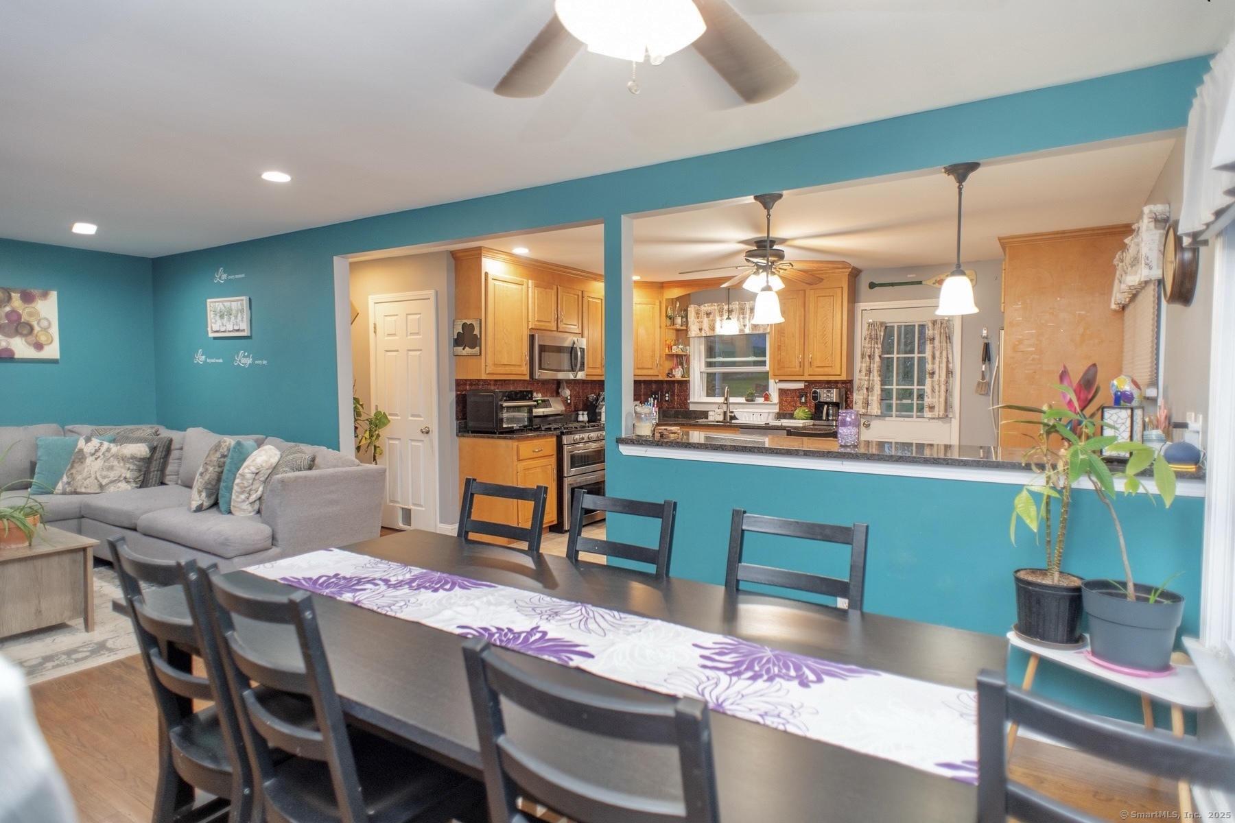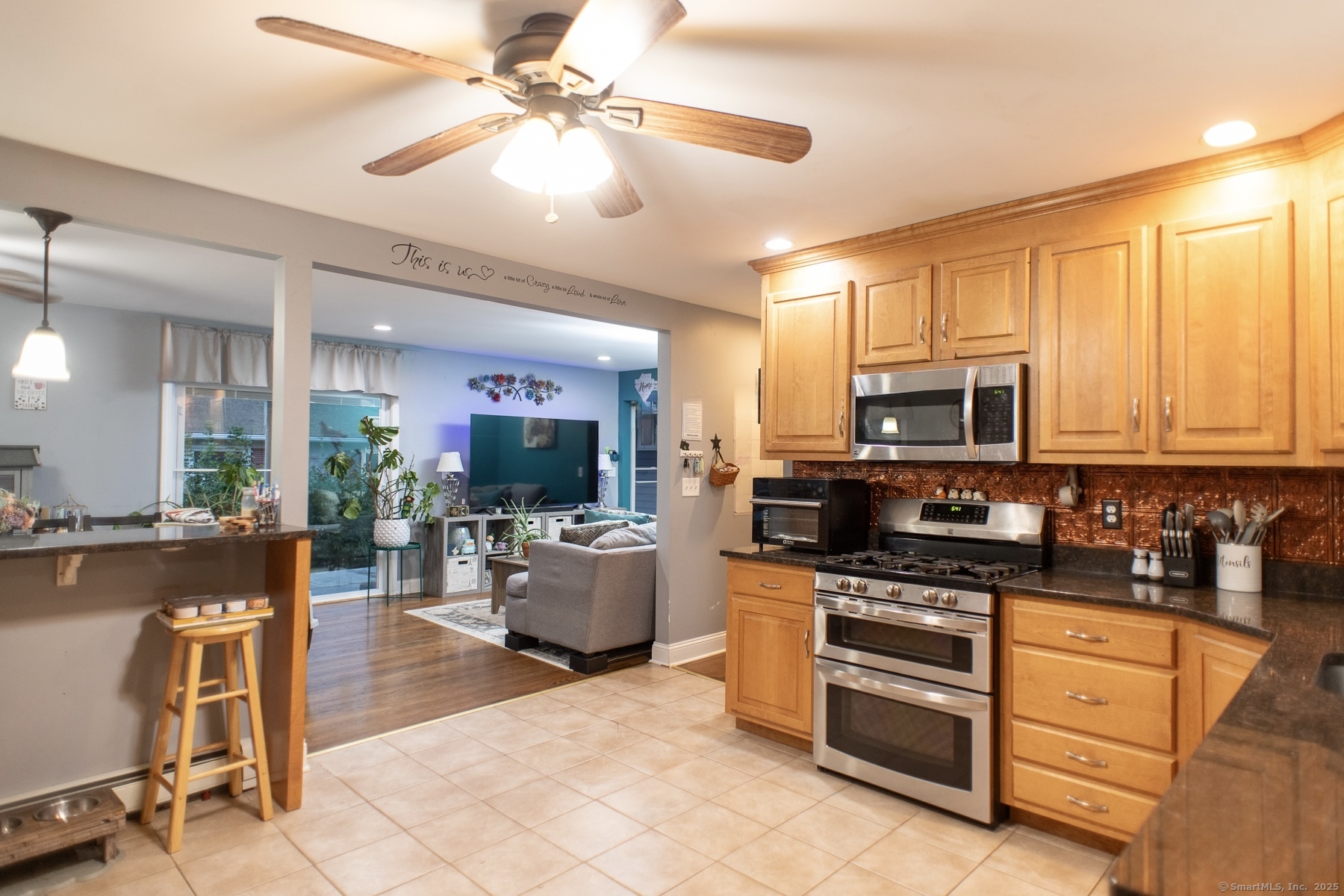 Welcome to this beautifully maintained ranch home that truly checks all the boxes. With its bright, open floor plan and thoughtful updates, this property offers both style and comfort from the moment you walk in. The spacious eat-in kitchen features granite counters, custom cabinetry, stainless steel appliances, a breakfast bar, and ceramic tile flooring. It flows seamlessly into the sun-filled dining room with hardwood floors, an oversized bay window, and ceiling fan. The inviting living room continues the hardwoods and opens to an expansive covered patio, perfect for entertaining or simply relaxing. The home offers four generously sized bedrooms, all with hardwood floors and ceiling fans, plus a full bath and a private half bath off the primary bedroom. A dry, walk-out basement provides abundant storage, a laundry area, and direct access to the two-car garage. Outside, the property shines with multiple spaces for outdoor living, including a covered deck off the kitchen and a covered patio. Custom stone walls and blue slate walkways enhance the landscaping, while recent updates-such as a newer roof and high-efficiency gas boiler-add peace of mind. Set in a desirable Town Plot location, this home is move-in ready and waiting for its next owner to enjoy. Don't miss your chance to see it!