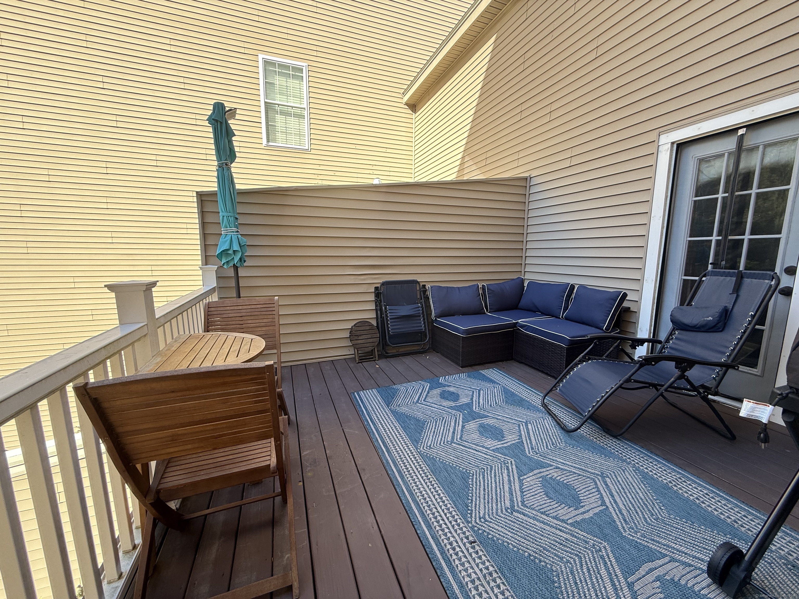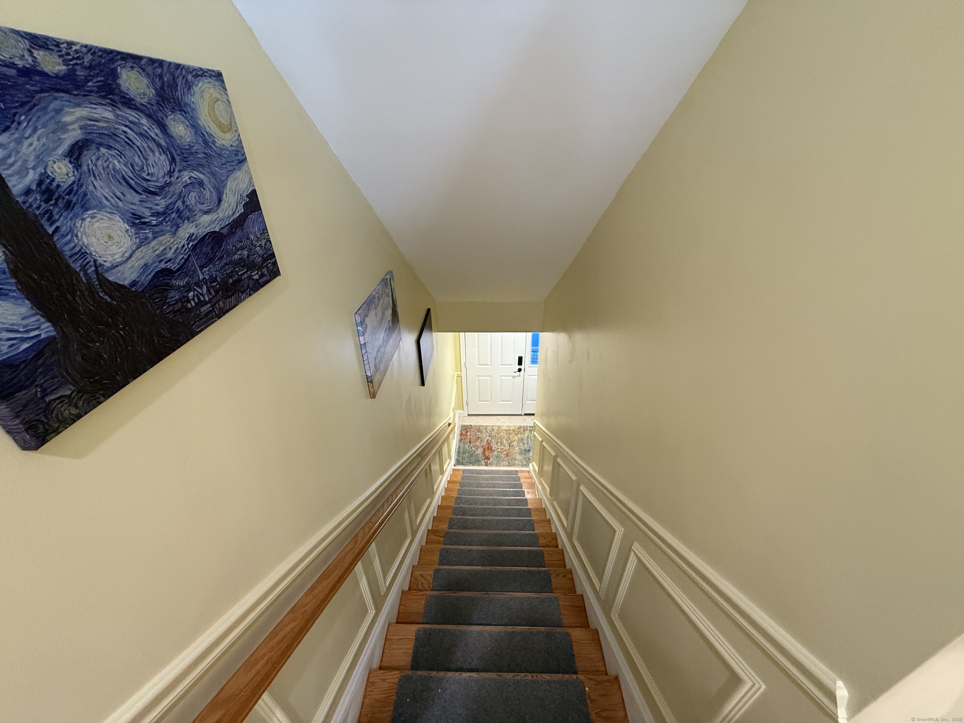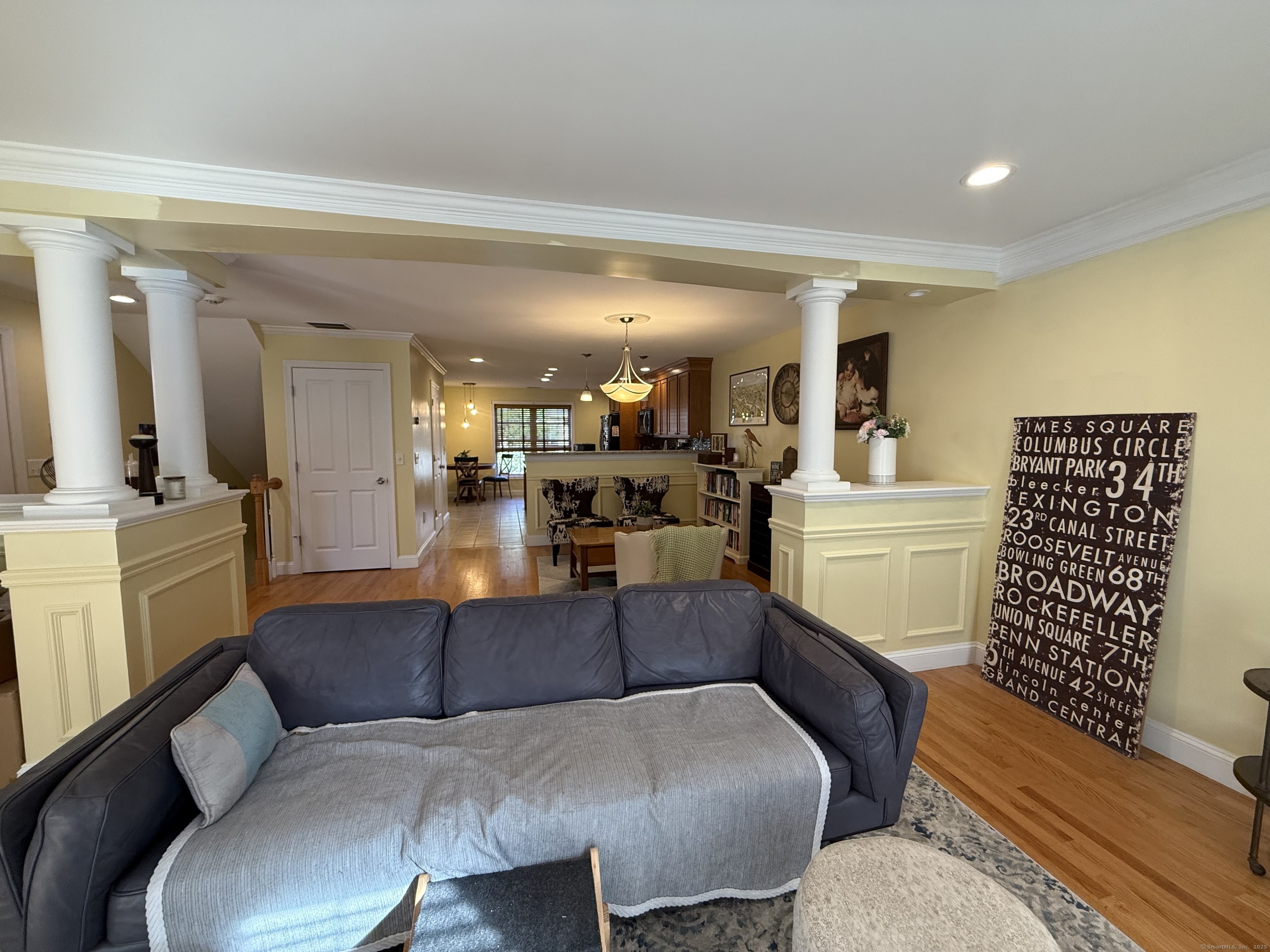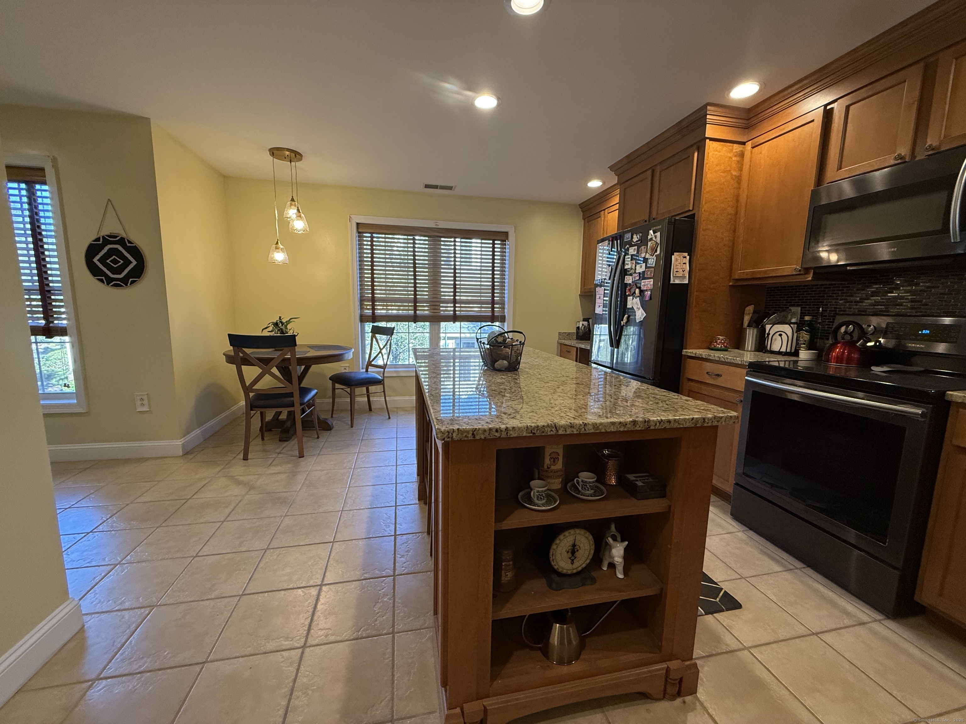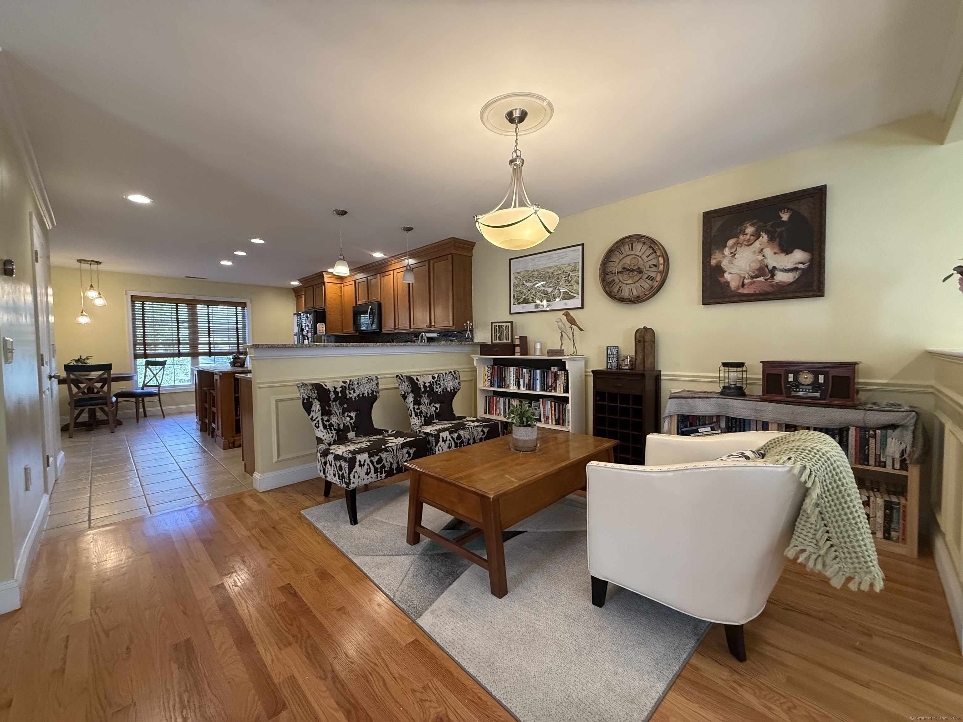 Welcome home to Heritage Pine Estates. This second & third floor townhouse style home has been well cared for, is freshly painted, and very welcoming. This unit is located in a semi private area with rear views to woods and occasionally water. The unit features an open Living/Dining/Kitchen with gleaming hardwood floors. This may have even been one of the model units because of the upgrading of the trim, wainscoting, and the crown molding. The kitchen features an eating space, tiles floors, granite counters, black stainless steel appliances and a large working island. There is a cozy dining space before the generous sized living room. There is a 1/2 bathroom on the main level along with a great bonus room (potential 3rd bedroom) that makes a great den, library, or home office with access to the upper level deck. Upstairs, the primary bedroom suite features large closet space along with a full bathroom. The second bedroom also has a very good sized closet. Laundry is conveniently located on the upper level as well. An. efficient heat pump provides the heat & Central Air. New water heater as of 2024 & pull-down attic stairs for easy access and storage.