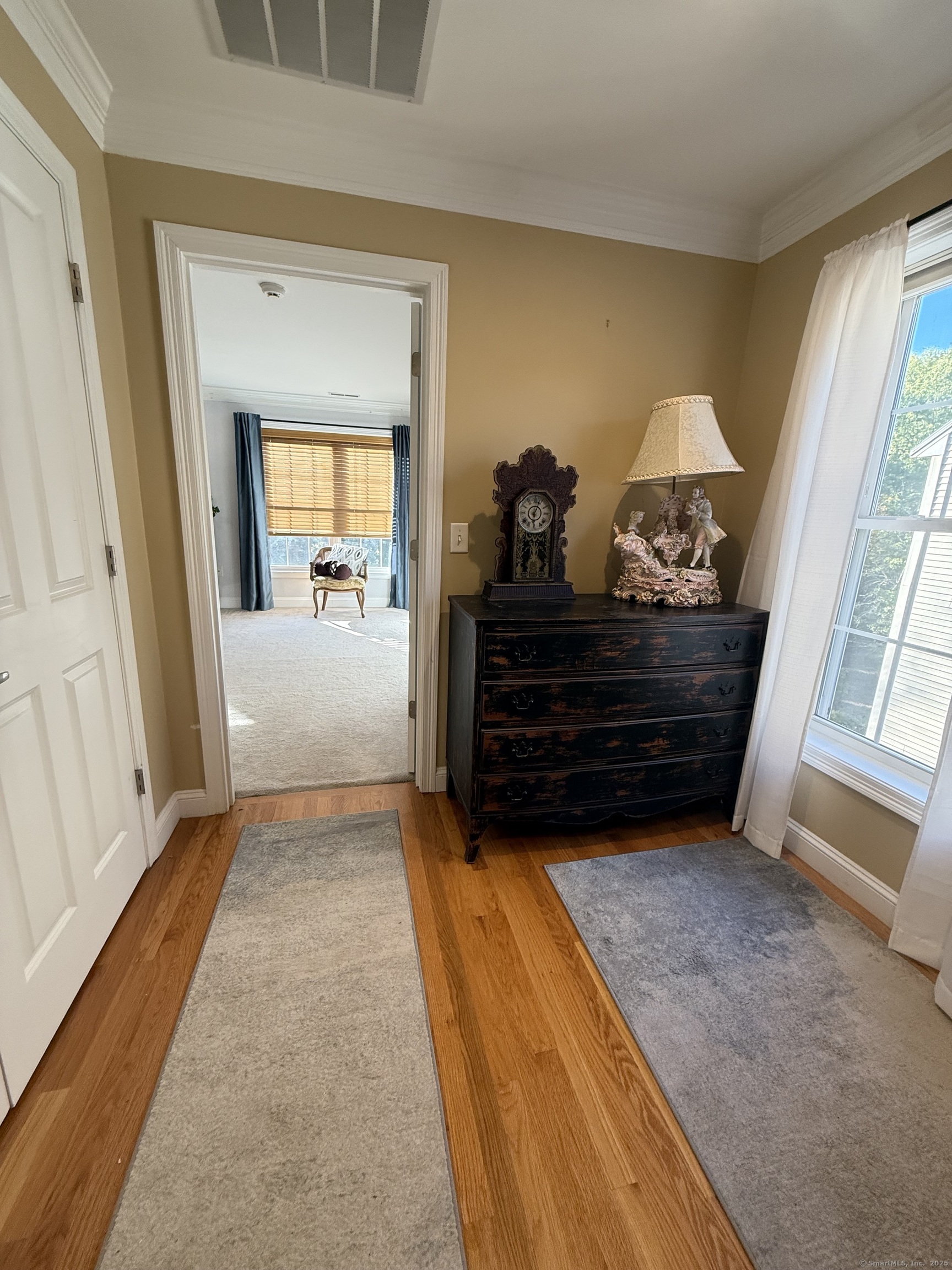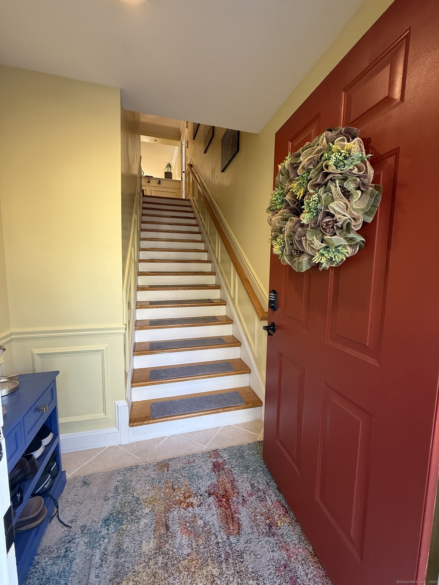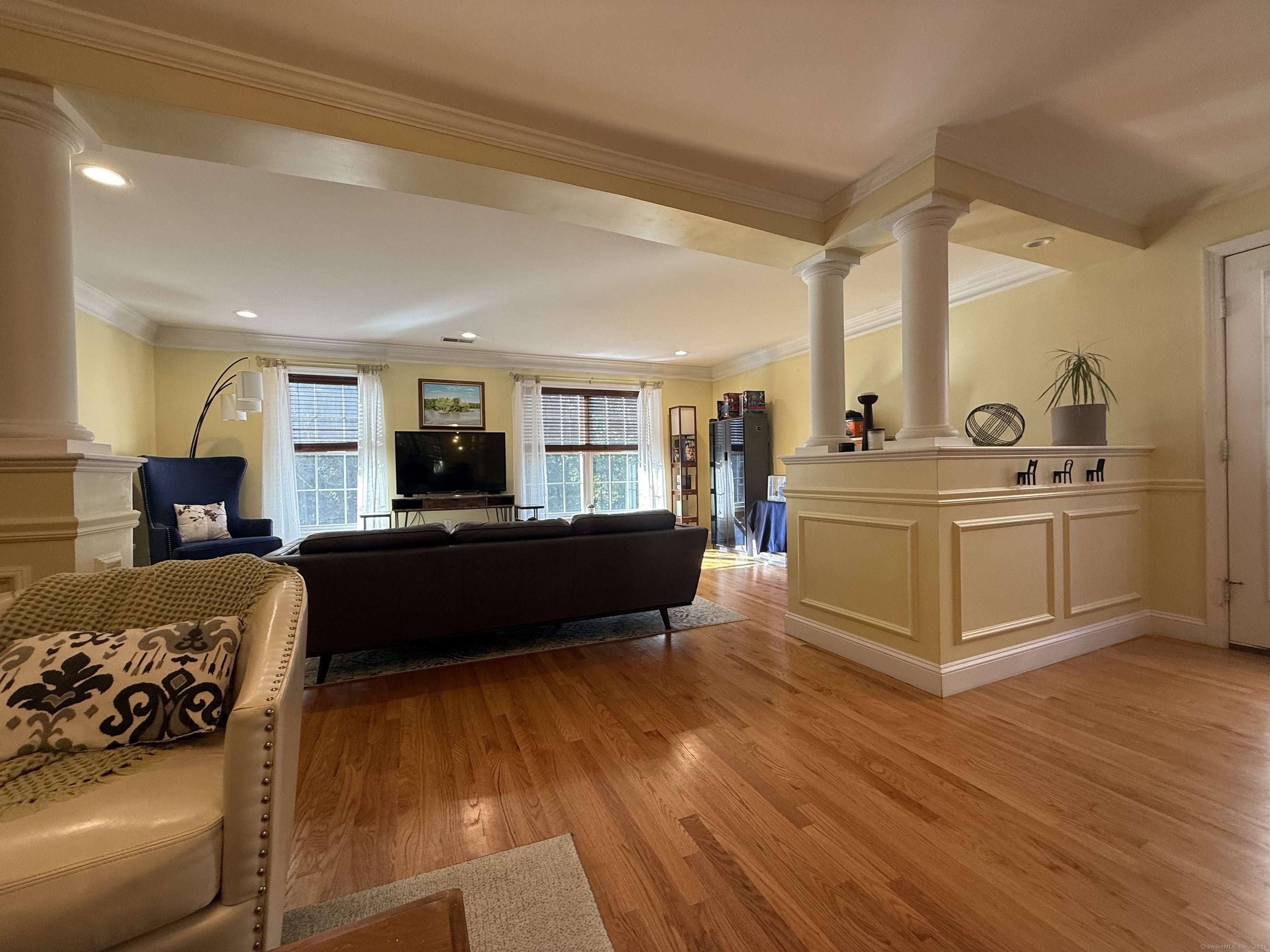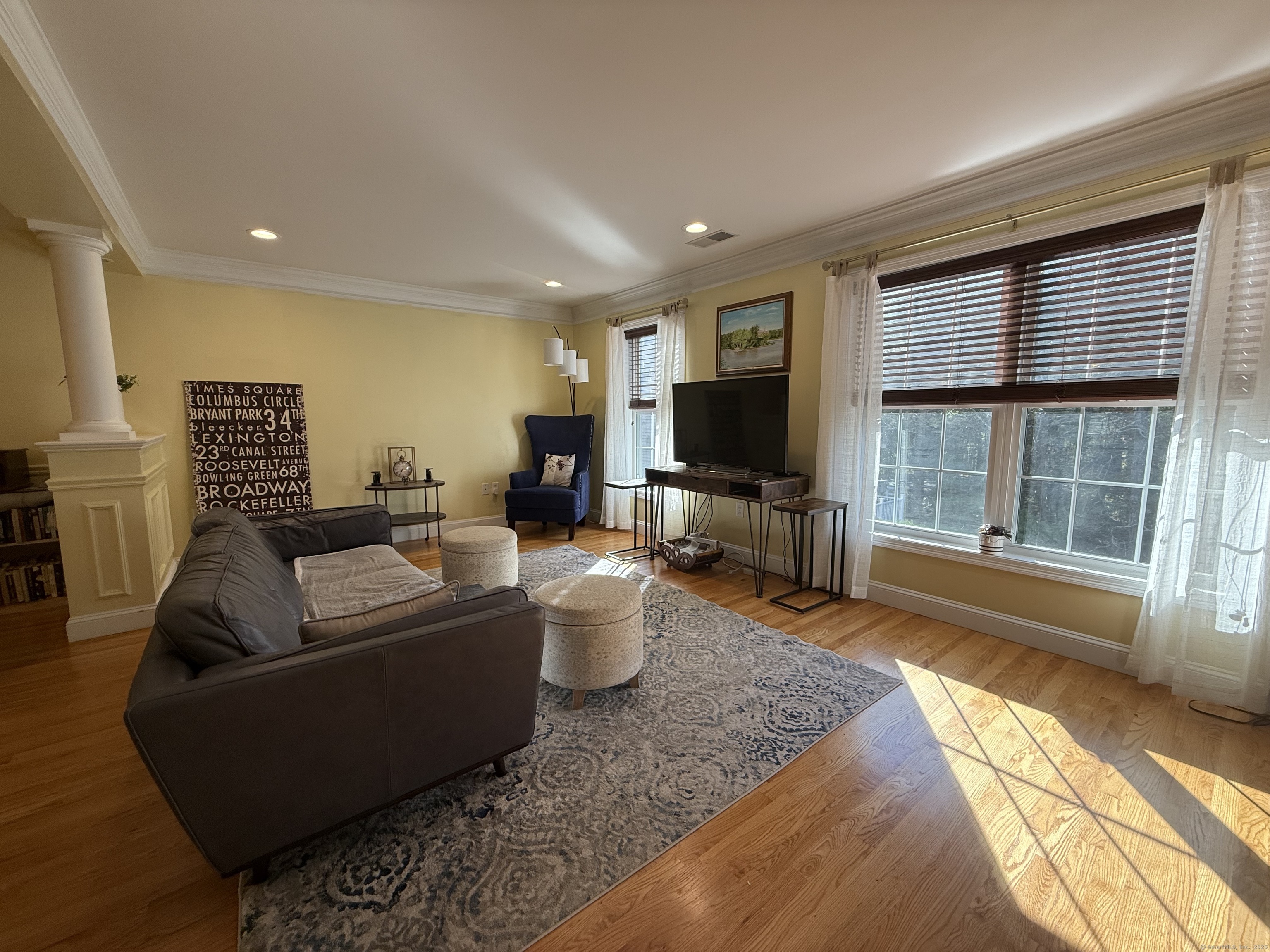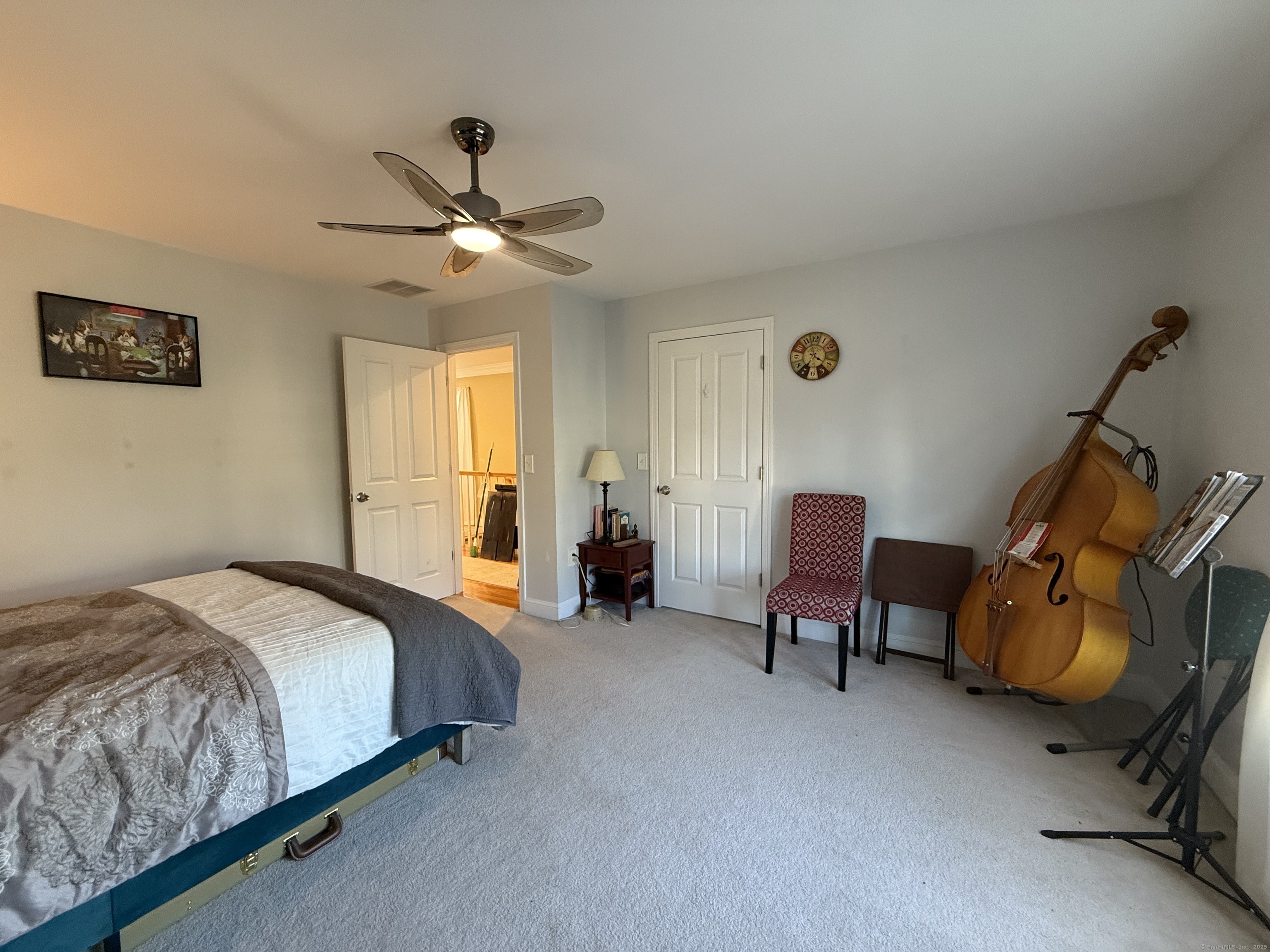 Welcome home to Heritage Pine Estates. This second & third floor townhouse style home has been well cared for, is freshly painted, and very welcoming. This unit is located in a semi private area with rear views to woods and occasionally water. The unit features an open Living/Dining/Kitchen with gleaming hardwood floors. This may have even been one of the model units because of the upgrading of the trim, wainscoting, and the crown molding. The kitchen features an eating space, tiles floors, granite counters, black stainless steel appliances and a large working island. There is a cozy dining space before the generous sized living room. There is a 1/2 bathroom on the main level along with a great bonus room (potential 3rd bedroom) that makes a great den, library, or home office with access to the upper level deck. Upstairs, the primary bedroom suite features large closet space along with a full bathroom. The second bedroom also has a very good sized closet. Laundry is conveniently located on the upper level as well. An. efficient heat pump provides the heat & Central Air. New water heater as of 2024 & pull-down attic stairs for easy access and storage.