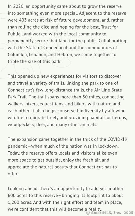 **Discover the Timeless Beauty of Wells Woods - A Once-in-a-Lifetime Opportunity!** Nestled within 180+/- acres of Breathtaking Natural Splendor, this Property Offers a Rare Chance to Own a Piece of History. Originally part of the 800 acre "Wells Woods" estate, developed in the early 1800's by John Wells of Boston, this Land once hosted a Tavern House, Sawmill, one-room-schoolhouse, family farms, and homesteads. Today, it stands as a testament to the area's rich heritage, waiting for it's next chapter to be written. **Nature's Sanctuary Awaits You** Experience the abundant wildlife that calls this land home. From graceful deer, wild turkey and rabbits to elusive bobcats, coyotes, and herons, every corner of this property is alive with the vibrant pulse of nature. Woodpeckers, red-tailed hawks, waterfowl, and countless other creatures add to the rich tapestry of wildlife. **Gateway to Adventure** Bordering the serene Mono Pond State Park Reserve and over 400 acres of public land, this extraordinary property offers direct access to the Airline State Park Trail, a 50 mile scenic route connecting hikers, walkers, bikers, and equestrians to the heart of the great outdoors. With such easy access to nature, adventure and tranquility are just a step away. **Create Your Dream Retreat** Whether you envision a private sanctuary, a family estate, or a community built for those who cherish nature and the great outdoors, the potential here is as limitless as the views.