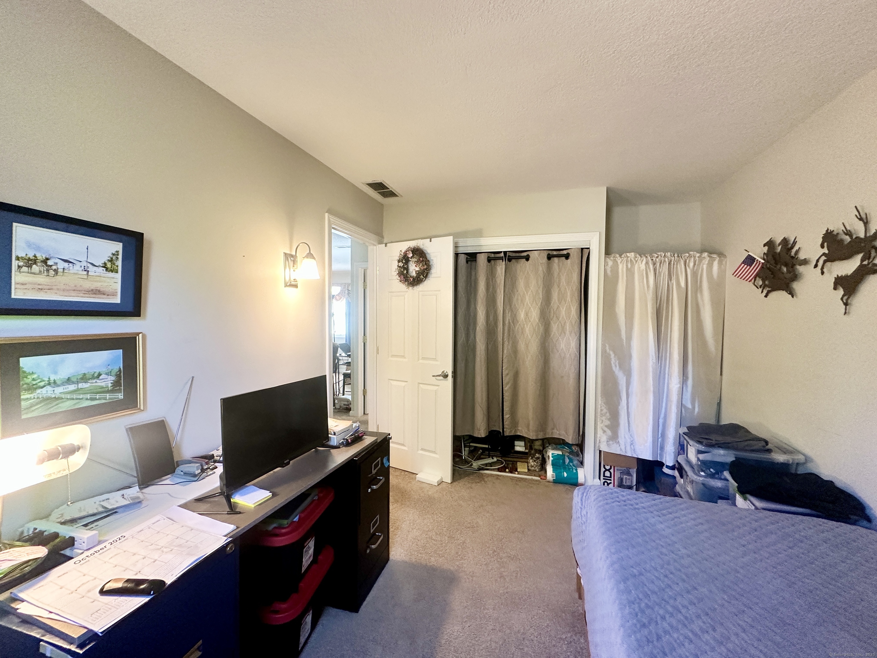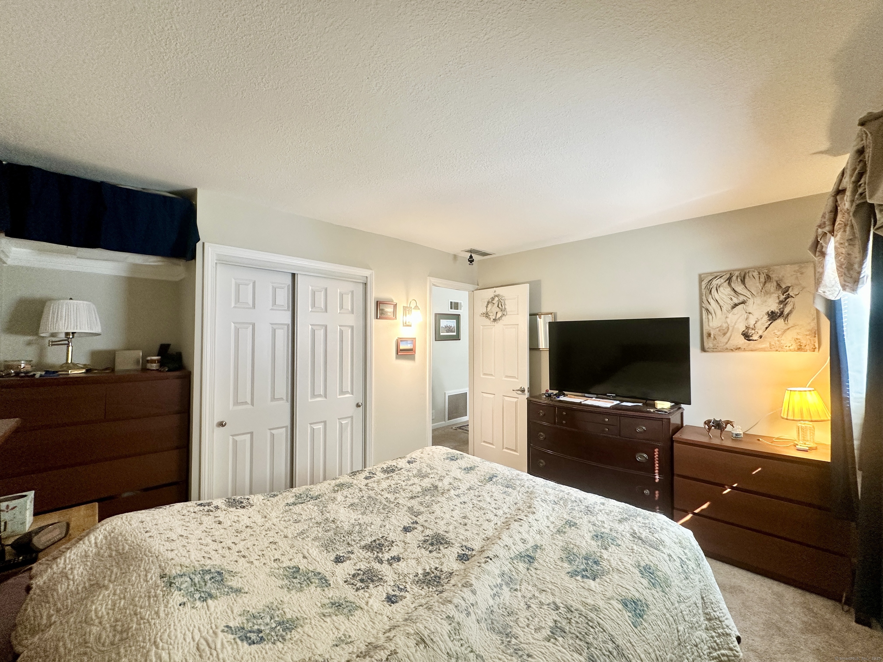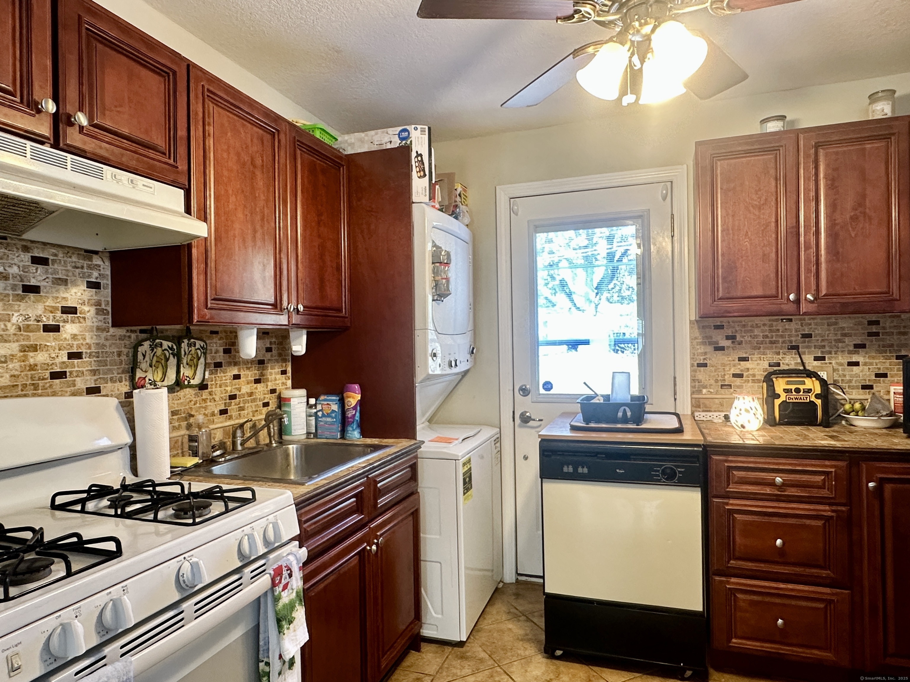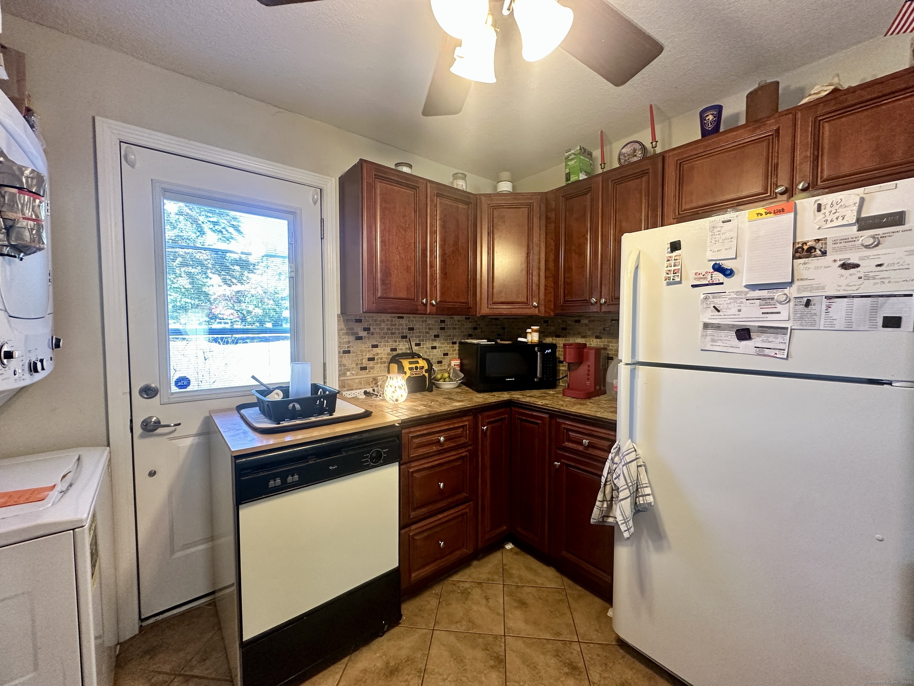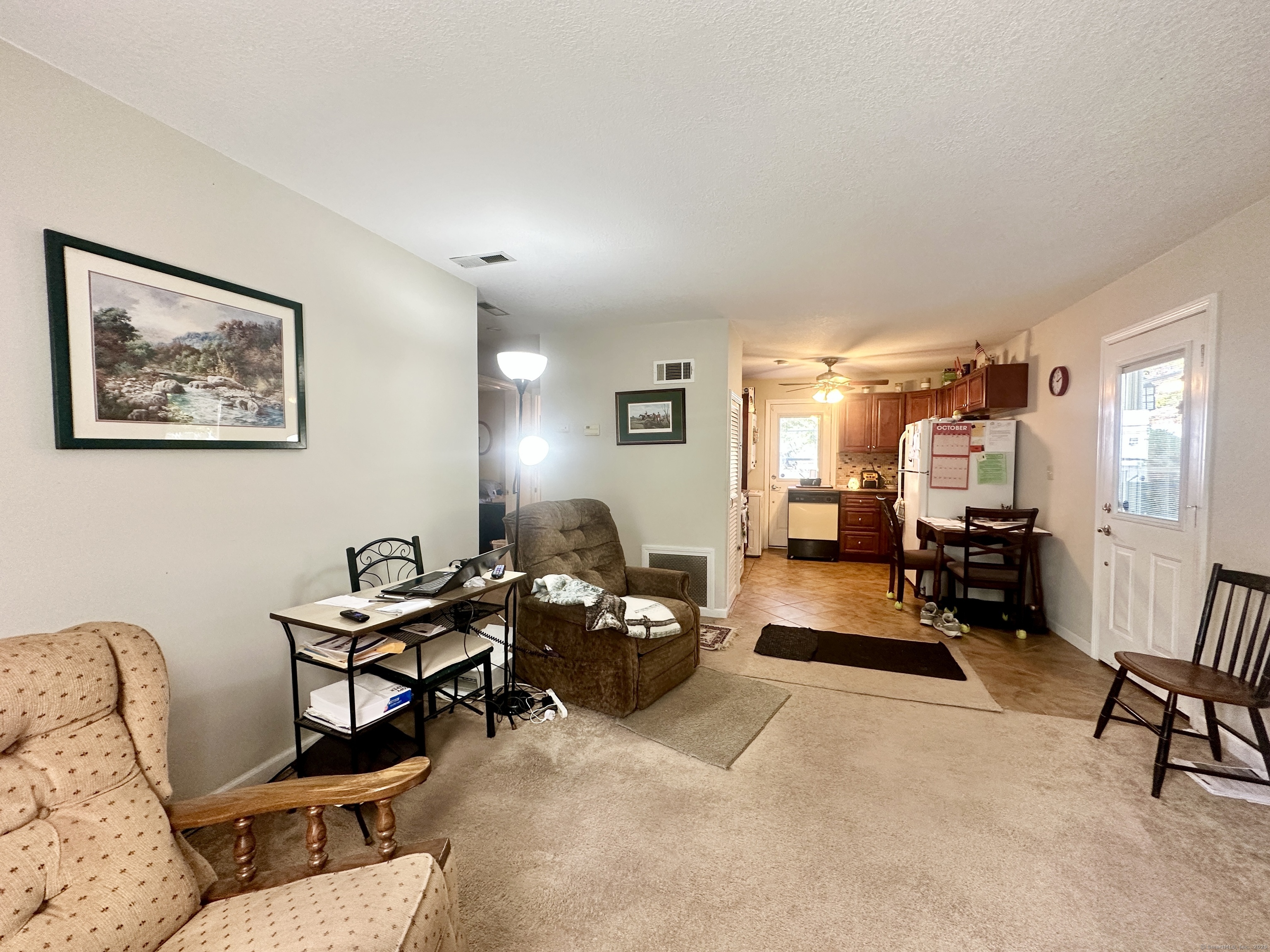 Fabulous two bedroom condo at Elm Corner awaits! Extra-large living room with a door leading to your private outdoor retreat with patio and garden space. Inside you will find a nice sized, fully equipped kitchen with a gas stove, tile floors and the convenience of a stackable washer and dryer! The kitchen is open to the large living room with wall to wall carpeting and large windows to let in the sunshine! The primary bedroom with a large closet and plenty of room for dressers etc. This home offers second bedroom, also nicely sized and also with a large closet! A nice shower unit in the bath and just outside a closet that houses utilities. This unit is placed nicely toward the back of the complex, right along the fence line and offers it's own driveway for parking! Come make this unit HOME!