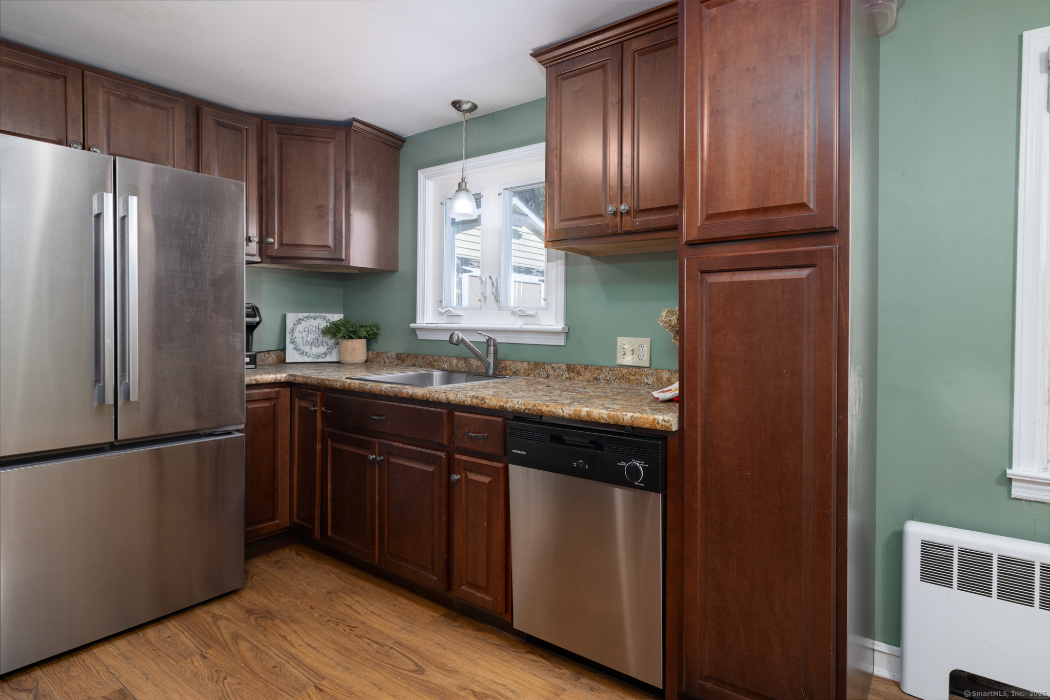 Don't miss this rare opportunity to own a charming, move-in-ready home located in a quiet, cozy neighborhood. This well-maintained 1,785 sq. ft. ranch home features three bedrooms, 1.5 bathrooms, and hardwood floors throughout, along with a spacious finished lower level. As you enter, you'll be greeted by a warm and inviting family room with views into the generous dining area. The kitchen is both practical and stylish, offering ample prep space, plenty of storage, and new stainless-steel appliances. The finished breezeway provides a perfect entry point from the driveway, garage, or backyard. Down the hall, you'll find three sizable bedrooms and a remodeled full bathroom. The finished basement offers versatility with a large multi-purpose room that can serve as a fourth bedroom, home office, or playroom. It includes storage cabinets, a new refrigerator, a half-bath, a laundry area, and additional storage in the unfinished sections. Outside, enjoy the lovely front yard and a recently fenced-in backyard, which features both a storage shed and a work shed. The property boasts a new roof, all-new stainless steel appliances, a new washer and dryer, new PVC fencing, remodeled bathrooms, and newer windows. It is connected to the city's sewer and water systems and is heated with oil. Conveniently located near highways, shopping, restaurants, medical facilities, schools, walking trails, parks, and more. **WE KINDLY REQUEST THAT ALL WRITTEN OFFERS BE SUBMITTED BY MONDAY, THE 13th**