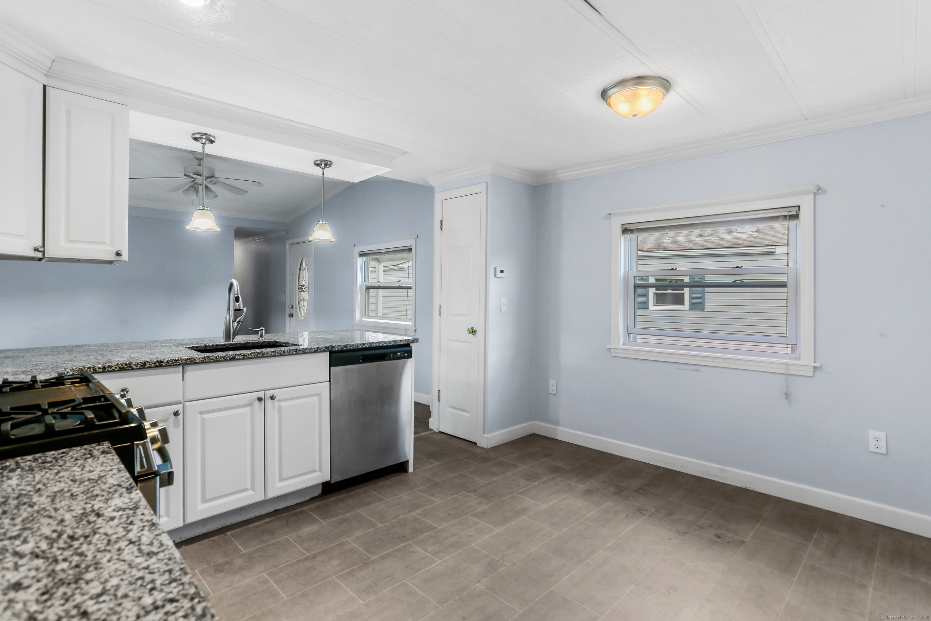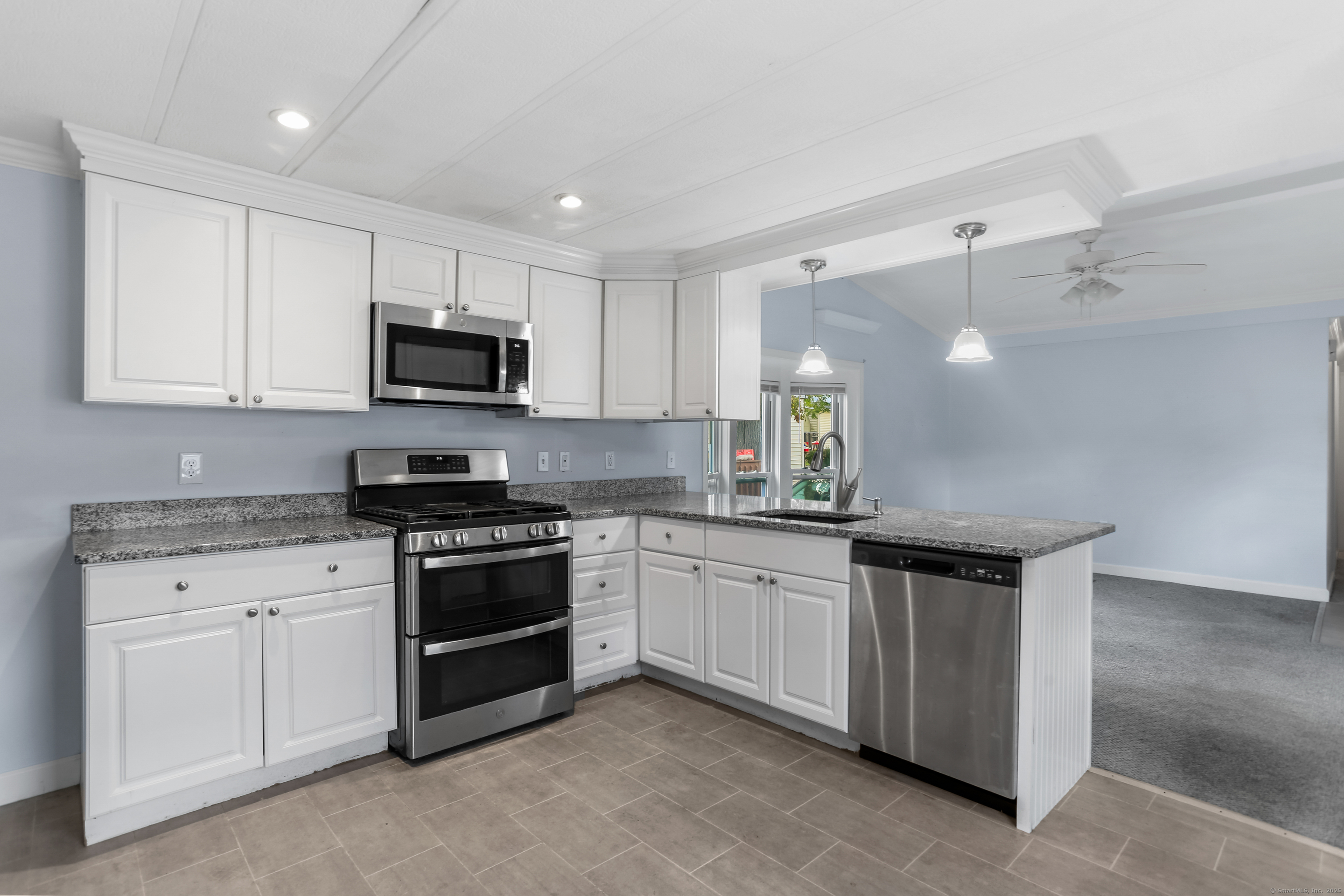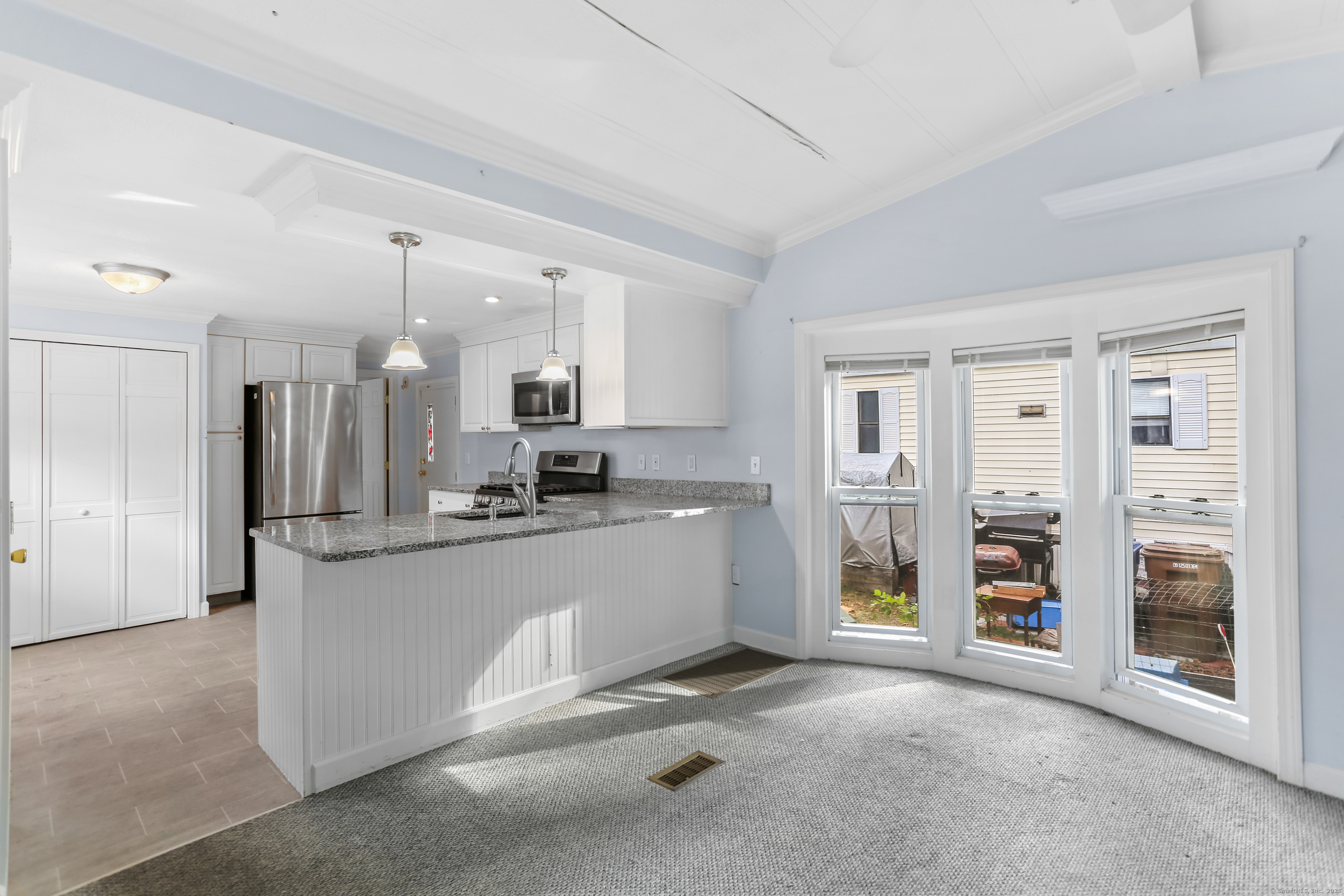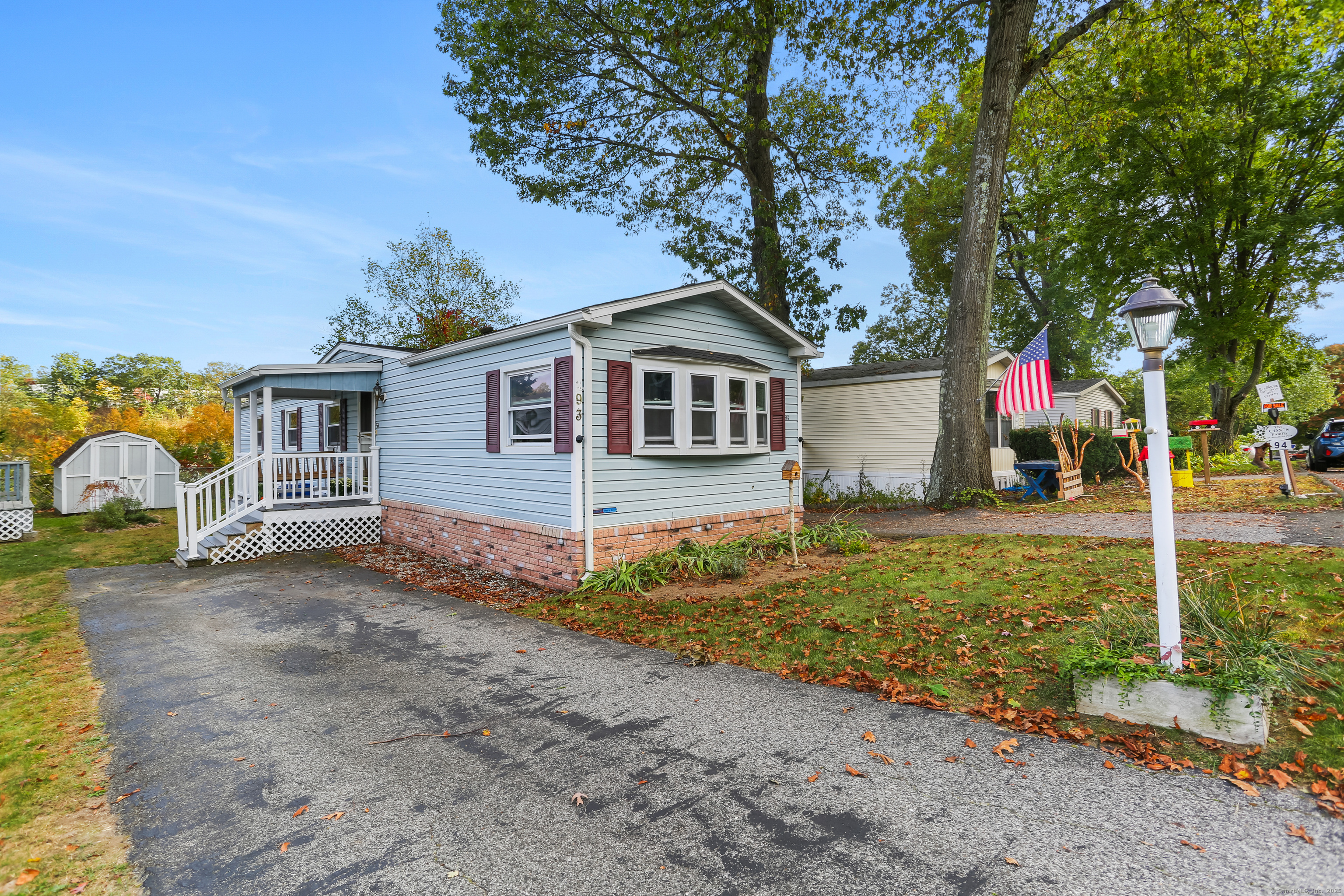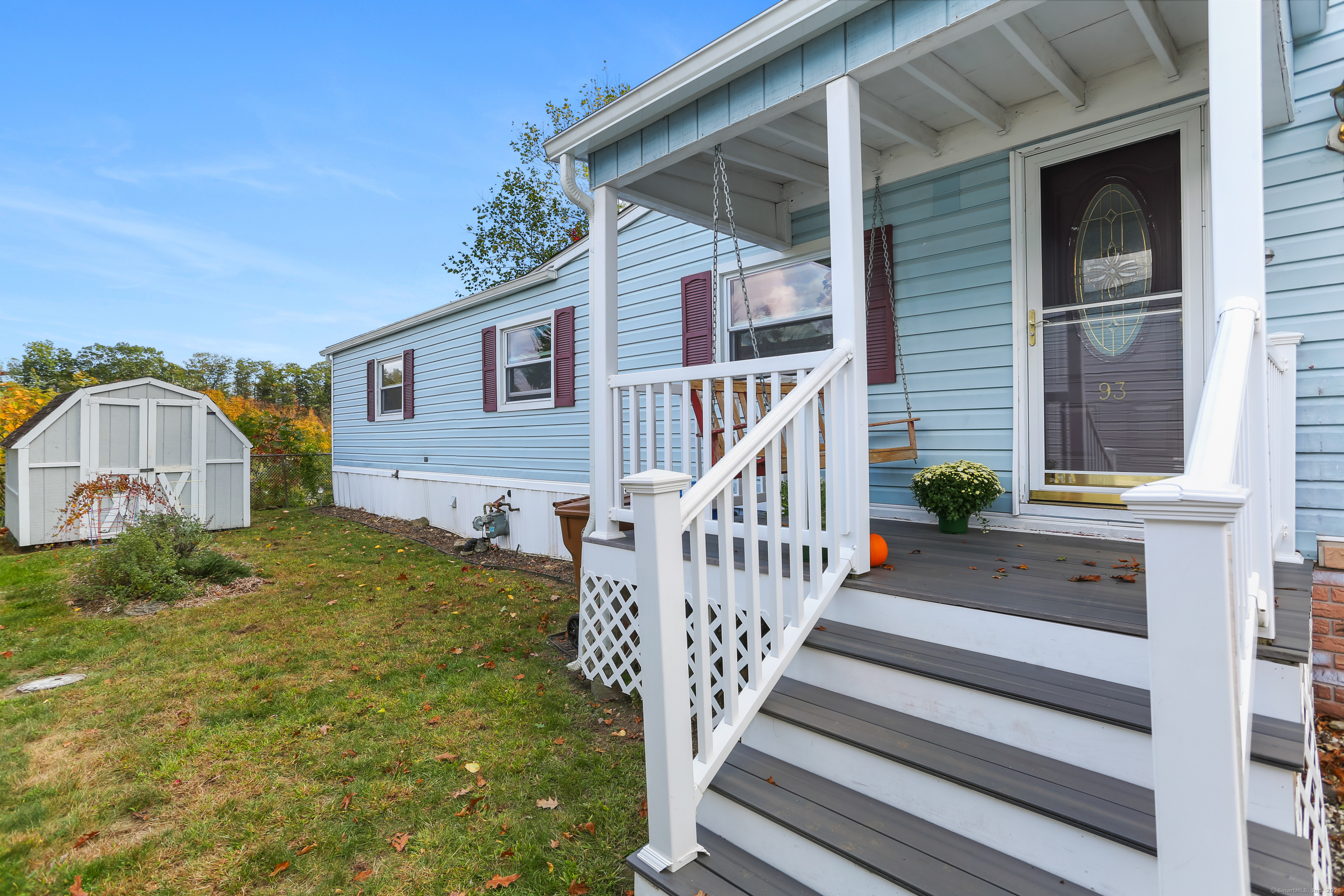 Welcome Home! Discover comfort and convenience in this well-maintained 924 sq ft mobile home, offering easy one-level living and a spacious open floor plan. The large eat-in kitchen features newer appliances, a breakfast bar, and ample cabinet space, with easy access to the laundry area. The bright living room boasts vaulted ceilings, while the well-appointed bathroom includes a soaking tub, separate shower, and plenty of space. Recent updates include a brand new roof with gutter guards, a refurbished furnace, refurbished Central Air and a heating coil added to the main waterline. Enjoy off-street parking in your private driveway, a cozy front porch with swing, and extra storage in the included shed. Conveniently located close to restaurants, shopping, and the main commuter bus line with easy access to major highways, this home offers a perfect blend of relaxation and accessibility. Pets are welcome (with restrictions).