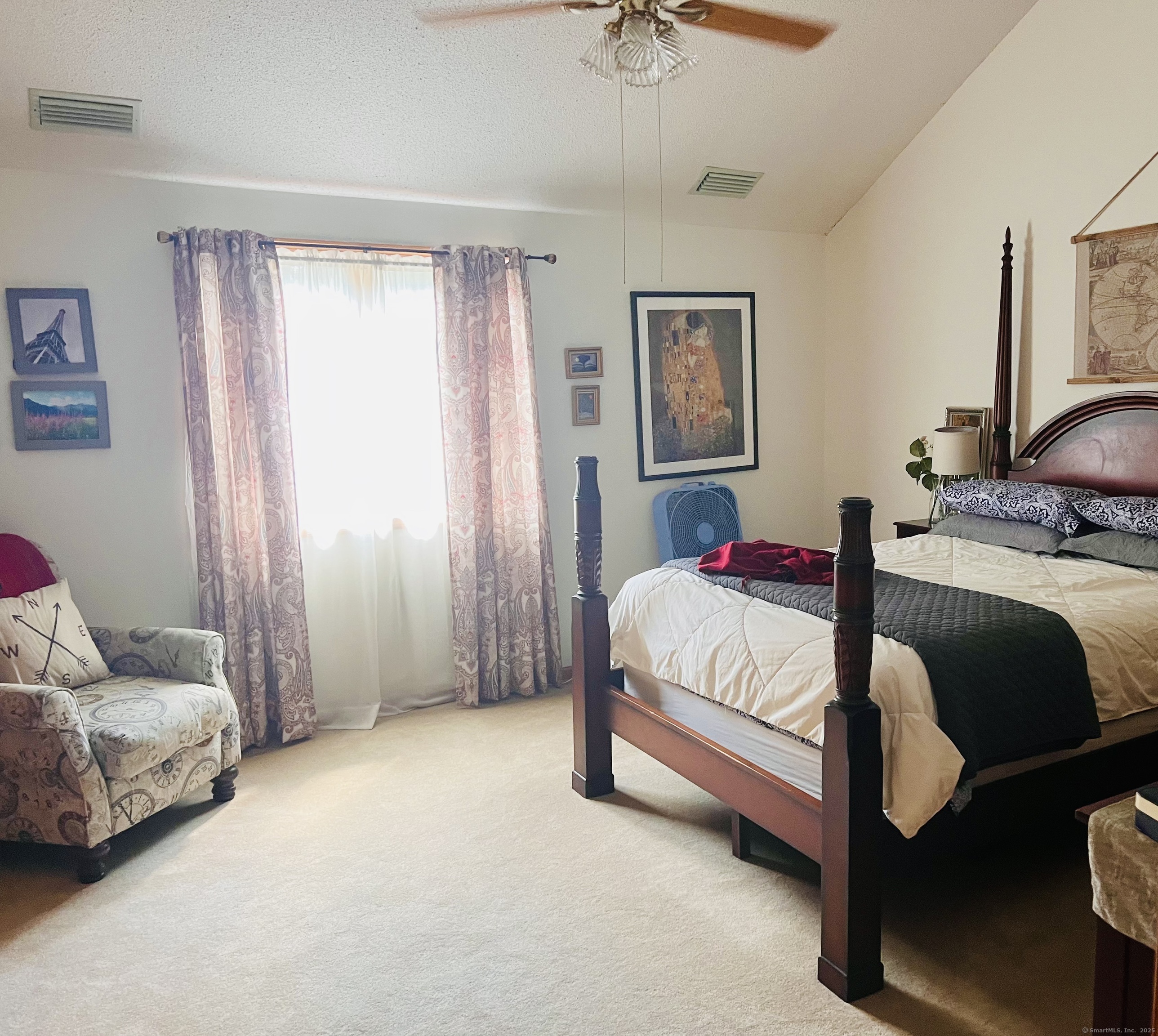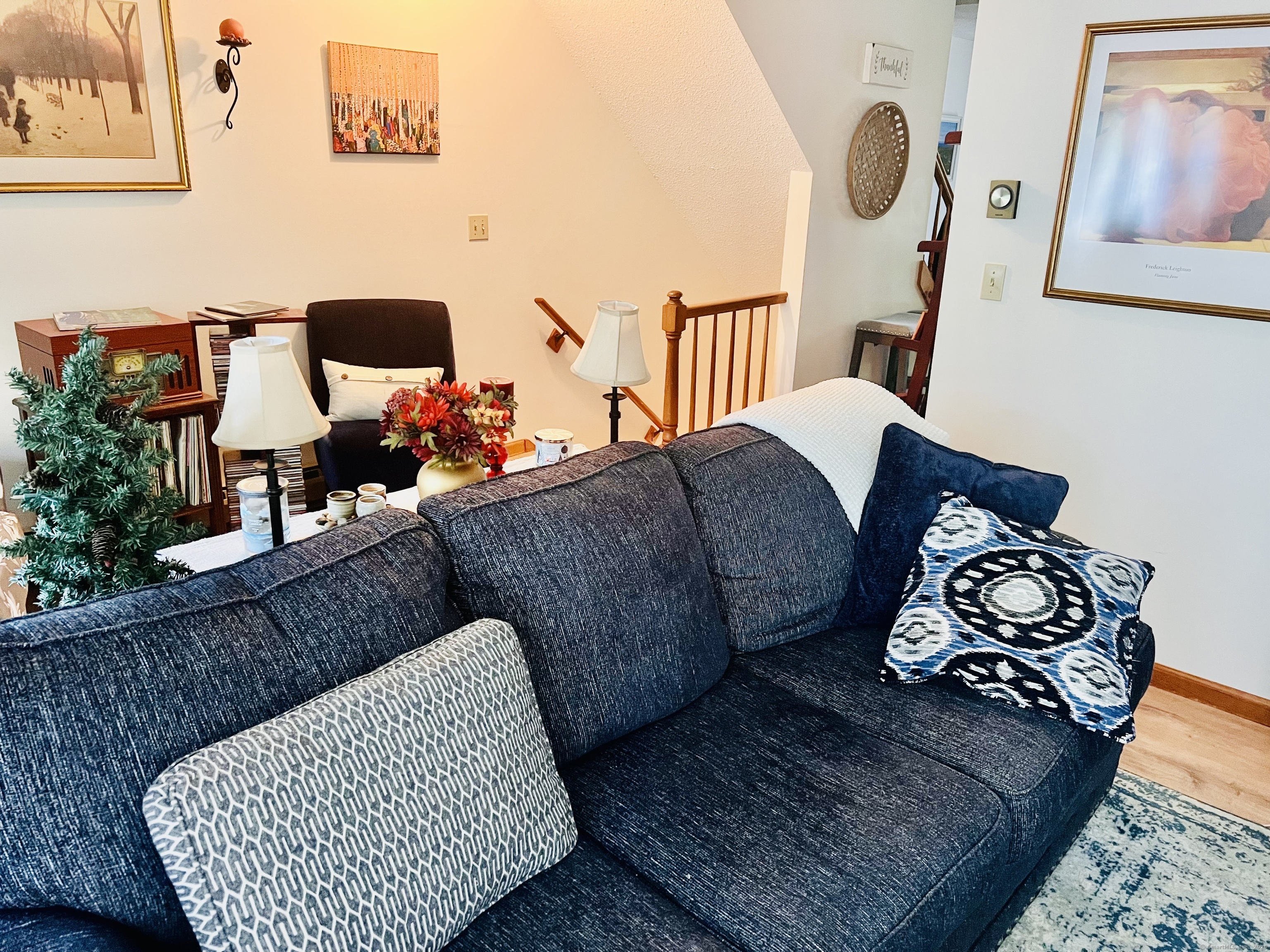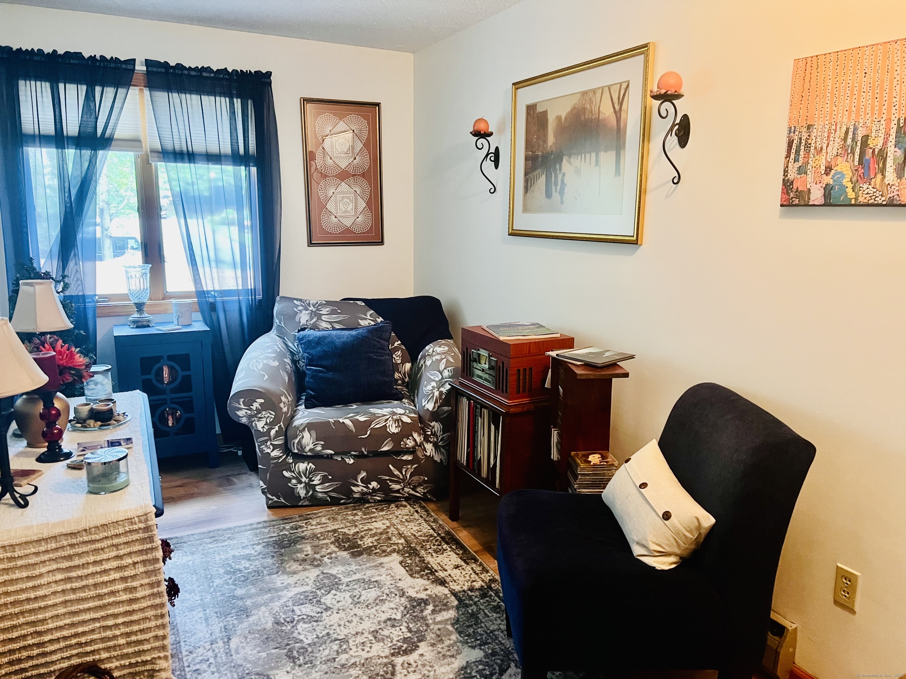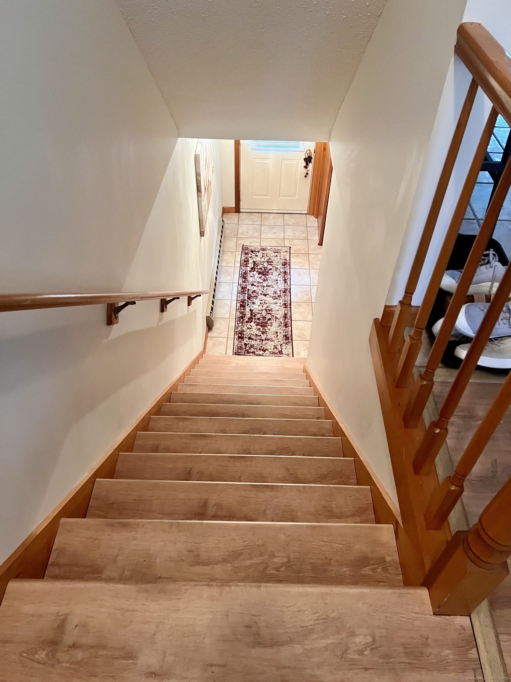Farmington Edge Condominium, lovely 1,200 square feet + Town Home with attached Garage. Beautiful location, private wooded views. This home features a large Country Kitchen with Breakfast Bar. There is plenty of room for a dining room table, and there is a slider out to a covered deck/porch. A Living Room/Family Room is neutral in decor and wonderfully comfortable with new wood laminate flooring November 2022. The lower foyer staircase also has new laminate wood flooring. The Primary Bedroom features a sunlit vaulted ceiling and private full bathroom along with two double closets. The secondary bedroom is also the perfect size and provides a spacious closet and steps away to a hallway full bathroom. There is a new HVAC System installed in February 2024. In unit washer & dryer. Farmington Edge has a walking trail and is close to West Farms Mall, Tunxis Community College, UCONN Hospital, winding trails, miniature golf, Farmington Polo Grounds, Restaurants, and so much more. It also is minutes away from downtown Hartford.